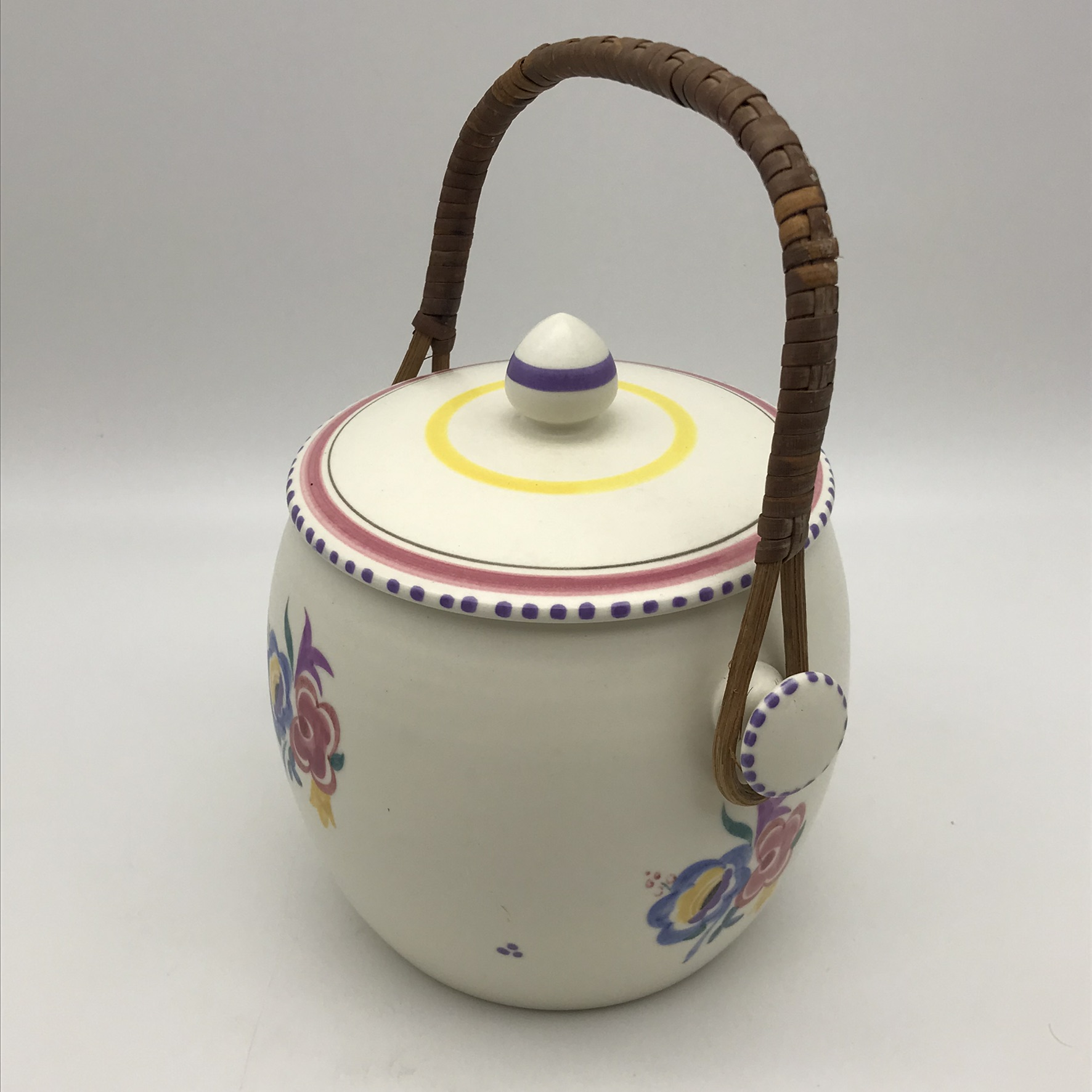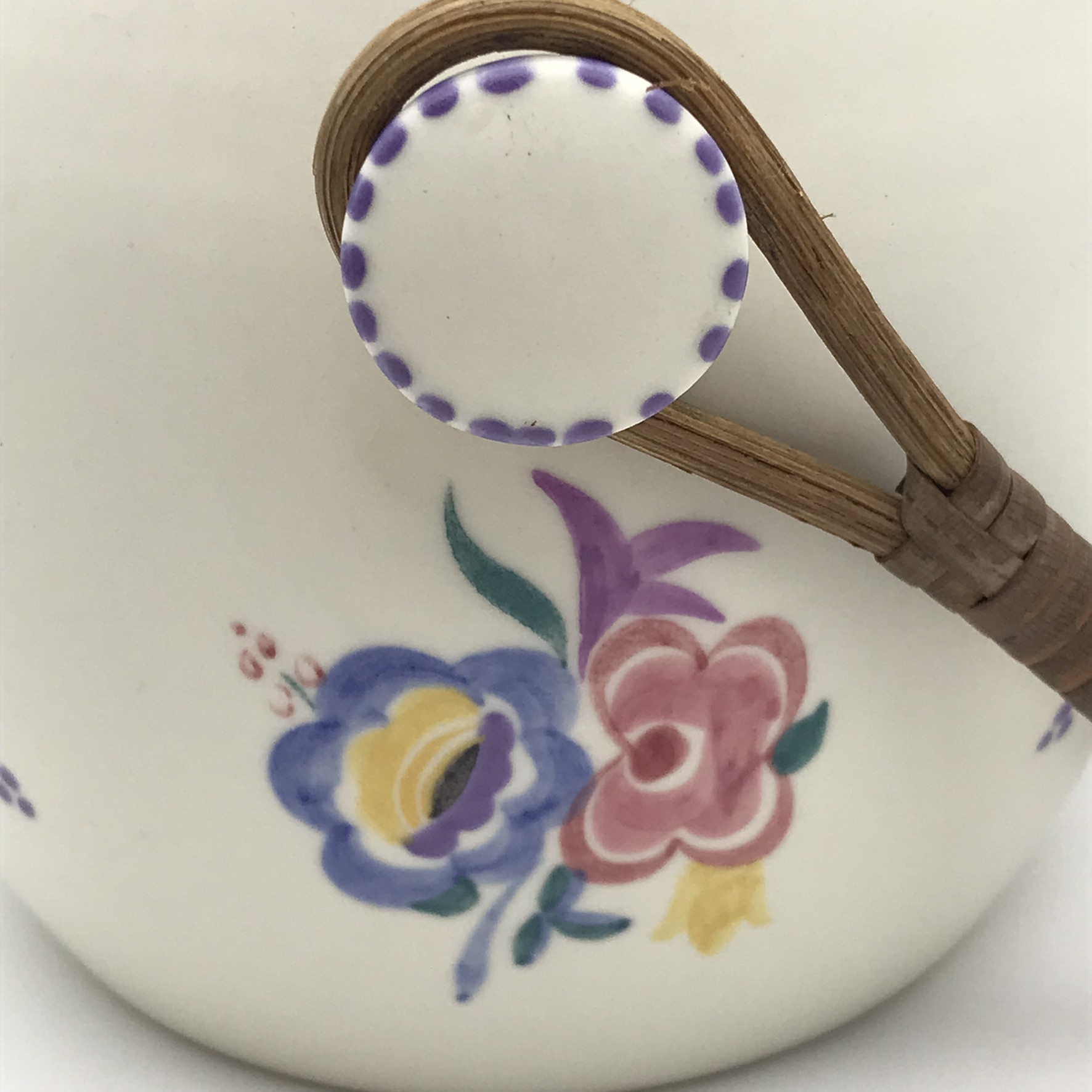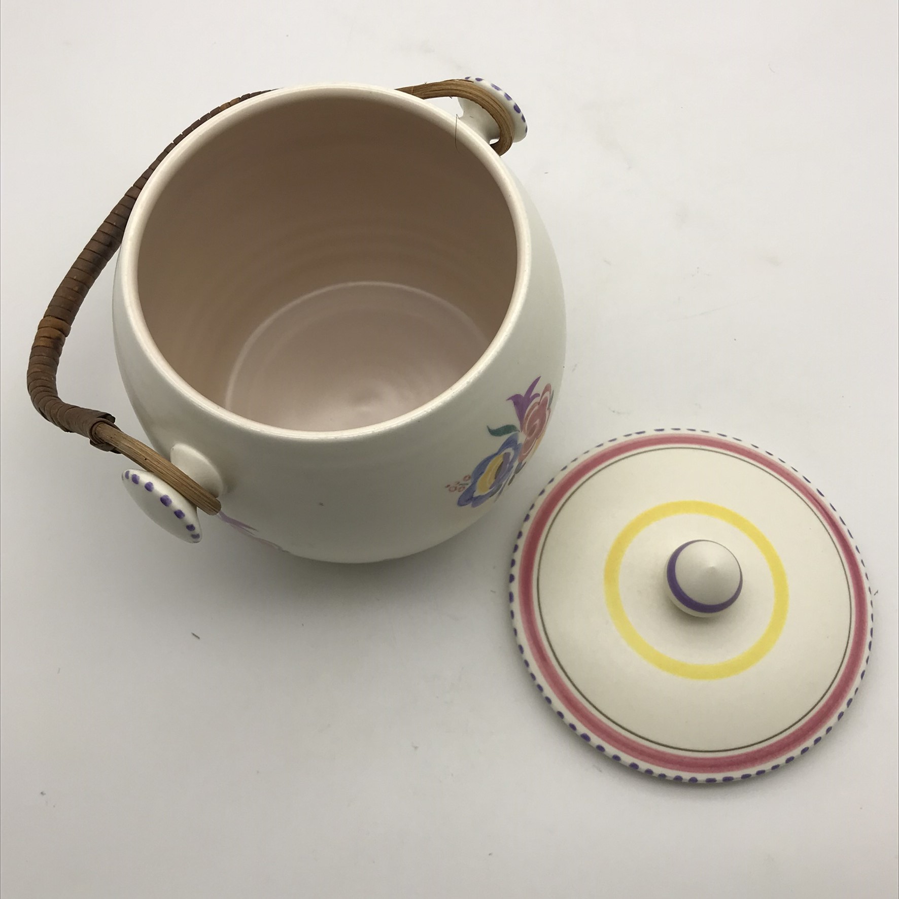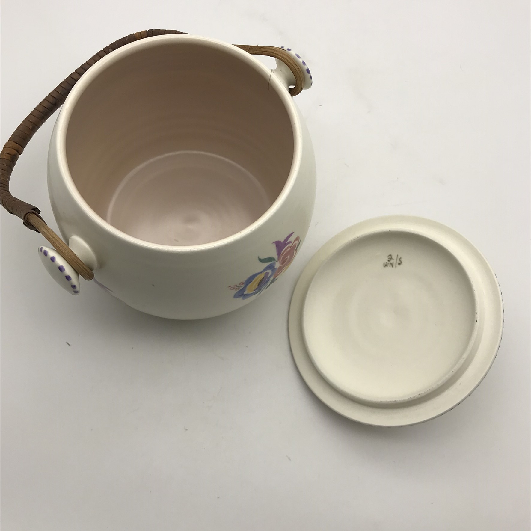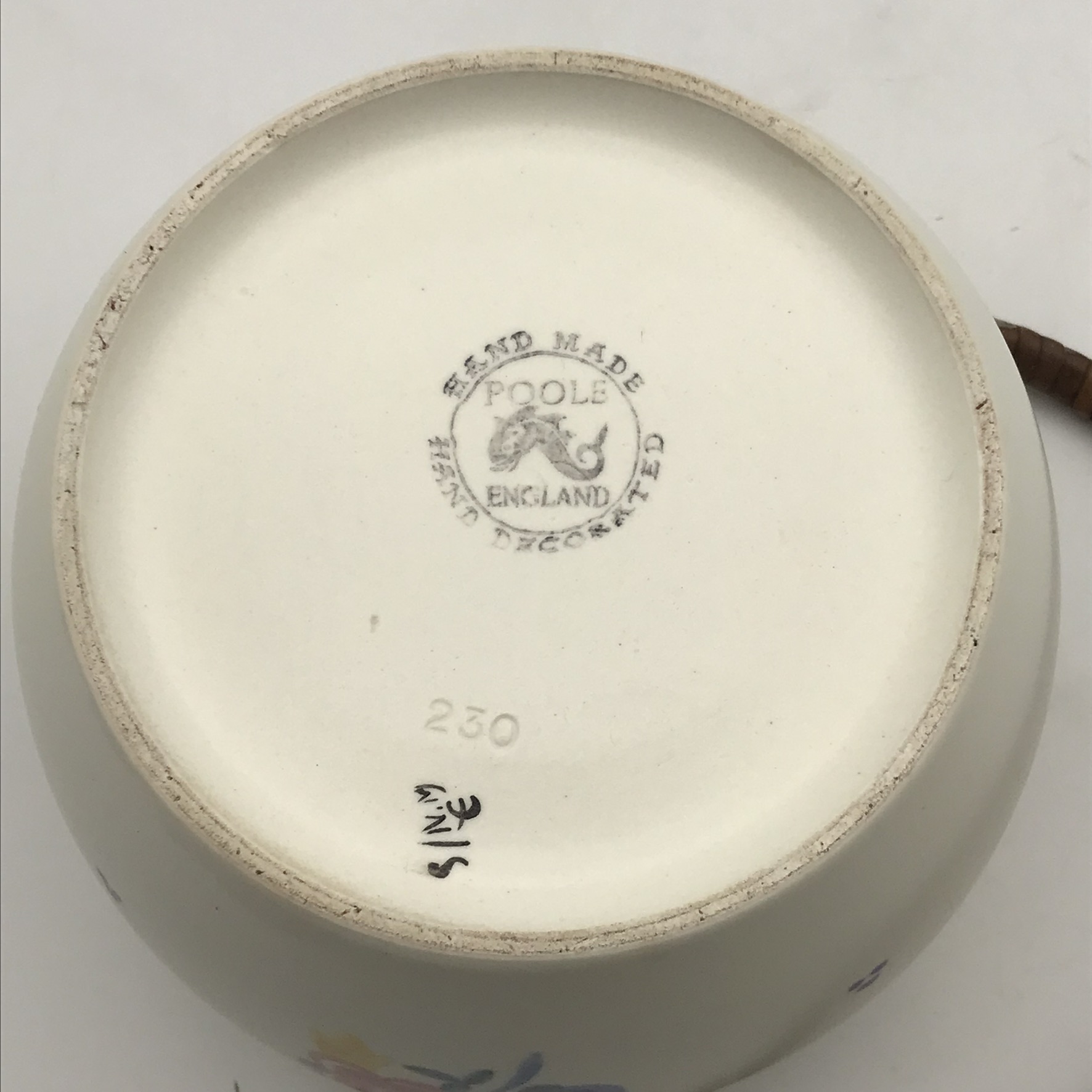 This attractive, early ‘Poole Pottery’ cookie jar and lid from the 1950’s is in excellent condition, and complete with its original wicker handle. It’s beautifully hand painted in soft colourful flowers, and carries the ‘Poole’ backstamp that was used between 1952 and 1955, as well as an artist’s signature in black and an impressed number ‘230’. The jar and cover stand 14,5cm high, with a width of 13cm (16cm with handle knobs) and weighs 720g.