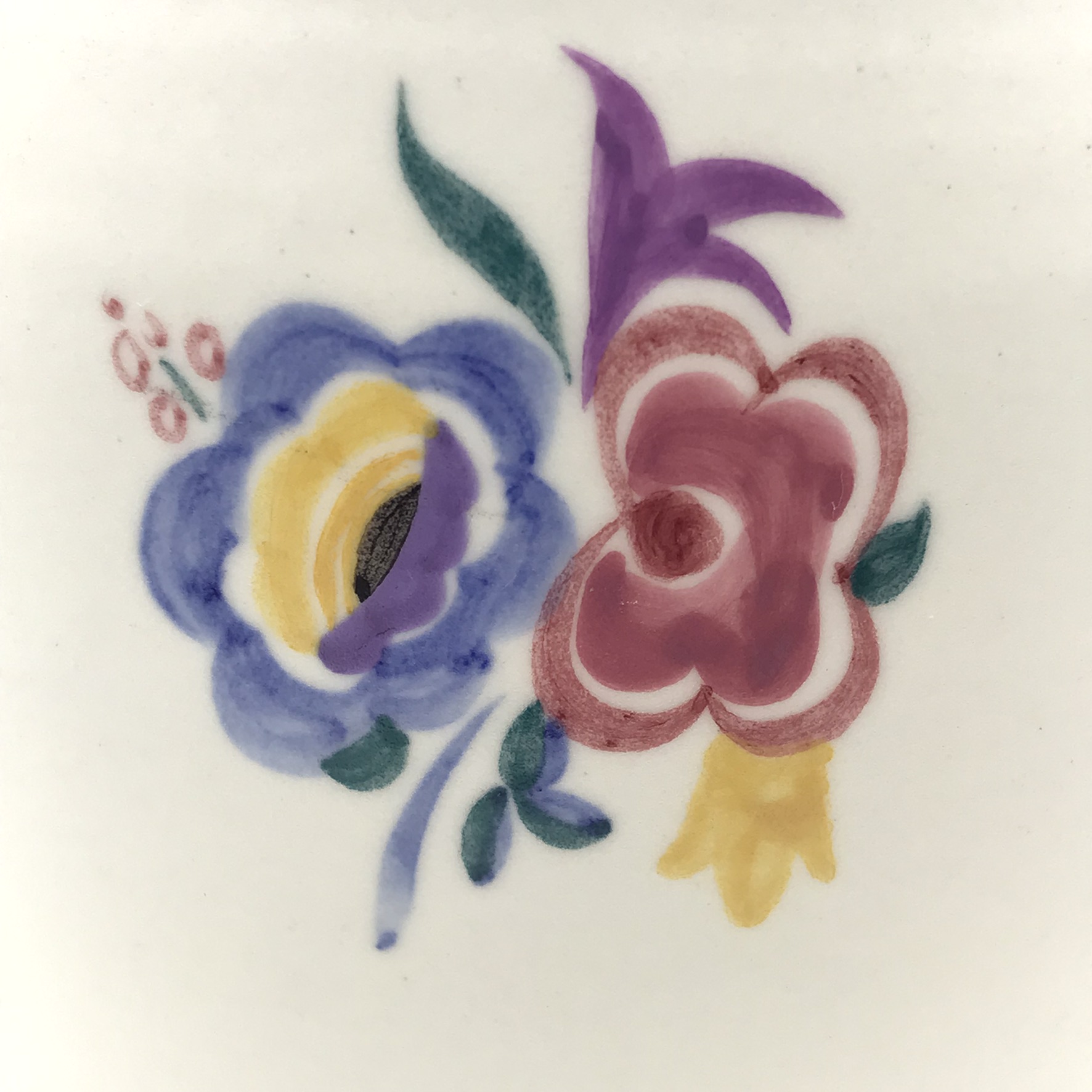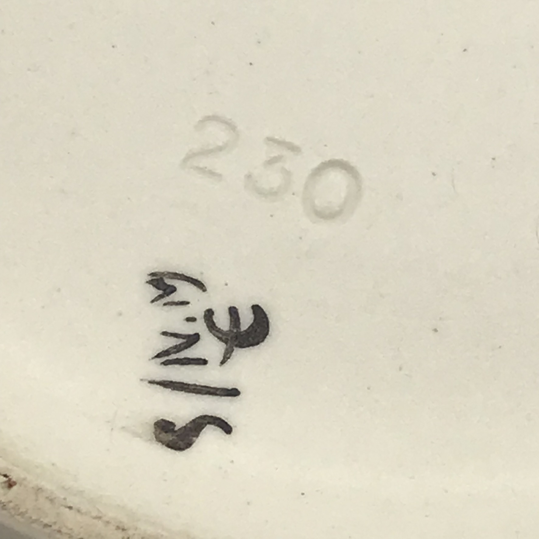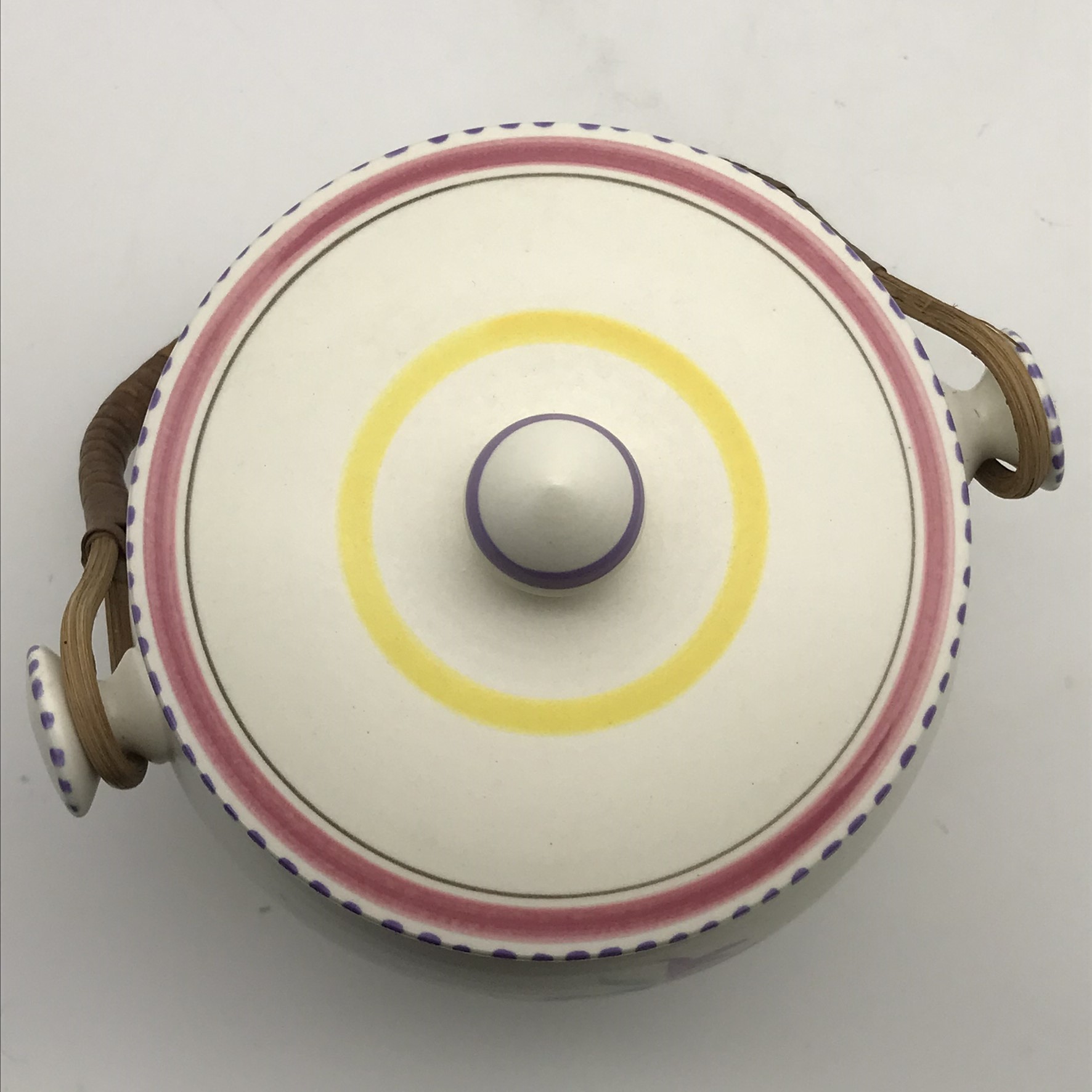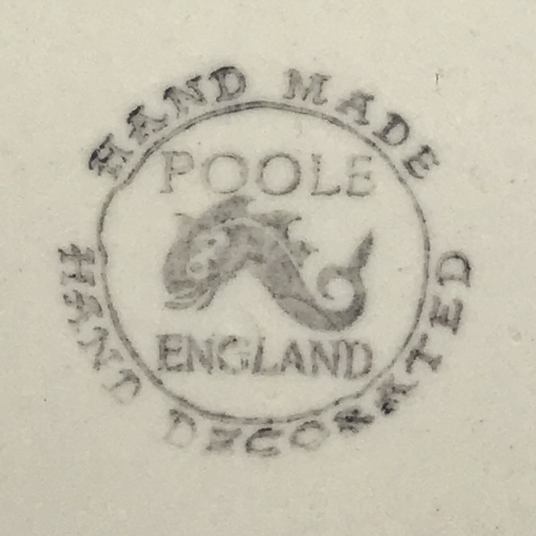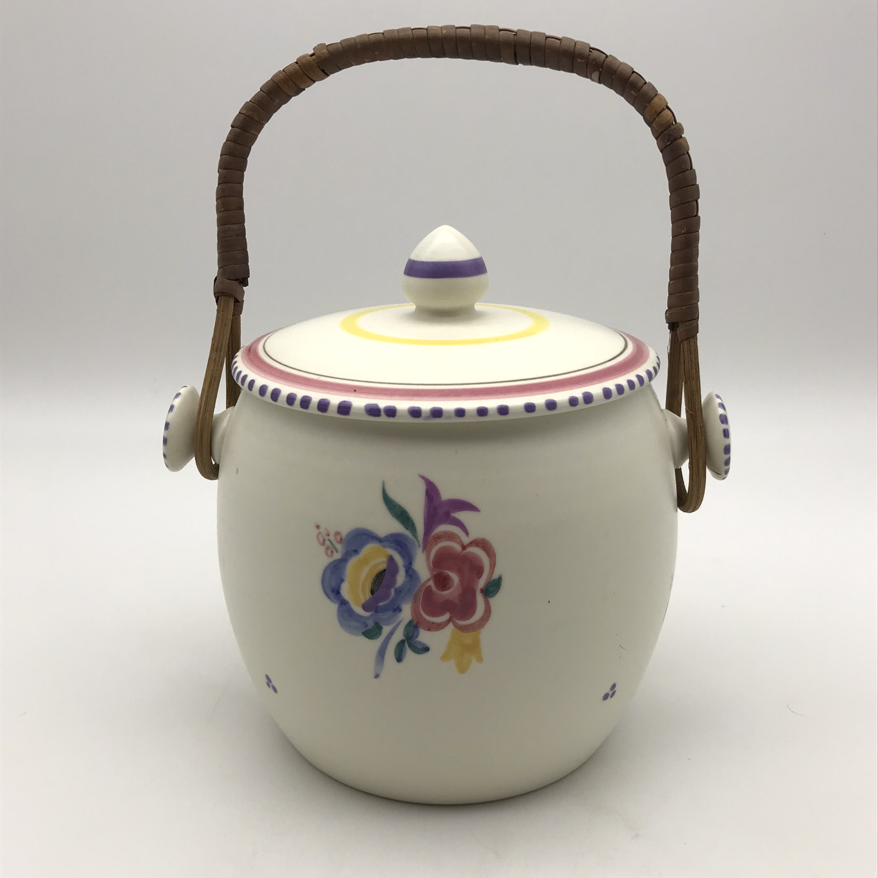 This attractive, early ‘Poole Pottery’ cookie jar and lid from the 1950’s is in excellent condition, and complete with its original wicker handle. It’s beautifully hand painted in soft colourful flowers, and carries the ‘Poole’ backstamp that was used between 1952 and 1955, as well as an artist’s signature in black and an impressed number ‘230’. The jar and cover stand 14,5cm high, with a width of 13cm (16cm with handle knobs) and weighs 720g.