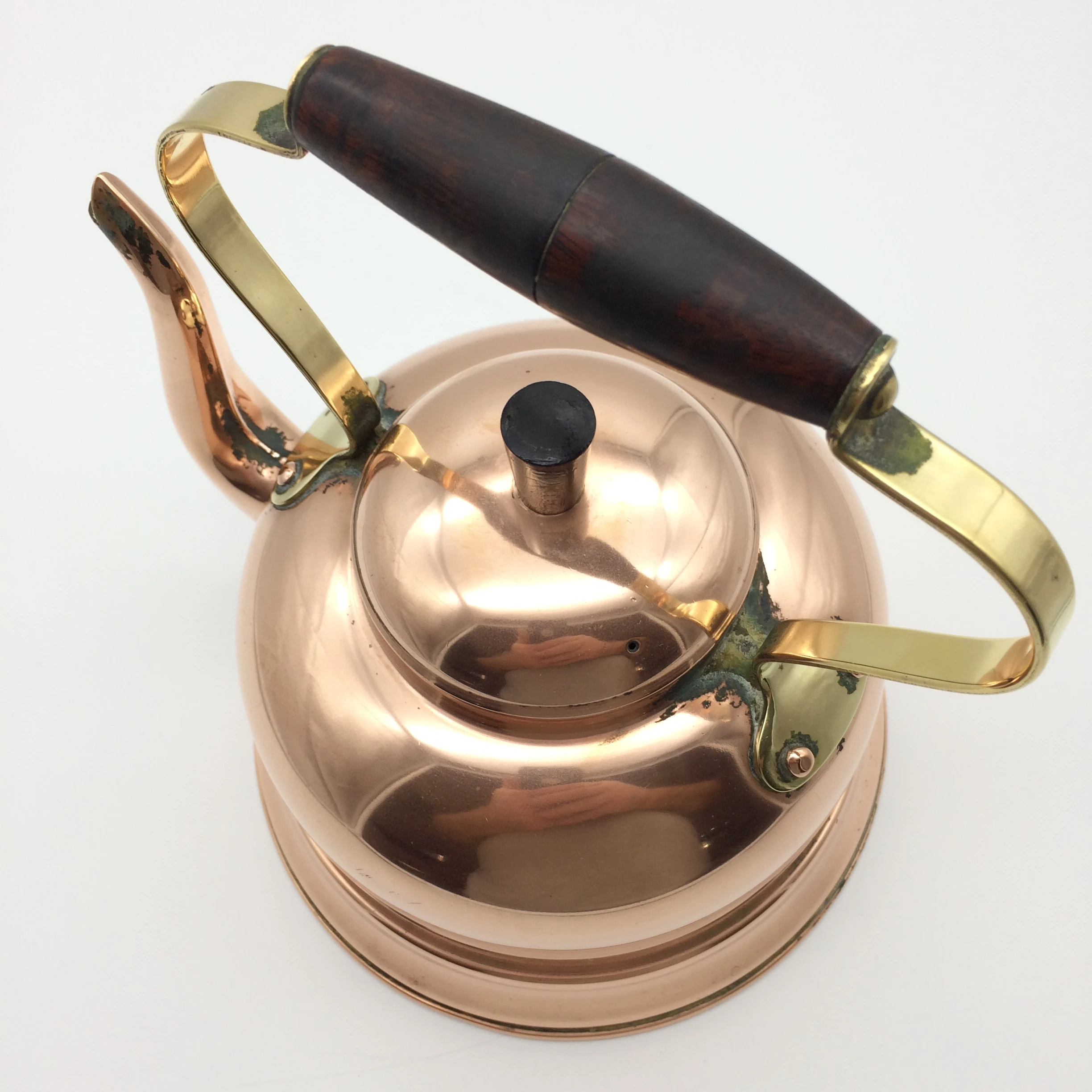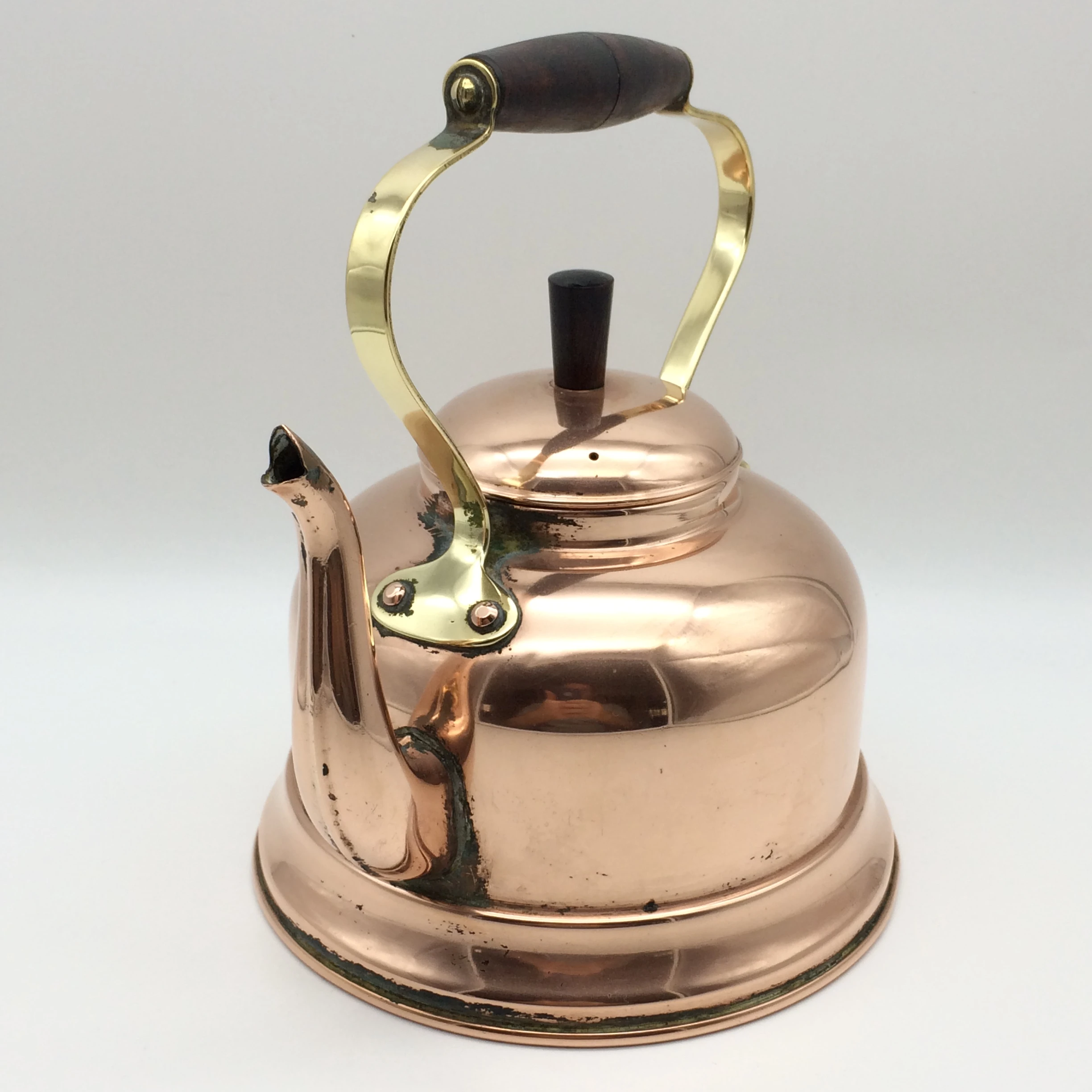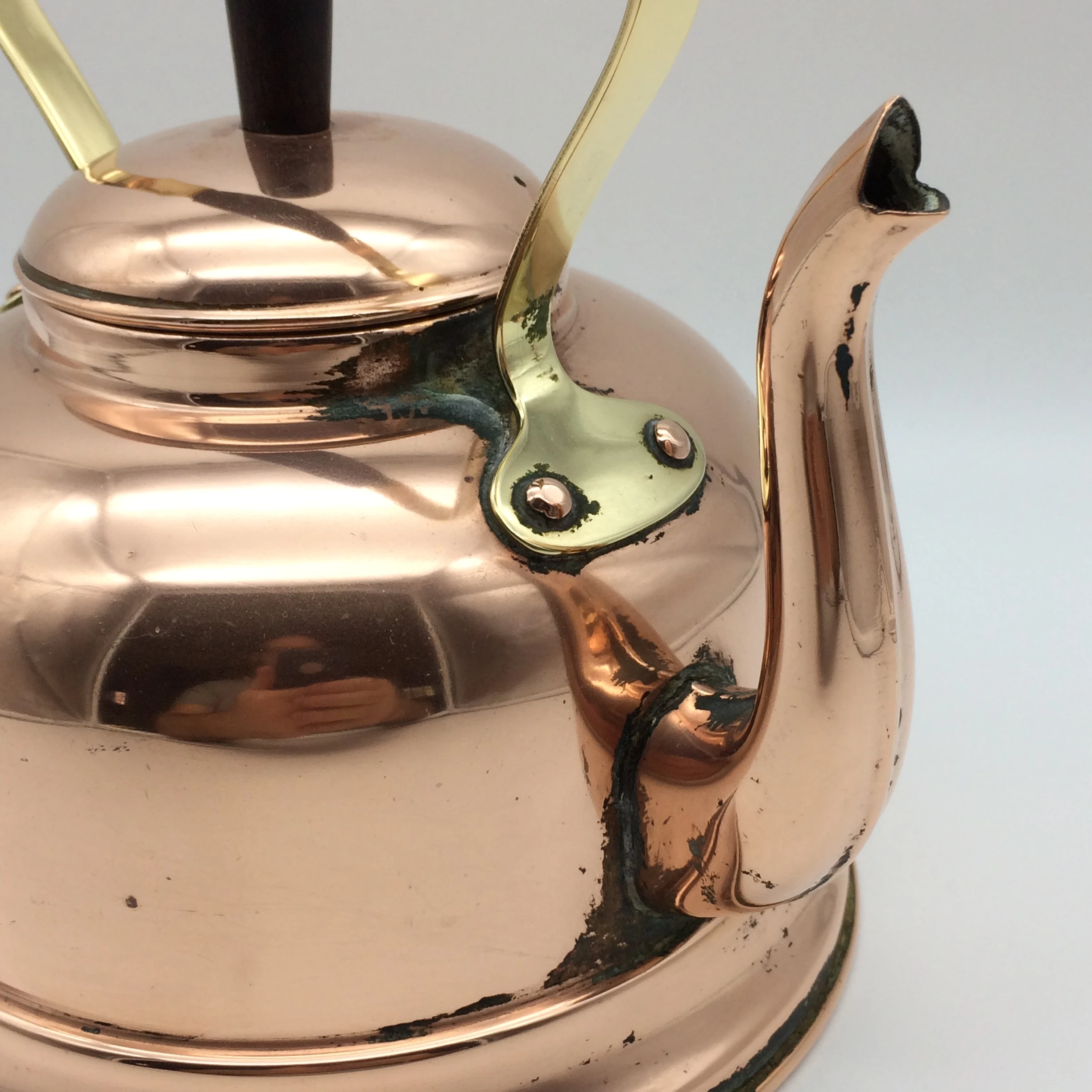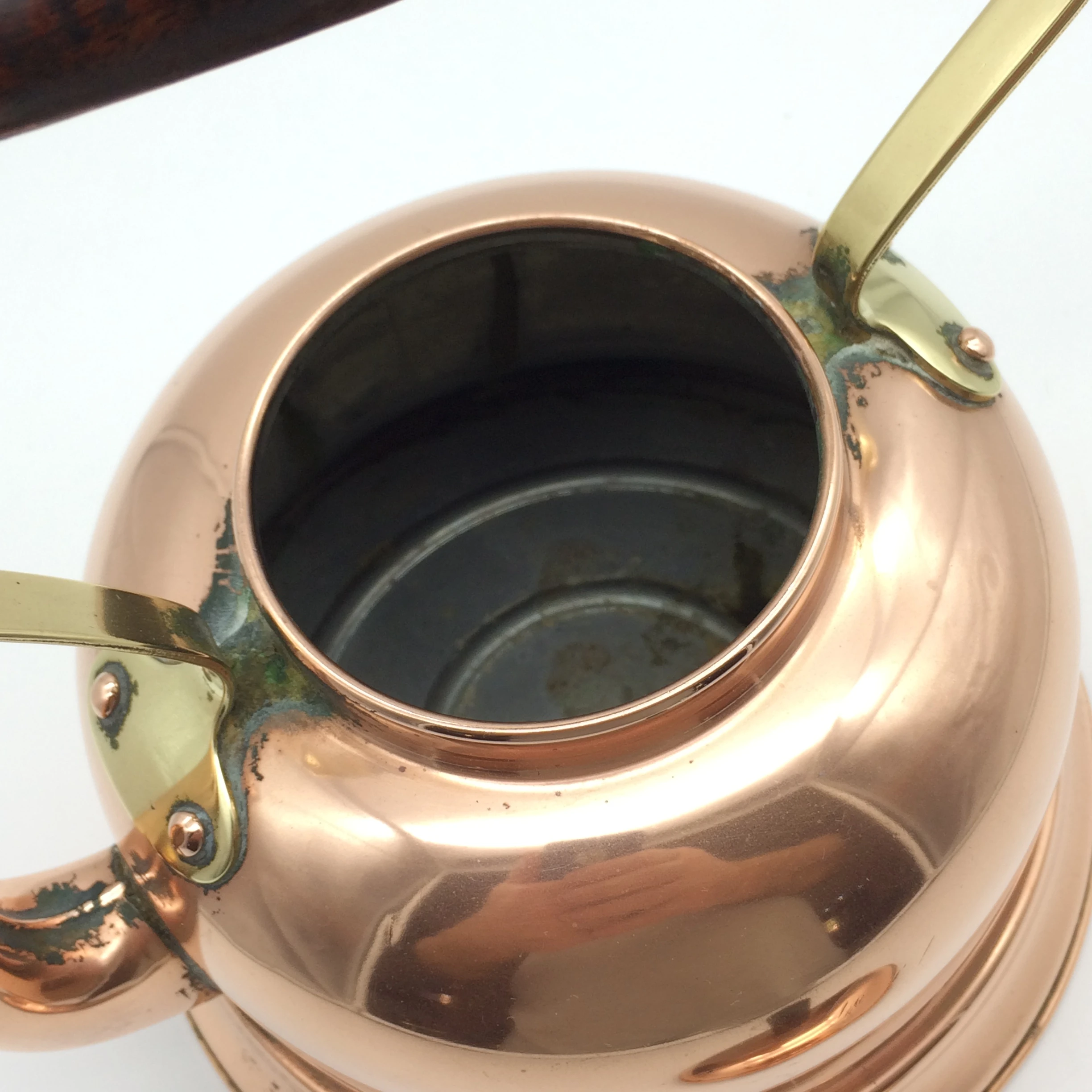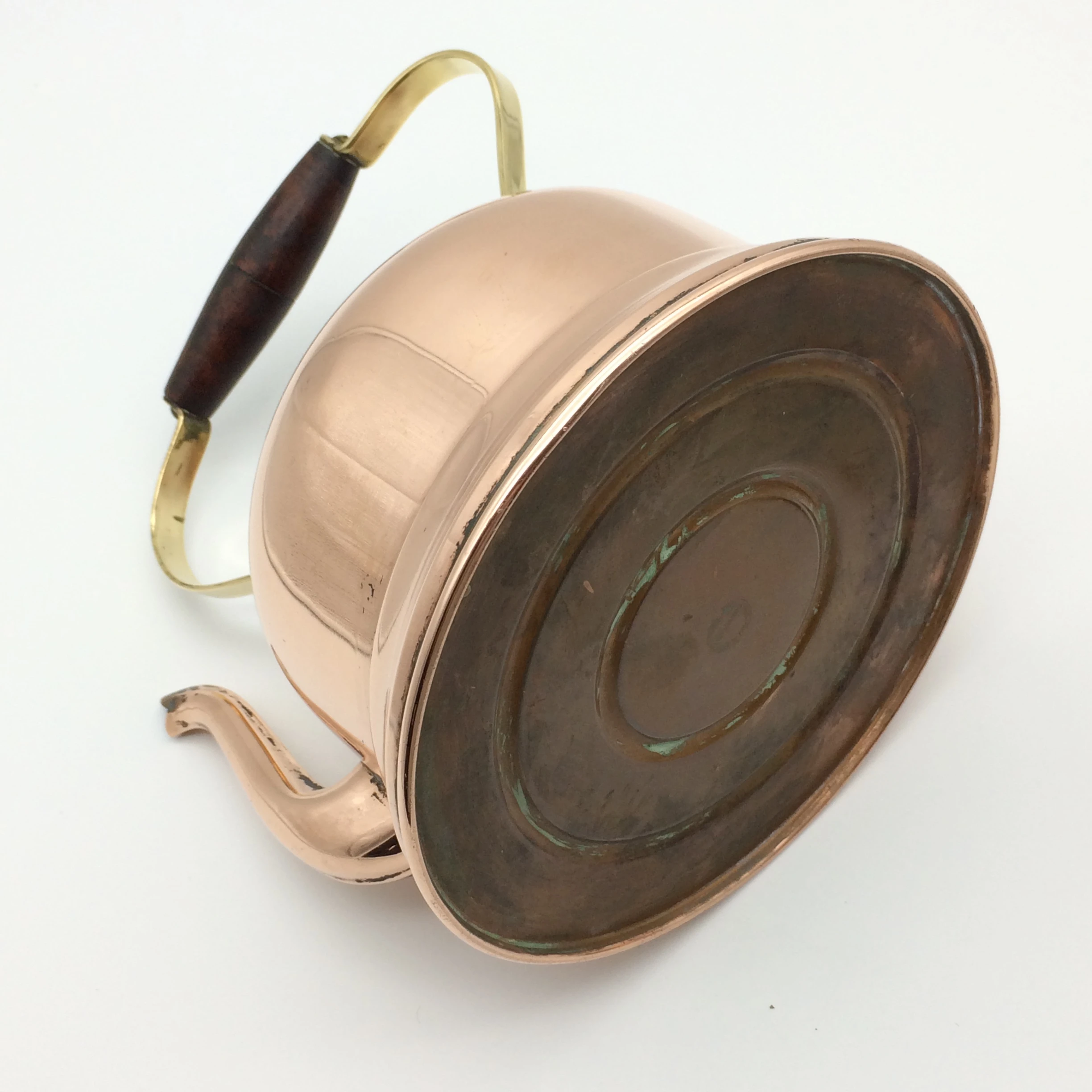 This beautiful, antique copper kettle, with a copper riveted brass and wooden handle, from the early 1900’s is in excellent condition for its age. There’s an impressed stamp on the base - ‘LISBON’ ‘COPPERWARE’ ‘MADE IN PORTUGAL.’ It stands 21cm high, with a spout to handle measurement of 20cm, a base diameter of 17.5cm and weighs 665g.