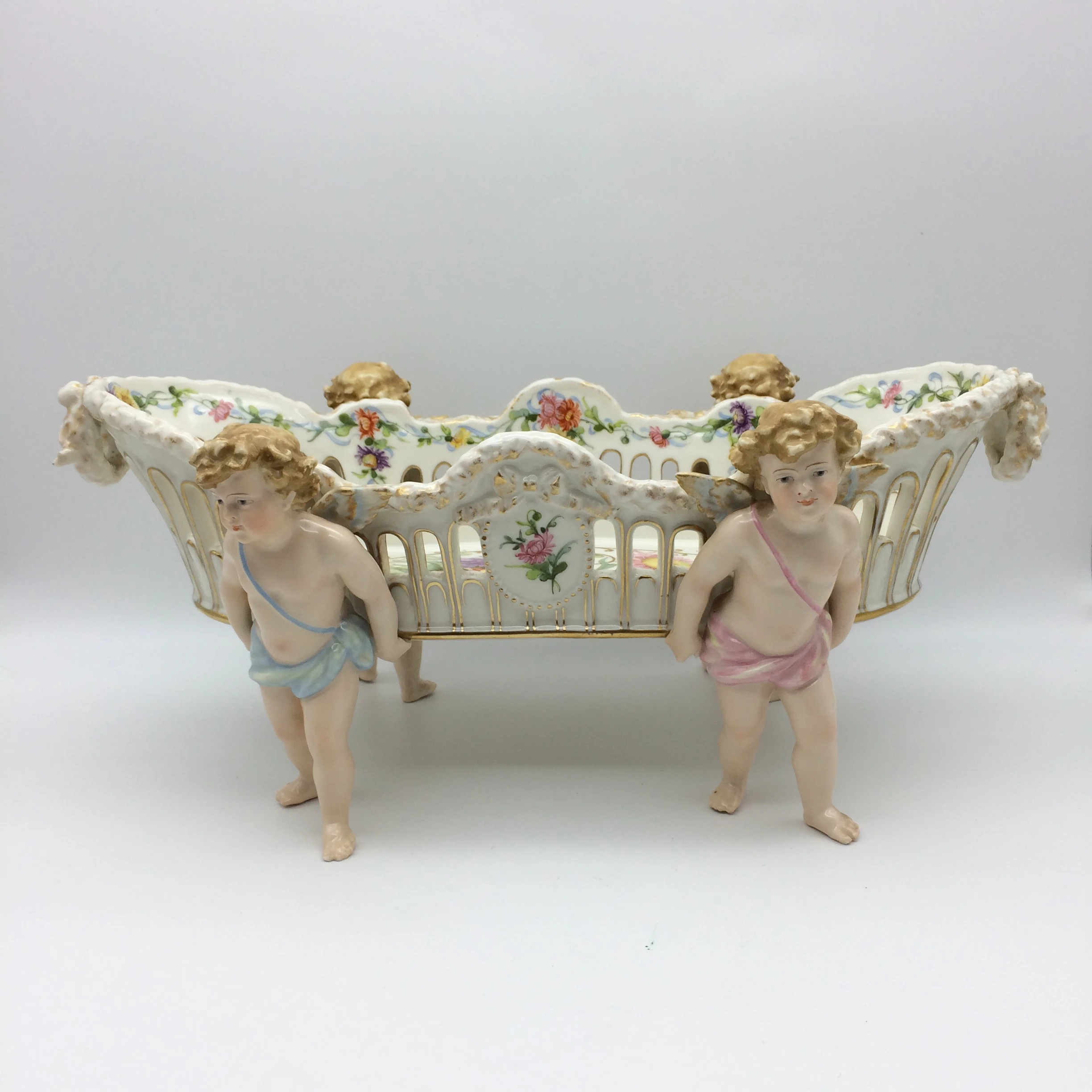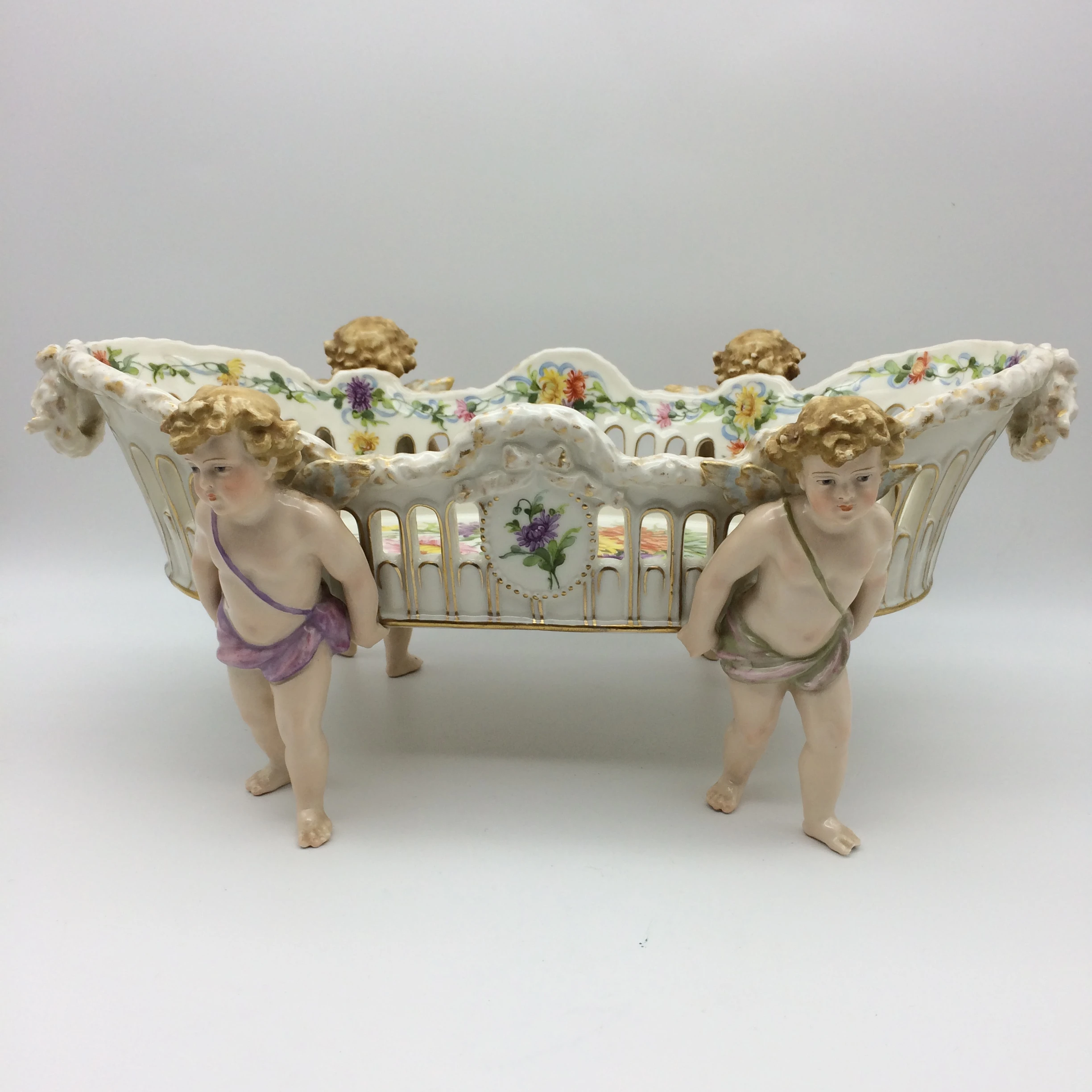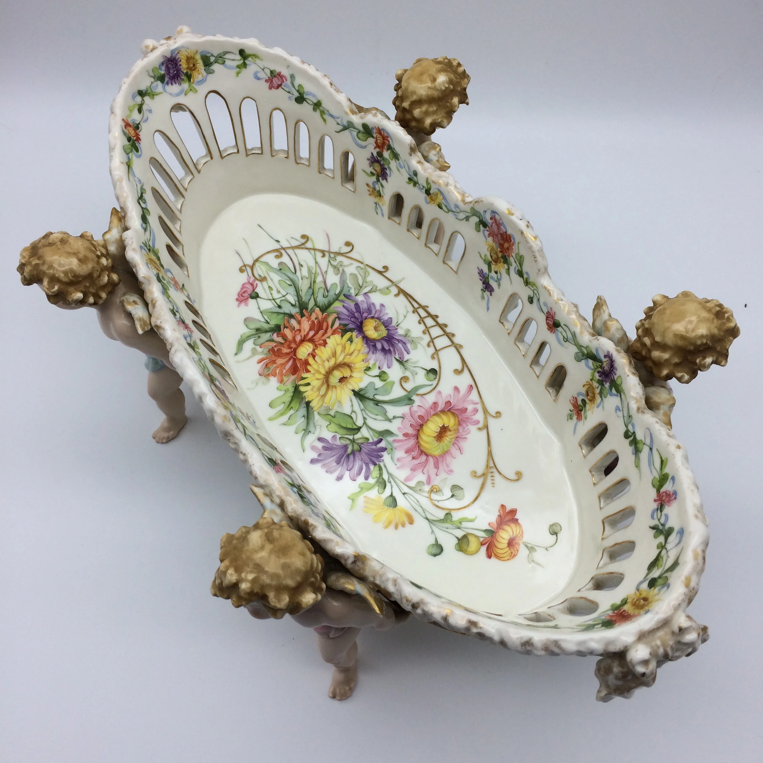 This amazing, antique porcelain centrepiece/fruit bowl was manufactured in Plaue, Germany by the well-known ‘Von Schierholz’ porcelain factory in the late 1800’s. The large, oval bowl is supported by four beautifully hand painted cherubs and has pierced sides with gold trimmings. It is decorated with exquisitely painted garlands of flowers, in various colours, around the edge and hanging down in places with a pretty bunch of hand painted, colourful flowers in the centre. Other than a very small chip to the foot of one of the cherubs it is in excellent condition. It has the early ‘Von Schierholz’ blue mark, under glaze, on the base, which was used between 1865 and 1907. It measures 41cm x 25cm, stands 16cm high and weighs 2.23kg’s.
