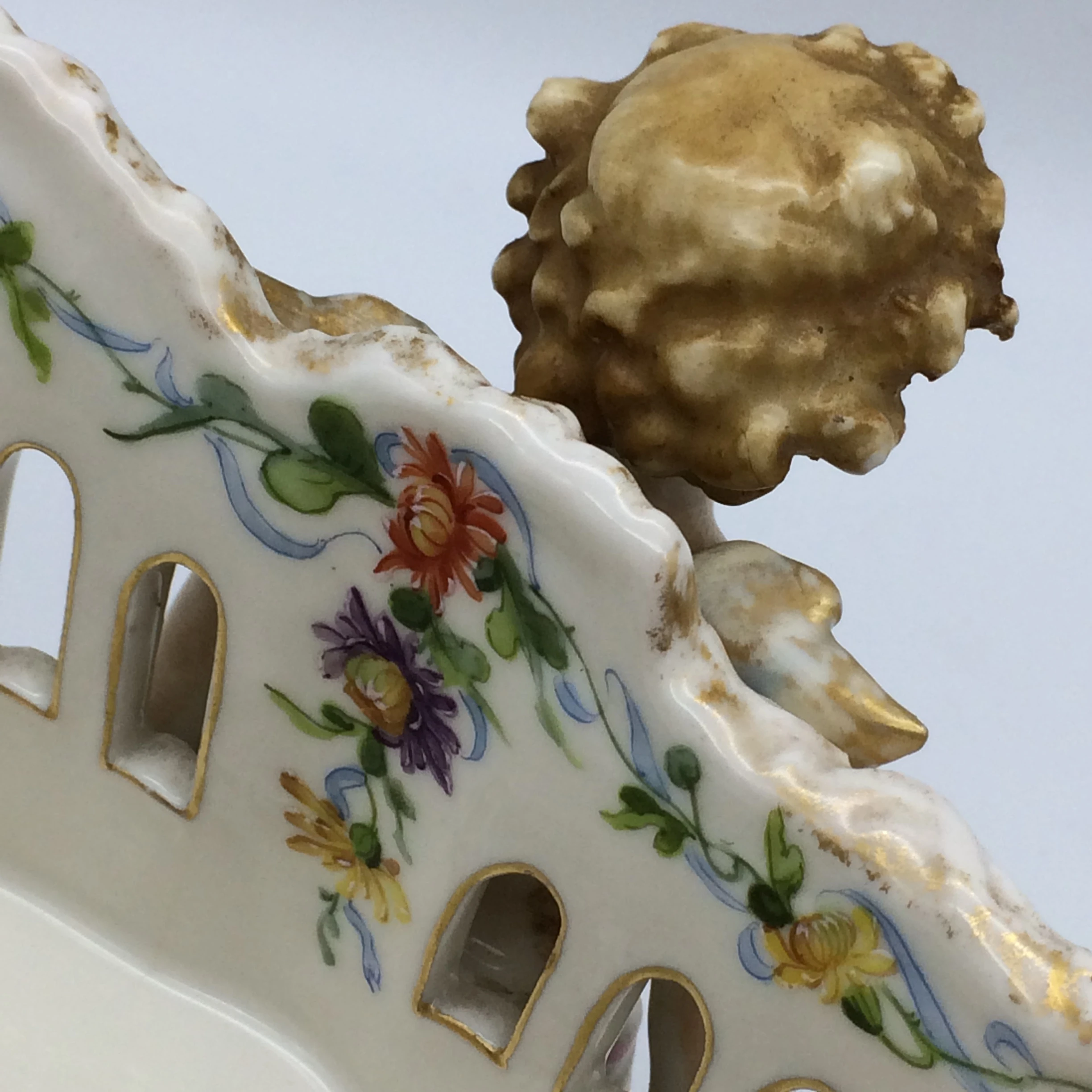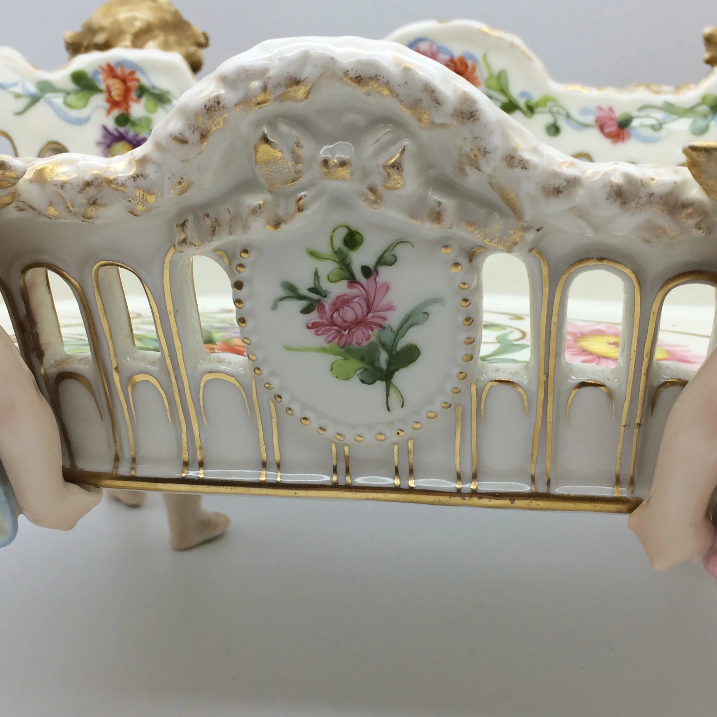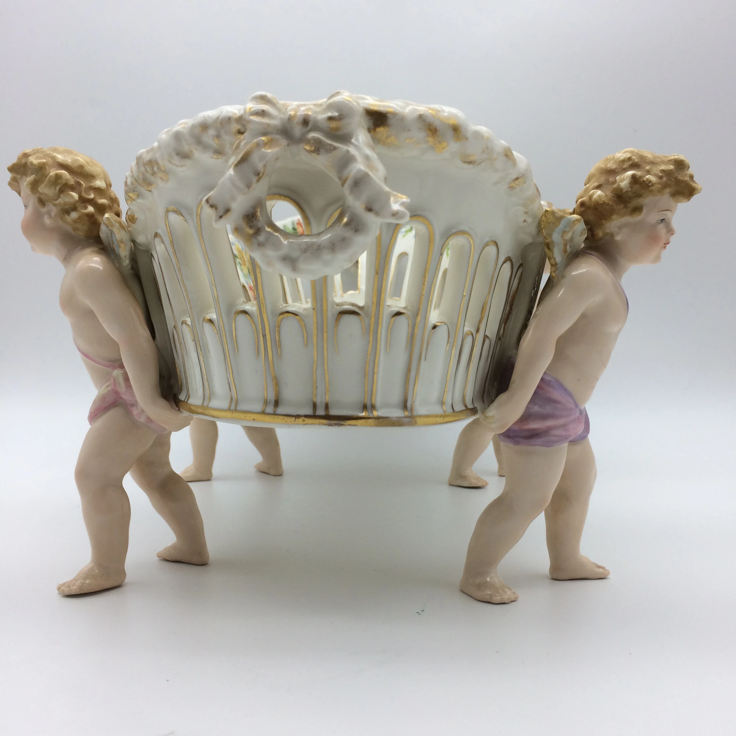 This amazing, antique porcelain centrepiece/fruit bowl was manufactured in Plaue, Germany by the well-known ‘Von Schierholz’ porcelain factory in the late 1800’s. The large, oval bowl is supported by four beautifully hand painted cherubs and has pierced sides with gold trimmings. It is decorated with exquisitely painted garlands of flowers, in various colours, around the edge and hanging down in places with a pretty bunch of hand painted, colourful flowers in the centre. Other than a very small chip to the foot of one of the cherubs it is in excellent condition. It has the early ‘Von Schierholz’ blue mark, under glaze, on the base, which was used between 1865 and 1907. It measures 41cm x 25cm, stands 16cm high and weighs 2.23kg’s.