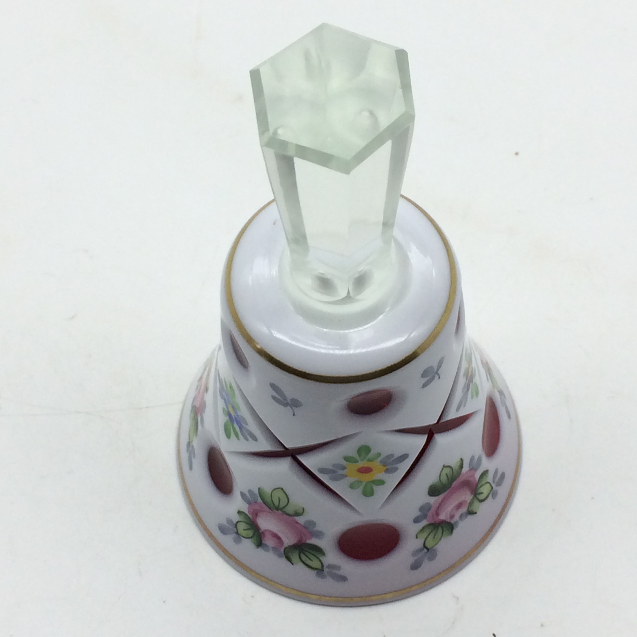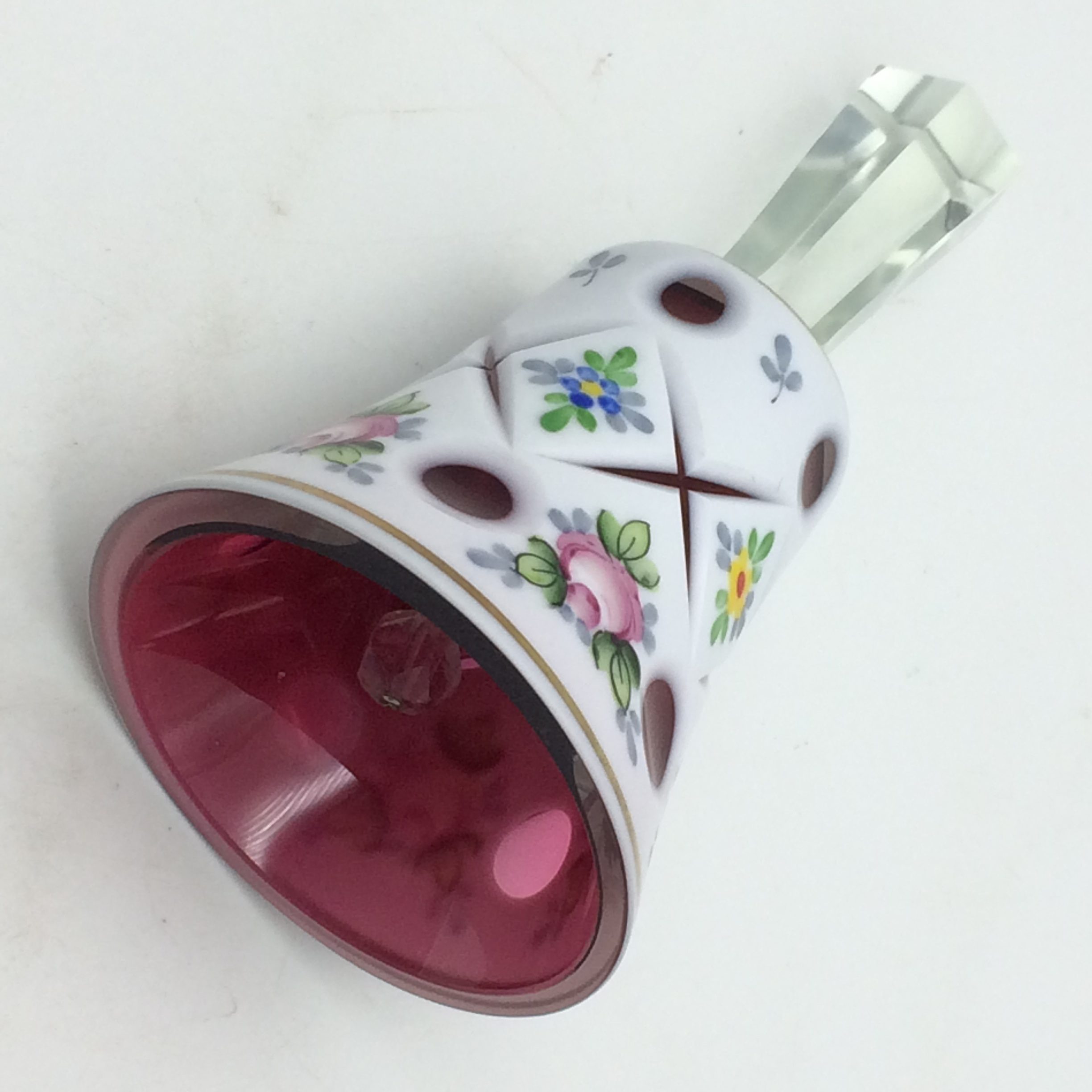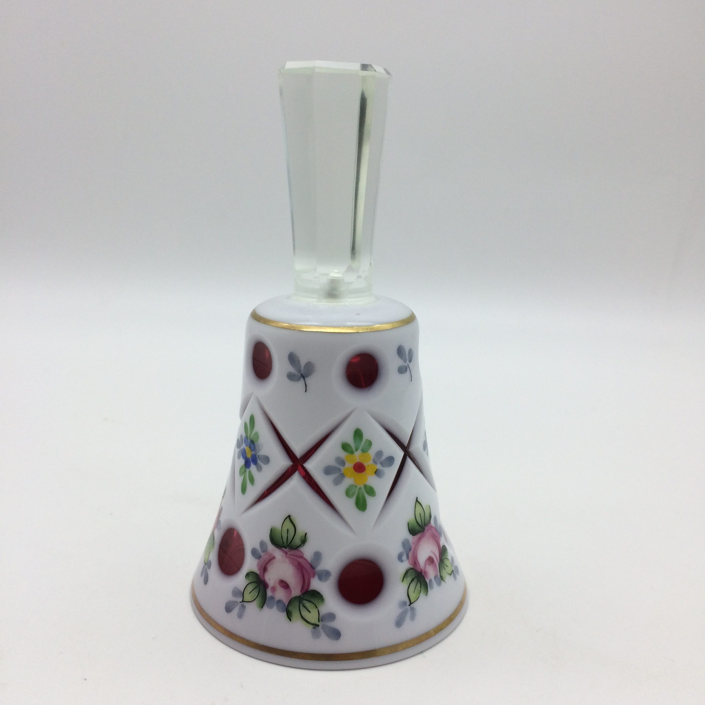 This lovely, bohemian art glass bell has been beautifully hand-painted with flowers in various colours and finished off with gilt edges. It has a solid hexangular shaped clear crystal handle, with a cranberry colour glass bell, and a white glass overlay, which has been decoratively cut back to reveal the cranberry glass underneath. The crystal bell is in excellent condition, stands 12,8cm high, has a diameter of 7cm and weighs 226,4g.