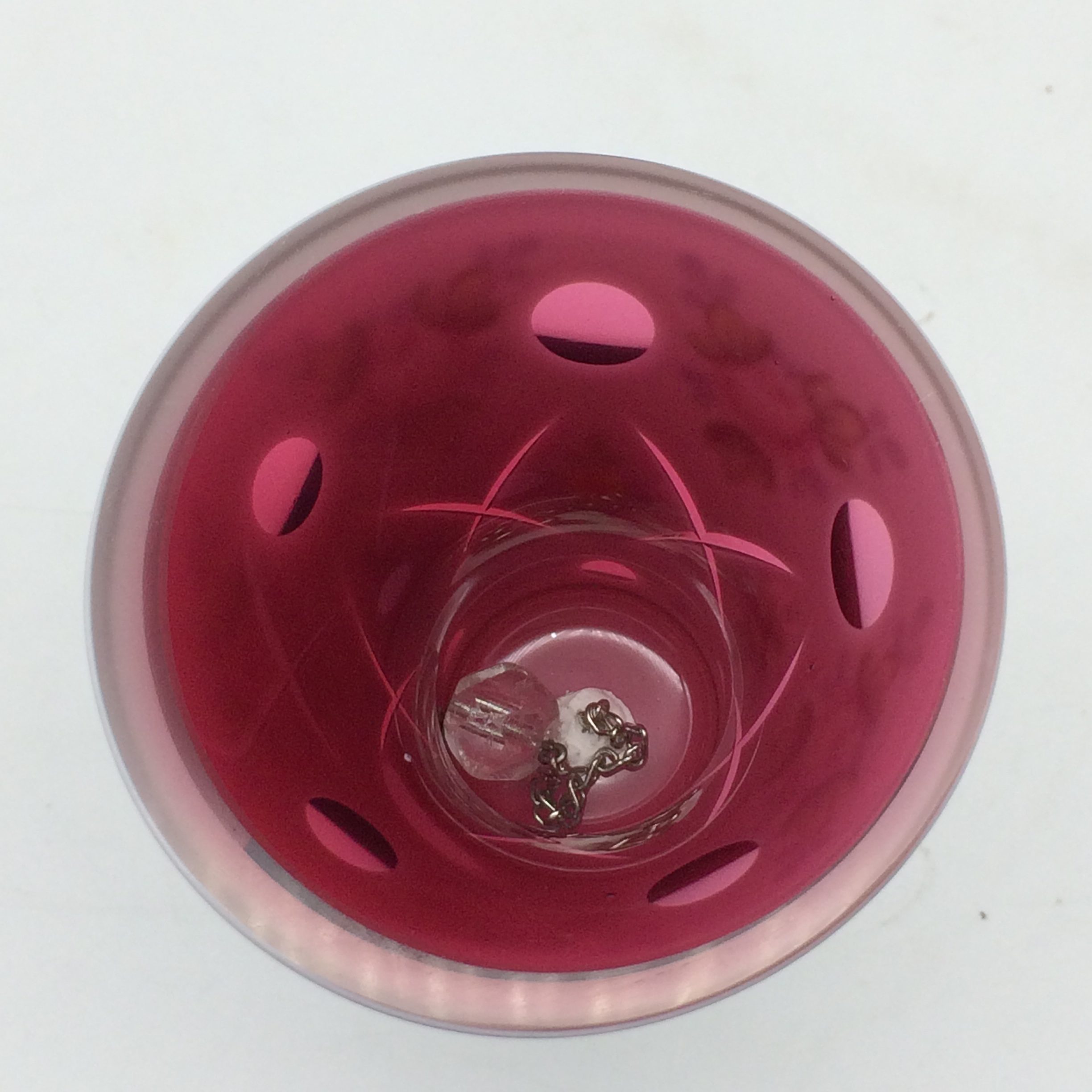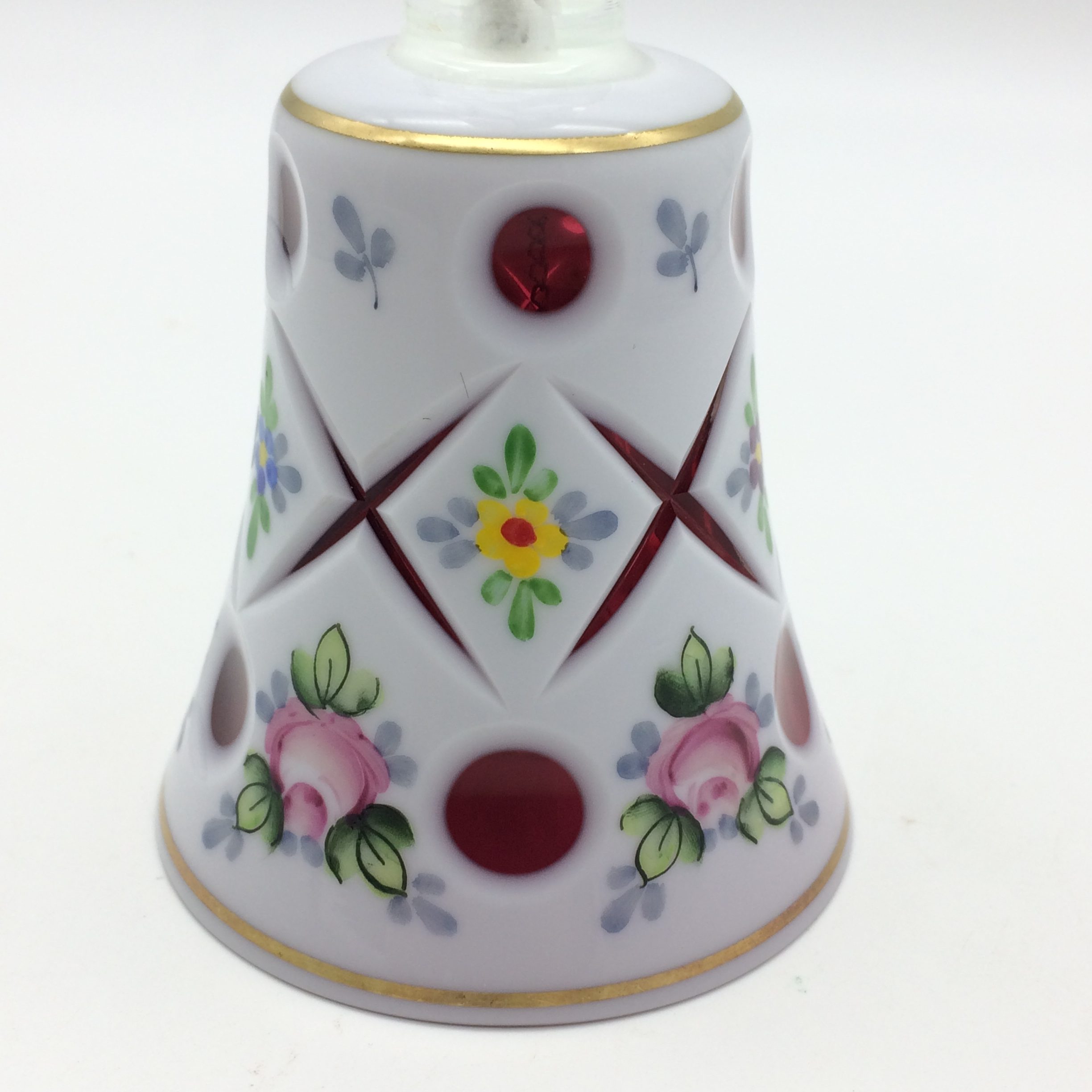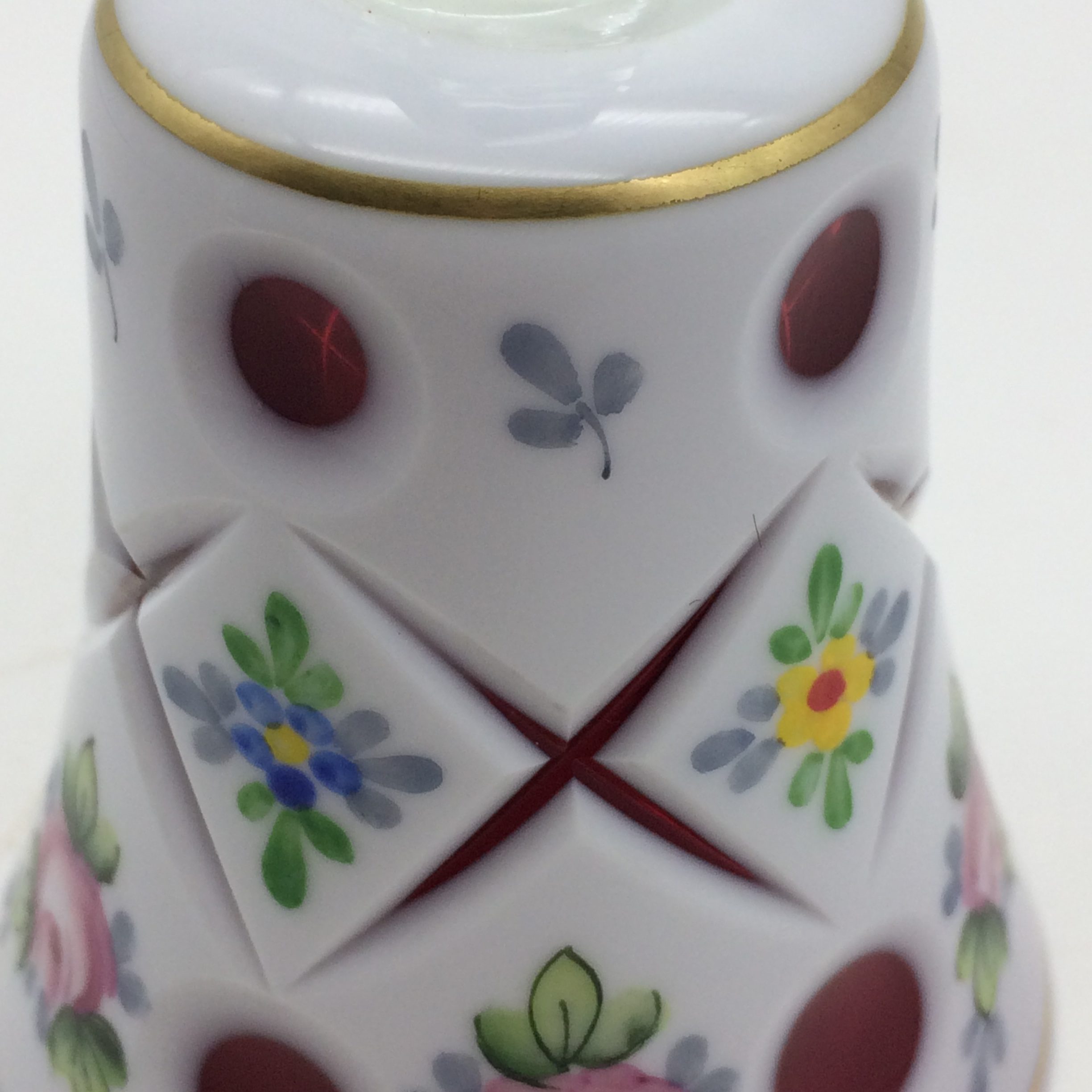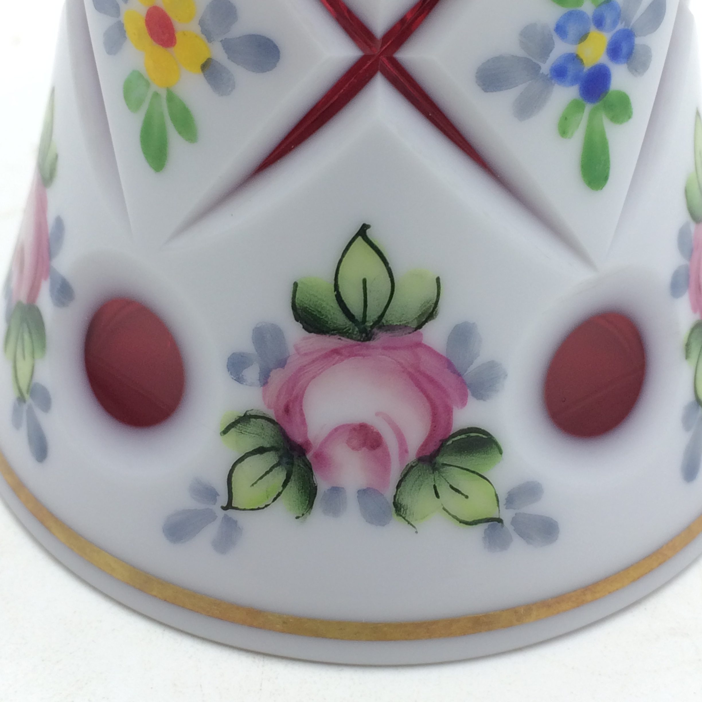 This lovely, bohemian art glass bell has been beautifully hand-painted with flowers in various colours and finished off with gilt edges. It has a solid hexangular shaped clear crystal handle, with a cranberry colour glass bell, and a white glass overlay, which has been decoratively cut back to reveal the cranberry glass underneath. The crystal bell is in excellent condition, stands 12,8cm high, has a diameter of 7cm and weighs 226,4g.