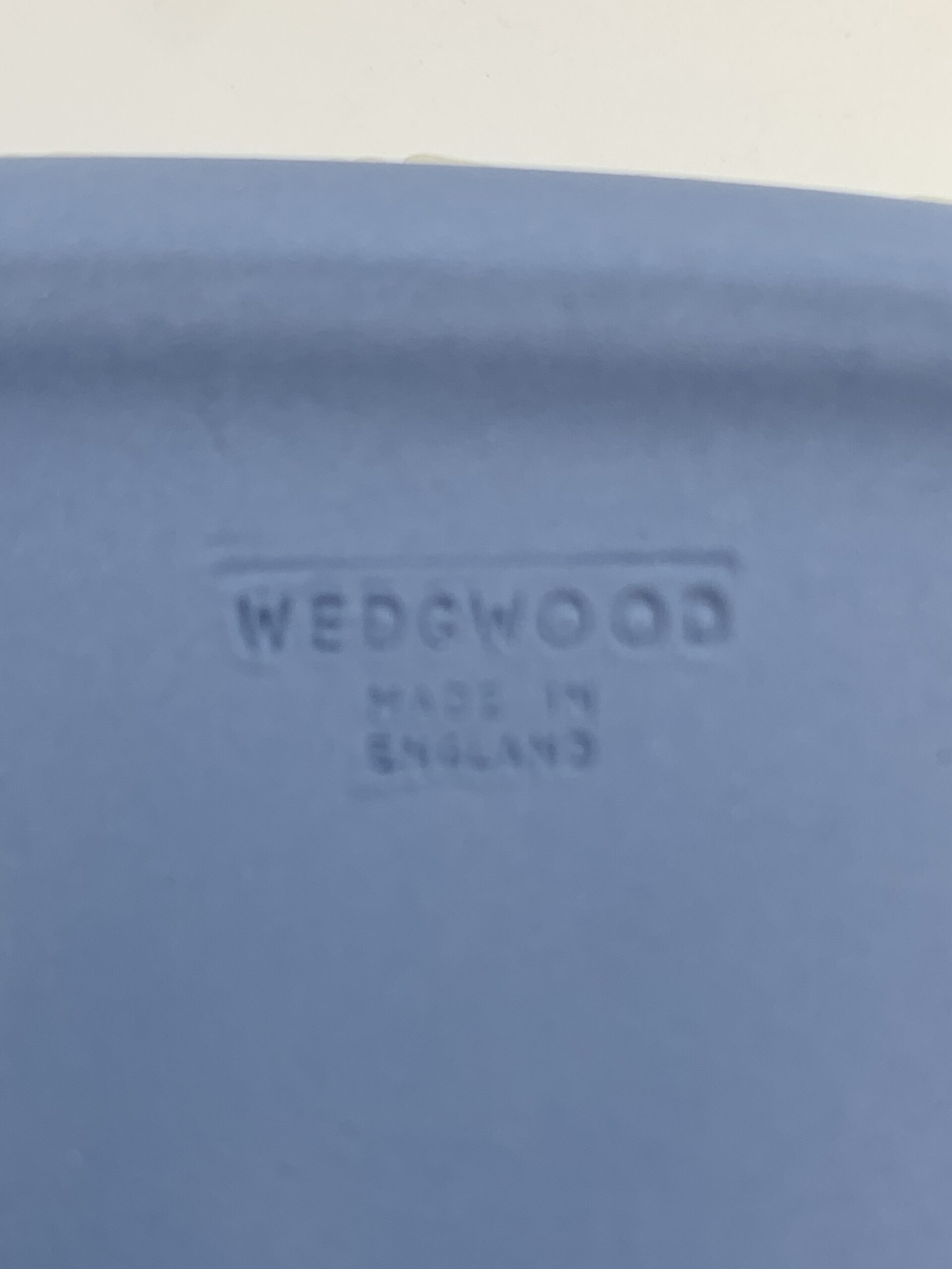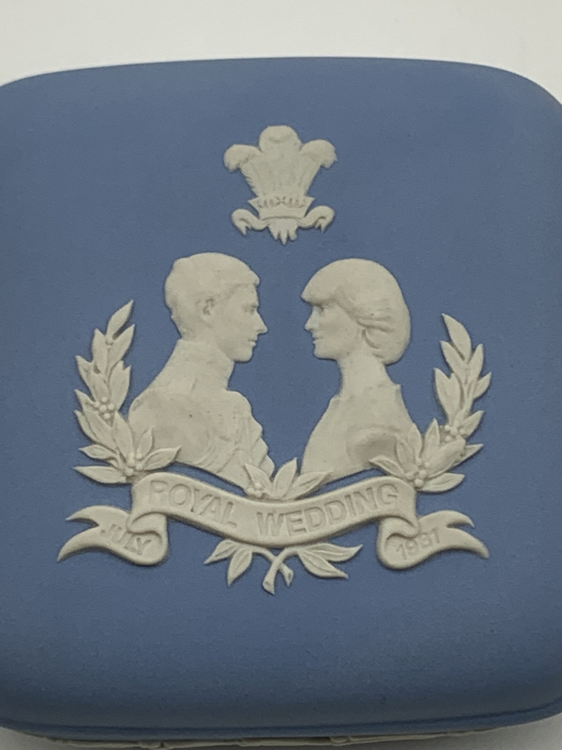 This lovely, 1980’s, pale blue jasperware, lidded trinket box celebrating the Royal wedding of ‘Charles & Diana’ in July 1981 is beautifully decorated in white relief. The box is in excellent condition and is impressed on the base ‘WEDGWOOD, MADE IN ENGLAND’. It measures 7,5cm x 7,5cm and stands 4cm high.