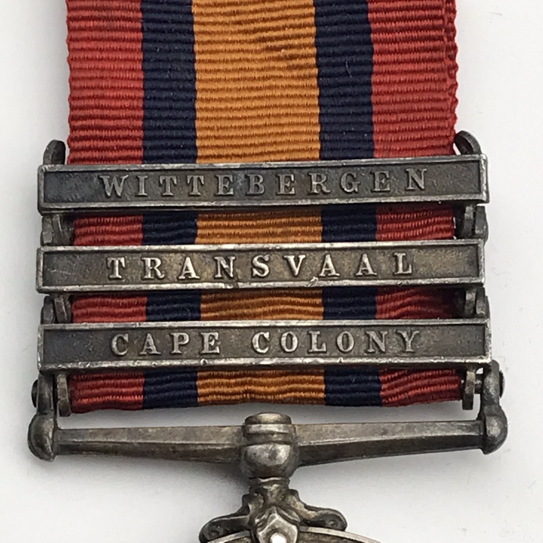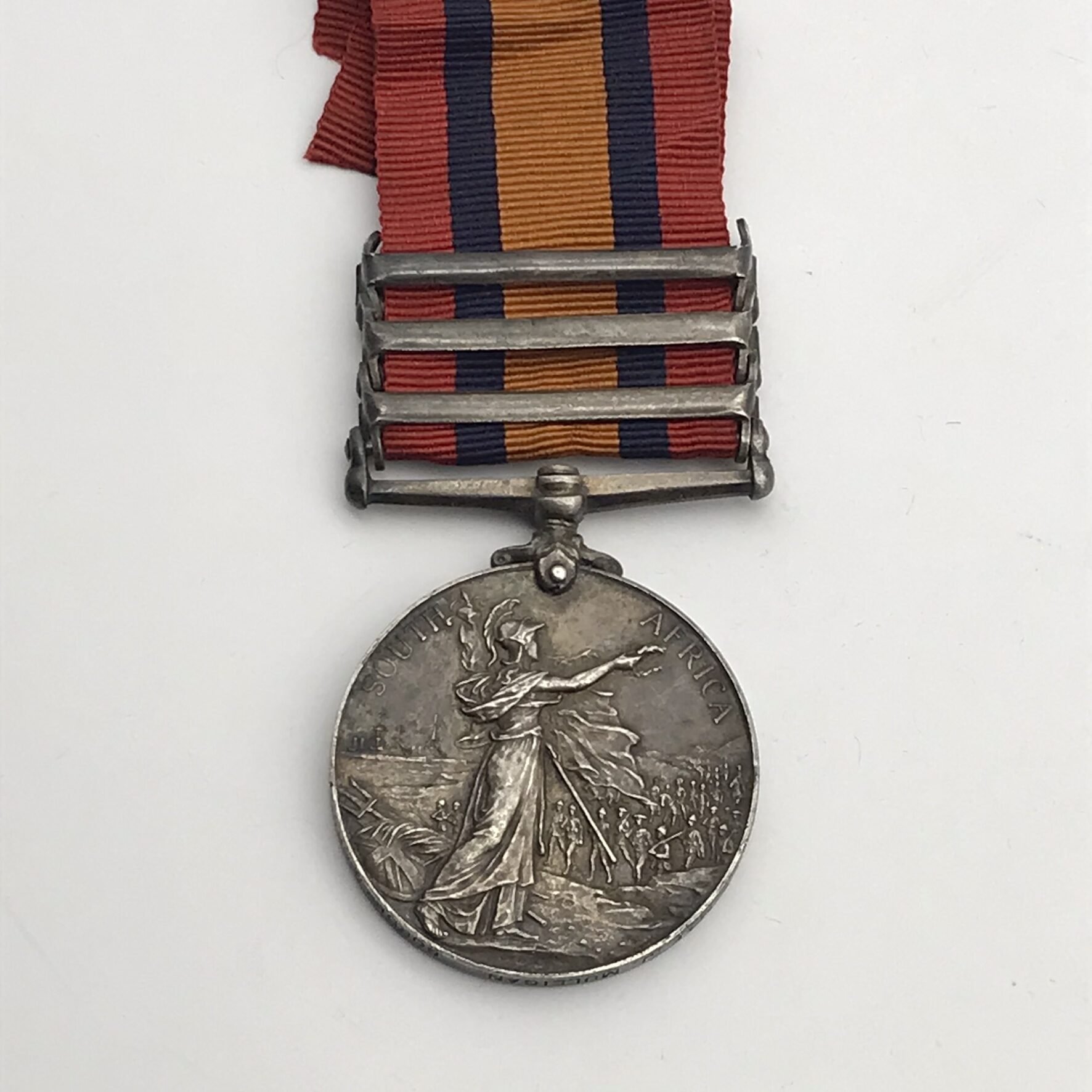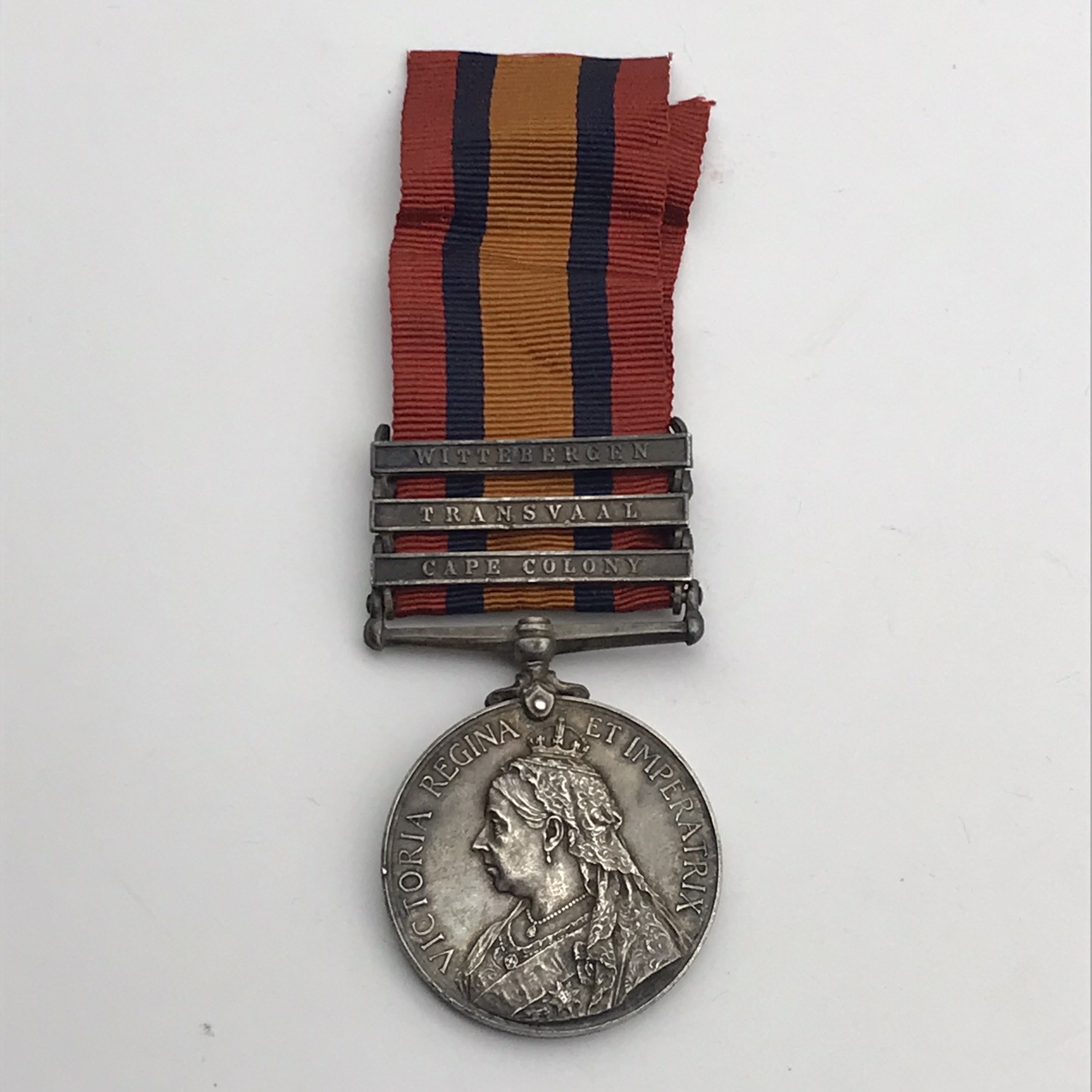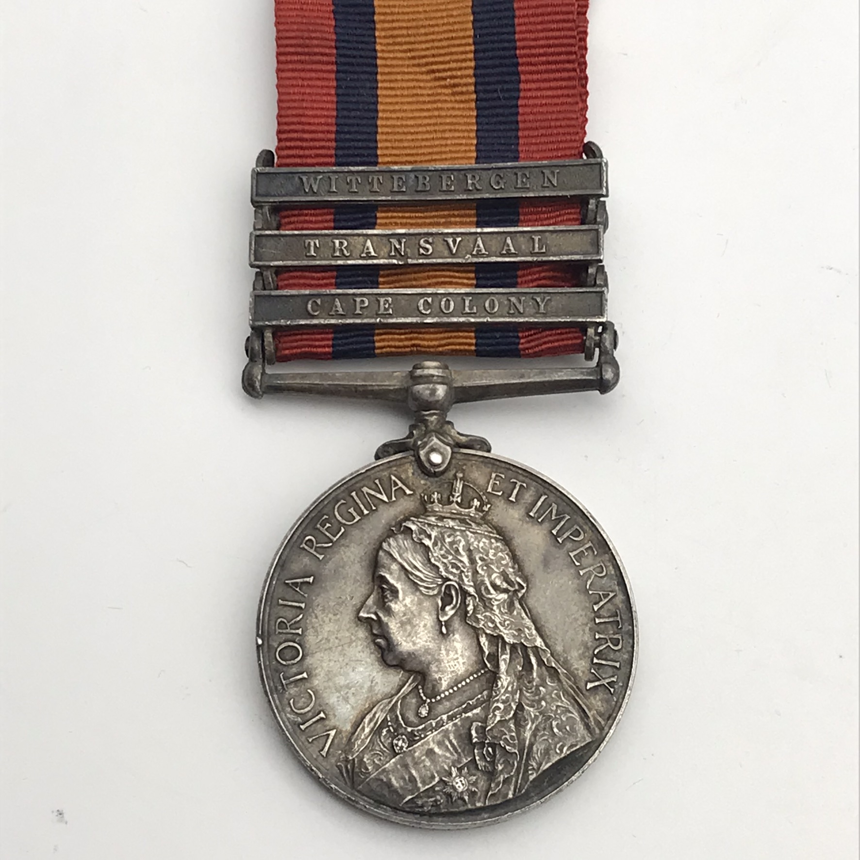 This original, scarce, full size ‘Queen South Africa’ medal is issued to a high rank (R.S.M), very seldom seen. It has three clasps: (Cape Colony, Transvaal, Wittebergen), and was awarded to ‘Regimental Sergeant Major (RSM) F. J. Mulligan (Francis James)’ who served with the ‘Border Horse’. This medal is un-researched, but confirmed on the roll, is in great condition, with its original ribbon, and nicely tarnished.