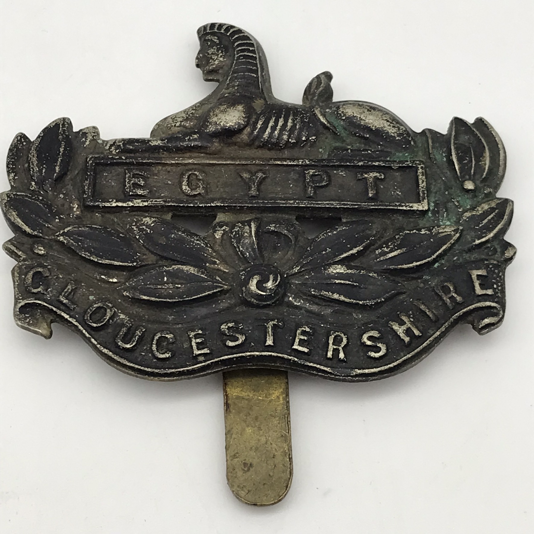 This early, original, darkened metal British cap badge worn by the ‘Gloucestershire Regiment’ is in excellent condition, complete with slider and measures 53mm x 42mm.