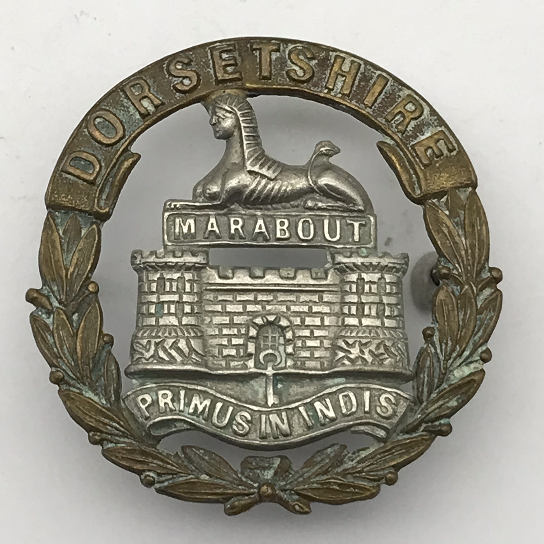 This original, Victorian, bi-metal cap badge was worn by the ‘Dorsetshire Regiment’ between 1895 and 1901. It is in good condition with both lugs intact (squashed), and measures 41mm x 41mm.