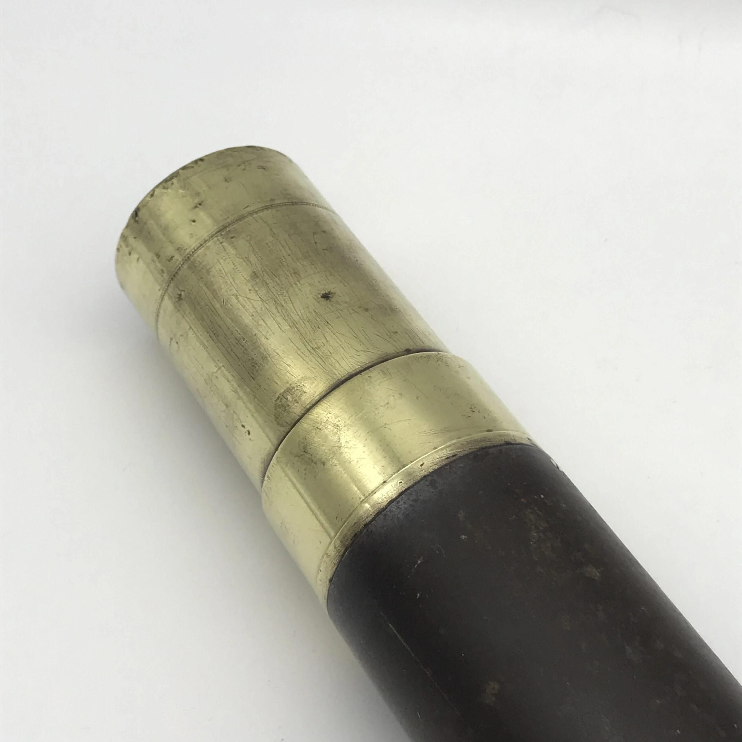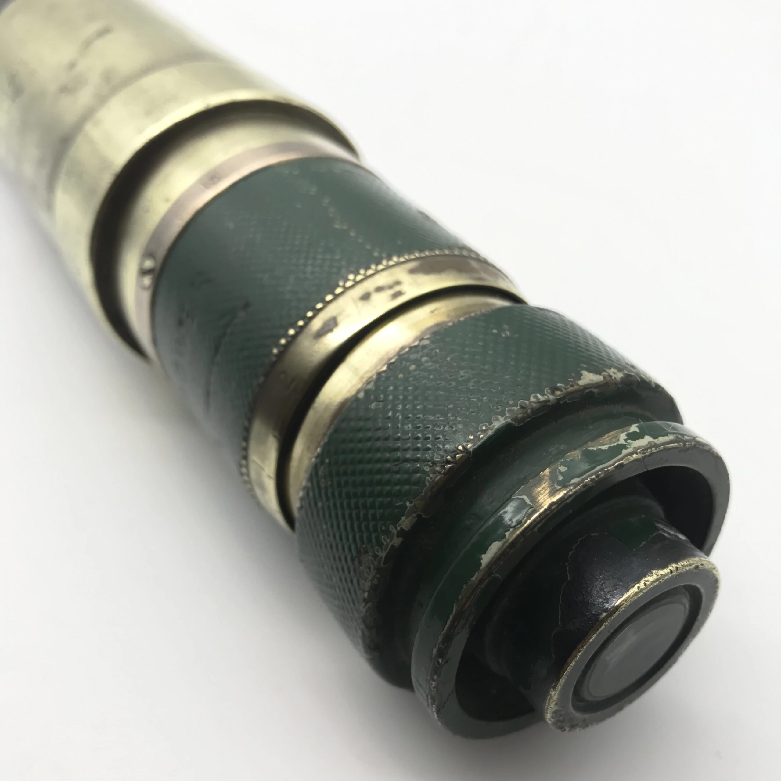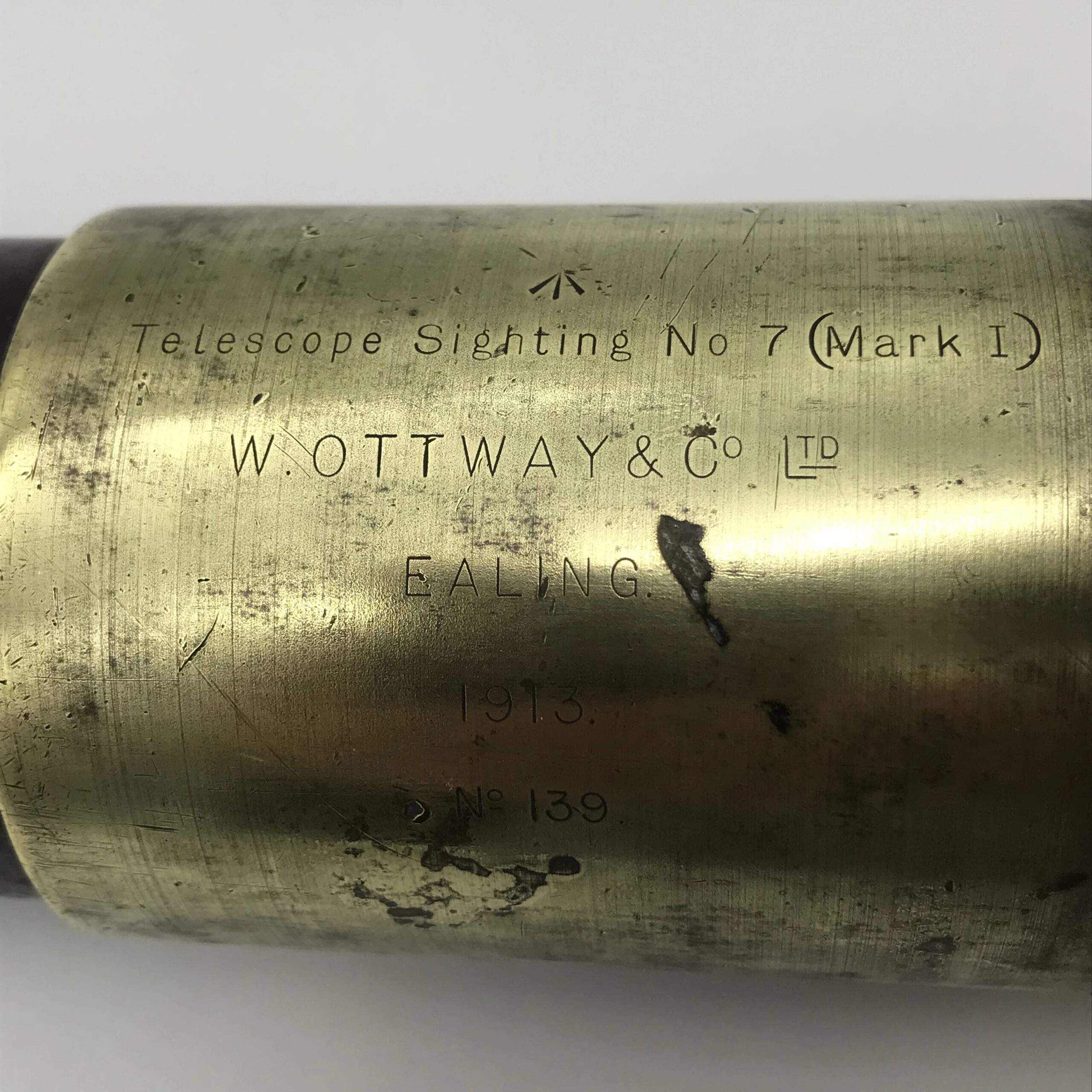 This heavy, large, original, brass No. 7 (Mark 1) British Artillery/Naval sighting telescope was manufactured by ‘W. Ottway & Co.’ in Ealing, London in 1913. It seems to be in good condition with nice clear optics and great magnification. It is fully marked with the manufacturer’s details, model number, date as well as the military issue Broad Arrow stamp. The inscription stamped in the brass reads: ‘Telescope Sighting No 7 (Mark I), W. OTTWAY & Co. Ltd, EALING, 1913, No. 139.’ It weighs a heavy 4395g and measures 75cm in length x 6.5cm in width (at its widest).