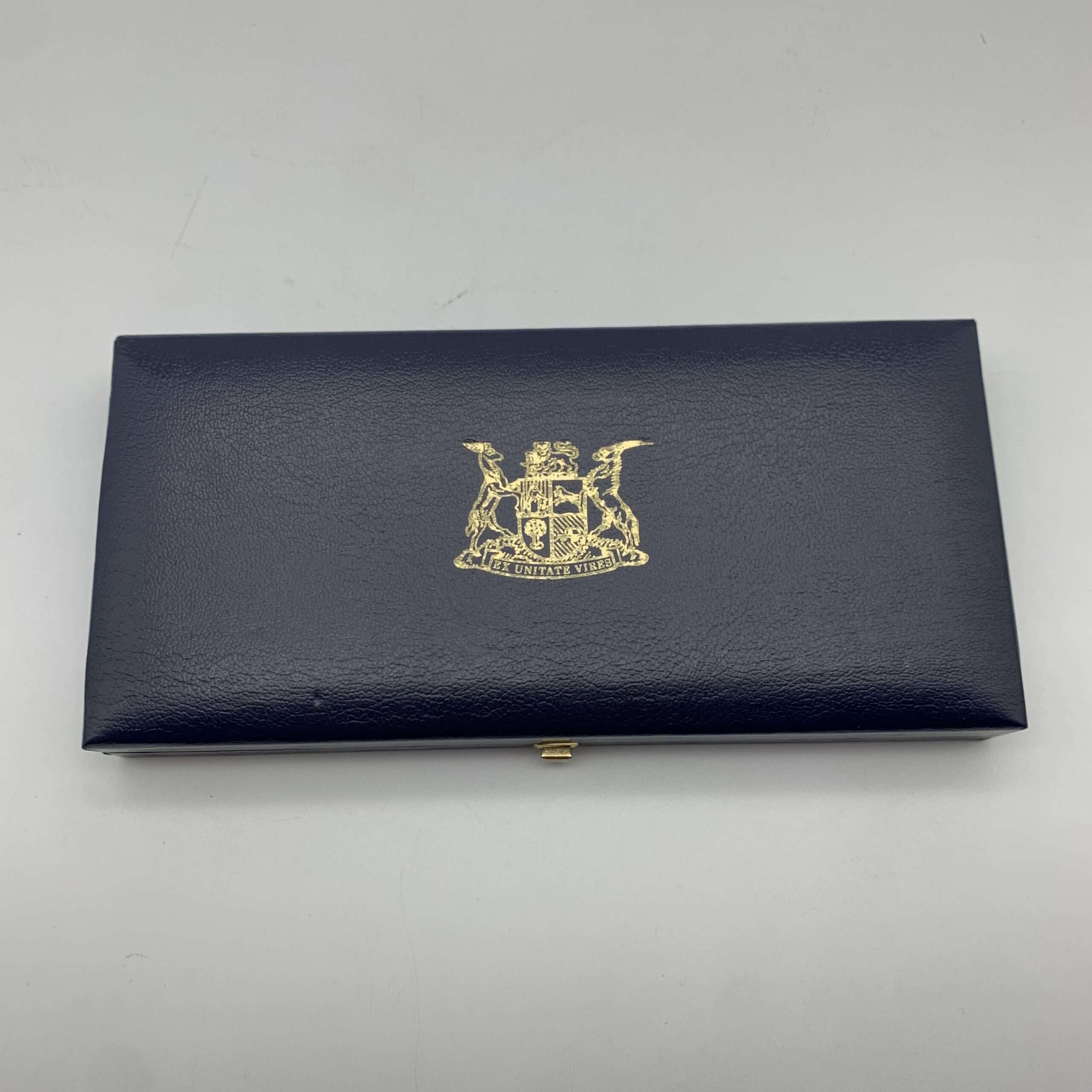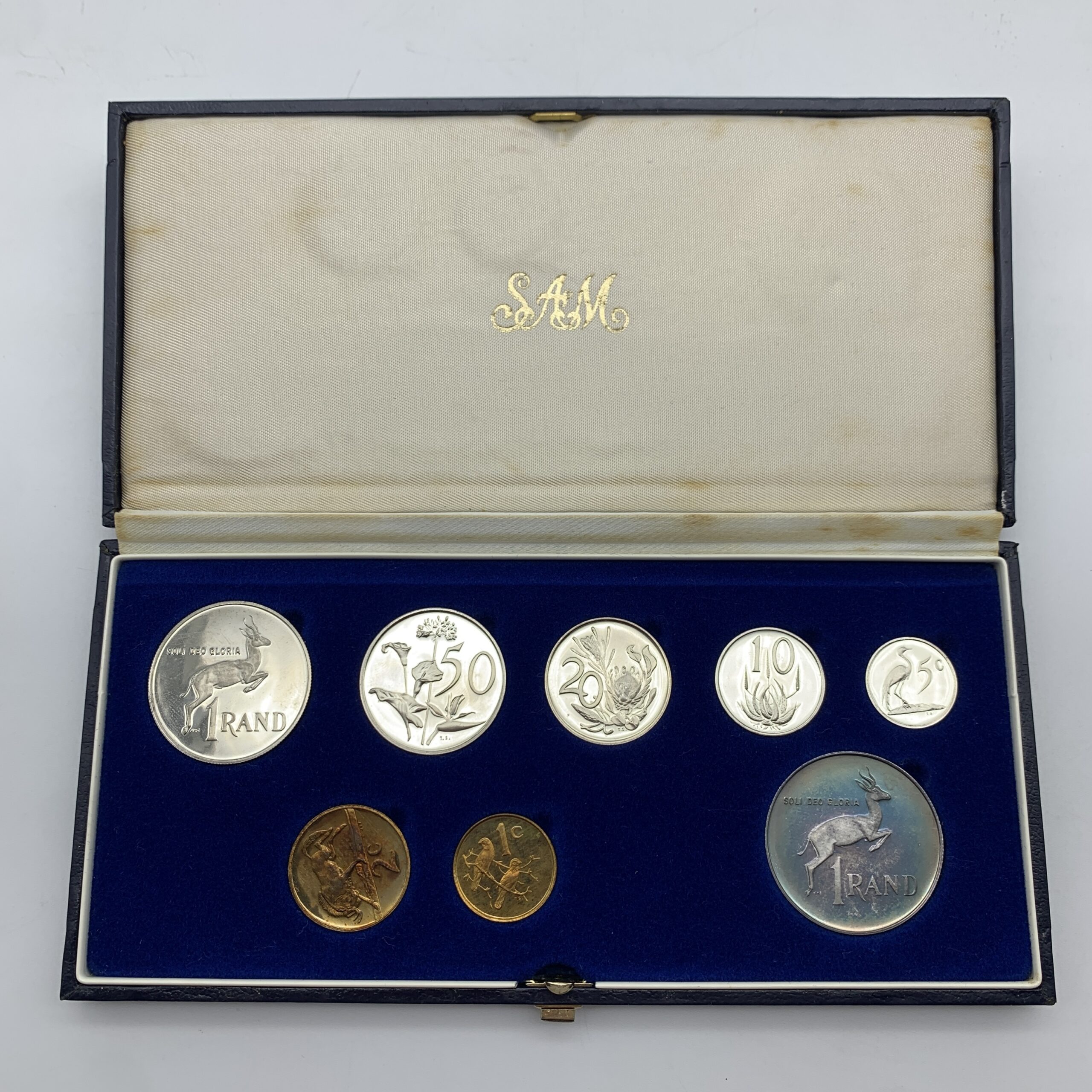 This original, cased, ‘1989’ South African short proof set consists of eight coins, one of which is the silver R1 coin. Other than slight tarnishing the set is in excellent condition and comes cased in its original S.A. Mint Box.