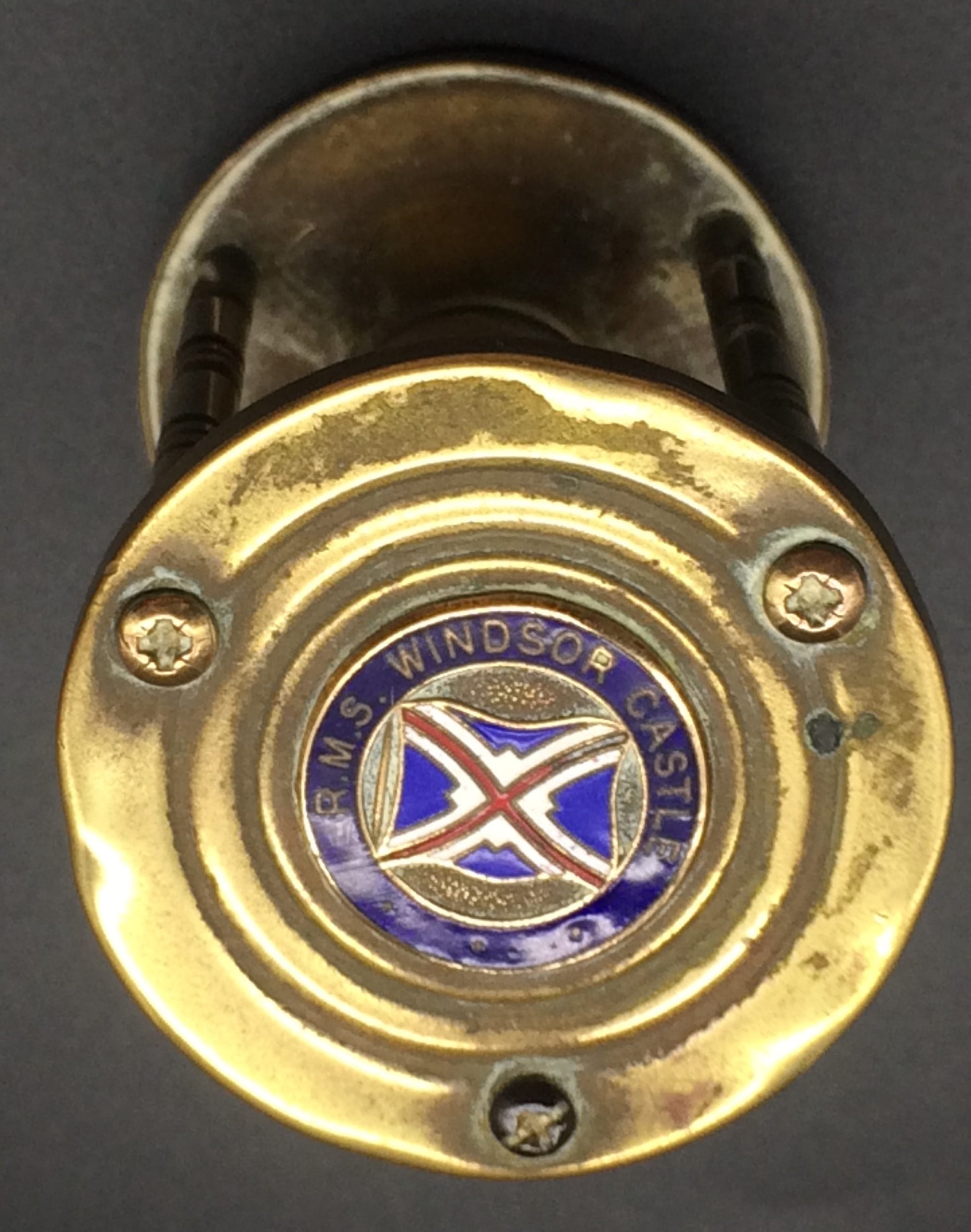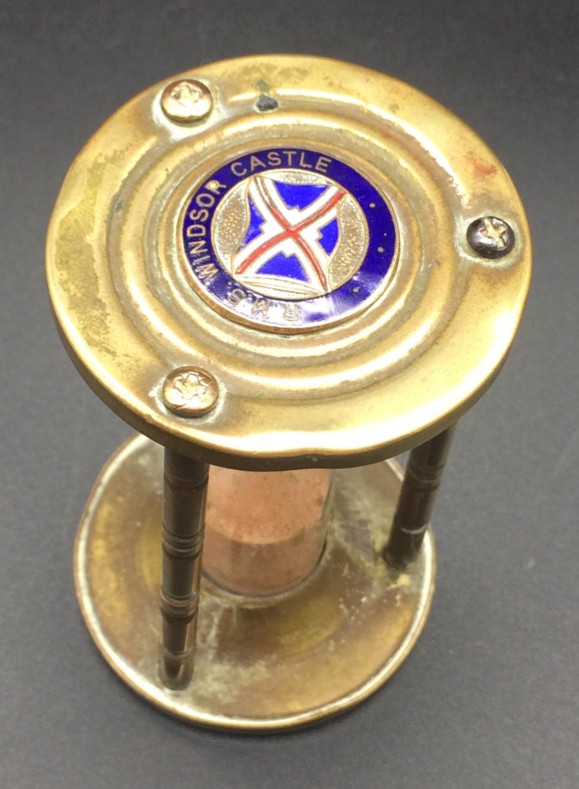 This unusual piece is made from brass and glass, with an enamel emblem, for ‘R.M.S. WINDSOR CASTLE’, on the top. The egg timer is still functional and in a good condition for its age par for a few minor dents. It measures 7.5cm x 5cm and it probably dates from around the 1960’s.