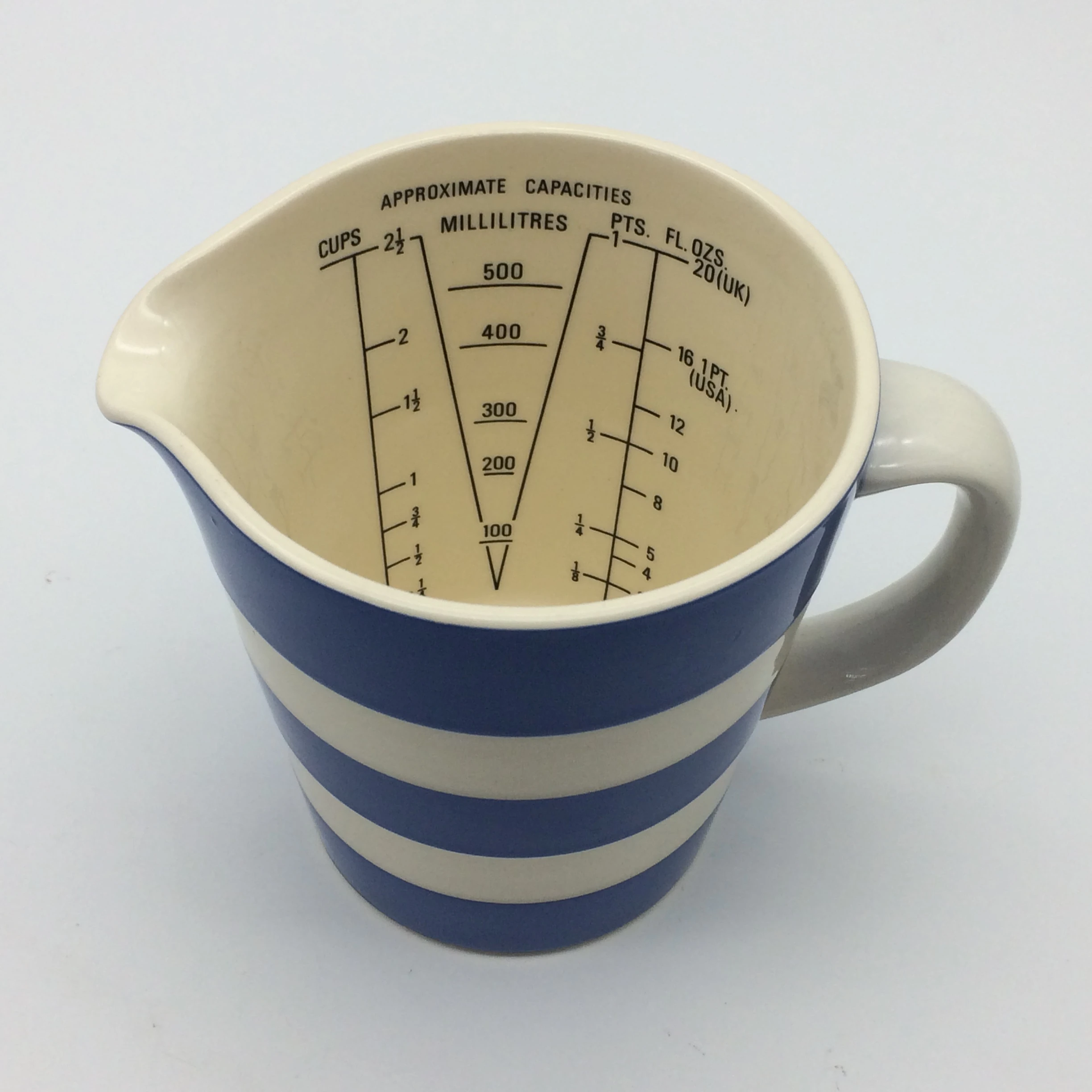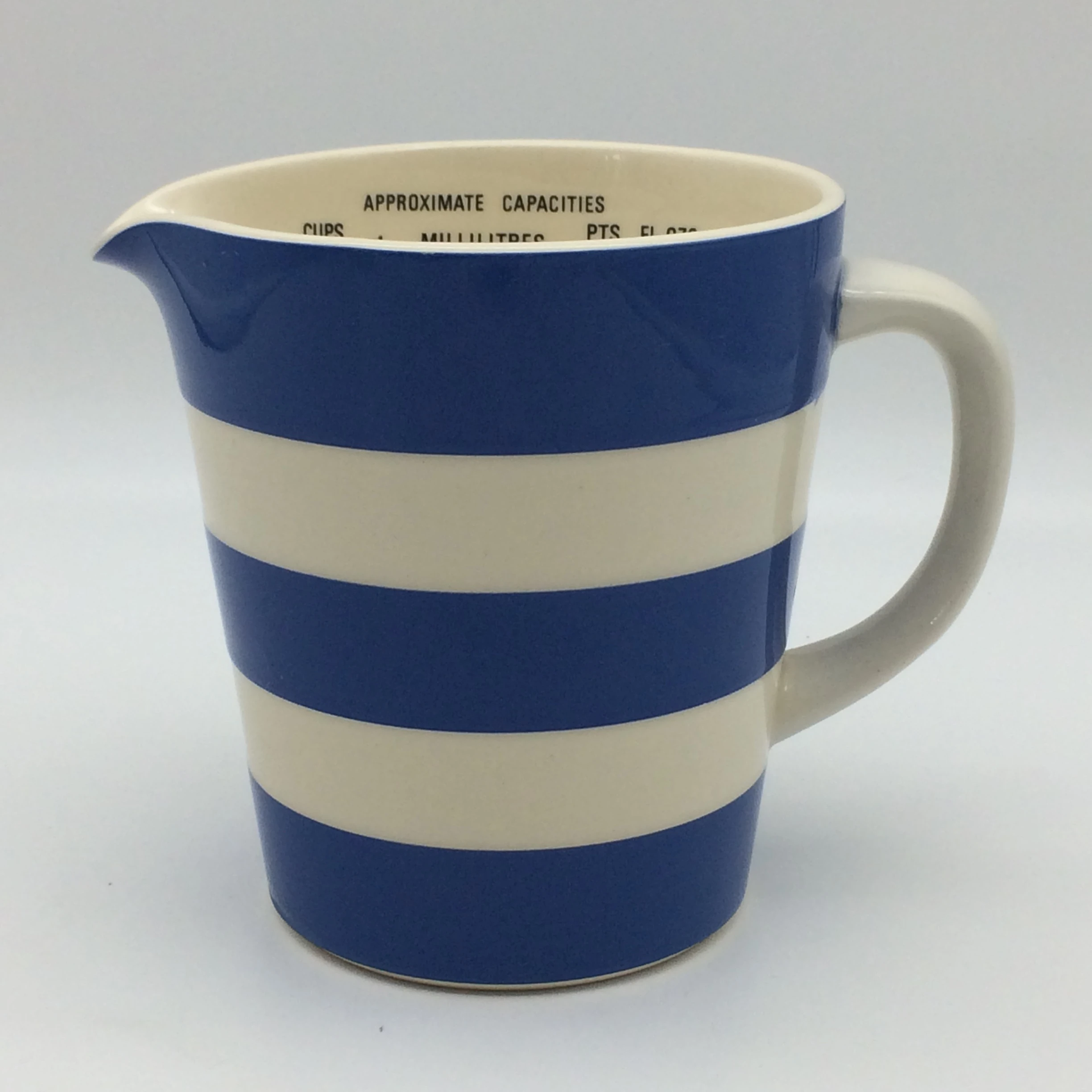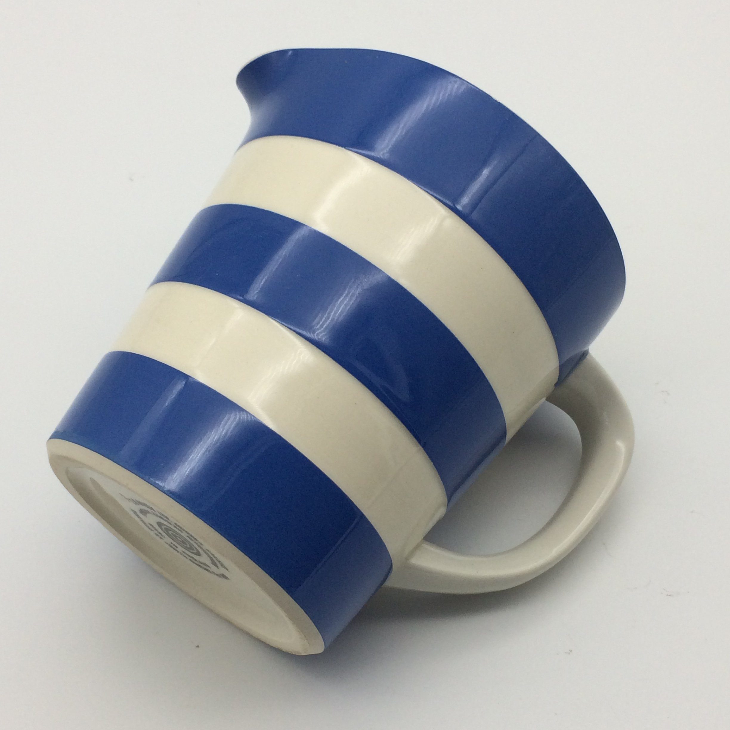This very collectable Cornishware measuring jug, by T.G. Green, is in excellent condition. Made in England and designed by Judith Onions in the 1960’s, it is marked on the base with the circular bullseye mark, which was used between 1968 and 1975. It measures 12cm in height, with a base diameter of 8.2cm, a top diameter of 10.7cm and 15cm handle to spout.