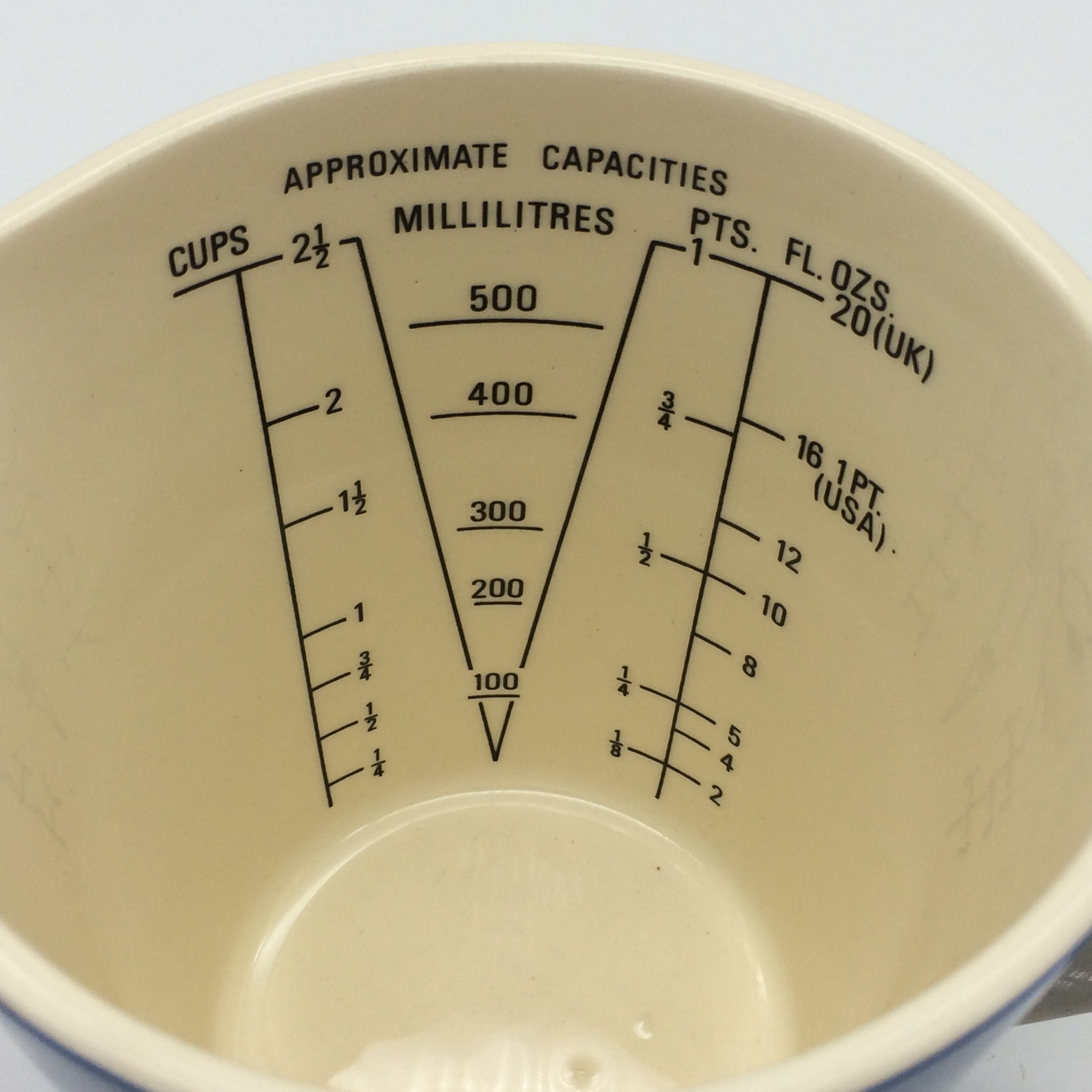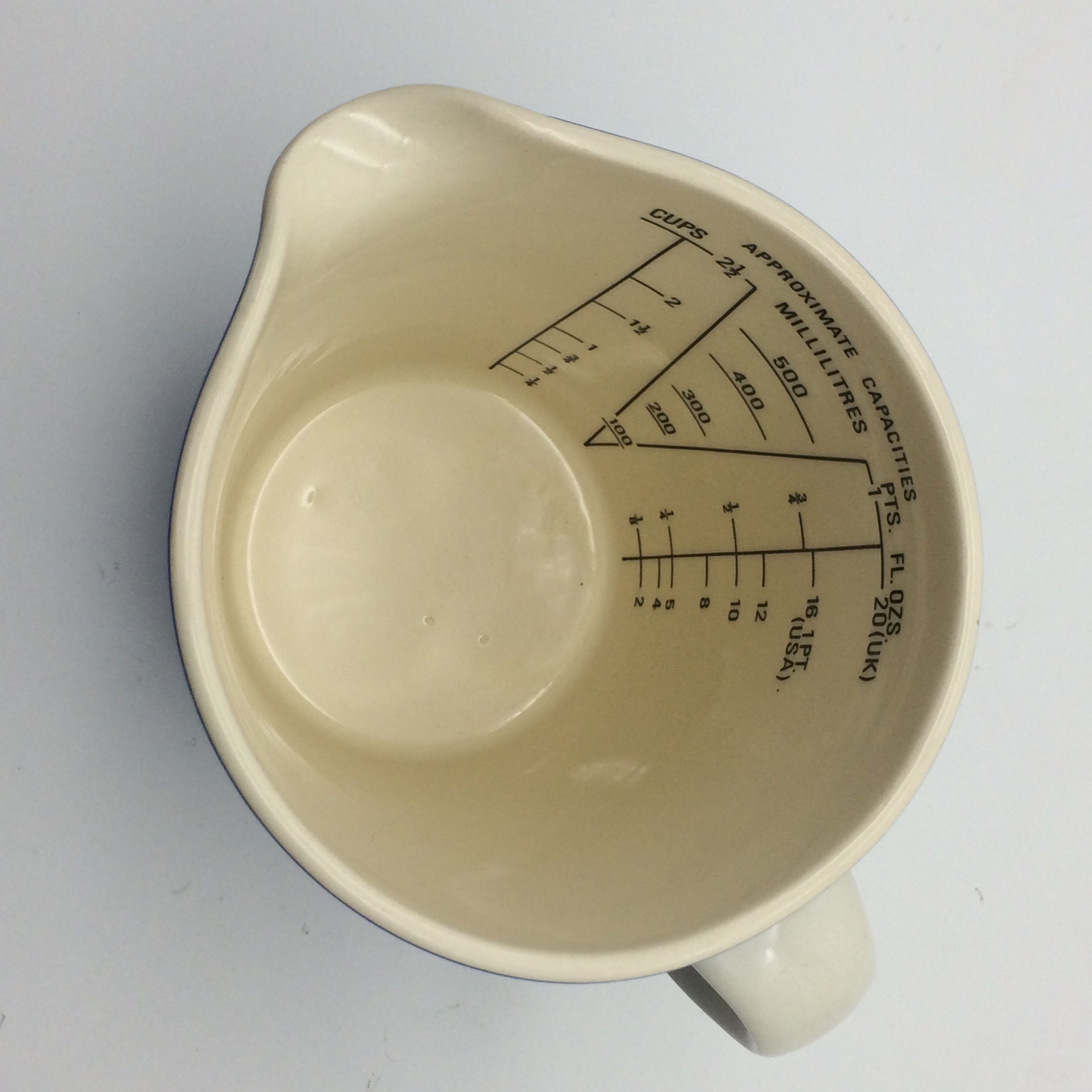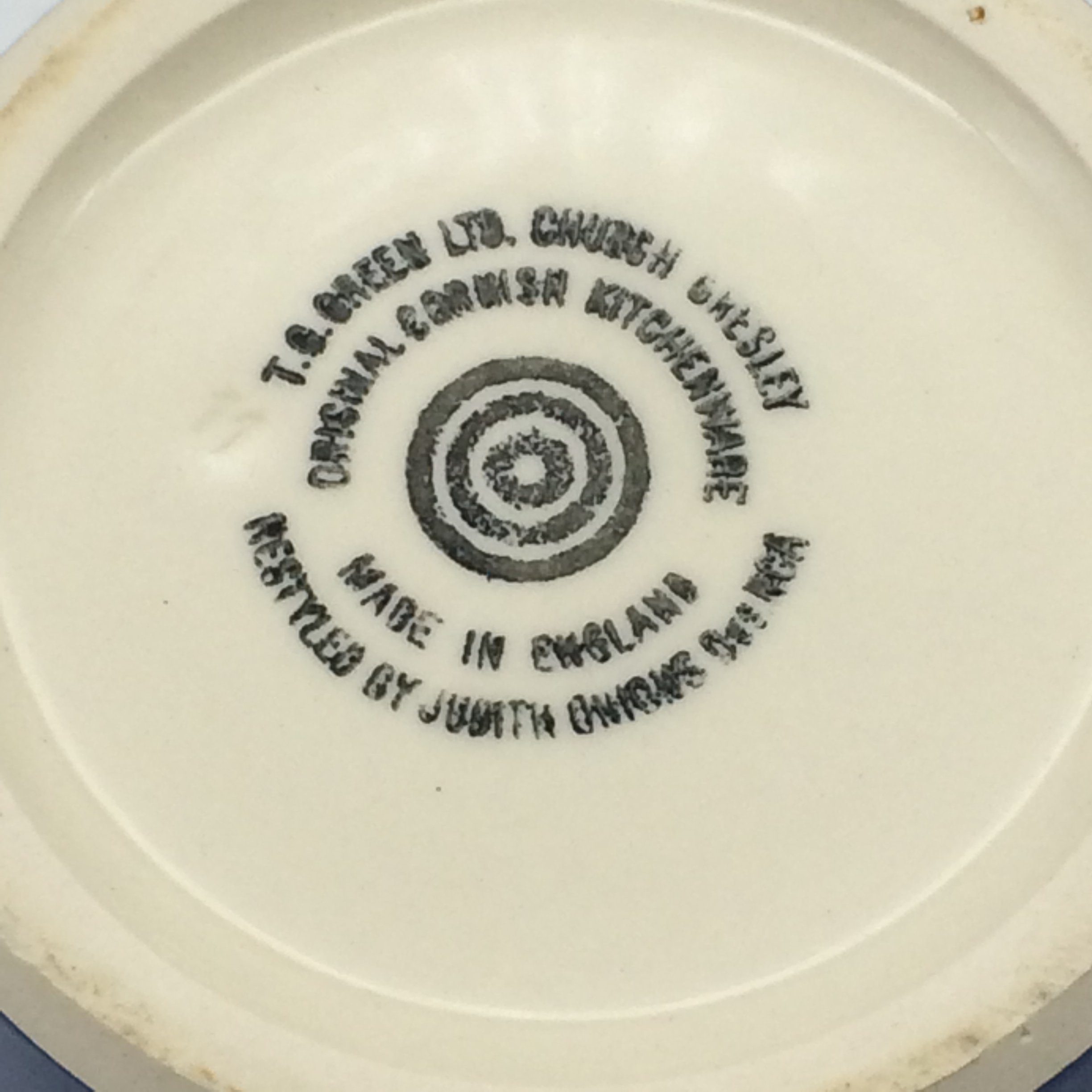 This very collectable Cornishware measuring jug, by T.G. Green, is in excellent condition. Made in England and designed by Judith Onions in the 1960’s, it is marked on the base with the circular bullseye mark, which was used between 1968 and 1975. It measures 12cm in height, with a base diameter of 8.2cm, a top diameter of 10.7cm and 15cm handle to spout.
