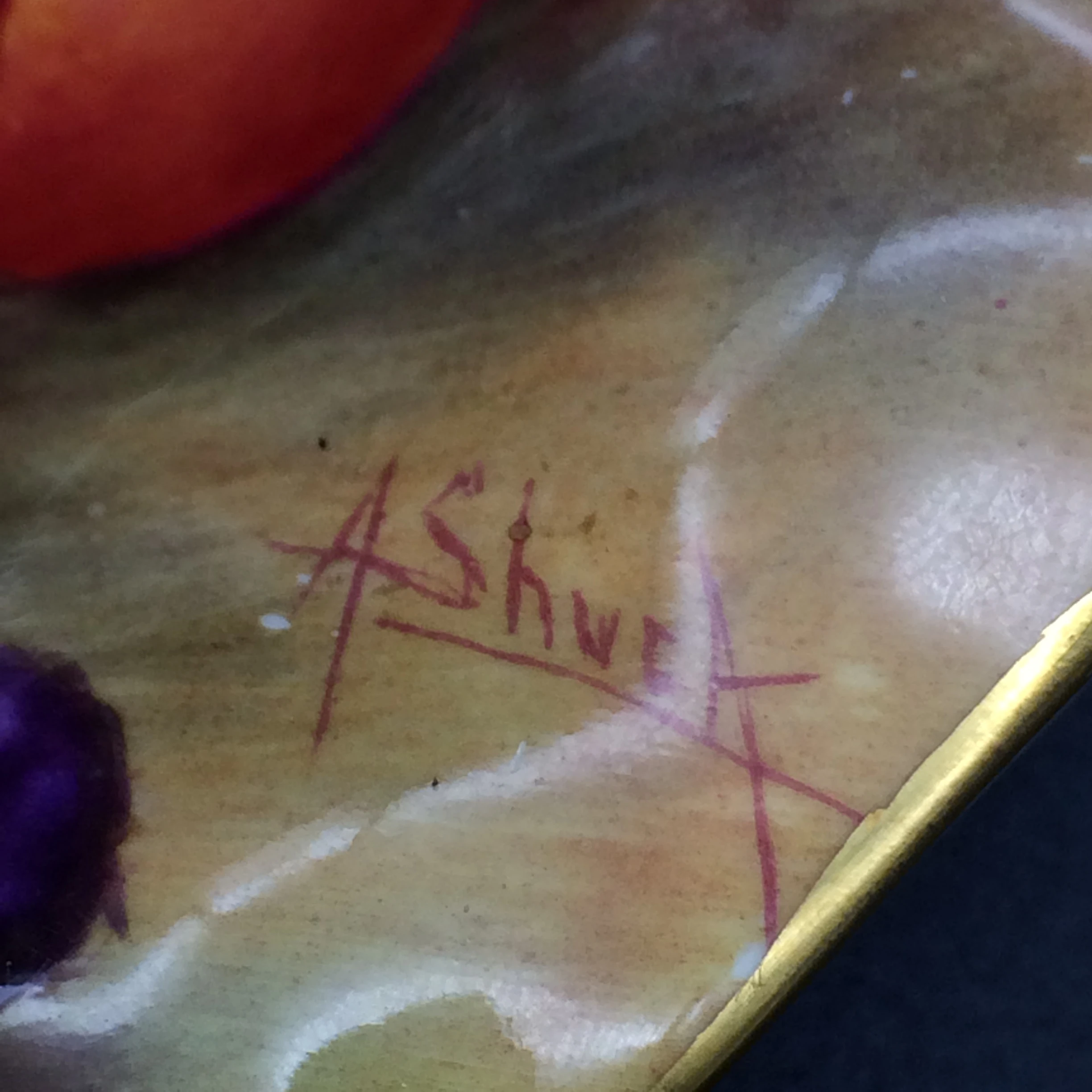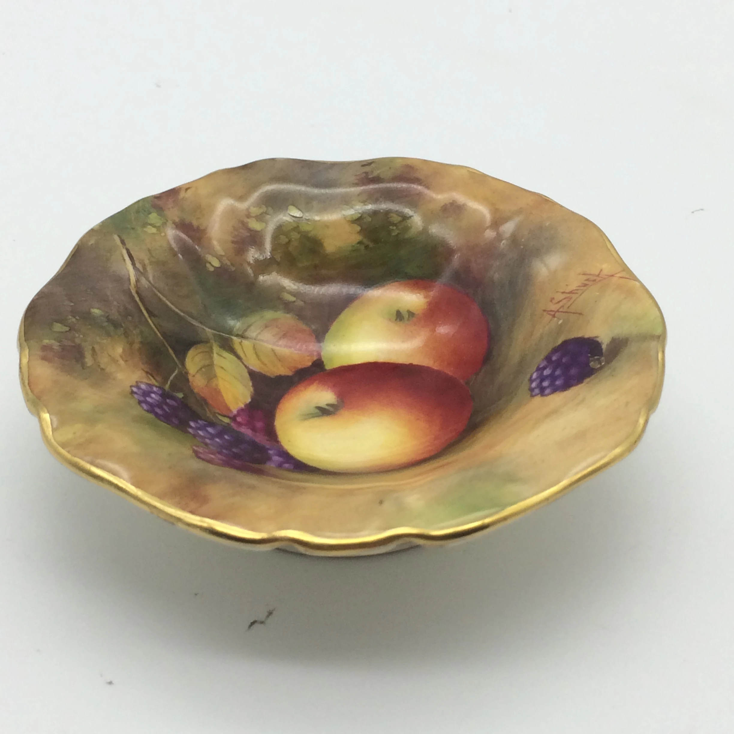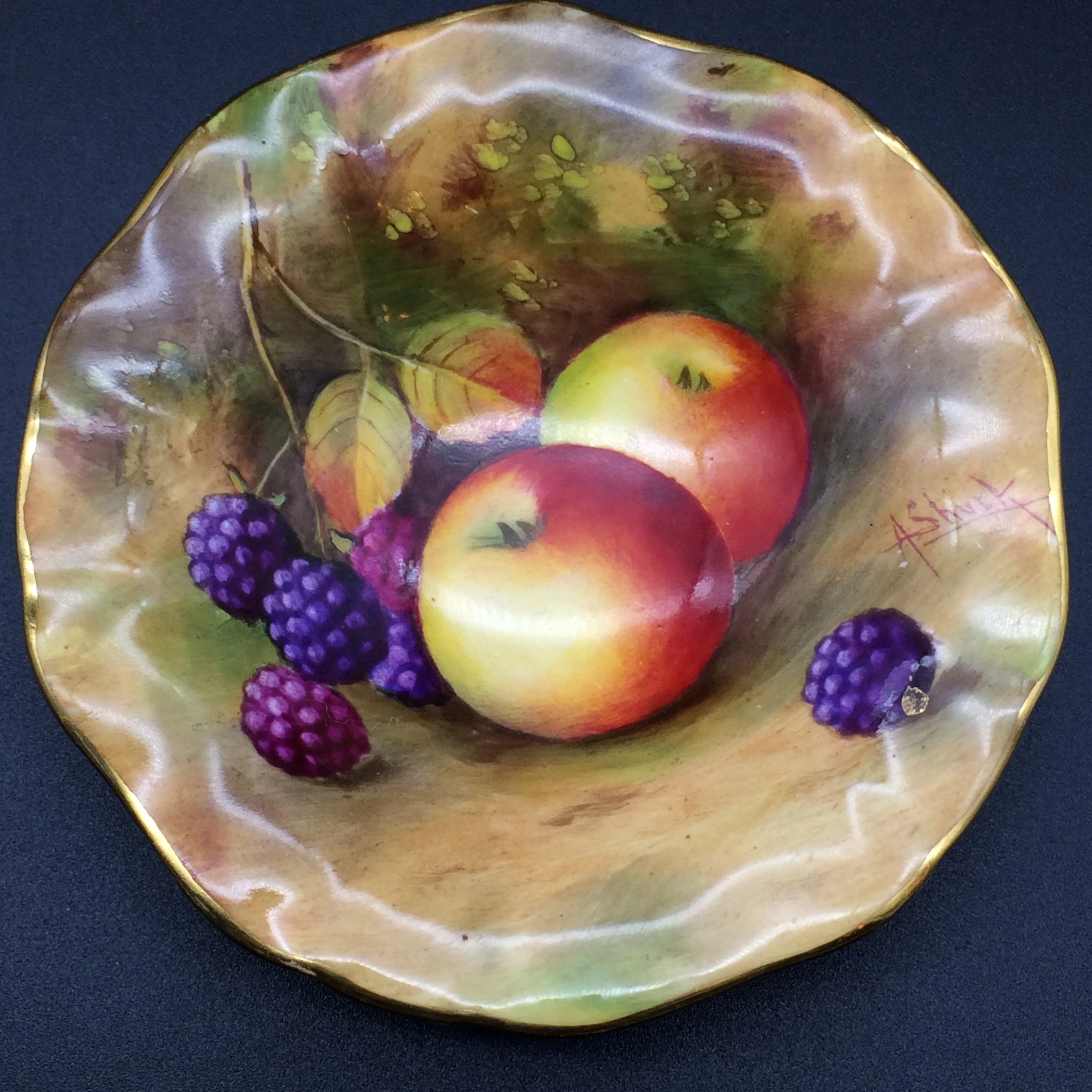 This small, high quality, hand painted Royal Worcester dish is decorated with fruit and berries and is signed by the artist ‘A. SHUCK’. Born in 1880, Albert Shuck painted fruit and flowers at Royal Worcester throughout the 1920’s and 30’s. He was regarded as a very shy and reserved man and his workmates knew very little about him. The dish sits on a small round pedestal base and other than a tiny factory flaw on one of the berries, it is in excellent condition. It measures 9.6cm in diameter and 2.5cm in height.