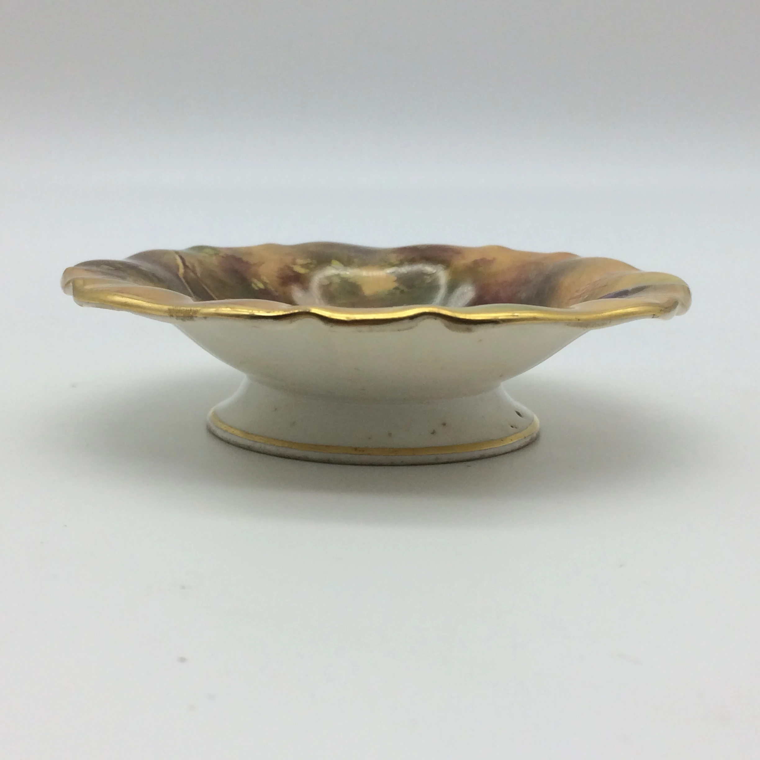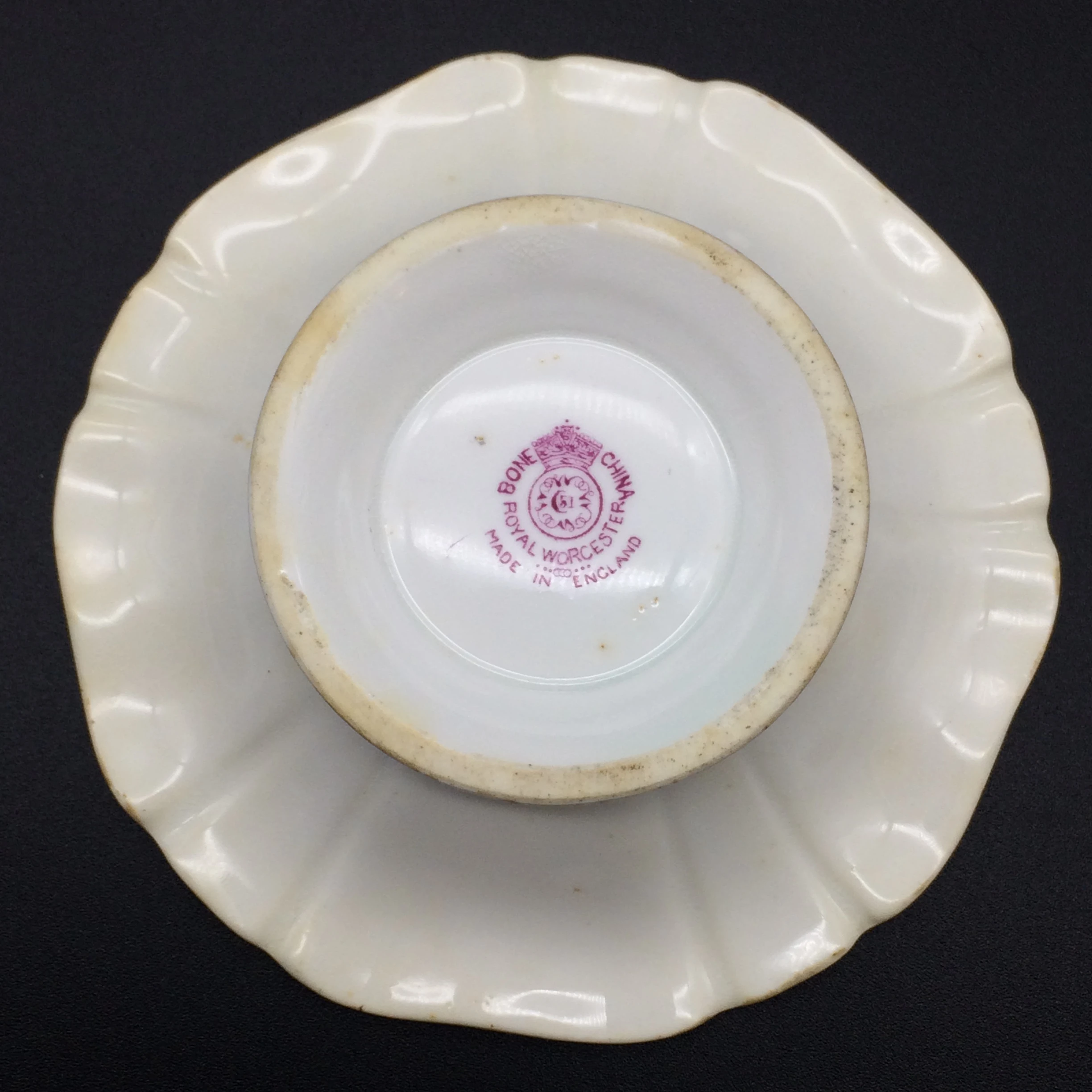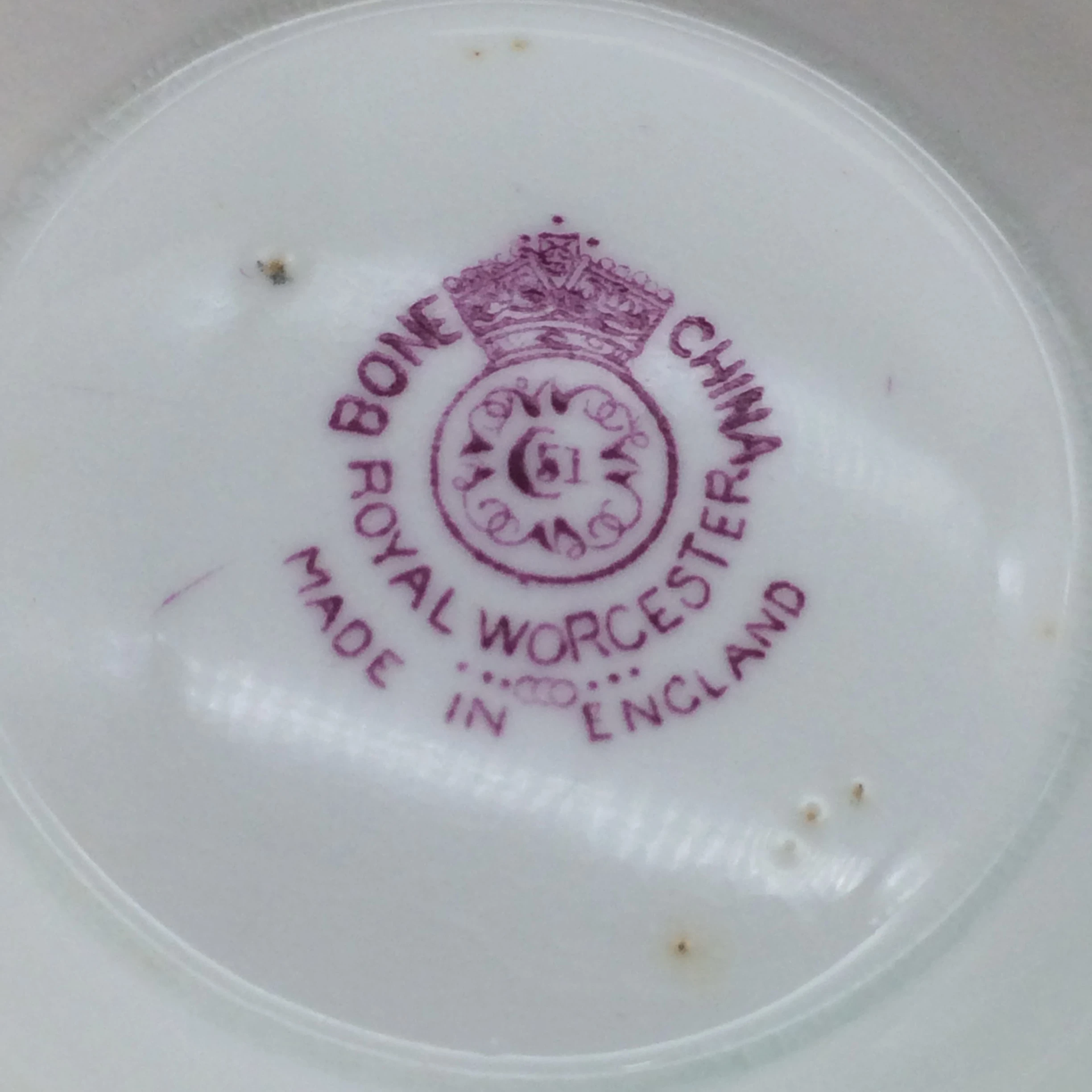This small, high quality, hand painted Royal Worcester dish is decorated with fruit and berries and is signed by the artist ‘A. SHUCK’. Born in 1880, Albert Shuck painted fruit and flowers at Royal Worcester throughout the 1920’s and 30’s. He was regarded as a very shy and reserved man and his workmates knew very little about him. The dish sits on a small round pedestal base and other than a tiny factory flaw on one of the berries, it is in excellent condition. It measures 9.6cm in diameter and 2.5cm in height.