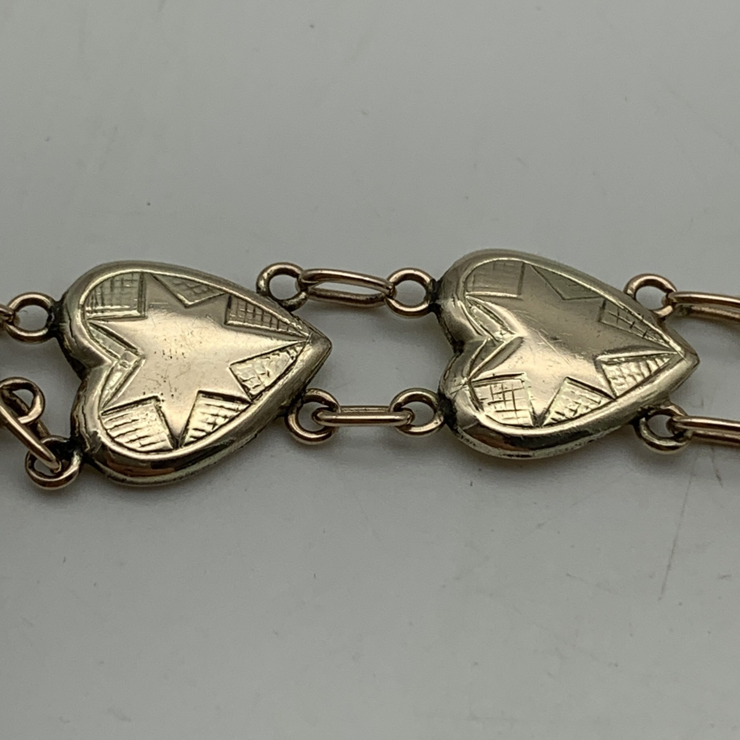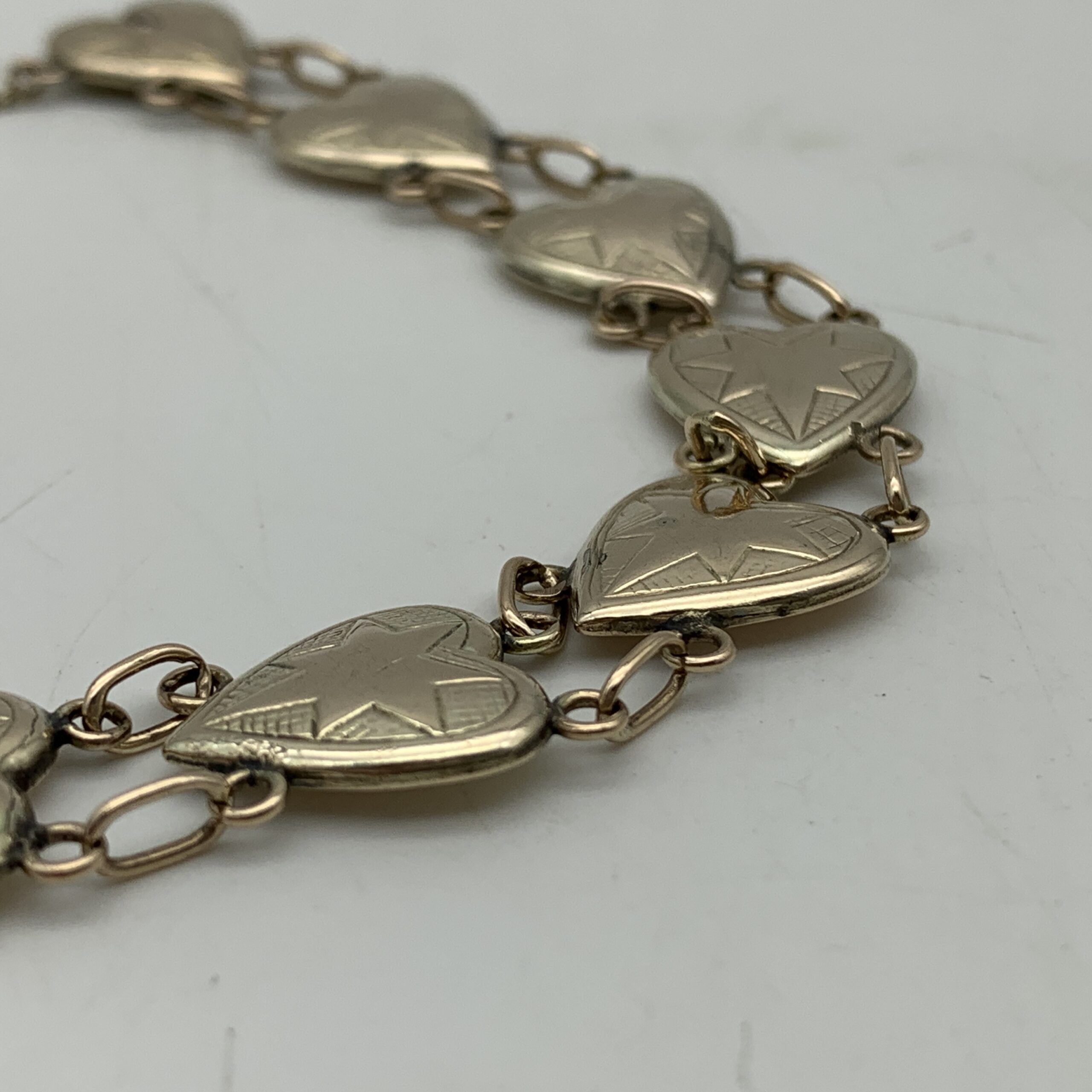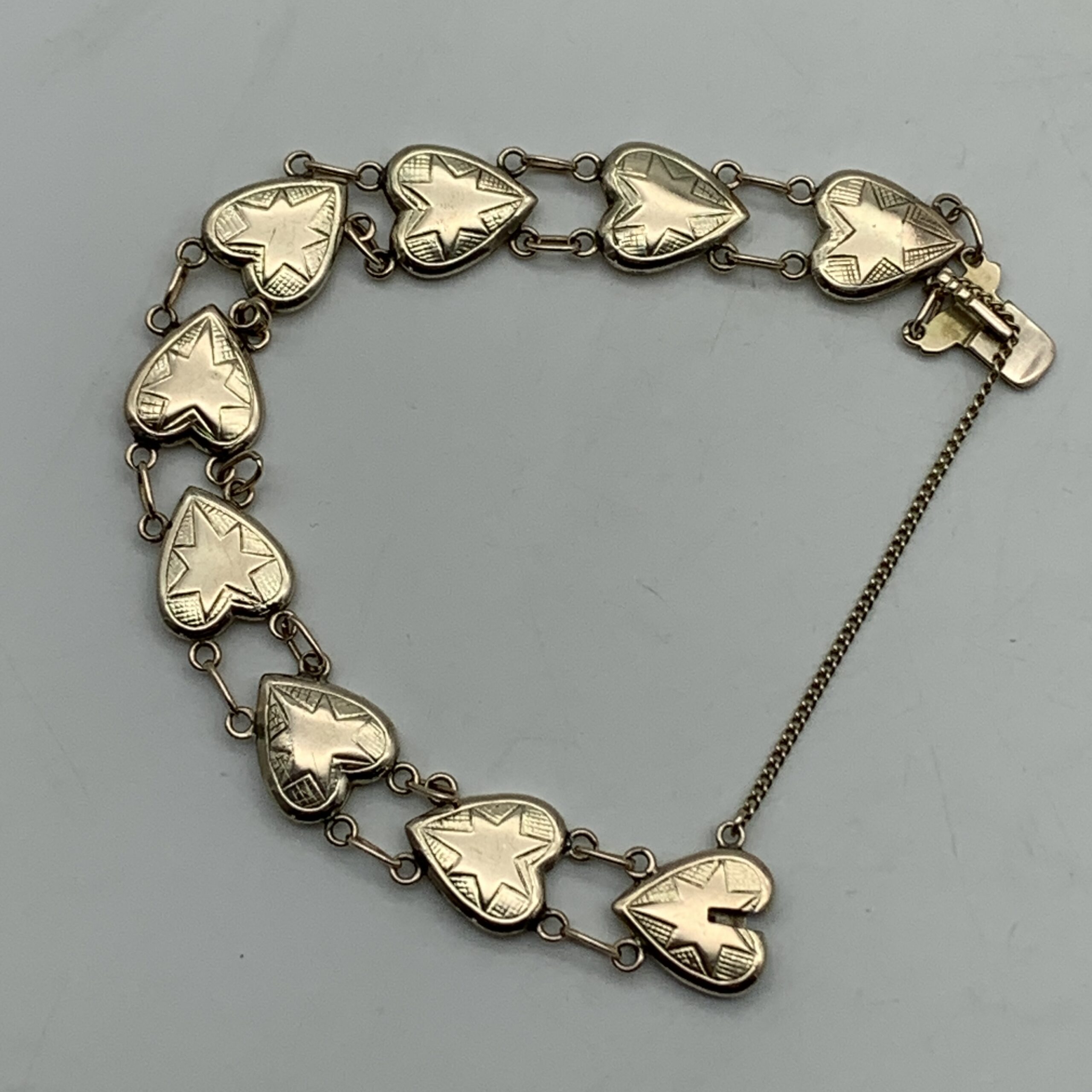 This very attractive, early, 9ct rose gold bracelet features nine beautiful heart shape links decorated with a star in each link, and was probably made around the 1930/40’s. It’s a well-made and lovely quality piece with a good weight and fitted with a safety chain. The bracelet is in excellent condition with a secure push in clasp and is stamped ‘9ct’ on the back of each link. It measures 17cm in length with a link width of 1,2cm and weighs 13,8g.