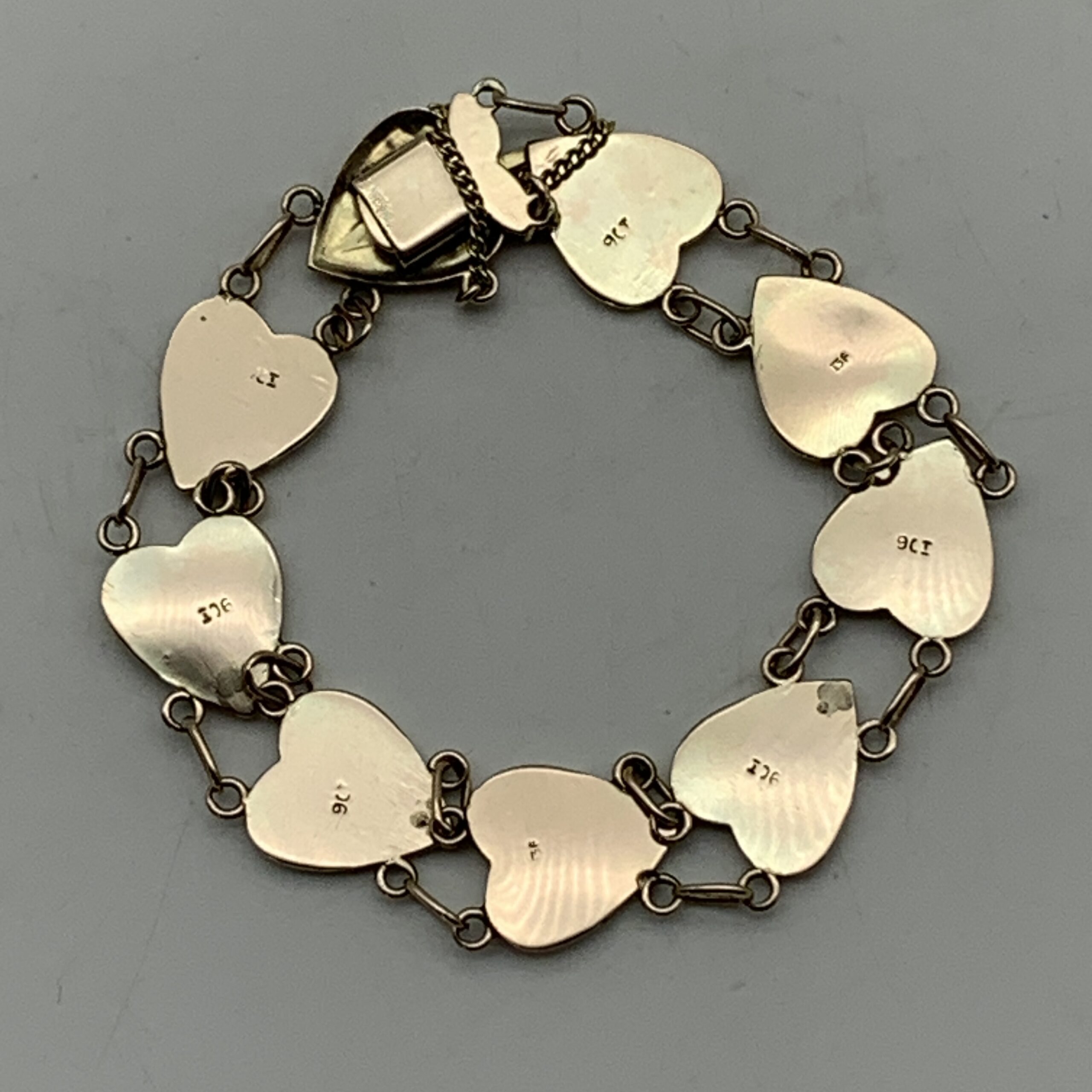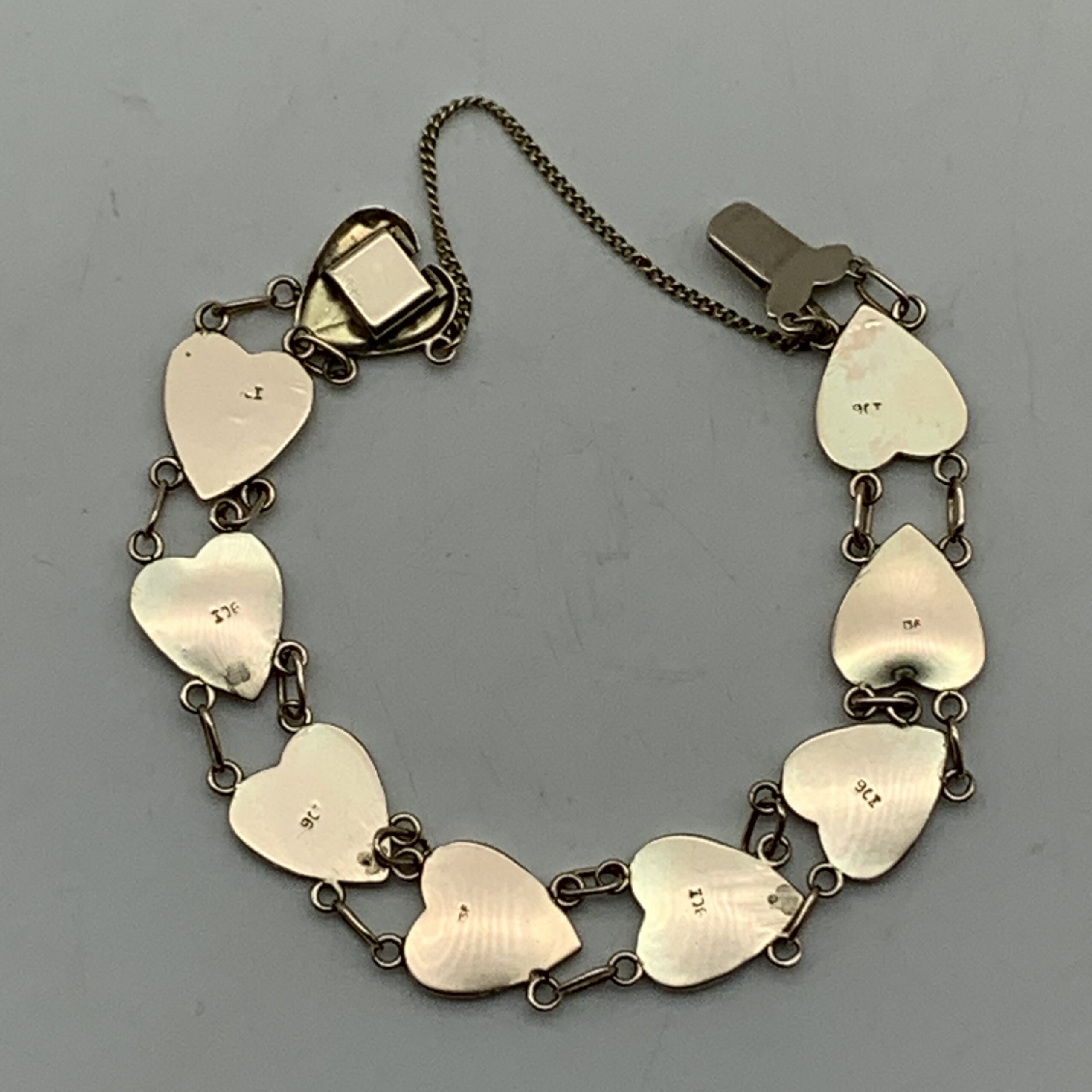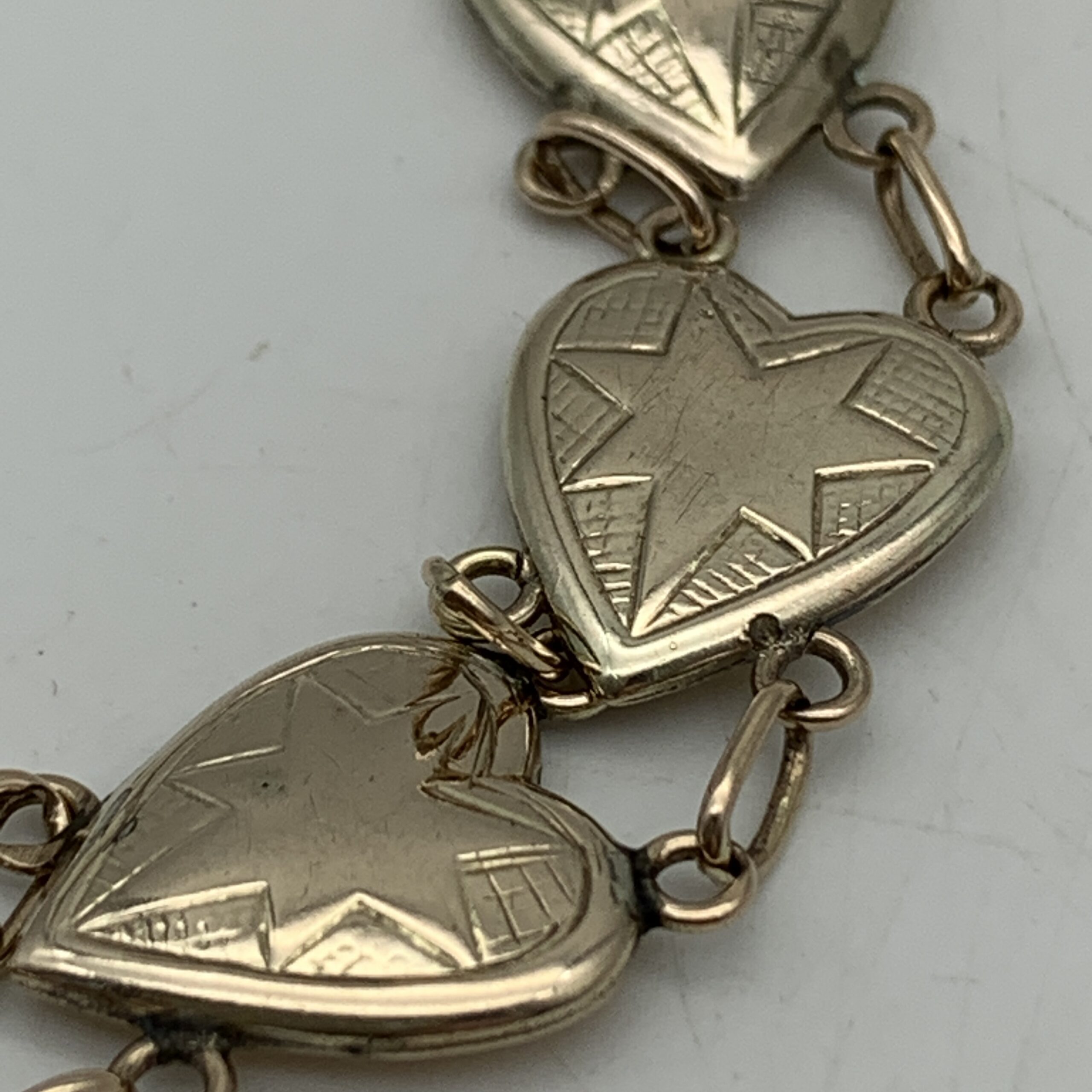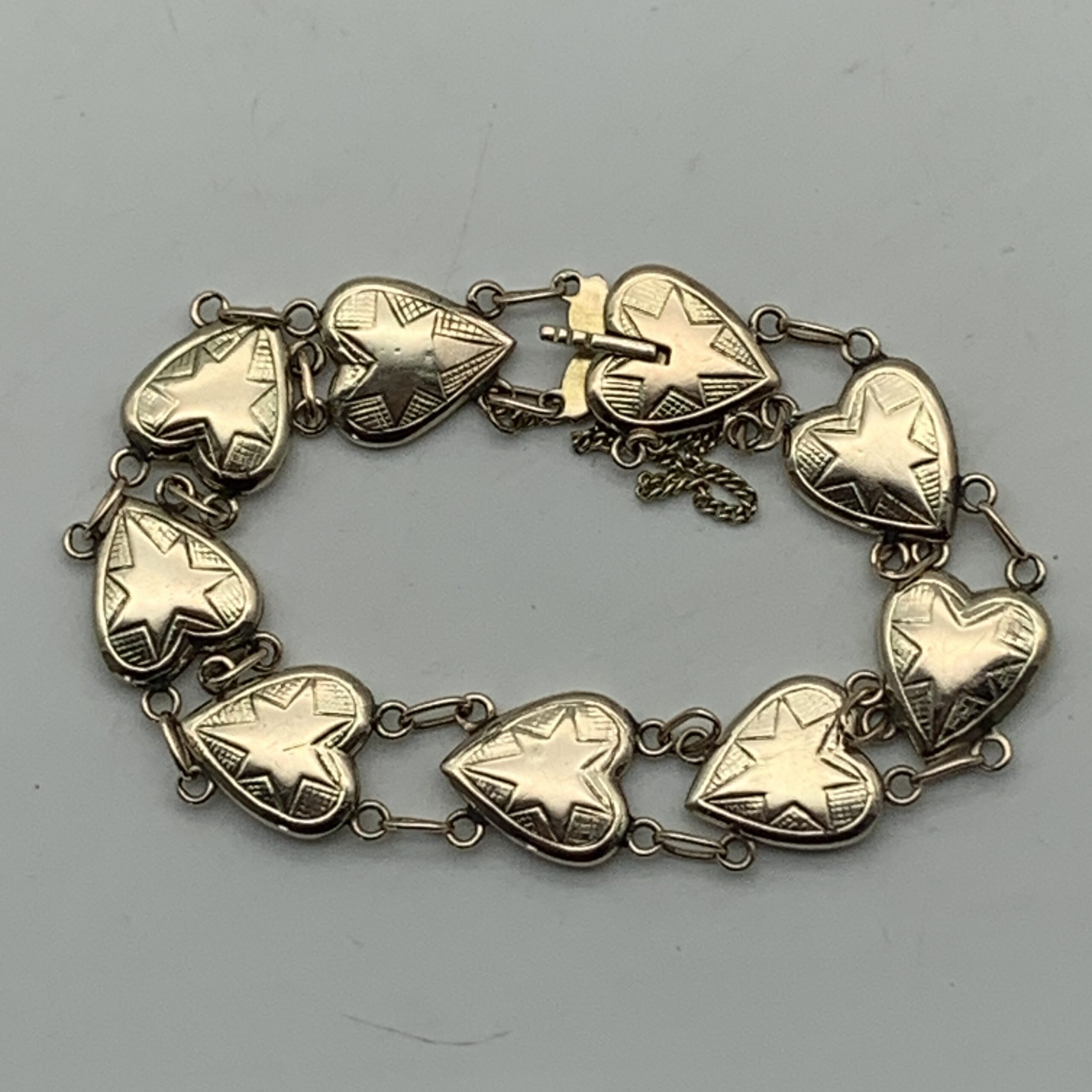 This very attractive, early, 9ct rose gold bracelet features nine beautiful heart shape links decorated with a star in each link, and was probably made around the 1930/40’s. It’s a well-made and lovely quality piece with a good weight and fitted with a safety chain. The bracelet is in excellent condition with a secure push in clasp and is stamped ‘9ct’ on the back of each link. It measures 17cm in length with a link width of 1,2cm and weighs 13,8g.