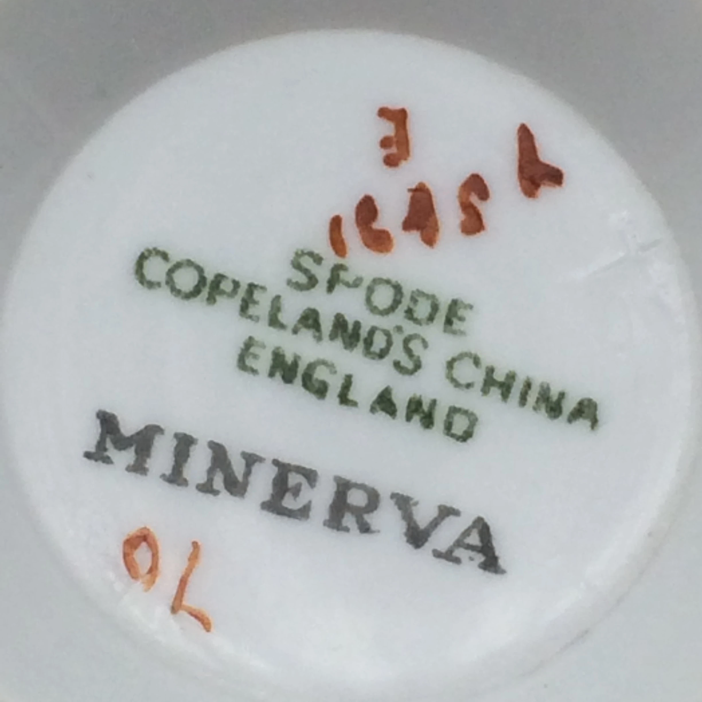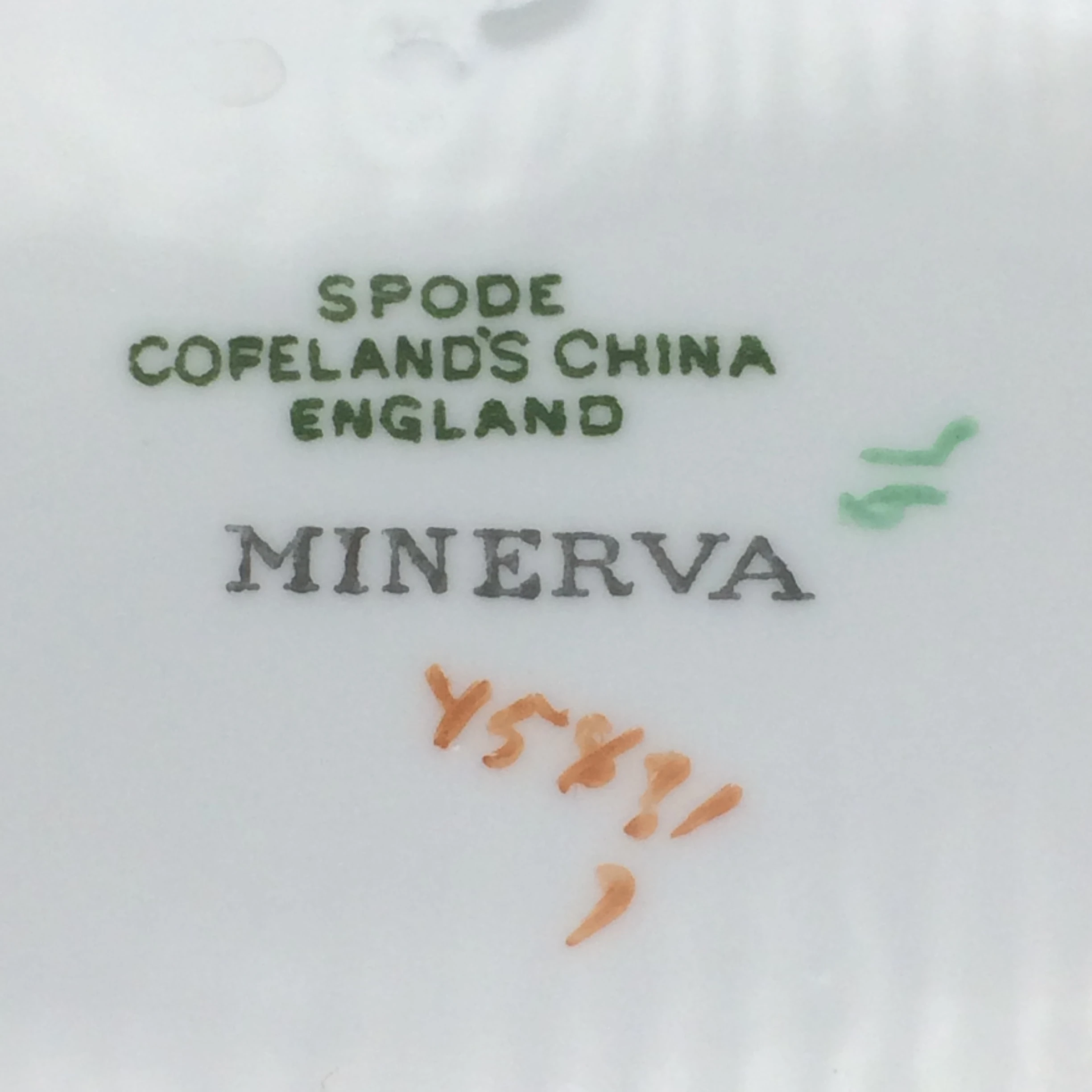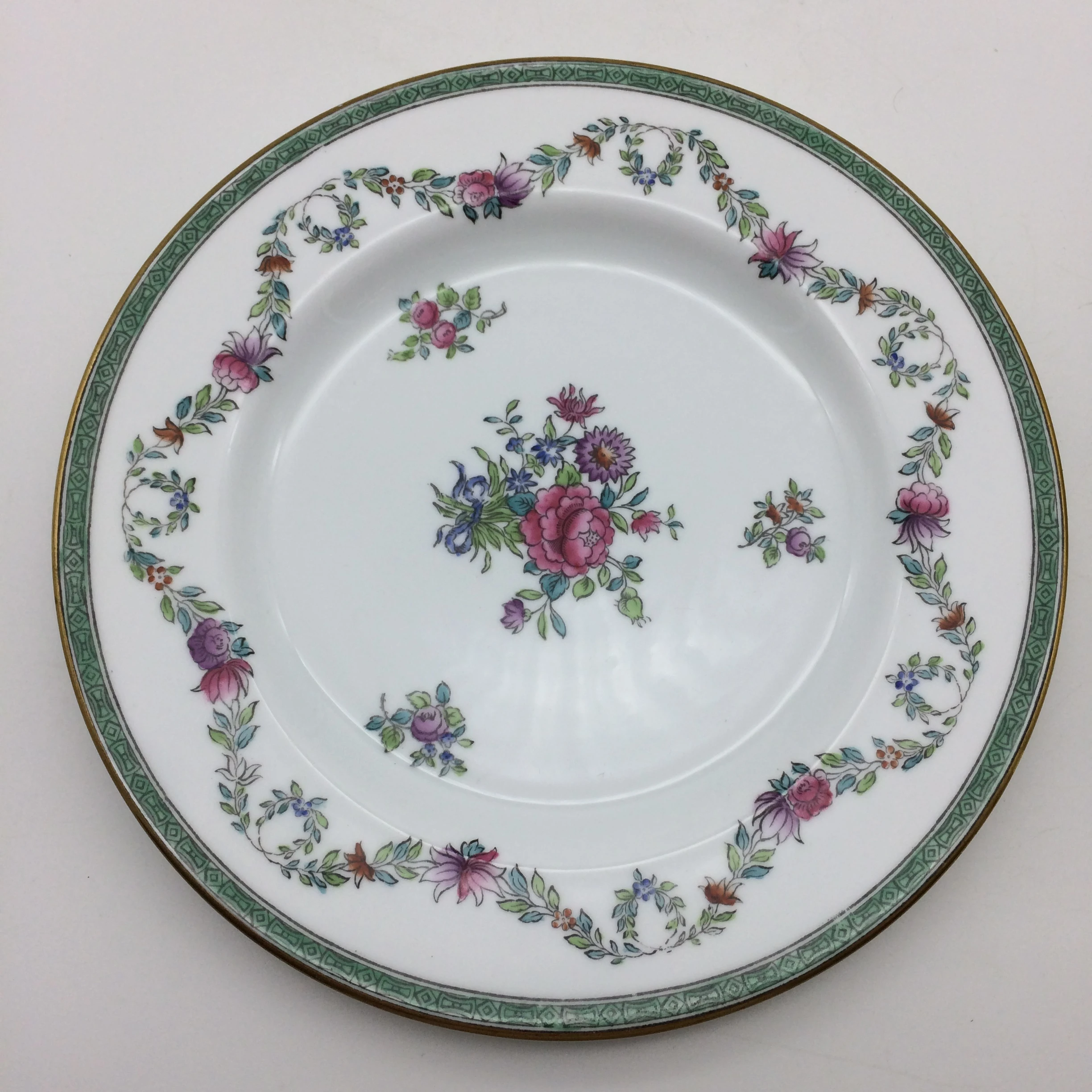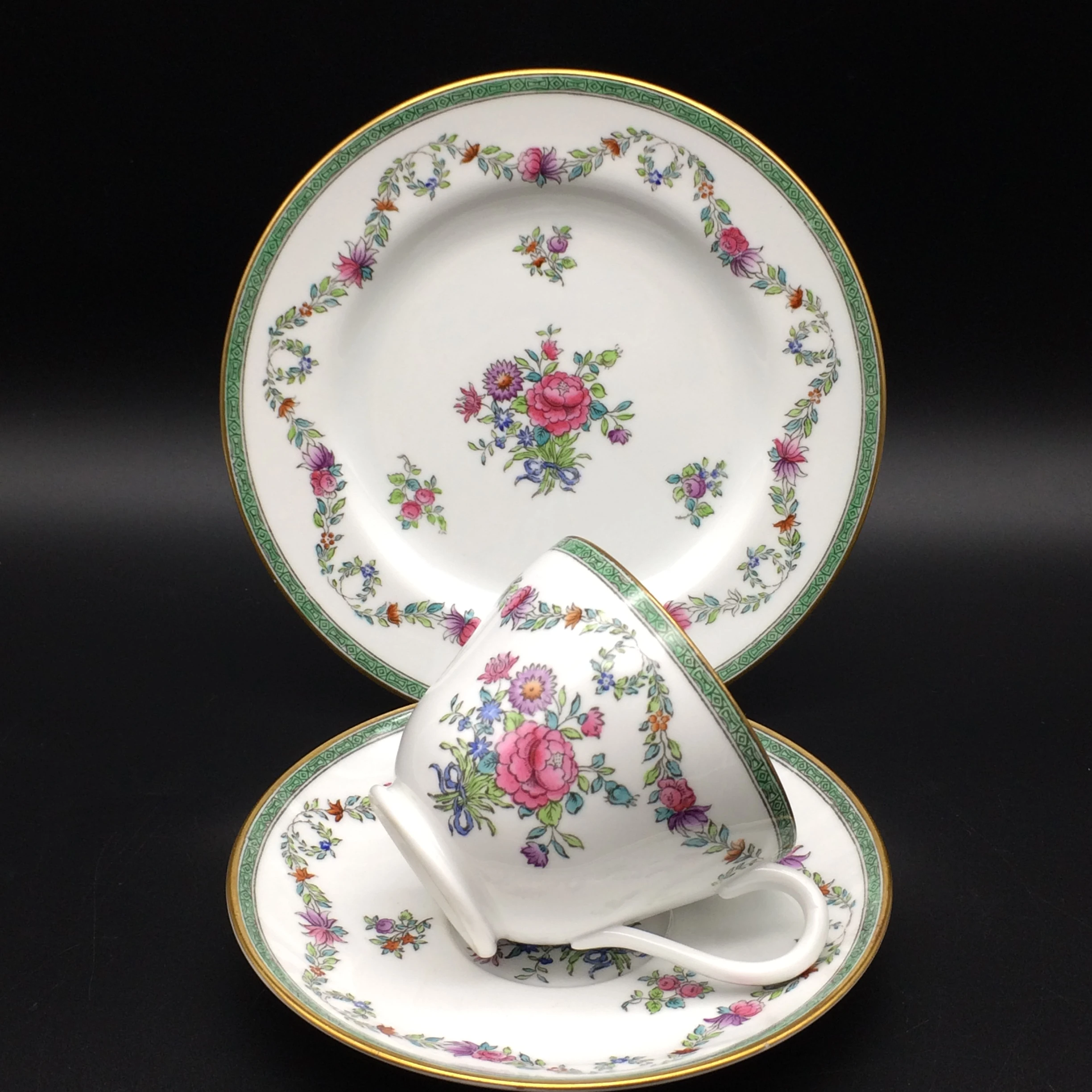 This lovely, 1940’s, bone china, Copeland Spode trio is decorated in the colourful ‘Minerva’ pattern. The plate and saucer have colourful garlands of leaves and flowers around the sides and both have a bouquet of flowers in the middle, all in pinks, blues, greens and purples. The cup has the same colourful garland around the top, with a large bouquet underneath. All three pieces have a patterned green border, finished off with a gilt edging. Each piece is stamped ‘SPODE COPELAND CHINA ENGLAND’ ‘MINERVA’ on the base and the cake plate is impressed with a mark dating the trio to 1947. There is no wear to the gilding and all three pieces are in excellent condition.