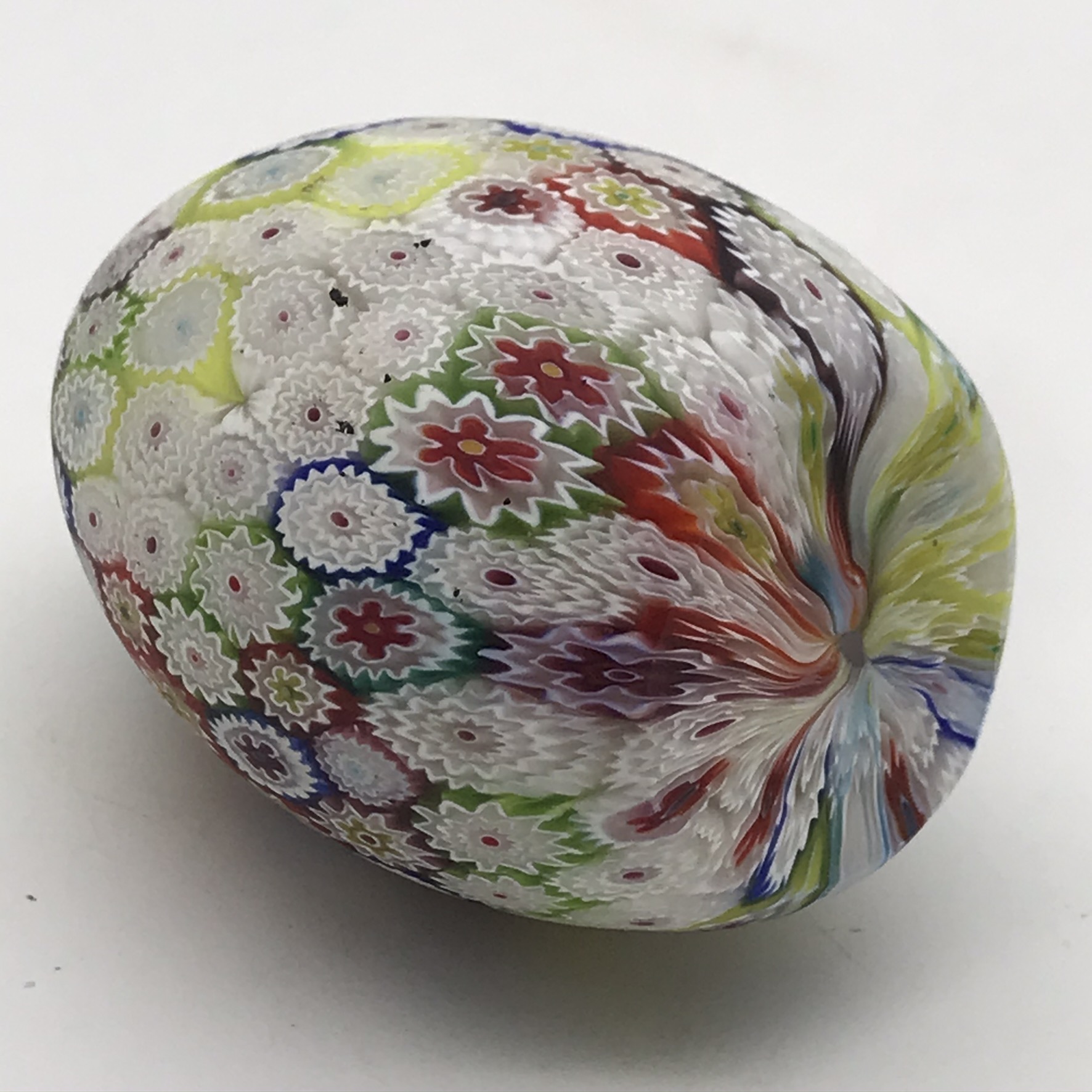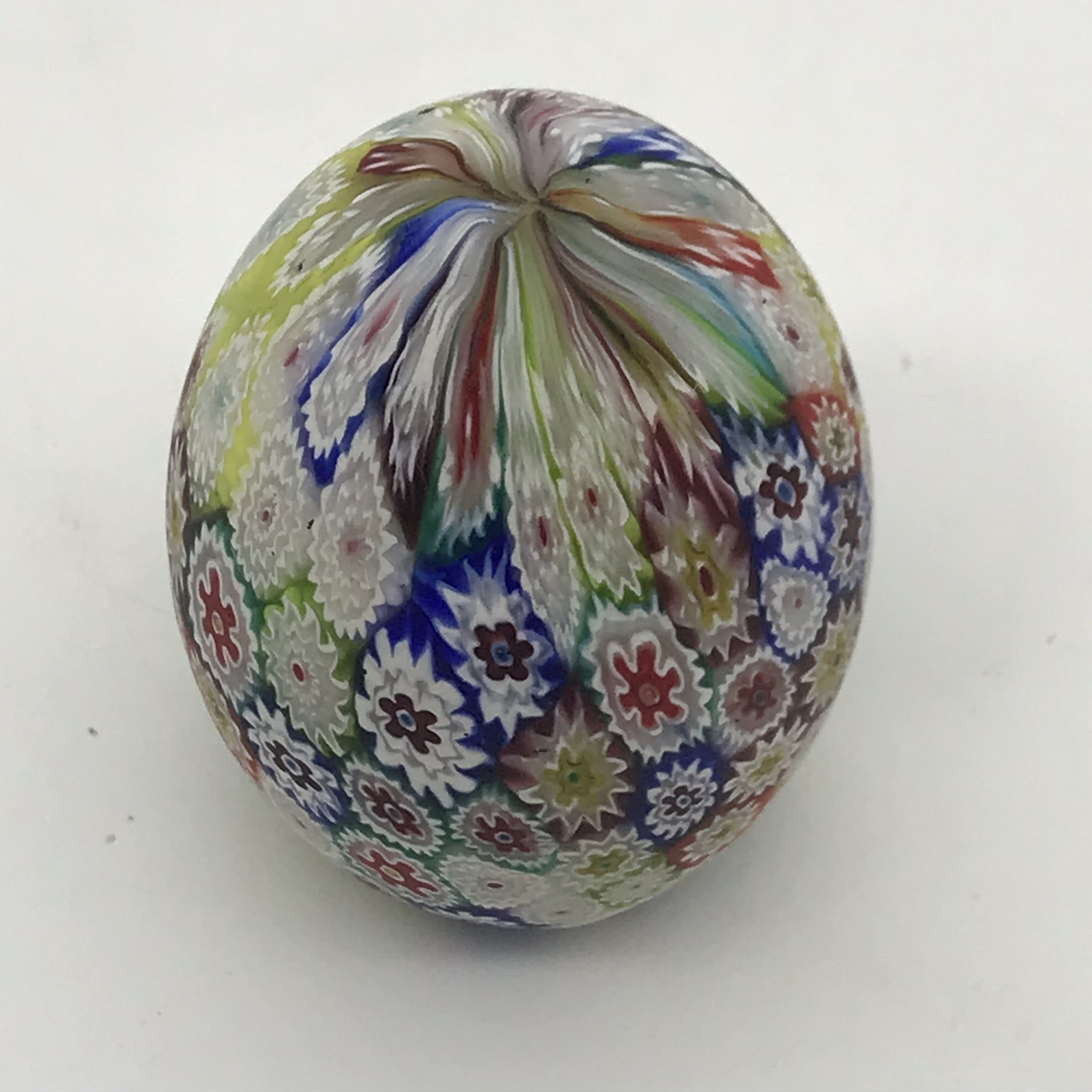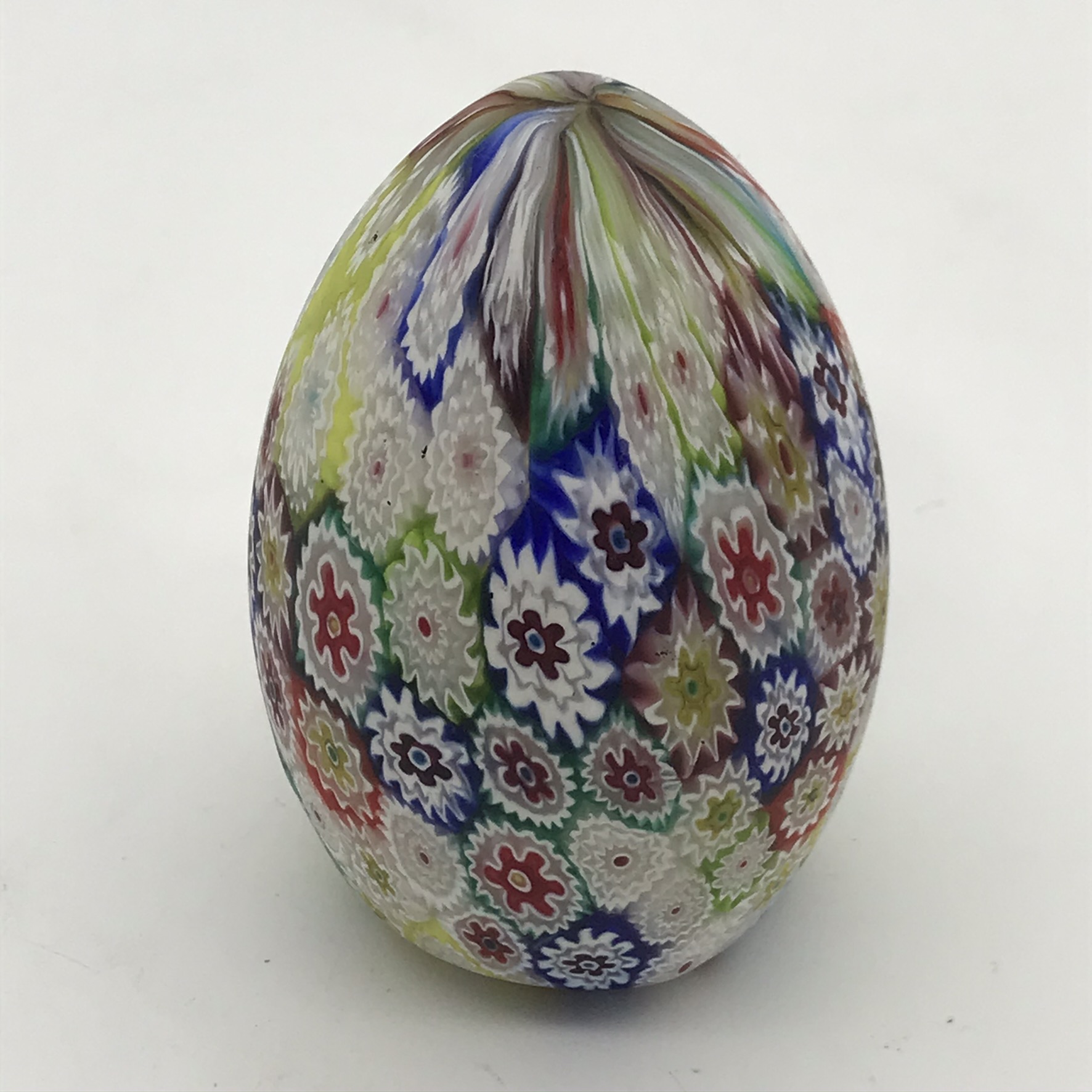 This lovely, early Italian, hand crafted ‘Millefiori’ art glass, egg shaped paperweight is in great condition. It stands 7,5cm high, has a diameter of 5cm at its widest and weighs 214,2g.