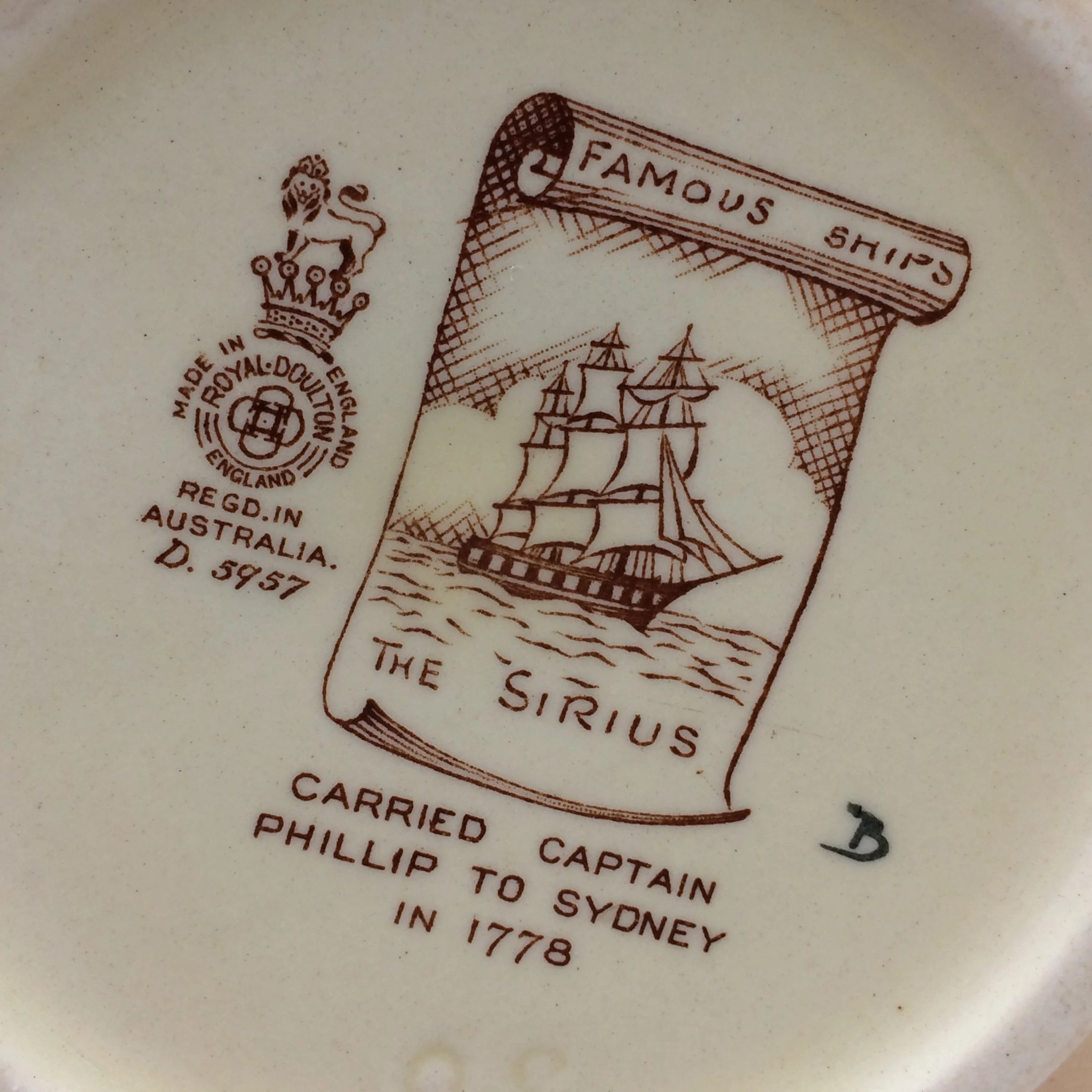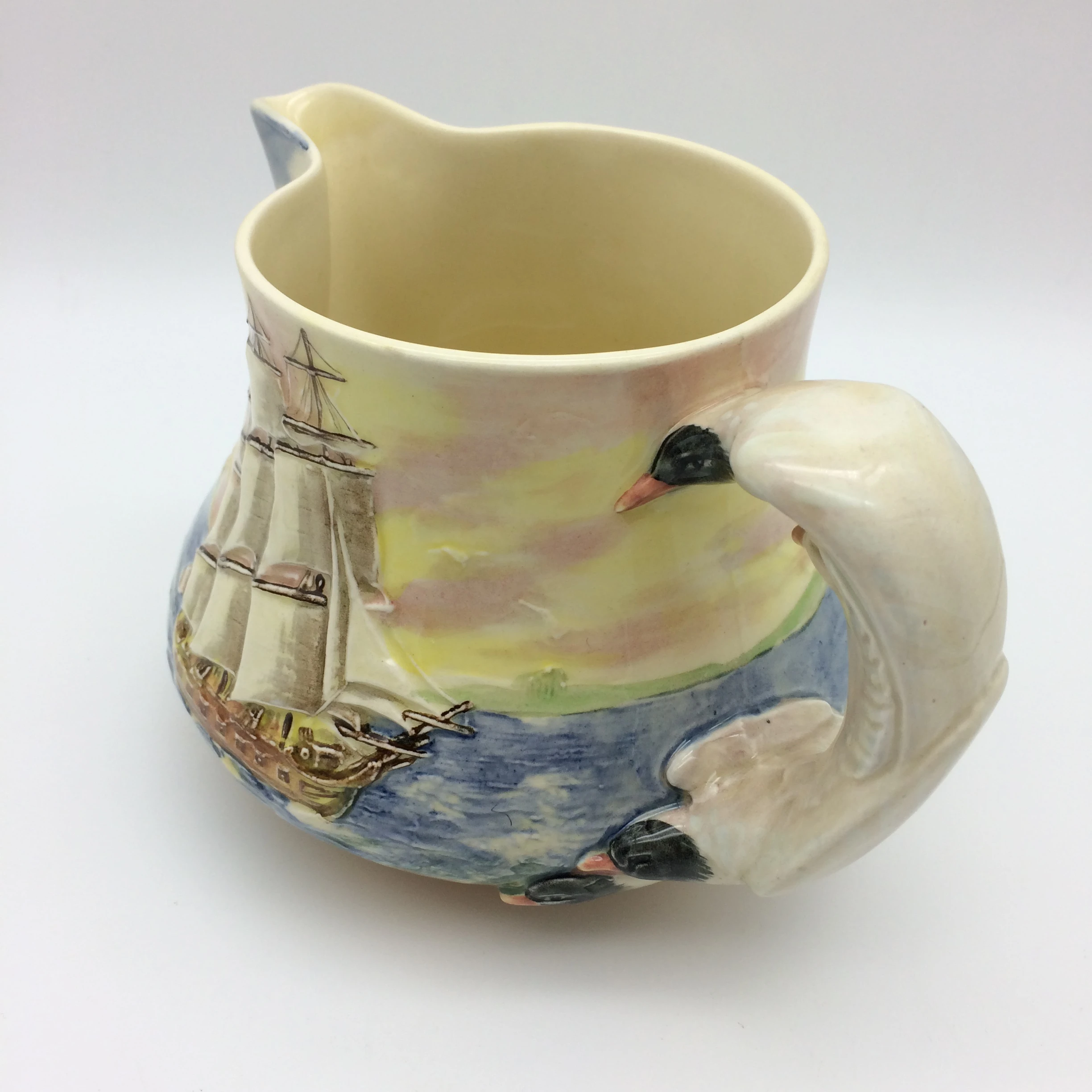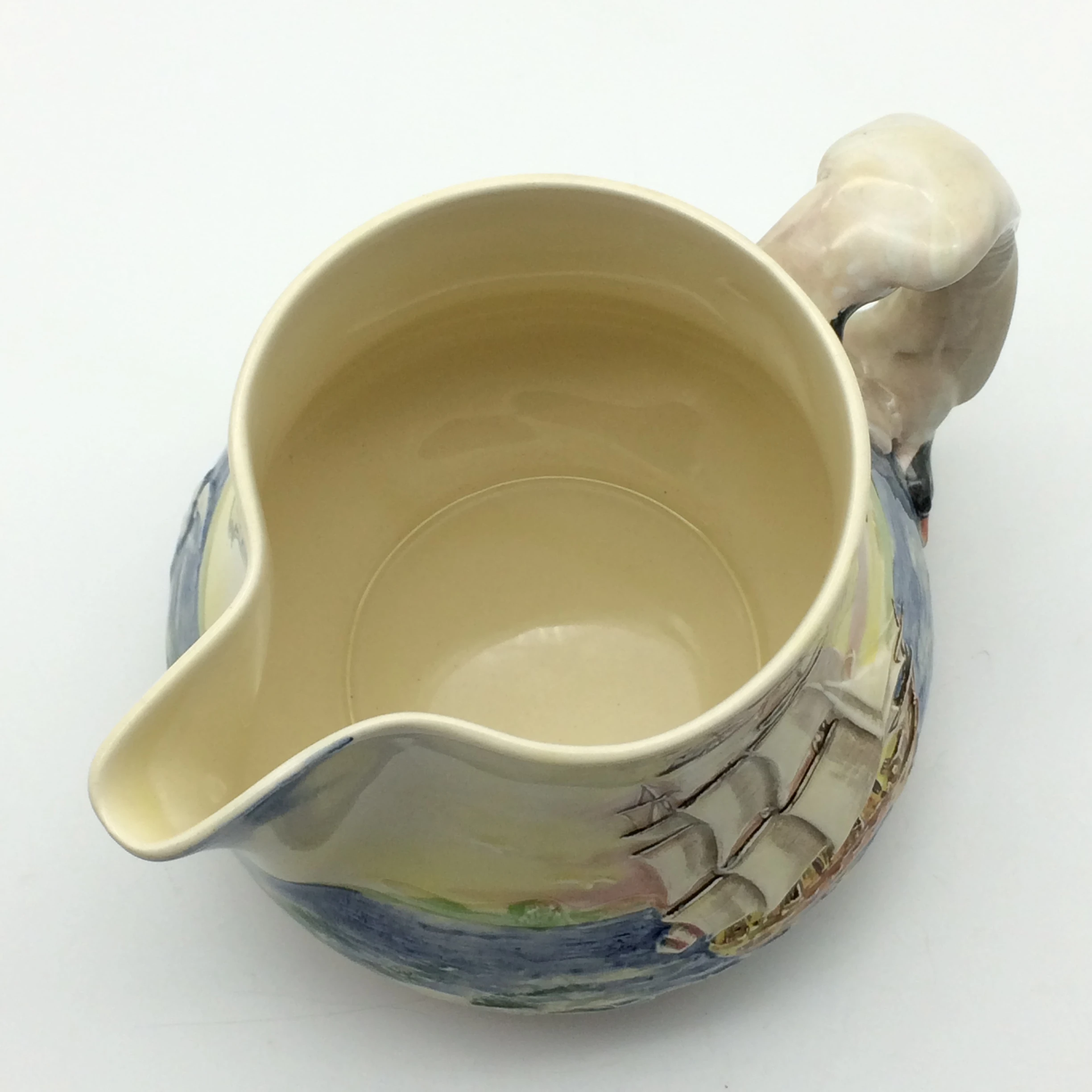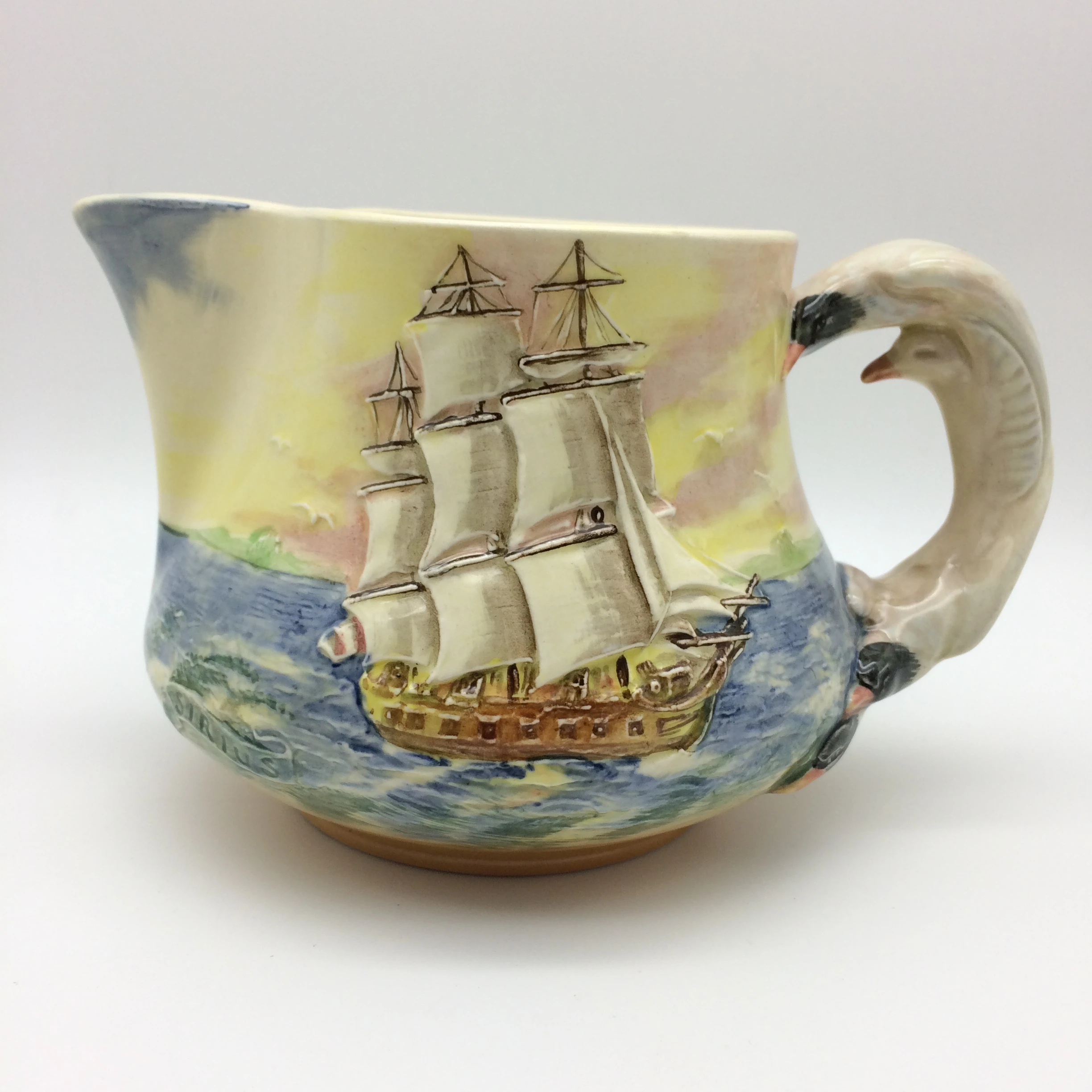 This very attractive, large, hand painted Royal Doulton jug depicts, in low relief, ‘The Sirius’, a famous ship which carried Captain Phillip to Sydney in 1778. In 1790 the ship was wrecked off the coast of Norfolk Island in the Pacific Ocean. It has a very unusual handle in the form of seagulls. The series, ‘Famous Ships’ was introduced in 1938 and discontinued in 1958. It is stamped on the base with the special series ware and Royal Doulton back stamps and the pattern number ‘D5957’. The jug is in excellent condition and measures 11cm in height, 17.5cm in width (spout to handle) and weighs 450g.