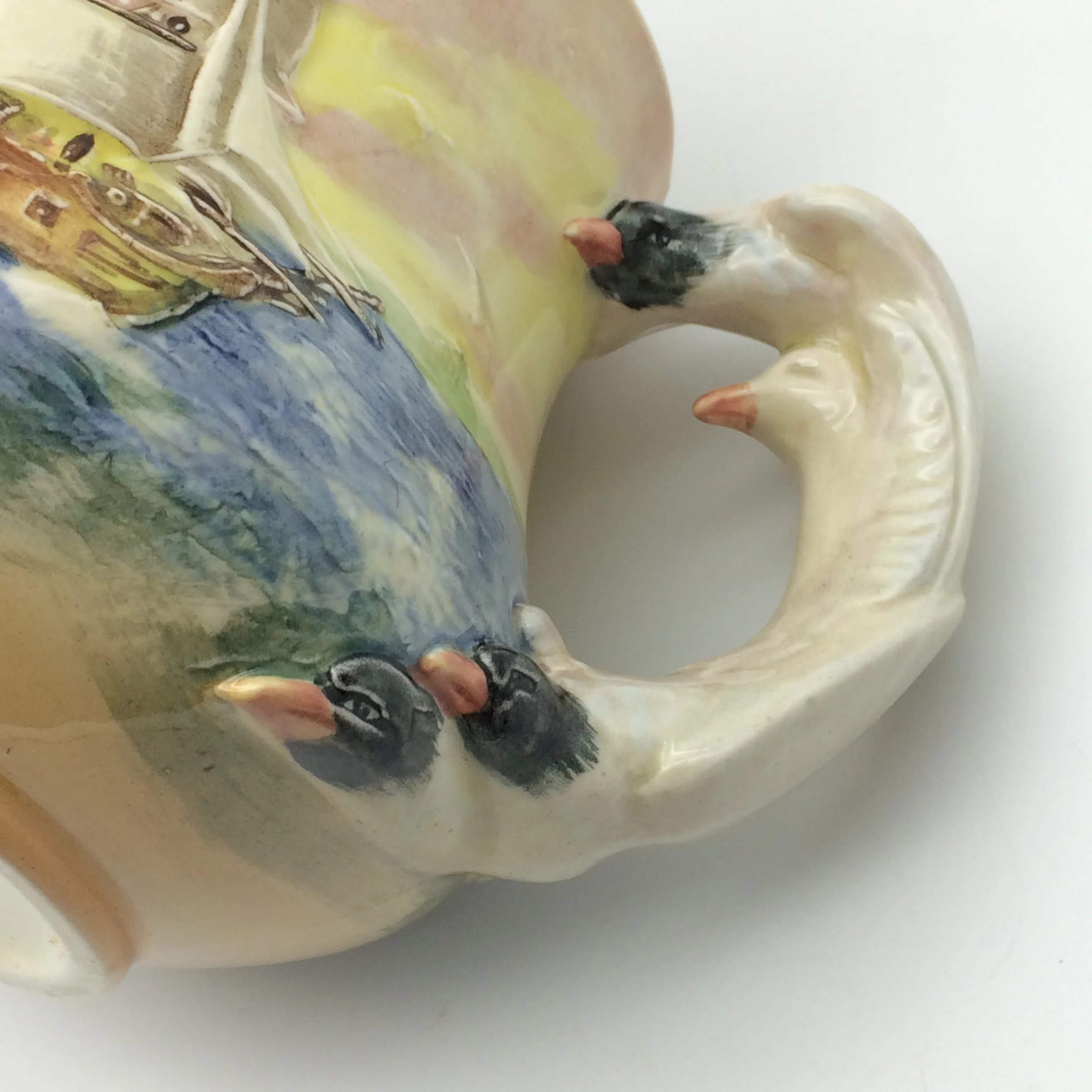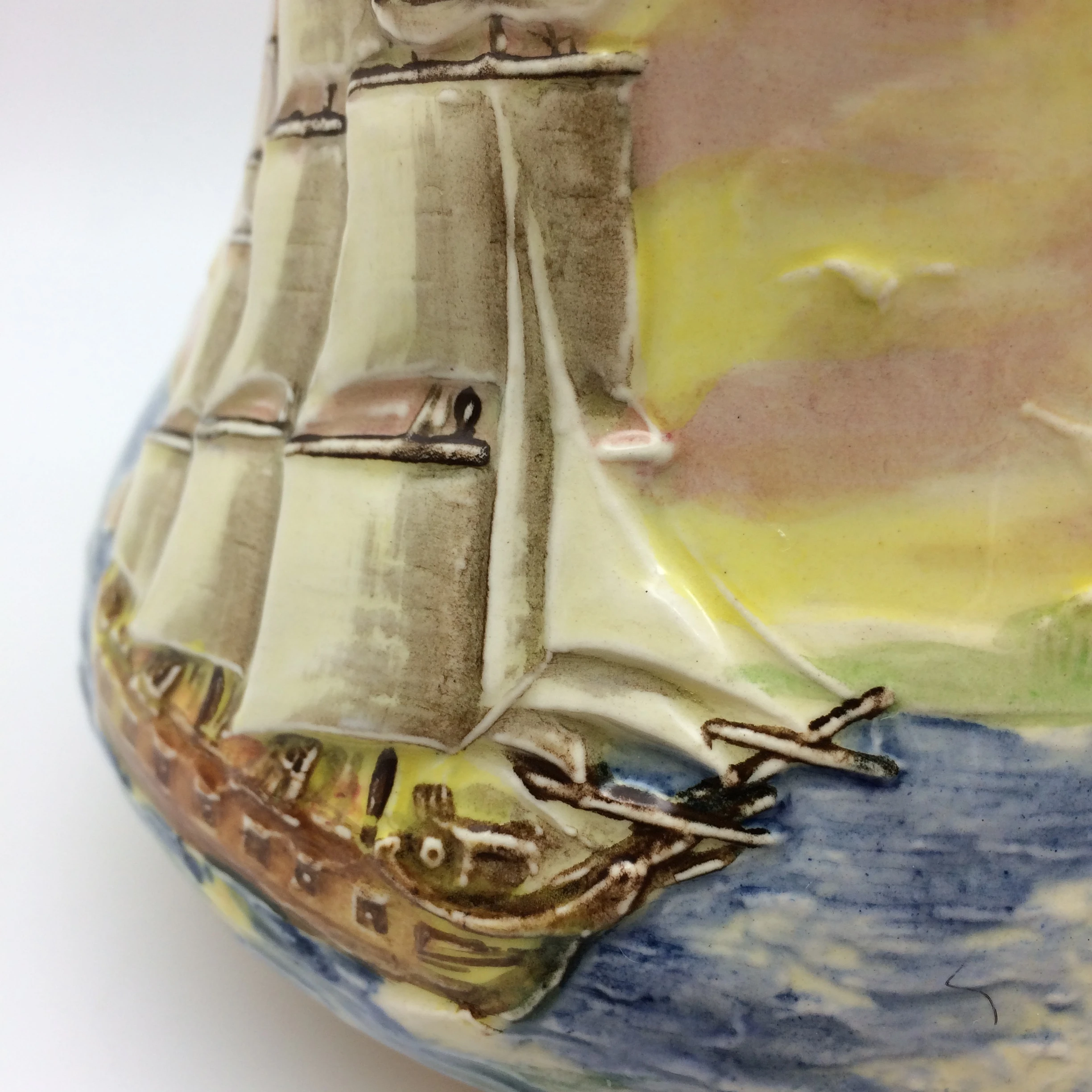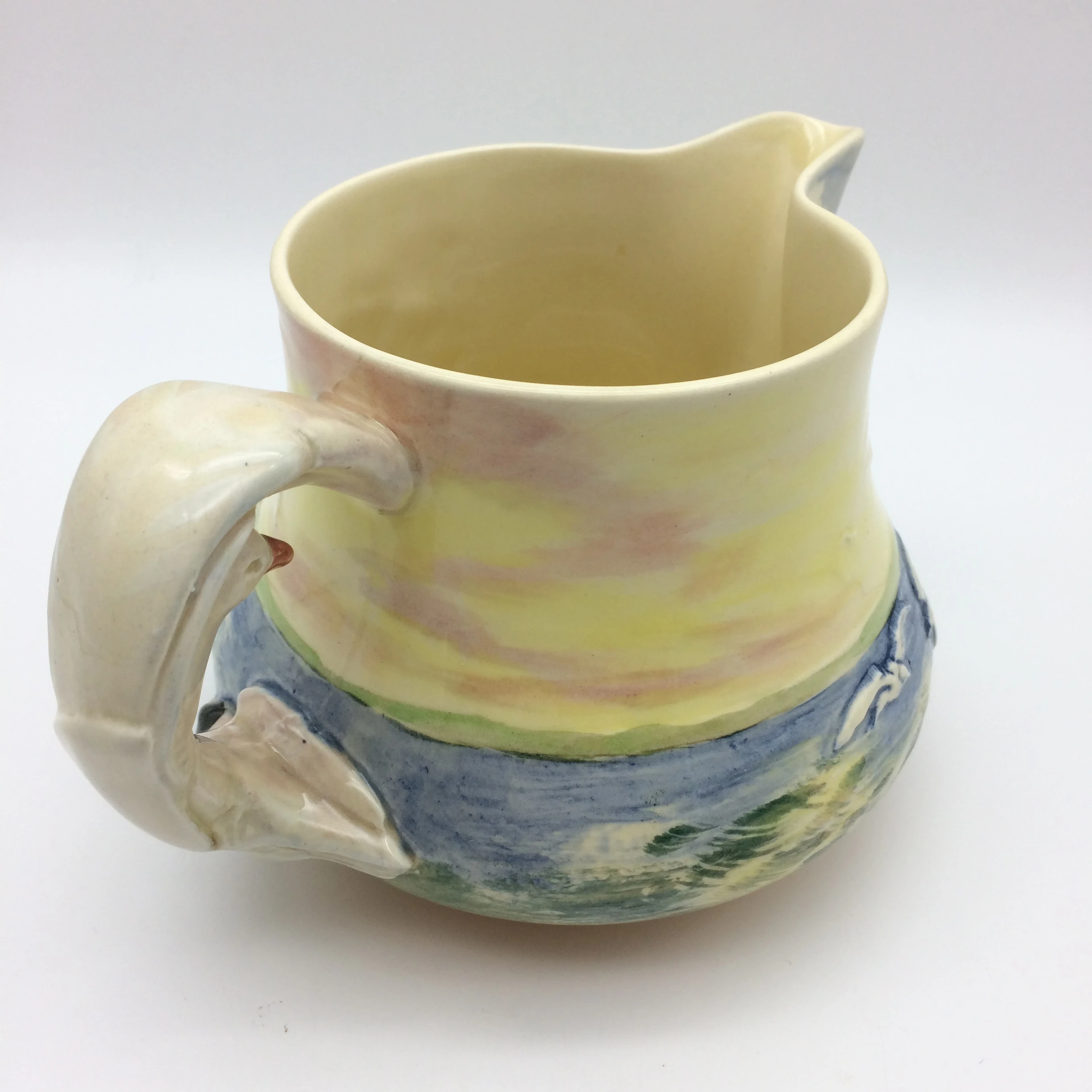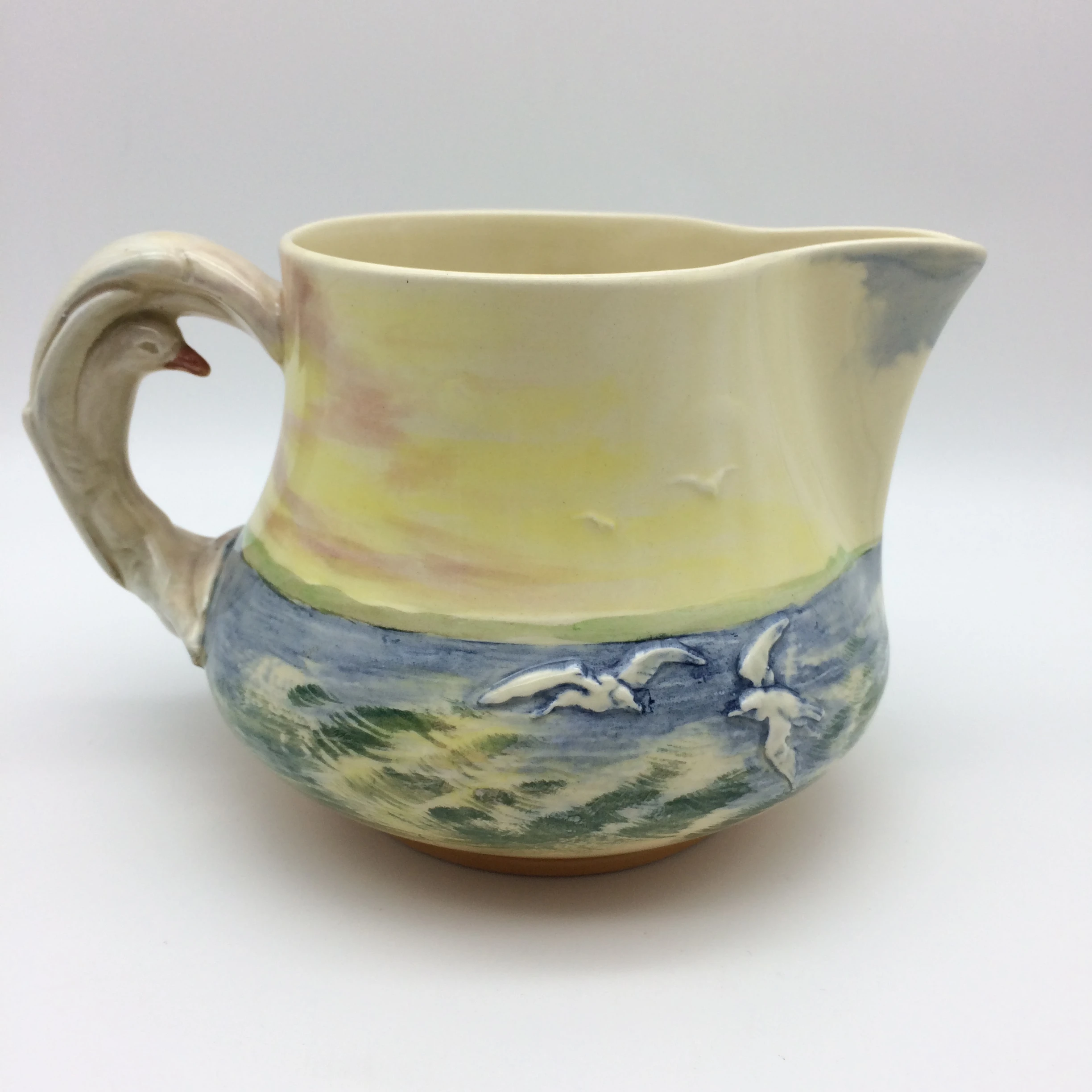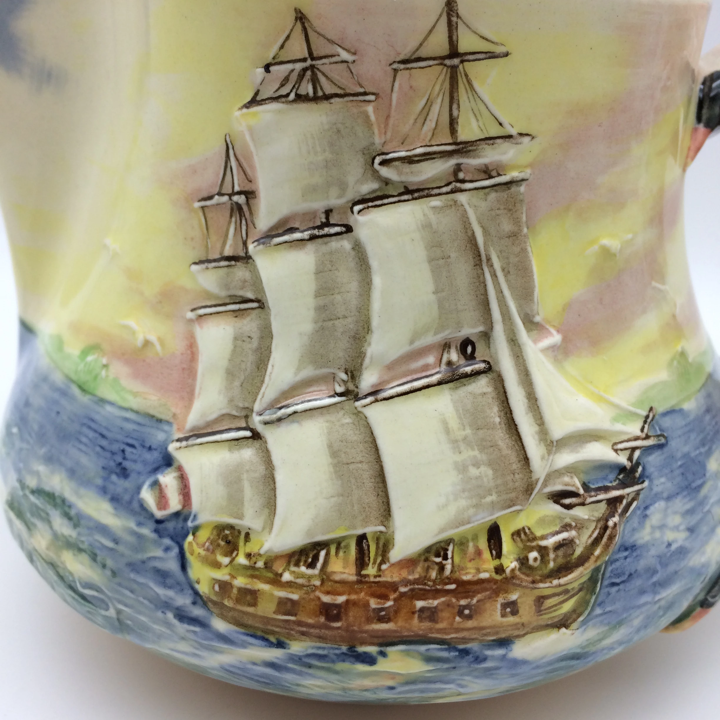 This very attractive, large, hand painted Royal Doulton jug depicts, in low relief, ‘The Sirius’, a famous ship which carried Captain Phillip to Sydney in 1778. In 1790 the ship was wrecked off the coast of Norfolk Island in the Pacific Ocean. It has a very unusual handle in the form of seagulls. The series, ‘Famous Ships’ was introduced in 1938 and discontinued in 1958. It is stamped on the base with the special series ware and Royal Doulton back stamps and the pattern number ‘D5957’. The jug is in excellent condition and measures 11cm in height, 17.5cm in width (spout to handle) and weighs 450g.