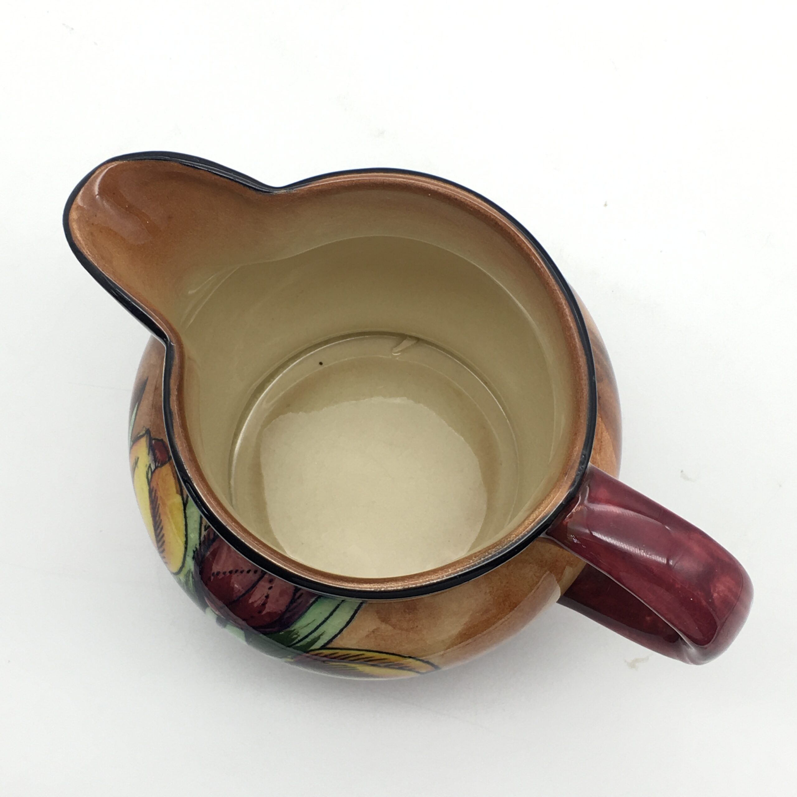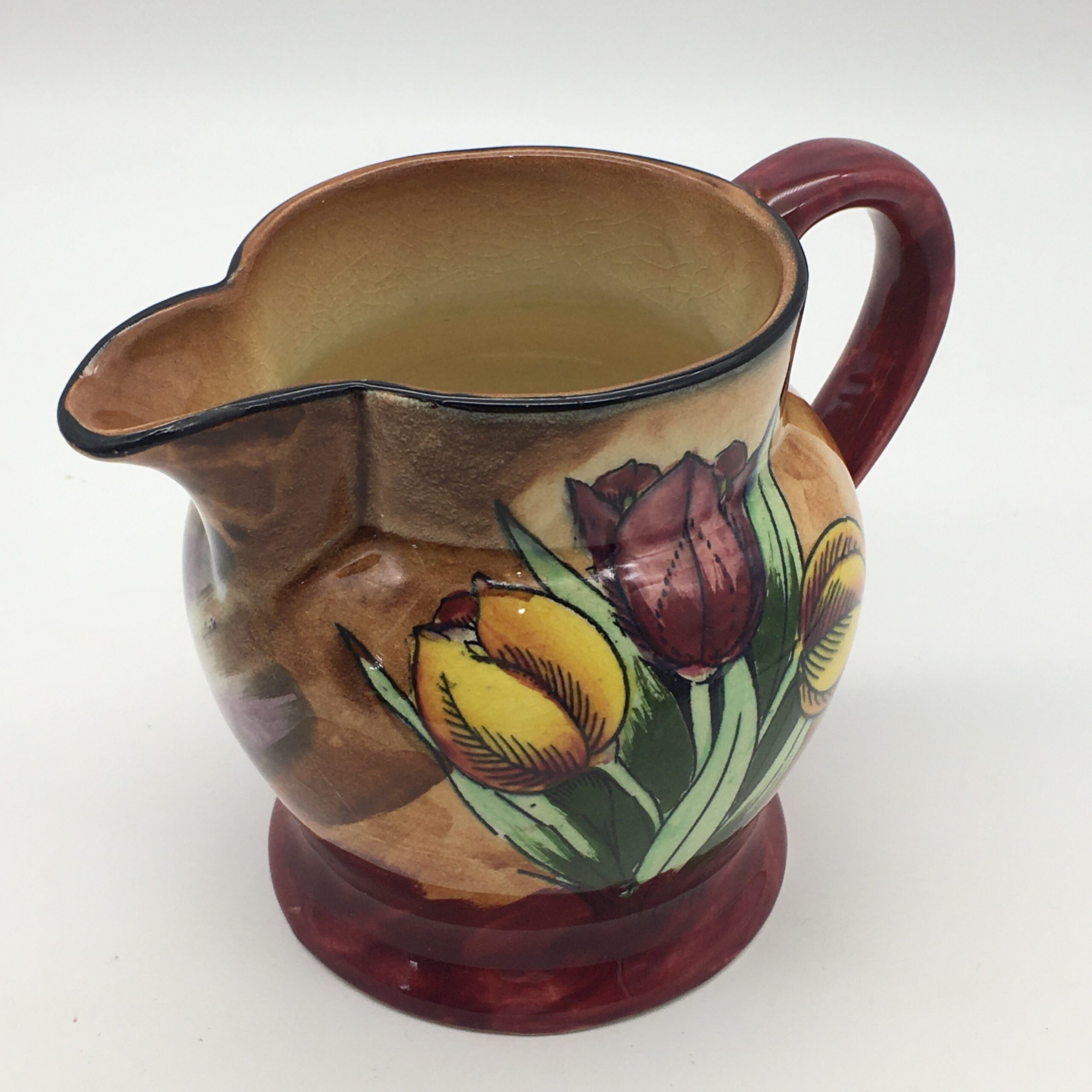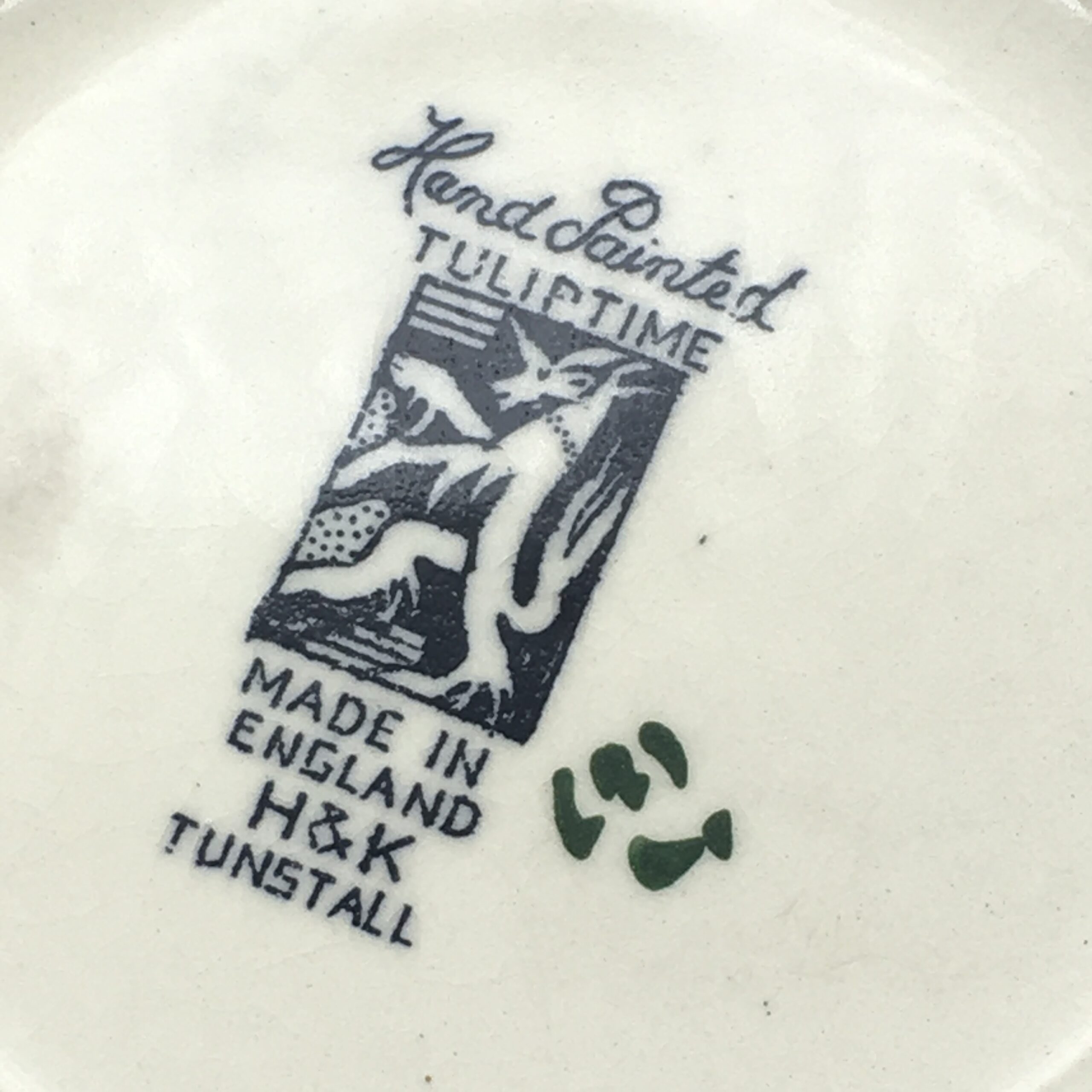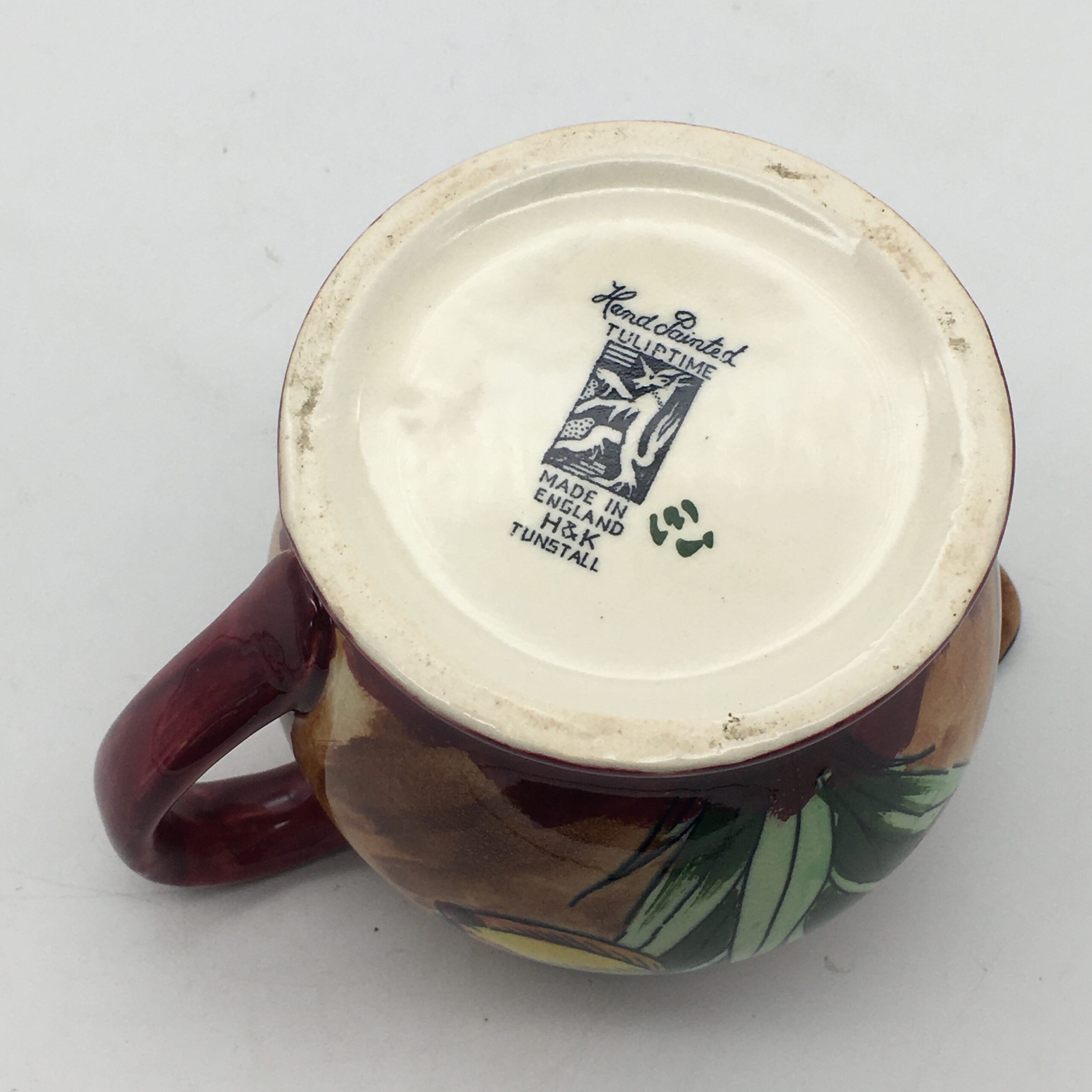 This lovely, large jug from the ‘Hollinshead & Kirkham’ (H&K) factory in Tunstall, England is beautifully hand-painted in the colourful ‘Tulip Time’ pattern, which was designed by ‘Harold Growcott’. The jug is in excellent condition and carries the ‘H&K – TULIPTIME’ backstamp. It stands 11,5cm high, measures 15cm handle to spout, and weighs 355g.