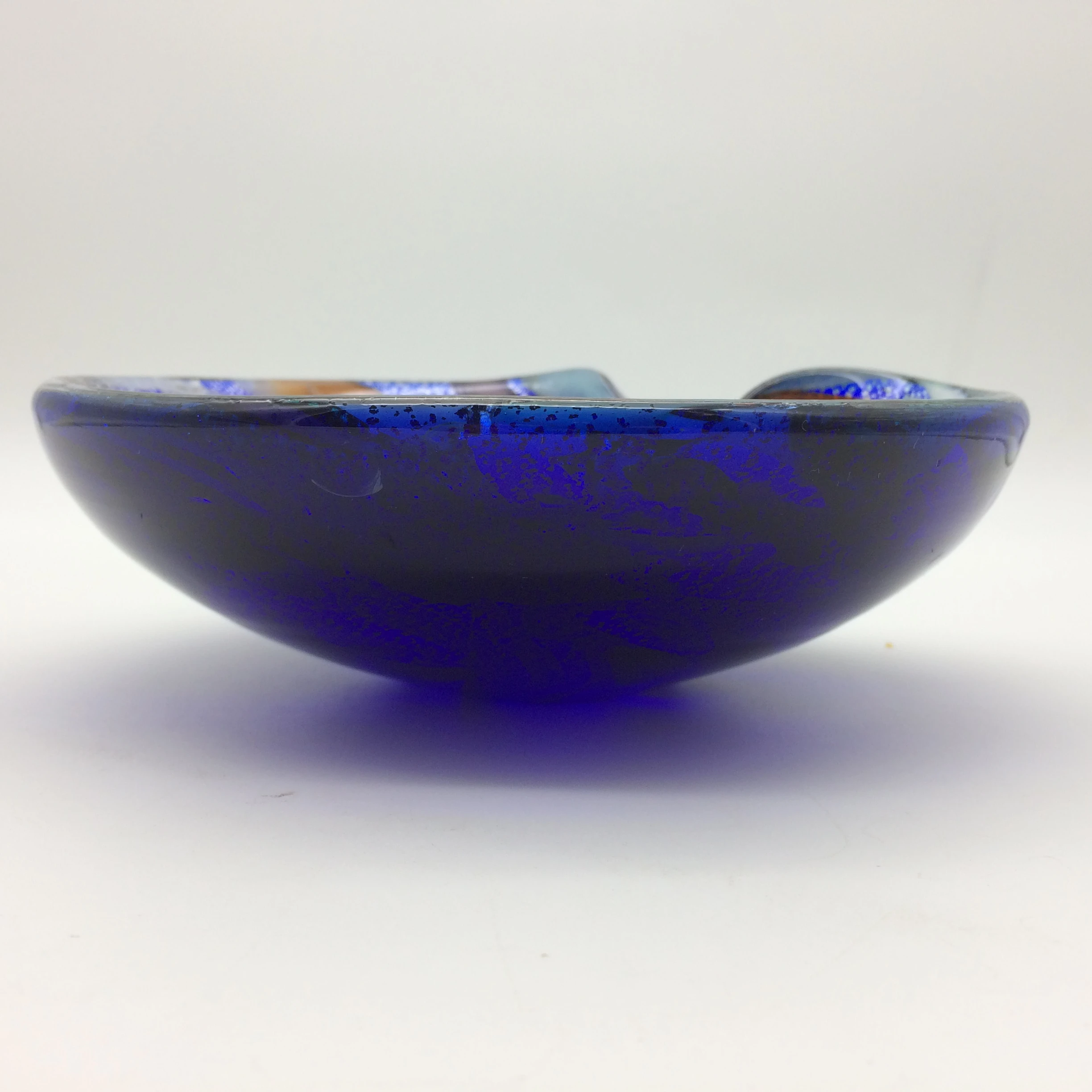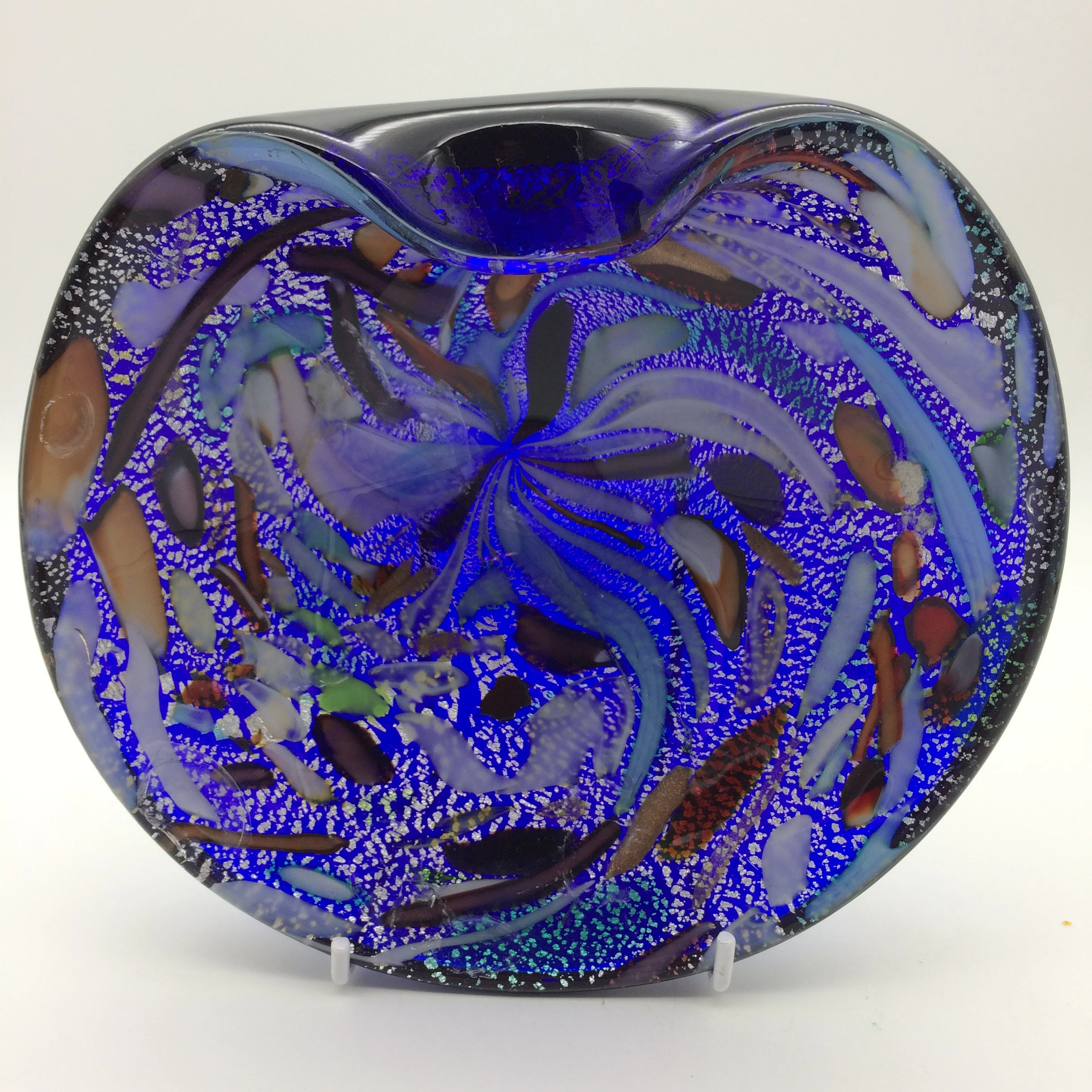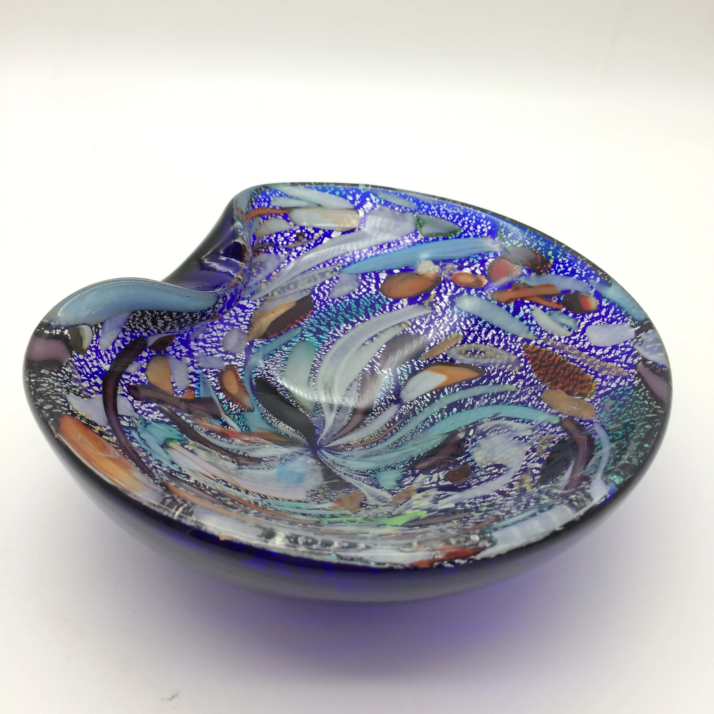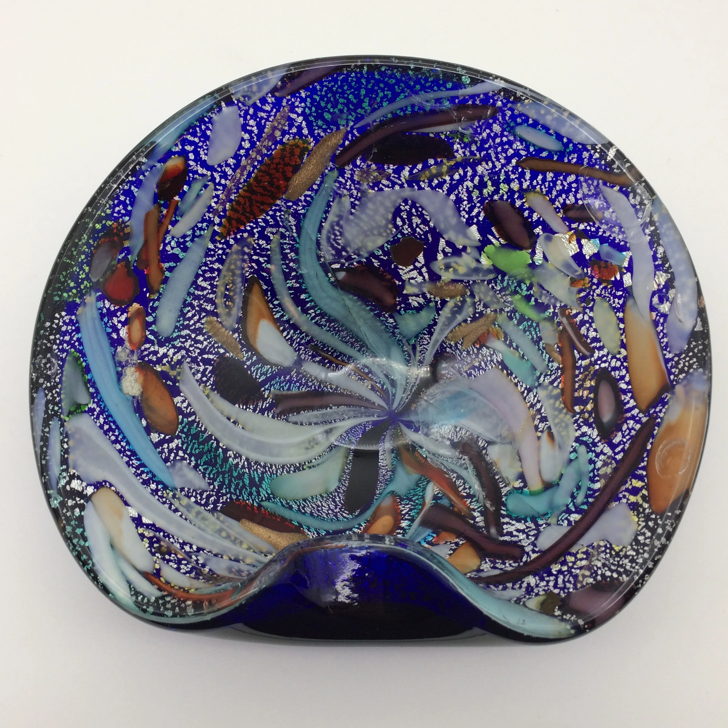 This exquisite 1950/60’s Venetian freeform glass bowl/ashtray was manufactured on the island of Murano, near Venice, Italy. The bowl has a solid dark blue bottom, and the interior has a wonderful array of colours in ribbon work decorated with shimmering silver leaf. These early multi-coloured range of Murano pieces were often referred to as the ‘Tutti Frutti’ range. Other than two minor knocks or bruising to the interior of the bowl it is in excellent condition. It measures 17cm x 15.5cm and stands 6cm high.