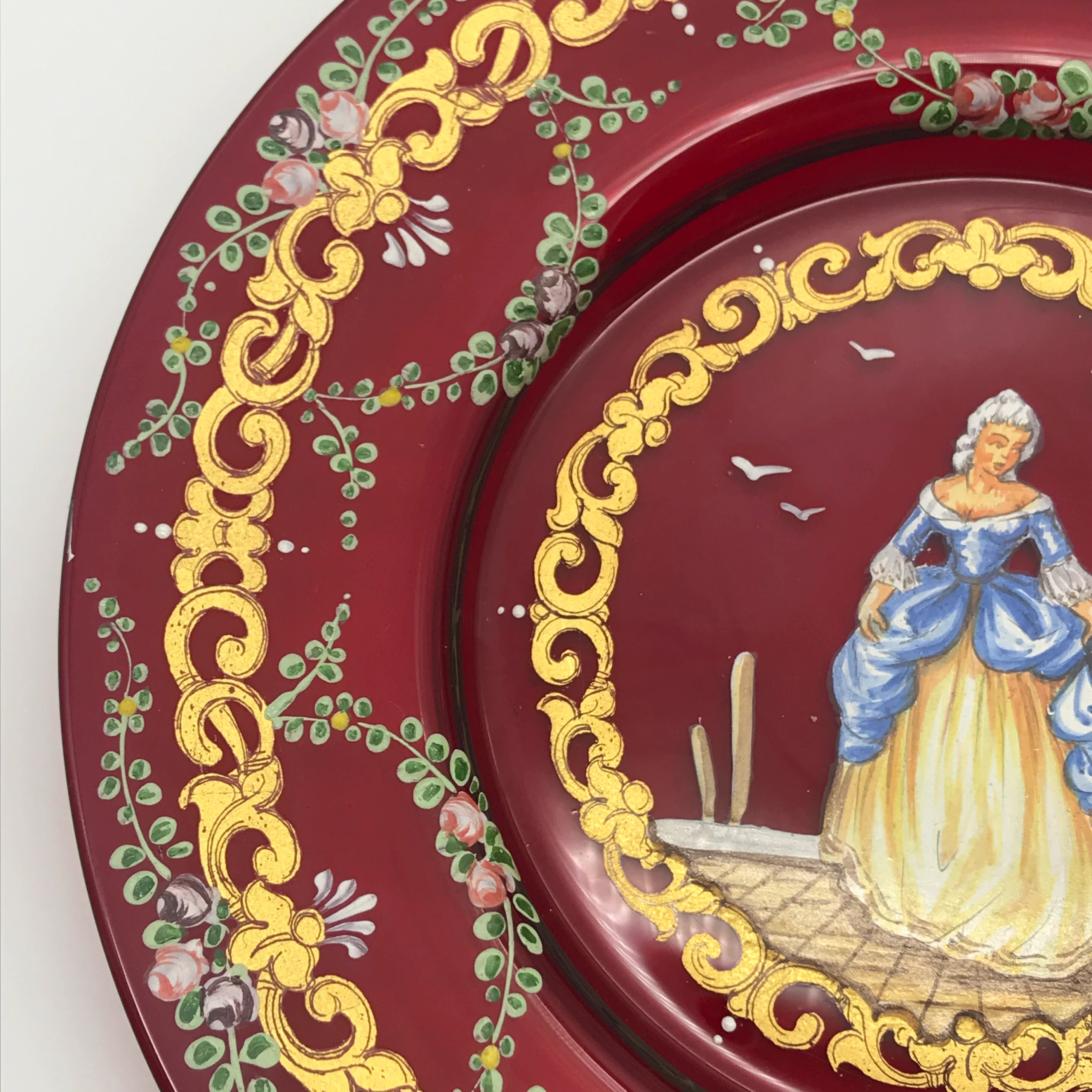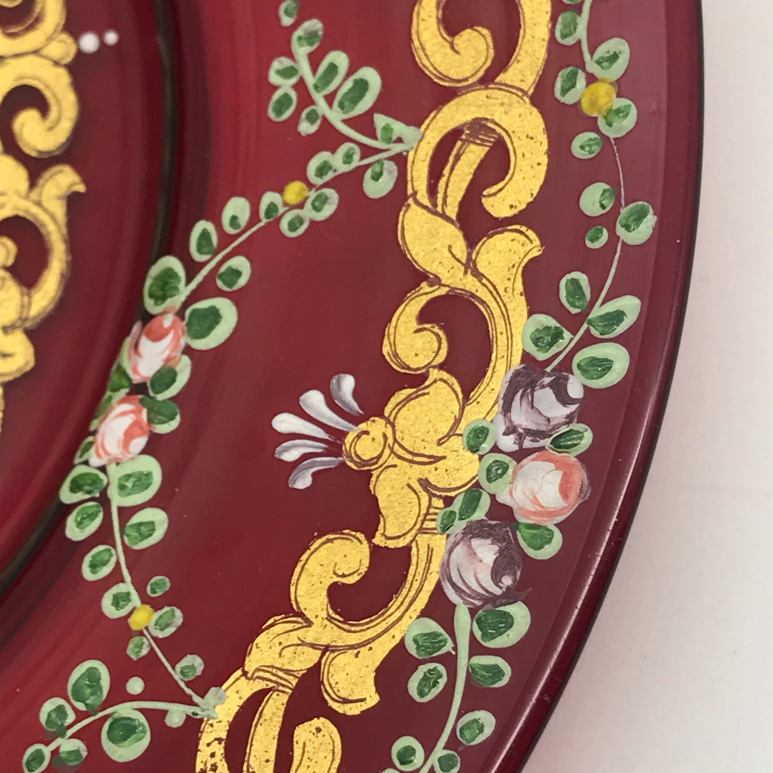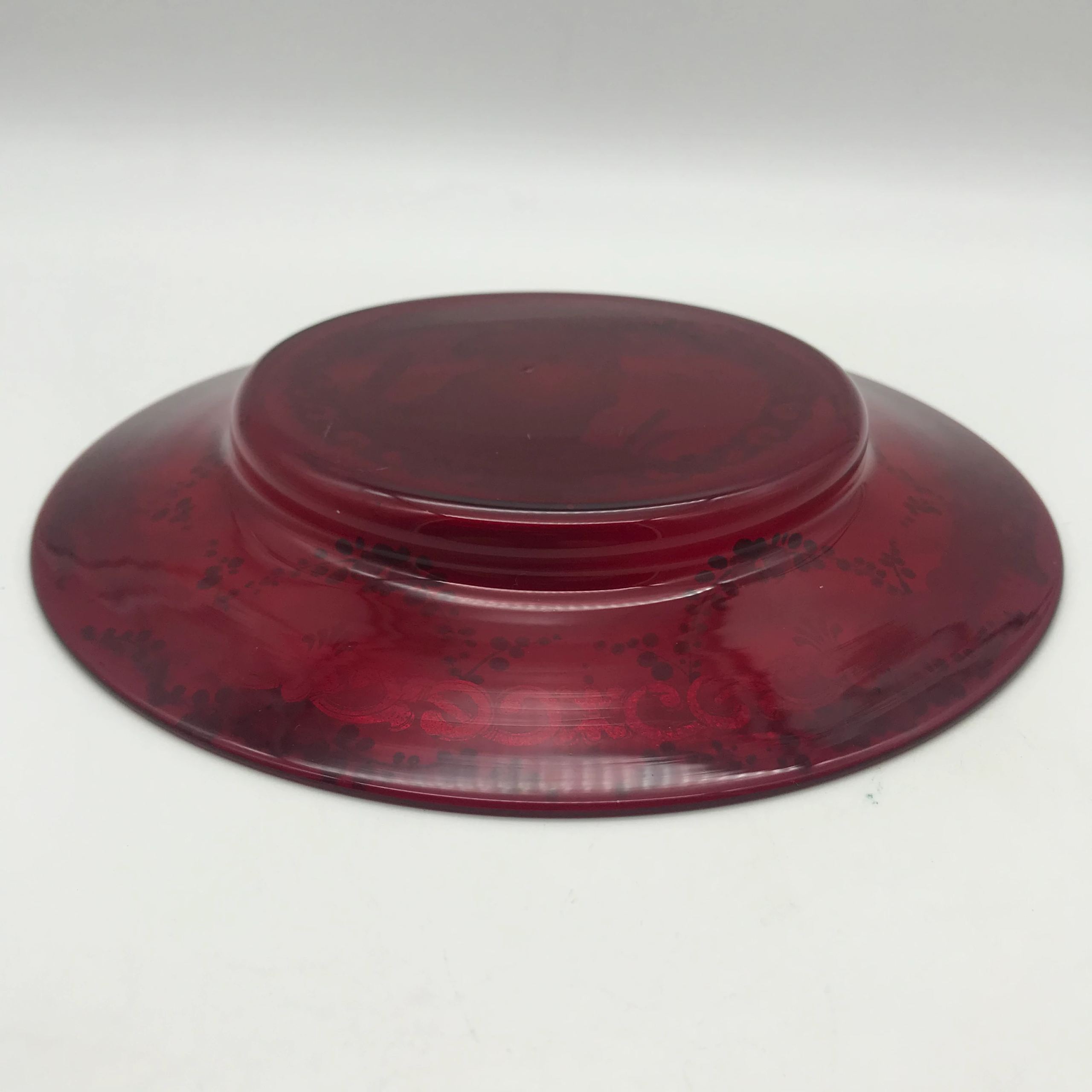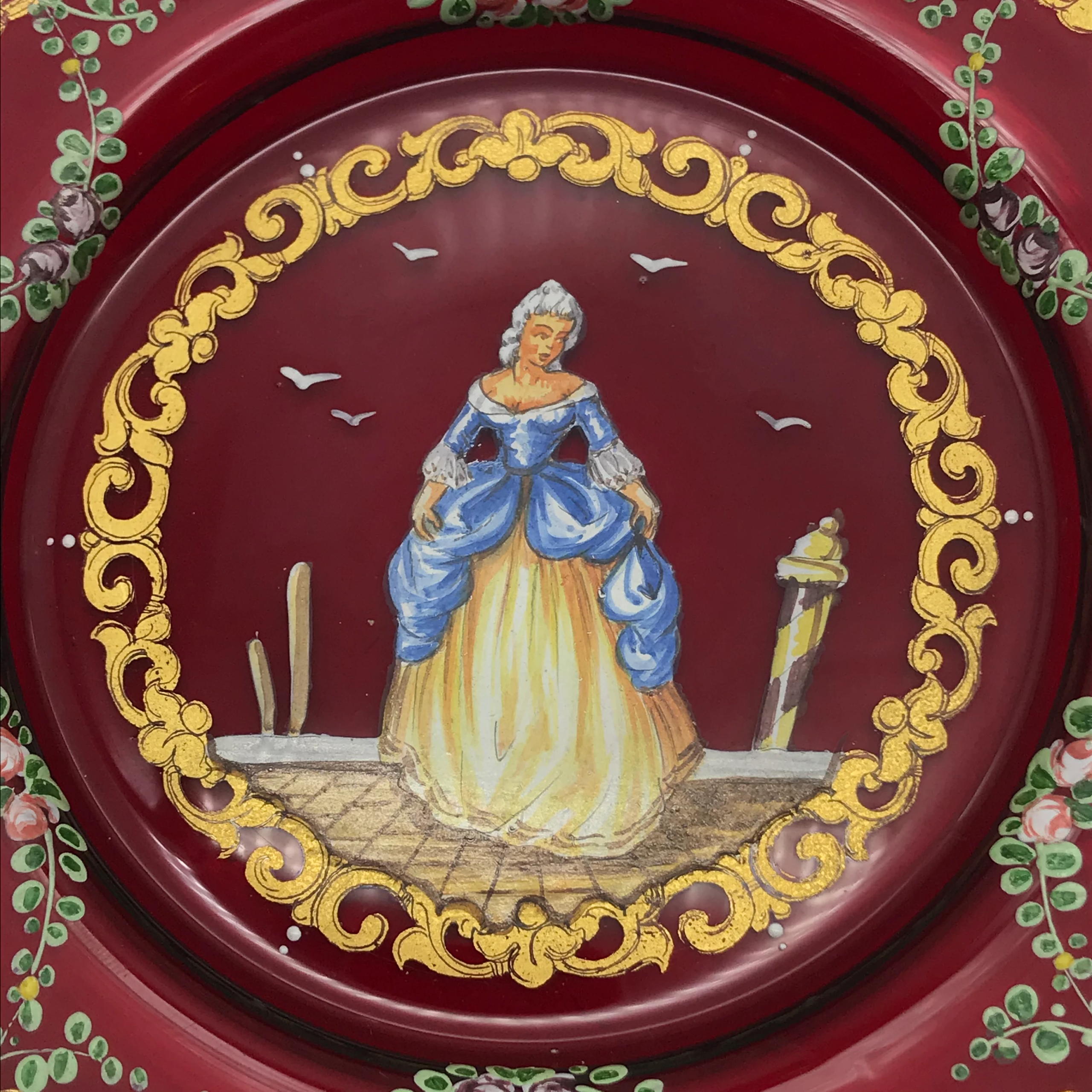 This delicately, hand decorated ruby red glass plate or dish, from the early 1900’s, was probably manufactured by the well-known Venetian glass works ‘Salviati & Co.’ in Italy. It has been beautifully decorated with enamel painted garlands and roses around the edge and a lady in Victorian dress in the centre, with applied ‘Graffito’ (gold foil) by ‘Ludwig Moser & Sons’ of Karlsbad, Bohemia. It is in excellent condition and measures 19.3cm in diameter and weighs 235g.