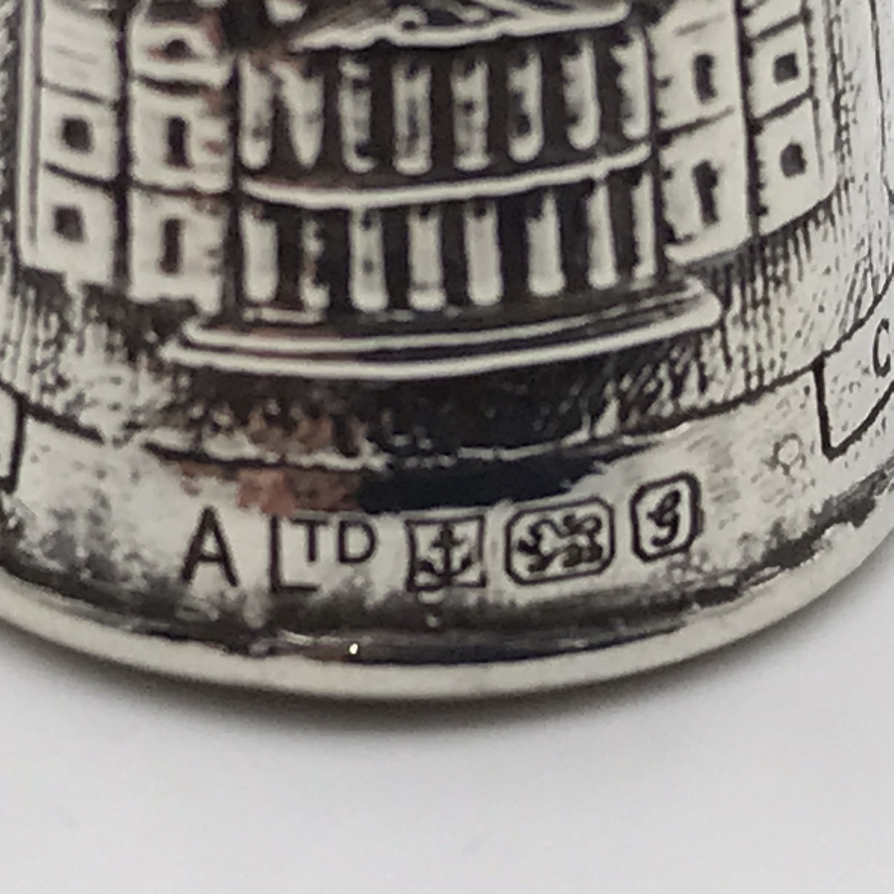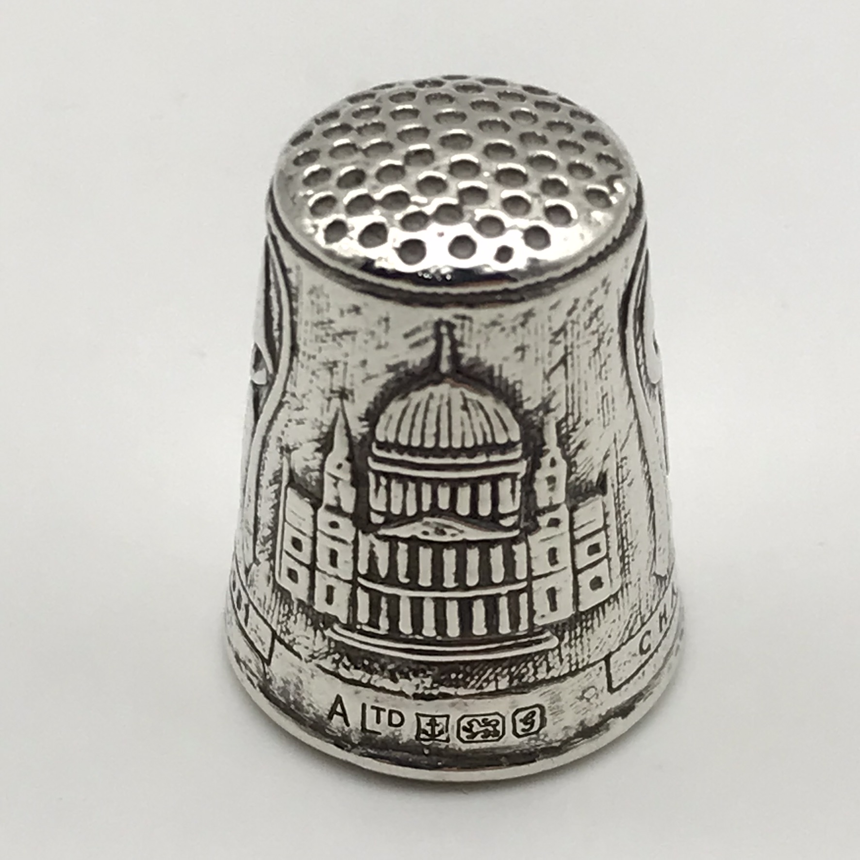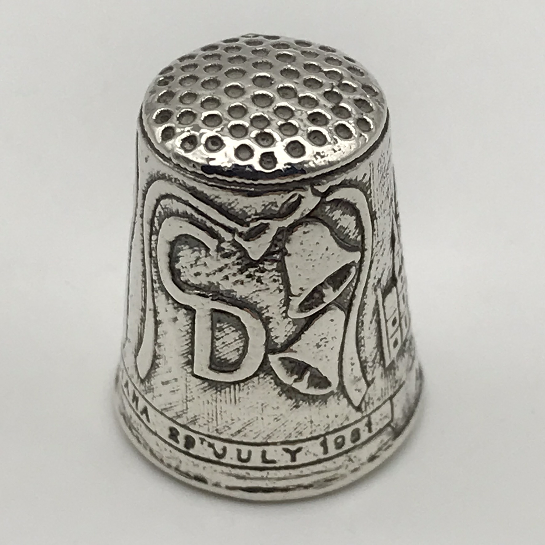 This lovely, sterling silver thimble is in excellent condition and was produced to commemorate the wedding of Prince Charles to Lady Diana Spencer in 1981. It has, in relief, the large initials ‘C & D’ with wedding bells on the sides along with a picture of ‘St. Pauls Cathedral’. The thimble was made in 1981 in Birmingham by silversmiths ‘Ammonite Ltd’ (ALTD). It stands 23mm high, has a base diameter of 19mm, and weighs 3,7g.