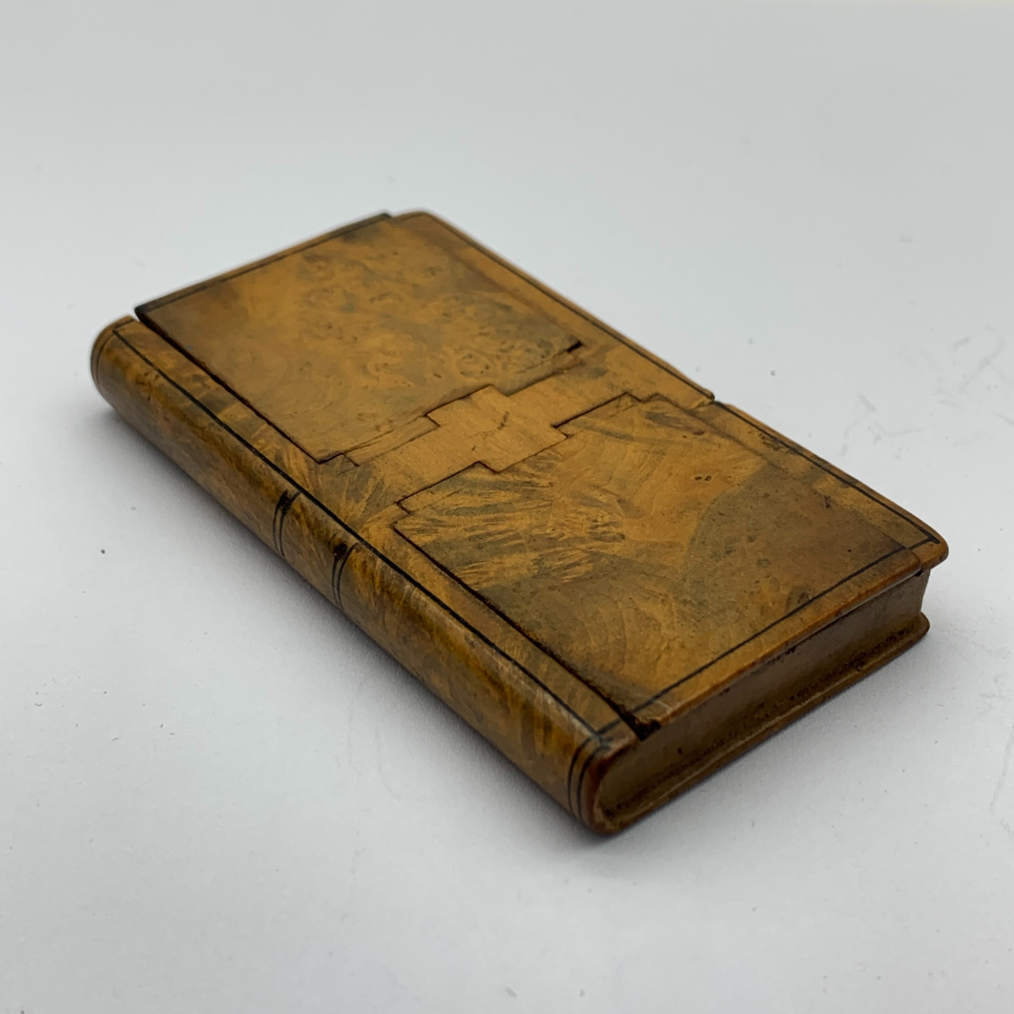This fabulous, early Victorian, beautifully made pocket snuff box, is hand crafted in the form of a small book, with precise measurements and is fitted with hidden pin hinges. The box has two compartments fitted with airtight hinged lids and appears to be made from ‘Burr Birch’ wood and lined with tortoise shell. This special piece is in great condition with lovely detail and still retains some of its original snuff powder. The box measures 7,5cm x 4,2cm x 1cm.