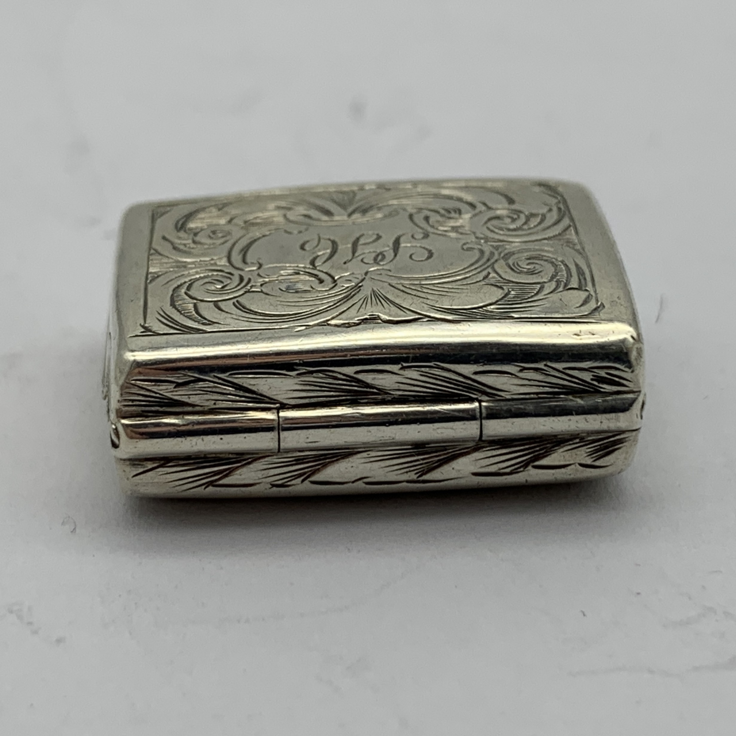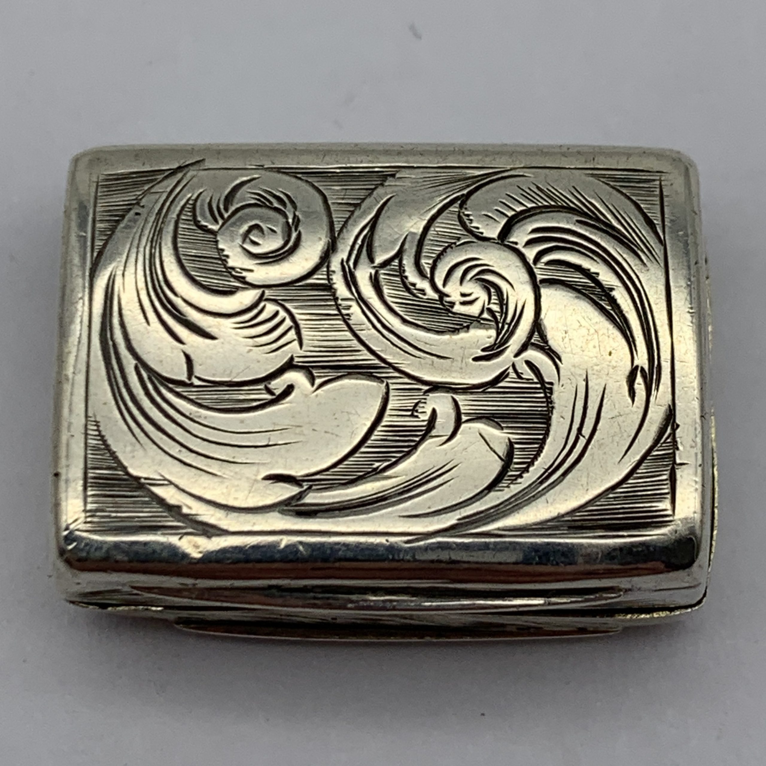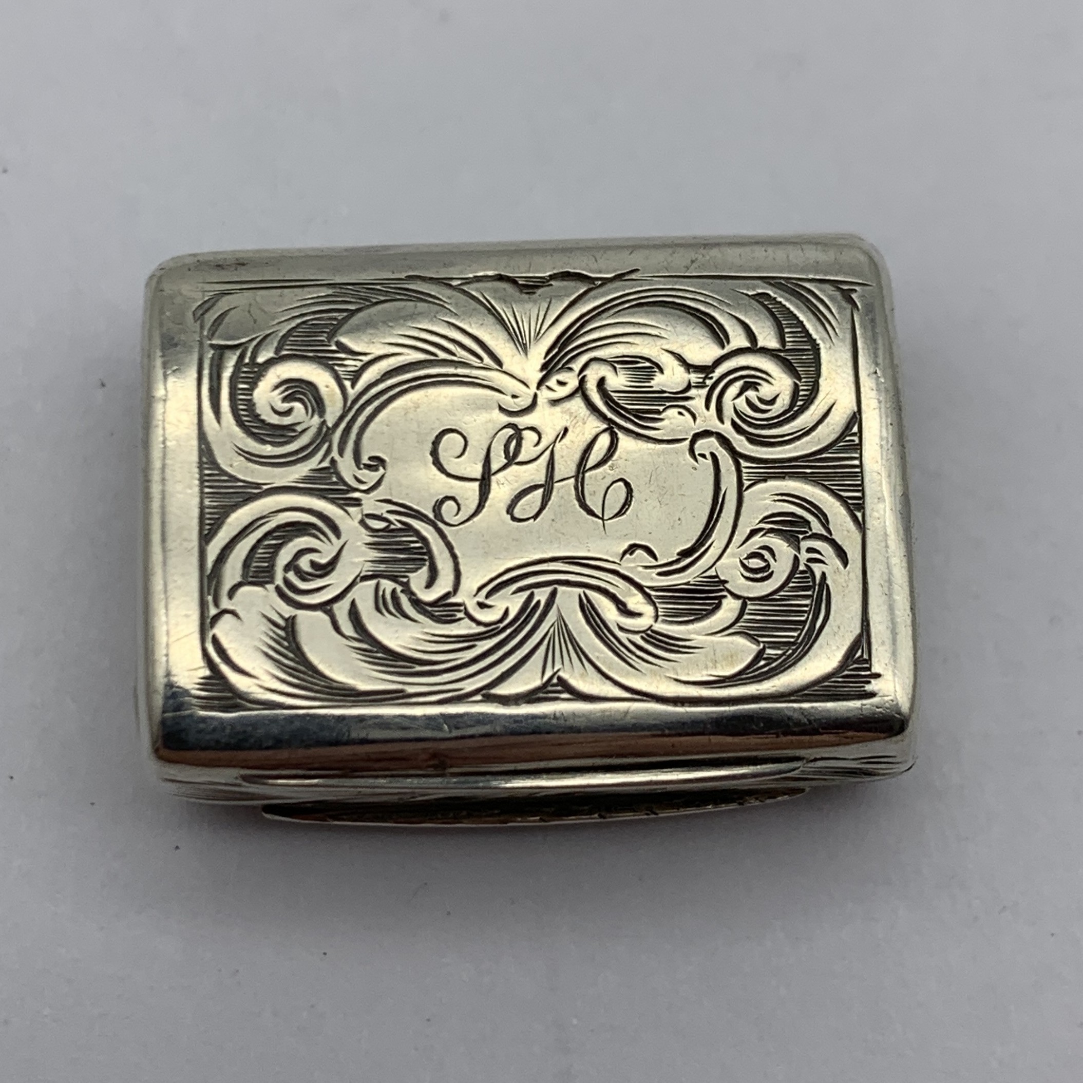 This lovely, early, small, silver Victorian vinaigrette is rectangular in shape with a pretty acanthus leaf pattern engraved on both sides and its hinged interior pierced grill is decorated with flowers. It was made in 1847 in Birmingham, England by silversmiths (CWC) ‘Cronin & Wheeler’ (for James Cronin & Sarah & George Wheeler). The vinaigrette is in excellent condition with good hinges, nice clear hallmarks and still retains its lovely, gilded interior. It measures 22mm x 16mm x 10mm.