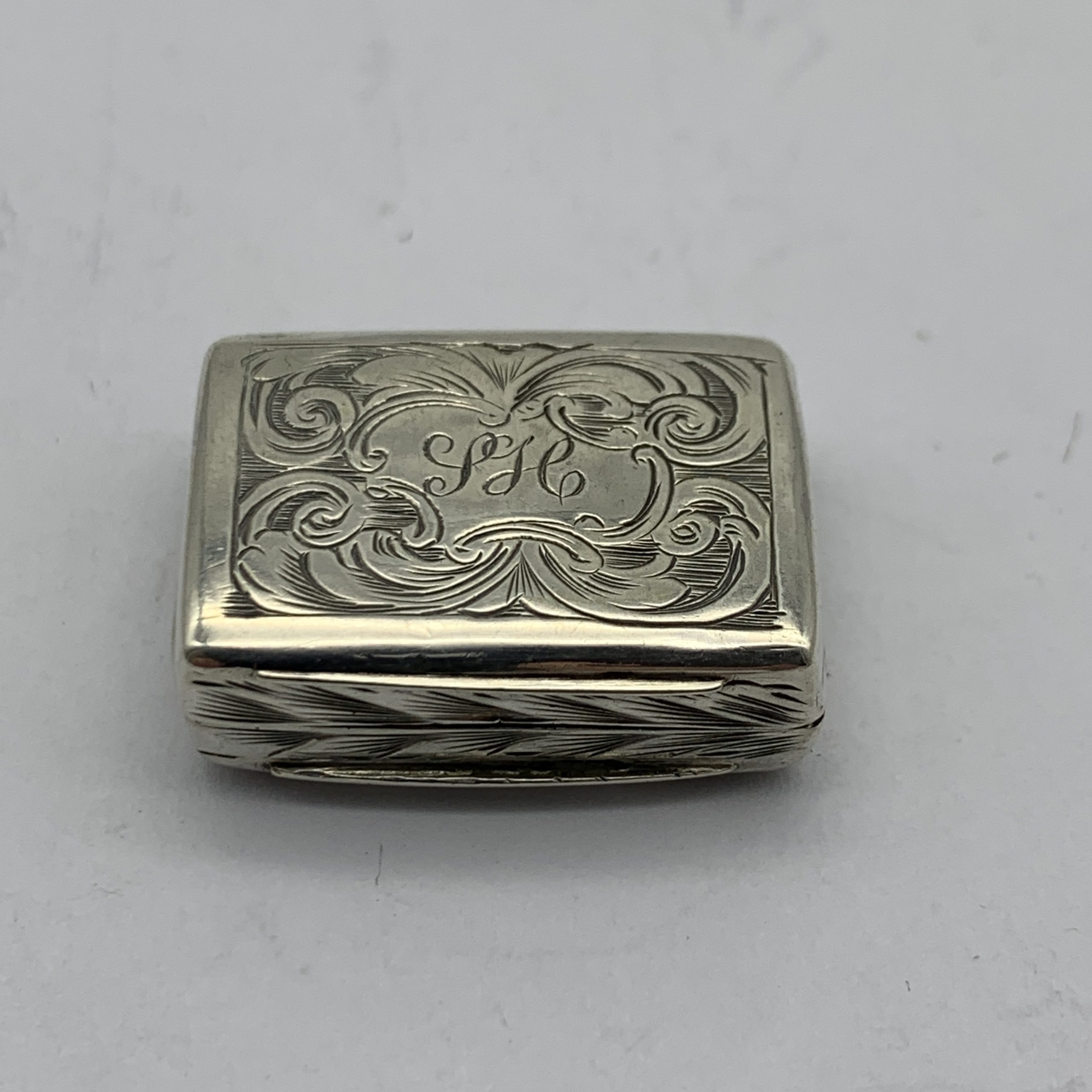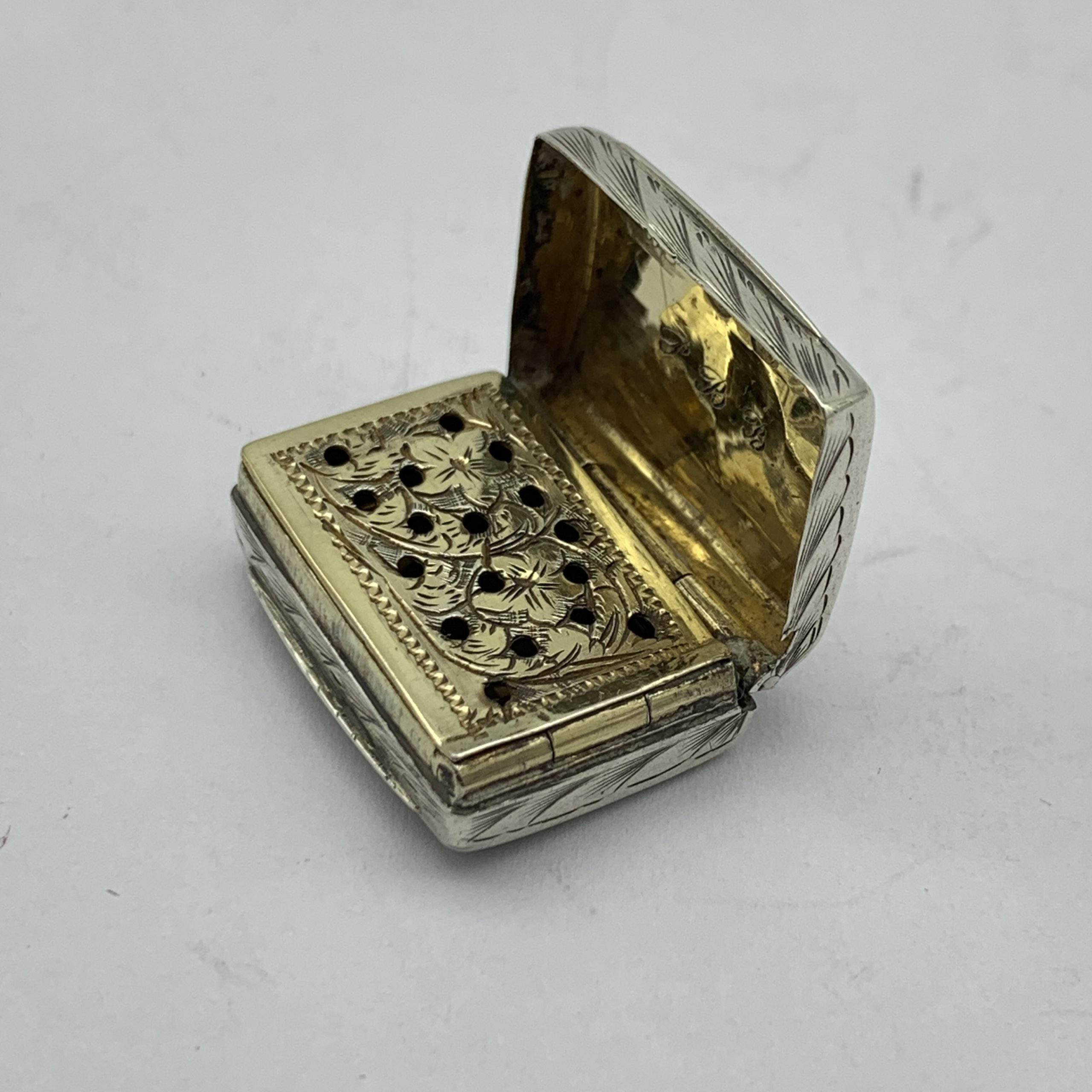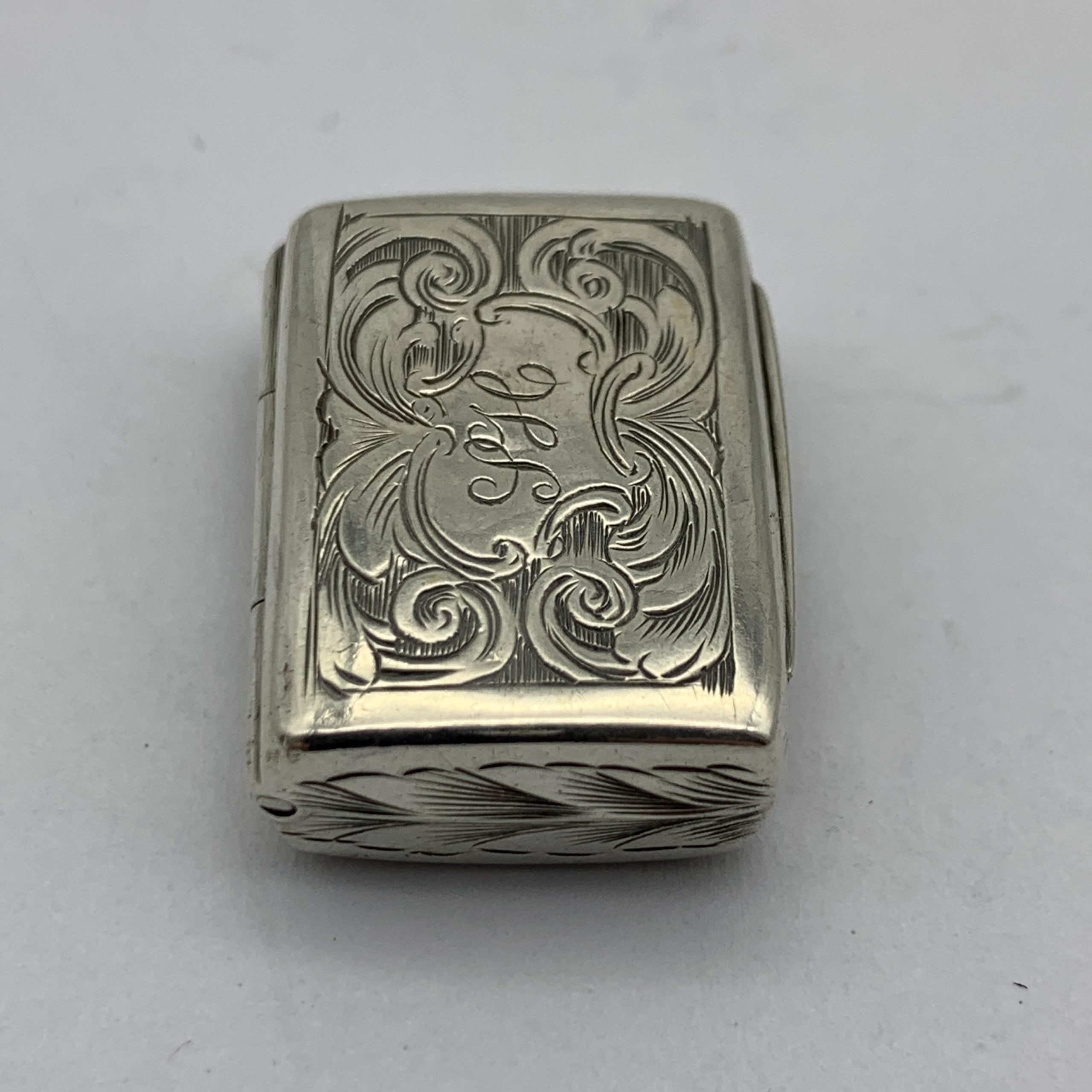 This lovely, early, small, silver Victorian vinaigrette is rectangular in shape with a pretty acanthus leaf pattern engraved on both sides and its hinged interior pierced grill is decorated with flowers. It was made in 1847 in Birmingham, England by silversmiths (CWC) ‘Cronin & Wheeler’ (for James Cronin & Sarah & George Wheeler). The vinaigrette is in excellent condition with good hinges, nice clear hallmarks and still retains its lovely, gilded interior. It measures 22mm x 16mm x 10mm.