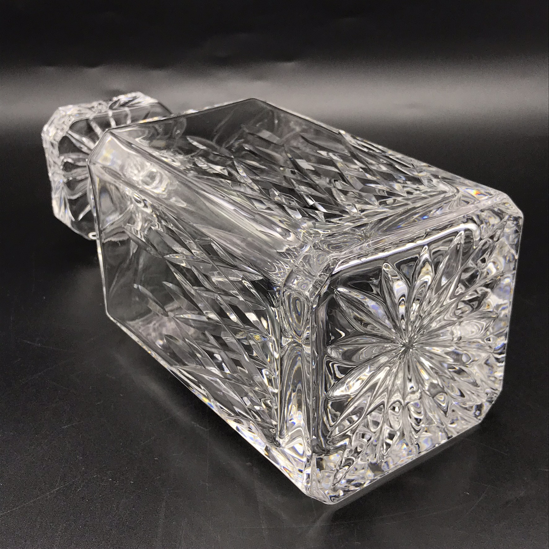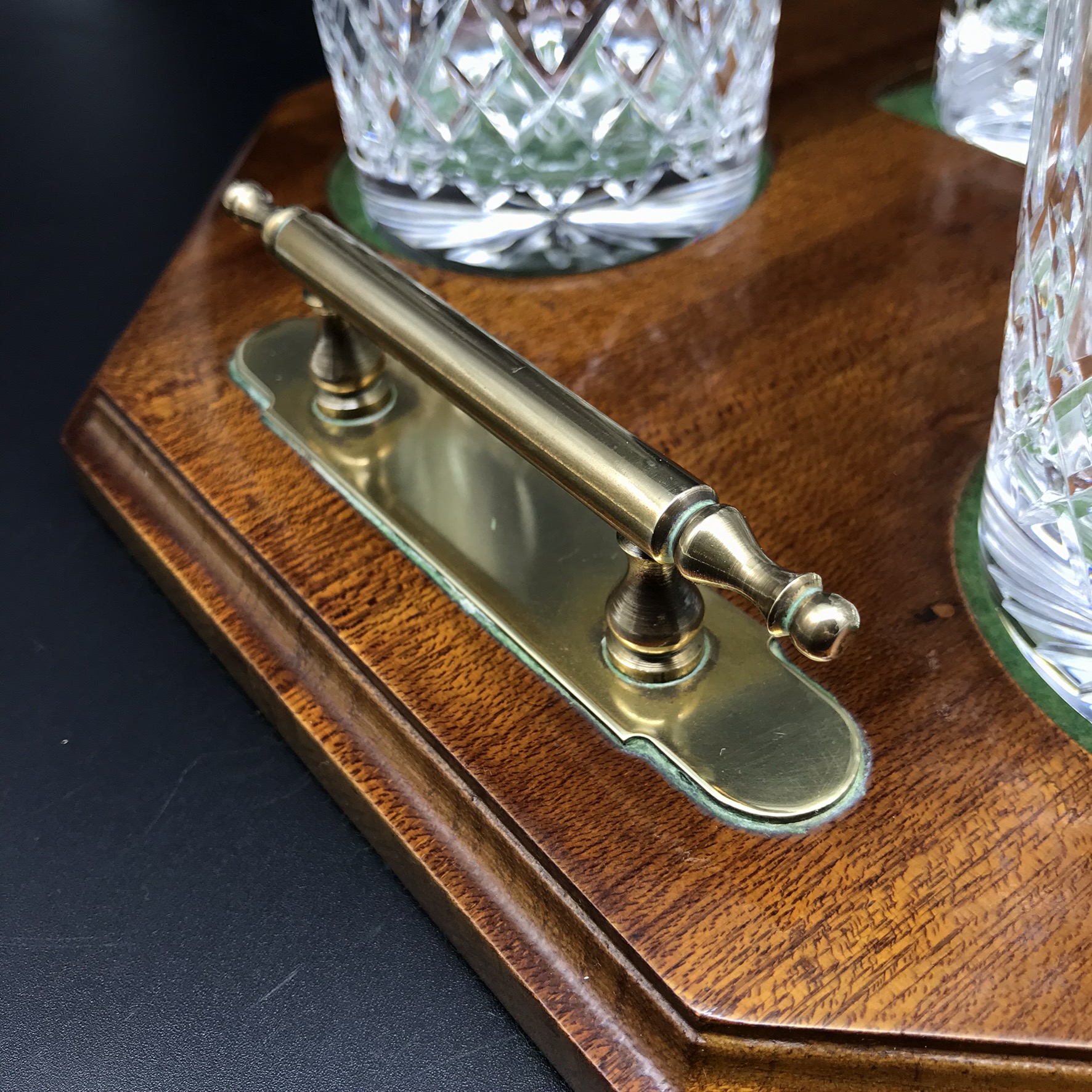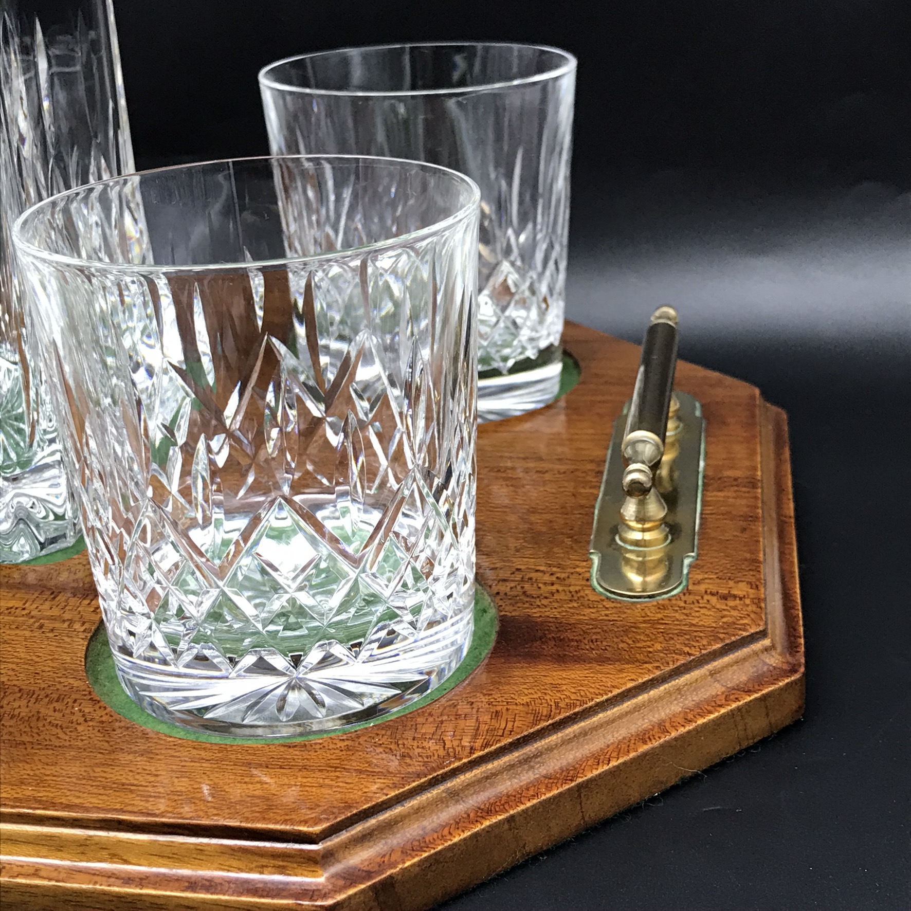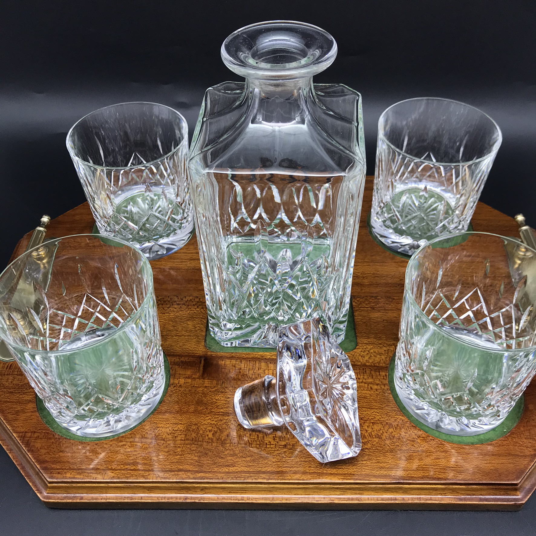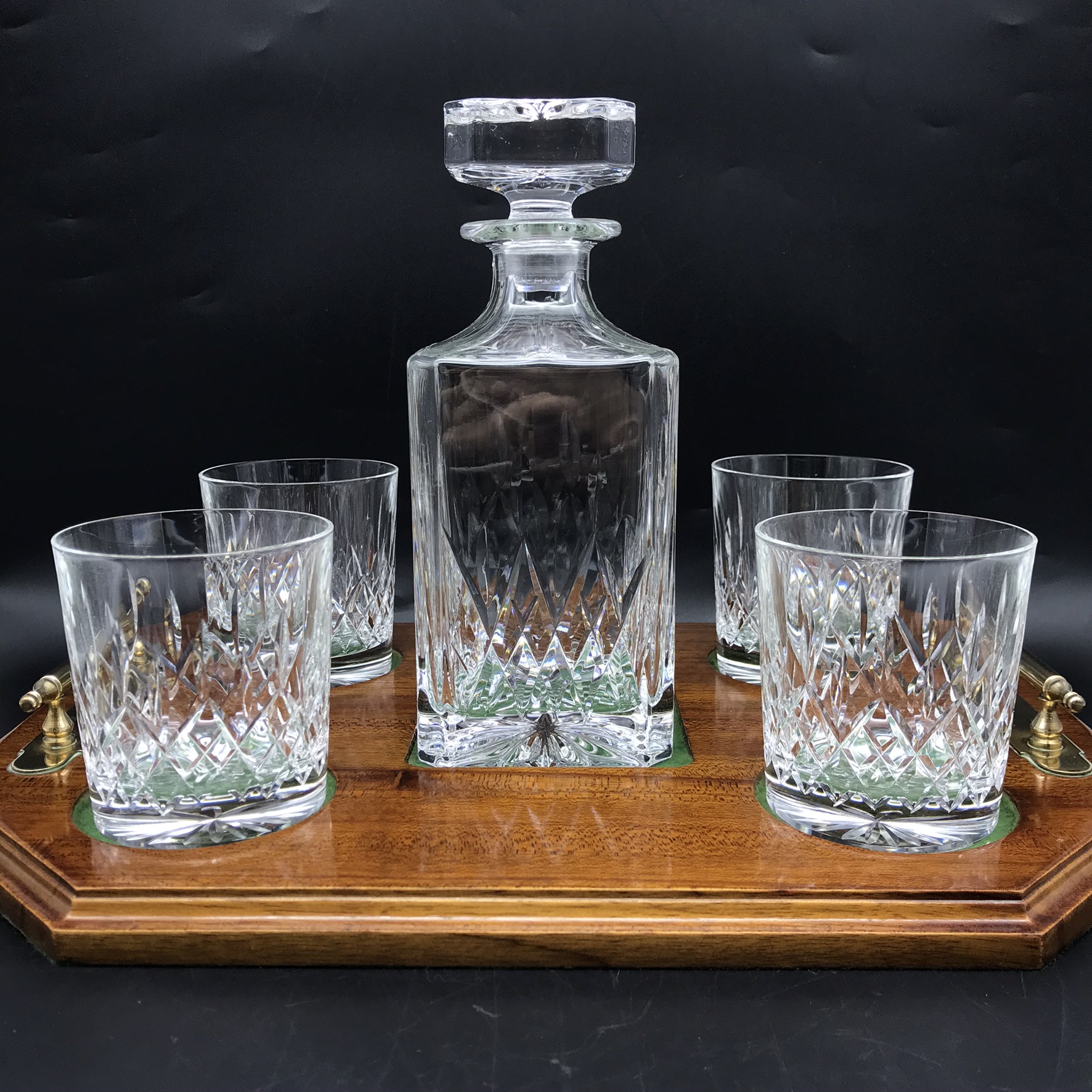 This very good quality, elegant, vintage crystal whiskey set comprises of a beautifully cut, crystal spirit decanter with stopper, four cut-crystal whisky glasses and a custom-made wooden mahogany tray with solid brass handles. The decanter and glasses are cut in the same elegant design, and all with star-cut bases. The wooden tray has green felt lined, shallow cut spaces for the glasses and decanter, as well as a green felt lined base. Although the set is pre-owned, it is in fantastic condition and appears to have hardly been used and would make an ideal gift for a whisky lover. The decanter measures 9cm x 9cm, stands 22,3cm high (18,5cm without stopper) and weighs 1470g. The glasses stand 9cm high with a top diameter of 8cm and the tray measures 42cm x 29cm, with a wood thickness of 2cm and with the brass handles, has a height of 5cm. Together the entire set weighs 4,6kg.