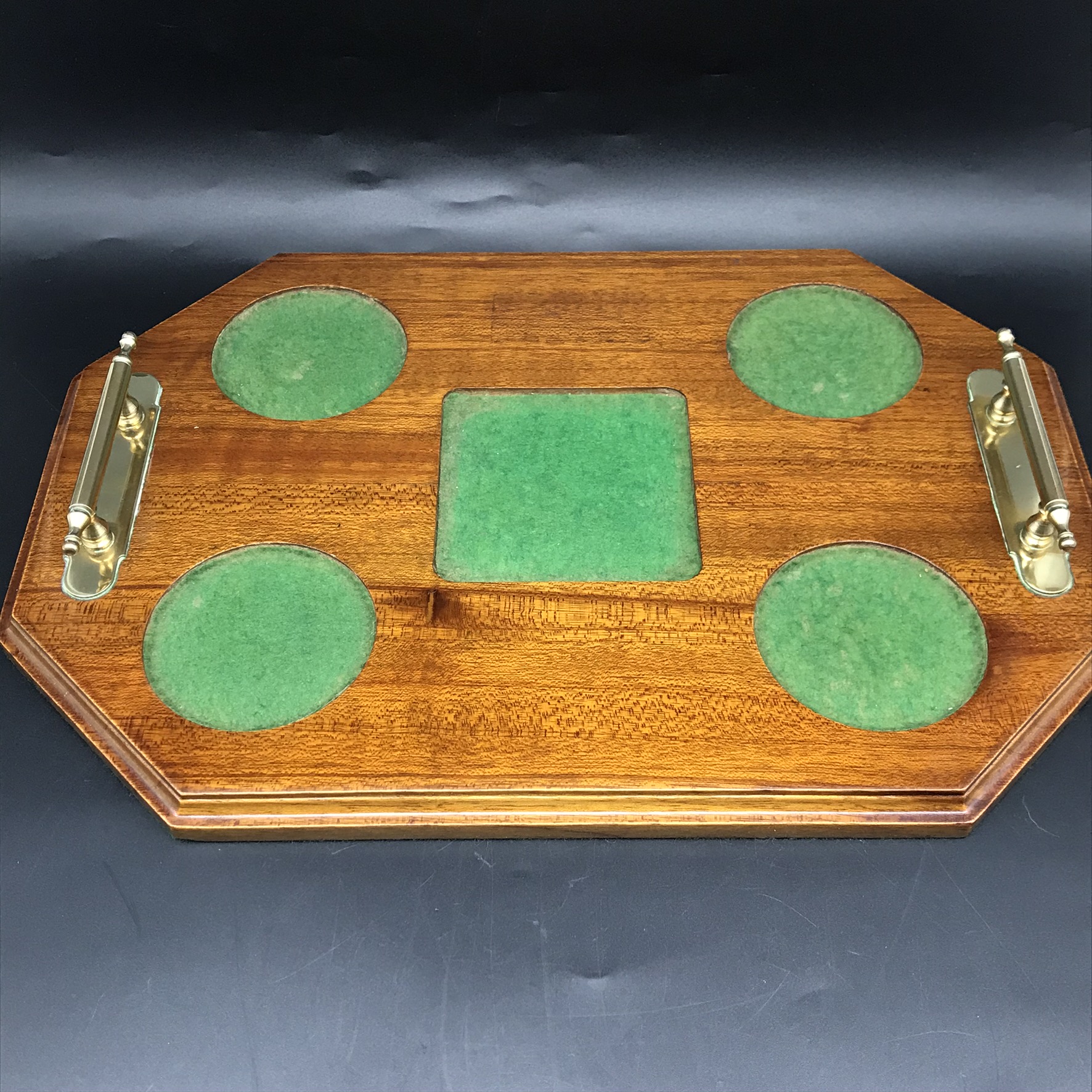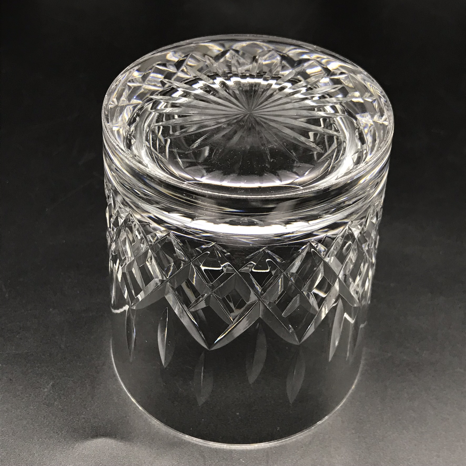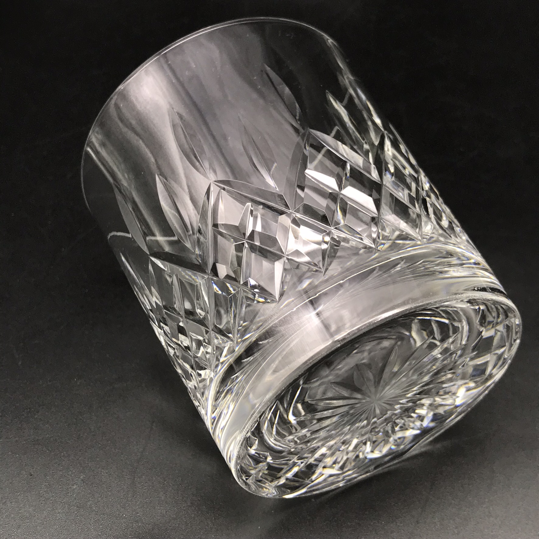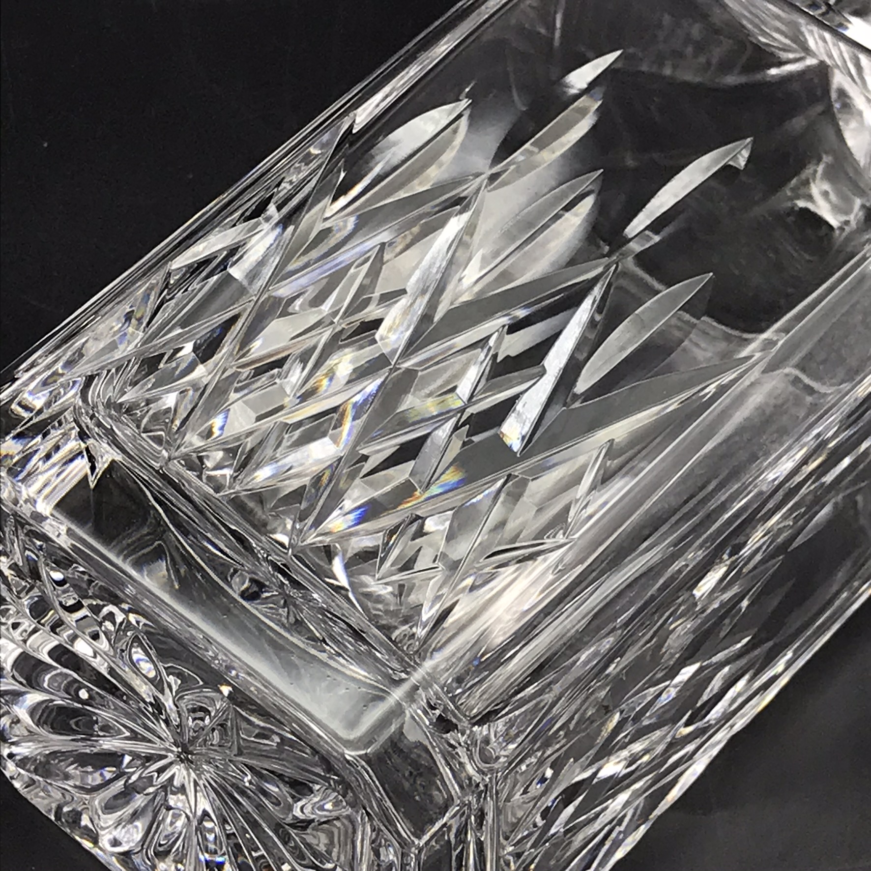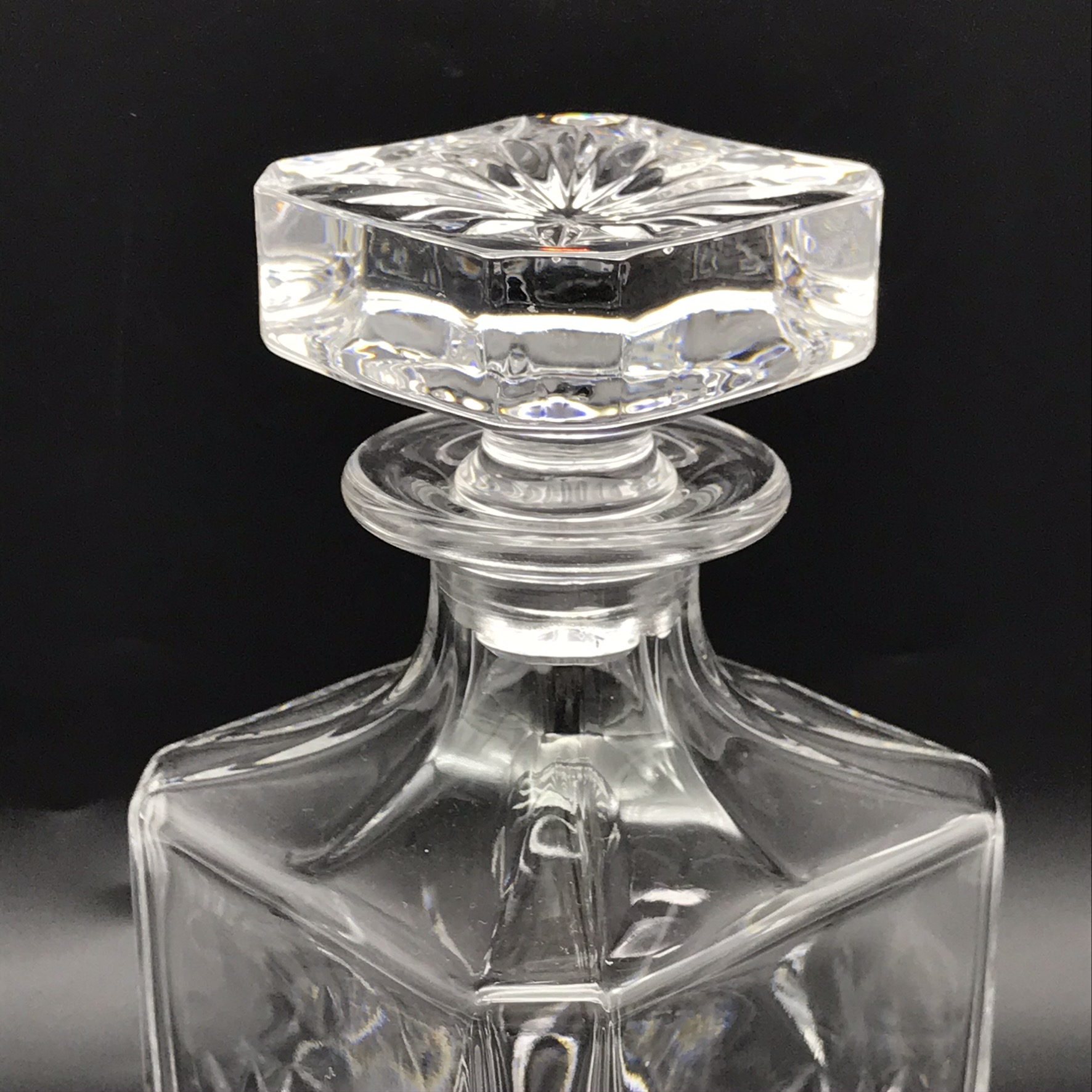 This very good quality, elegant, vintage crystal whiskey set comprises of a beautifully cut, crystal spirit decanter with stopper, four cut-crystal whisky glasses and a custom-made wooden mahogany tray with solid brass handles. The decanter and glasses are cut in the same elegant design, and all with star-cut bases. The wooden tray has green felt lined, shallow cut spaces for the glasses and decanter, as well as a green felt lined base. Although the set is pre-owned, it is in fantastic condition and appears to have hardly been used and would make an ideal gift for a whisky lover. The decanter measures 9cm x 9cm, stands 22,3cm high (18,5cm without stopper) and weighs 1470g. The glasses stand 9cm high with a top diameter of 8cm and the tray measures 42cm x 29cm, with a wood thickness of 2cm and with the brass handles, has a height of 5cm. Together the entire set weighs 4,6kg.