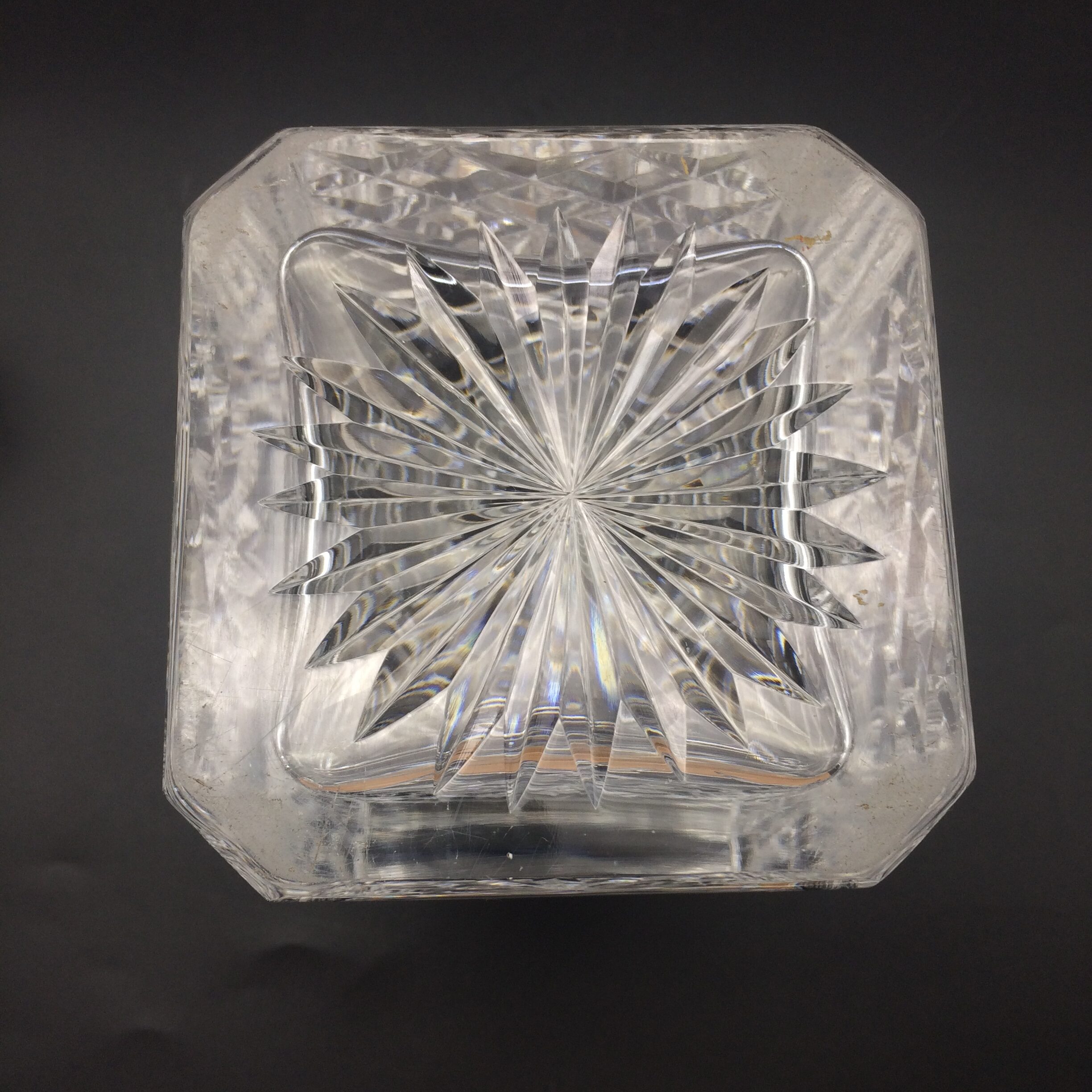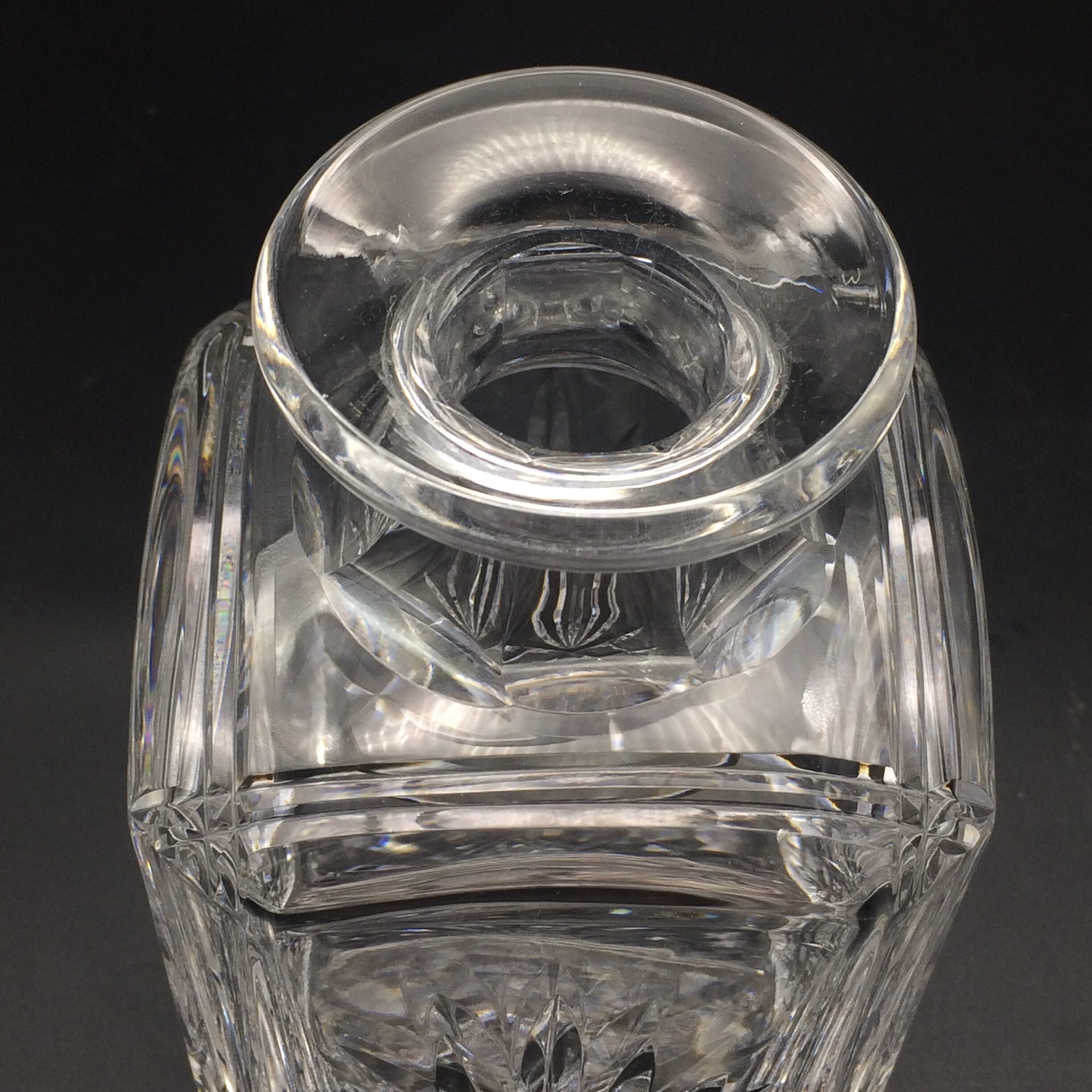 This early, very good quality ‘Stuart Crystal’ spirit decanter and stopper is in excellent condition and beautifully cut in the popular ‘Glencore’ design, with a star-cut base. The ‘Stuart Crystal’ factory was very well-known for their exceptional quality, and started manufacturing in the late 1880’s in England until they sadly closed their doors in 2001. The decanter is nicely weighted and stands 24cm high, with a base measurement of 8,8cm x 8,8cm and weighs 1470g.