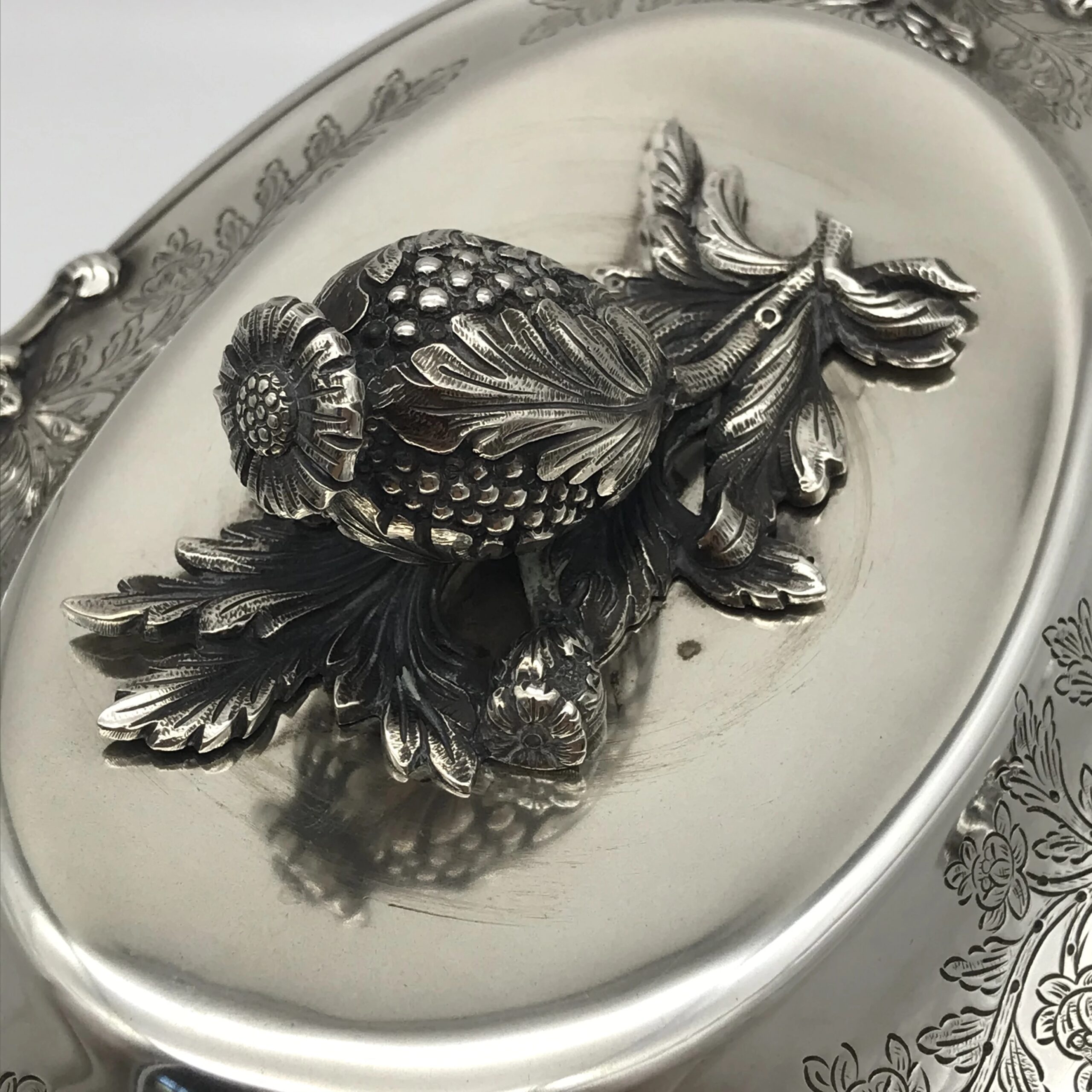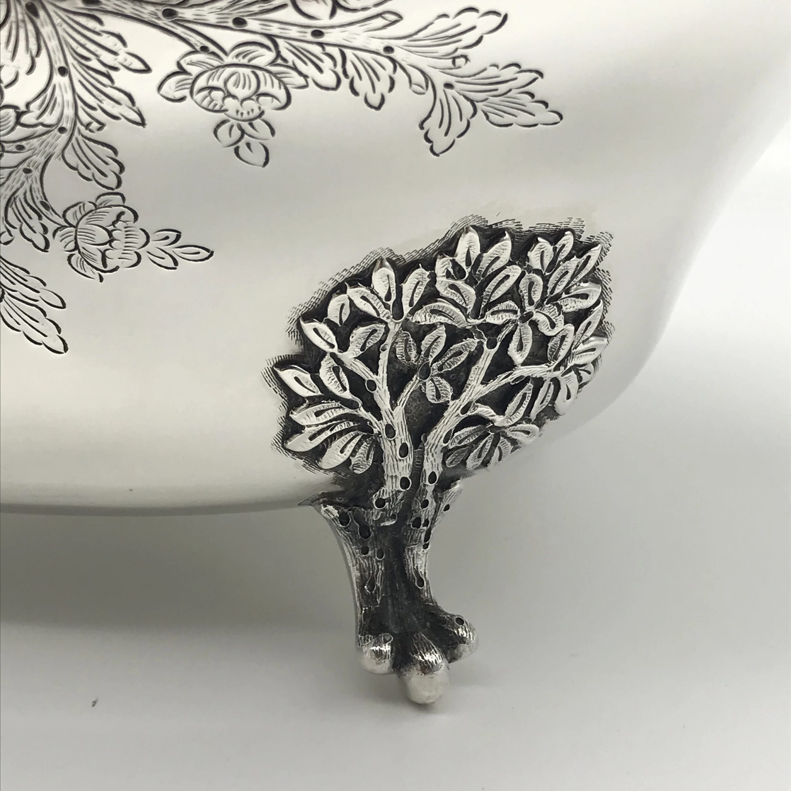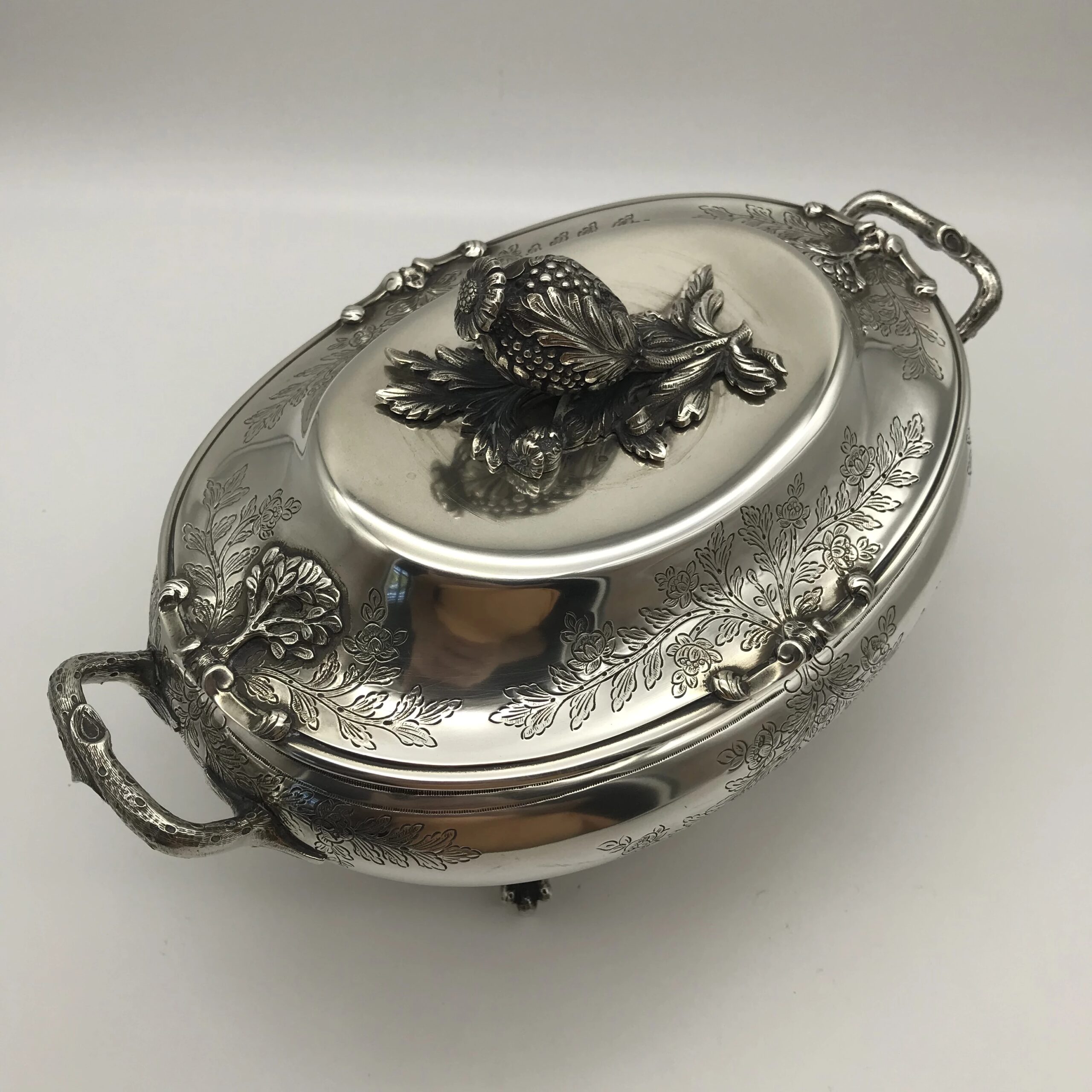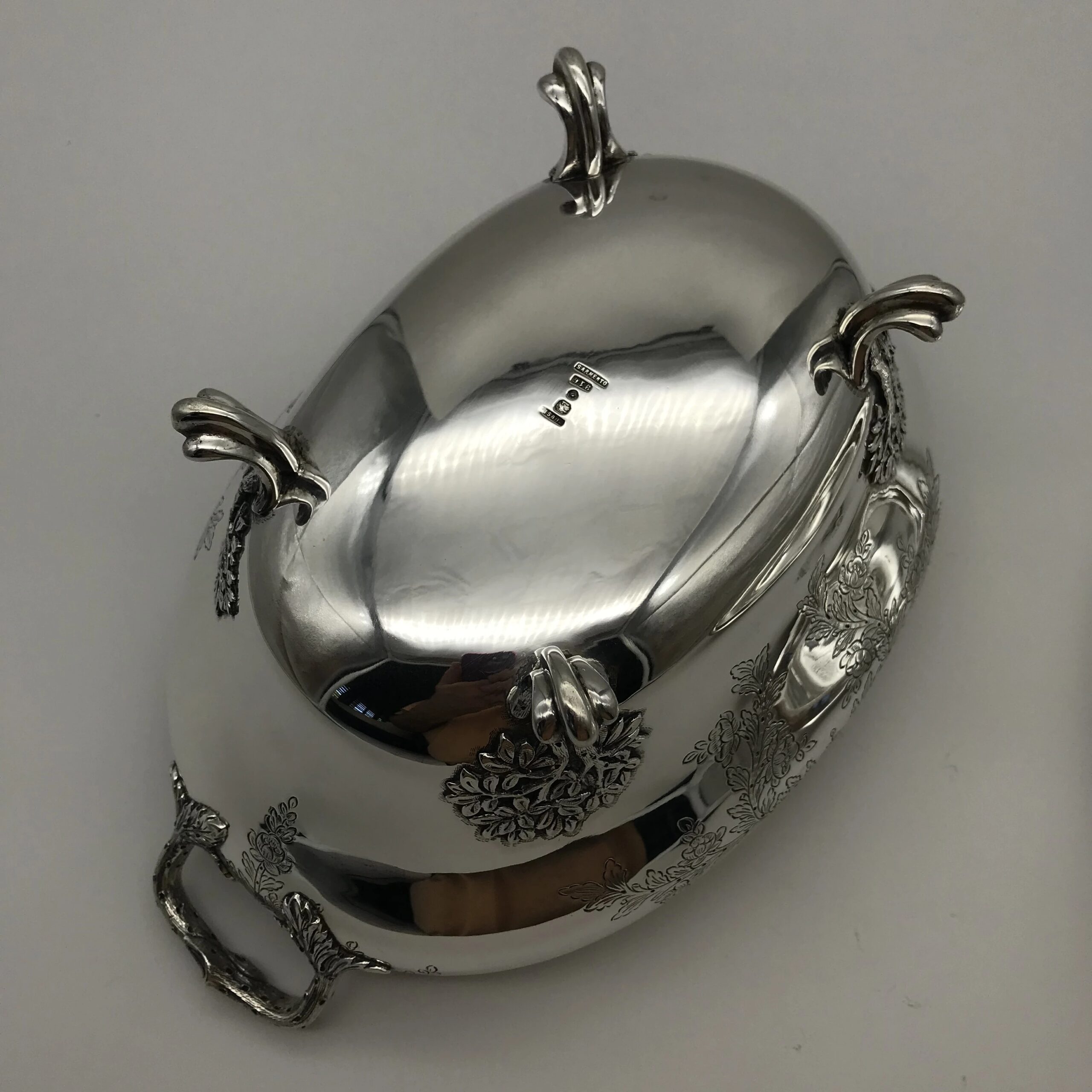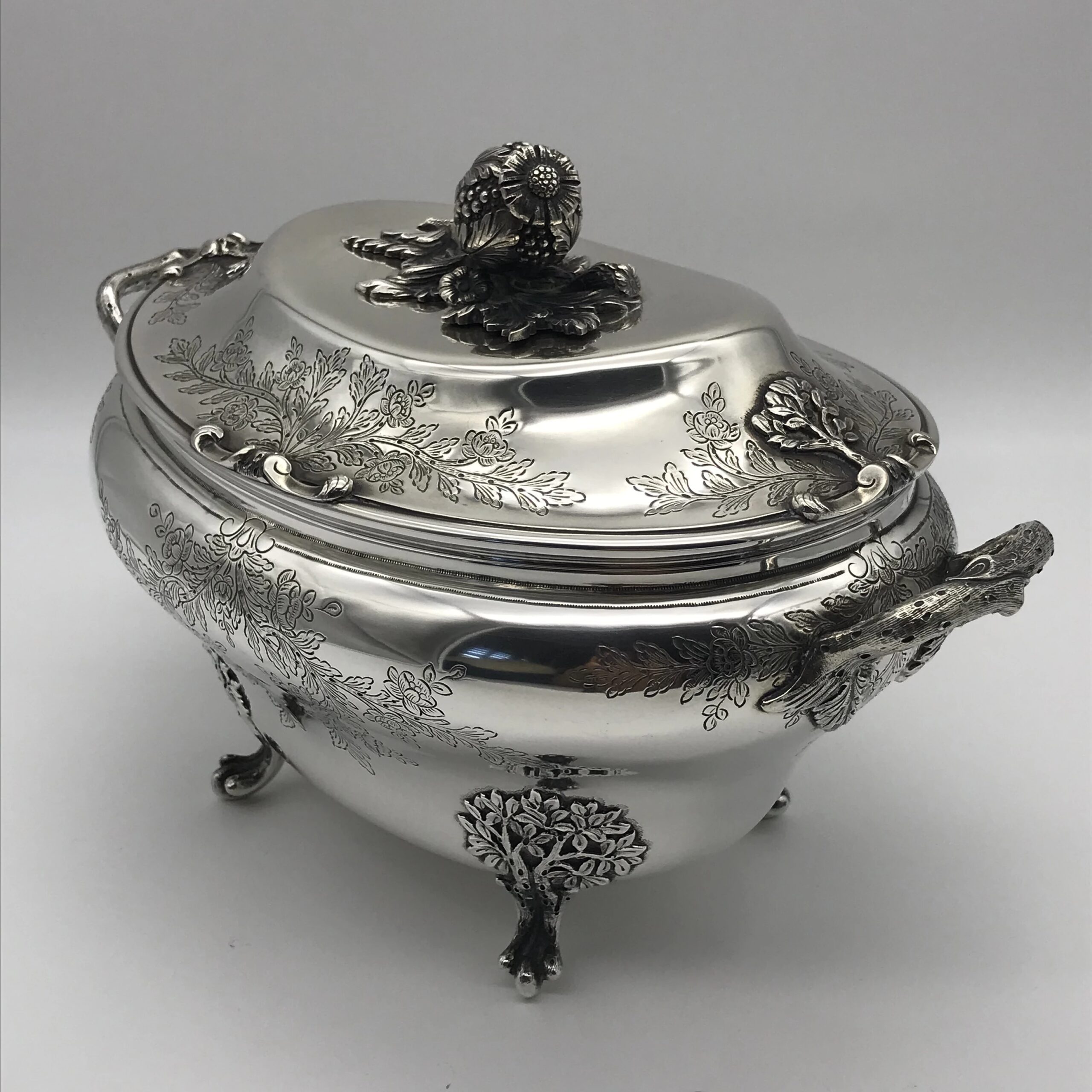This very impressive, large, oval shaped silver soup tureen by ‘Sarmento’ – the renowned Portuguese jewellers and silversmiths -  sits on four ball and claw feet in the form of small trees and the handles on either side are in the form of natural branches with lovely detail. The oval stand has similar detailing of small trees on either side and the cover is decorated with a wonderful pomegranate finial. The cover, tureen and border of the stand are all beautifully chased or engraved with a scrolling leaf design. They all have the Portuguese hallmarks ‘SARAMENTO LISBOA 916’ and are all in excellent condition. The tureen measures 28cm in length (handle to handle), 17cm in width and 19cm in height and the oval stand measures 33cm x 25cm. It weighs 2656grams in total.