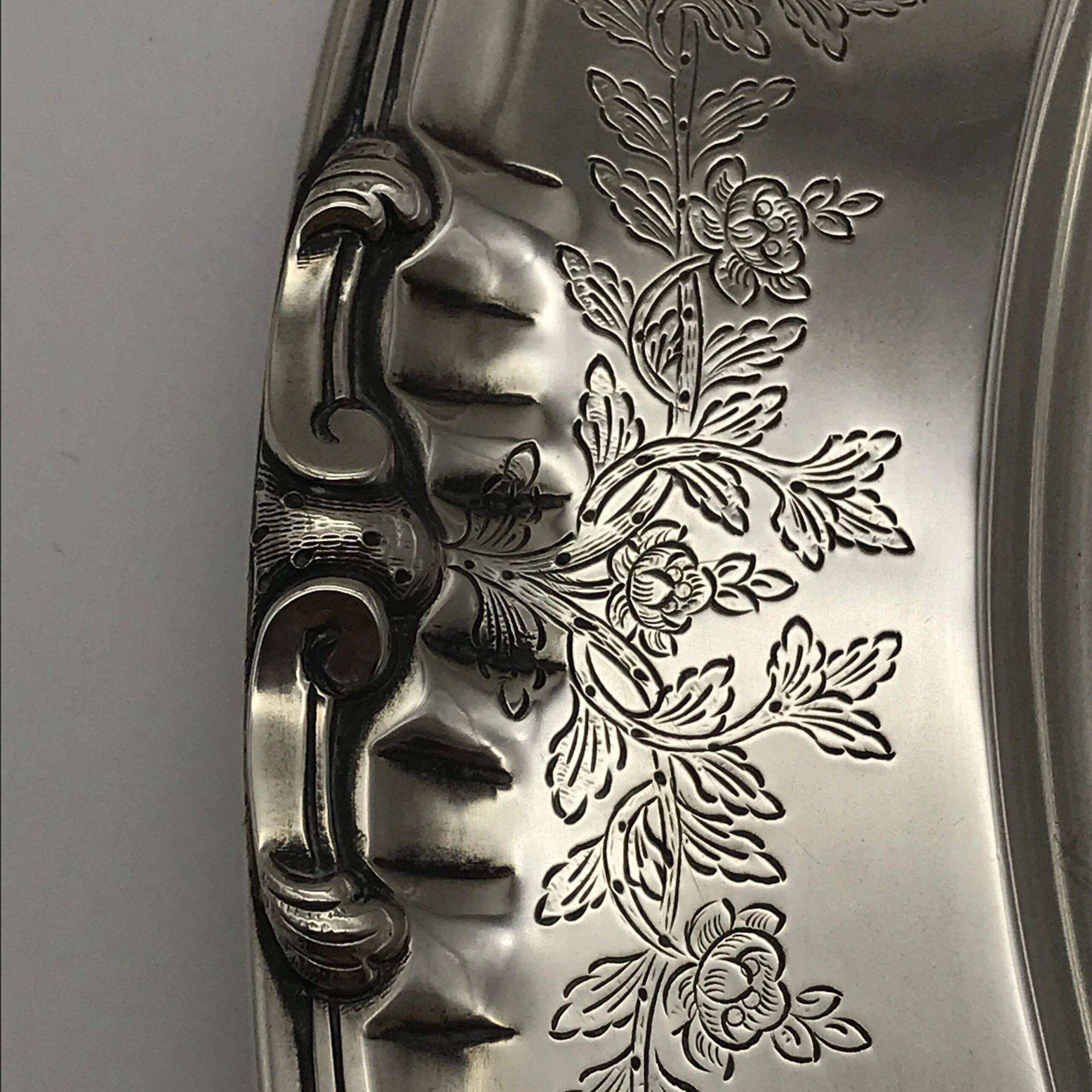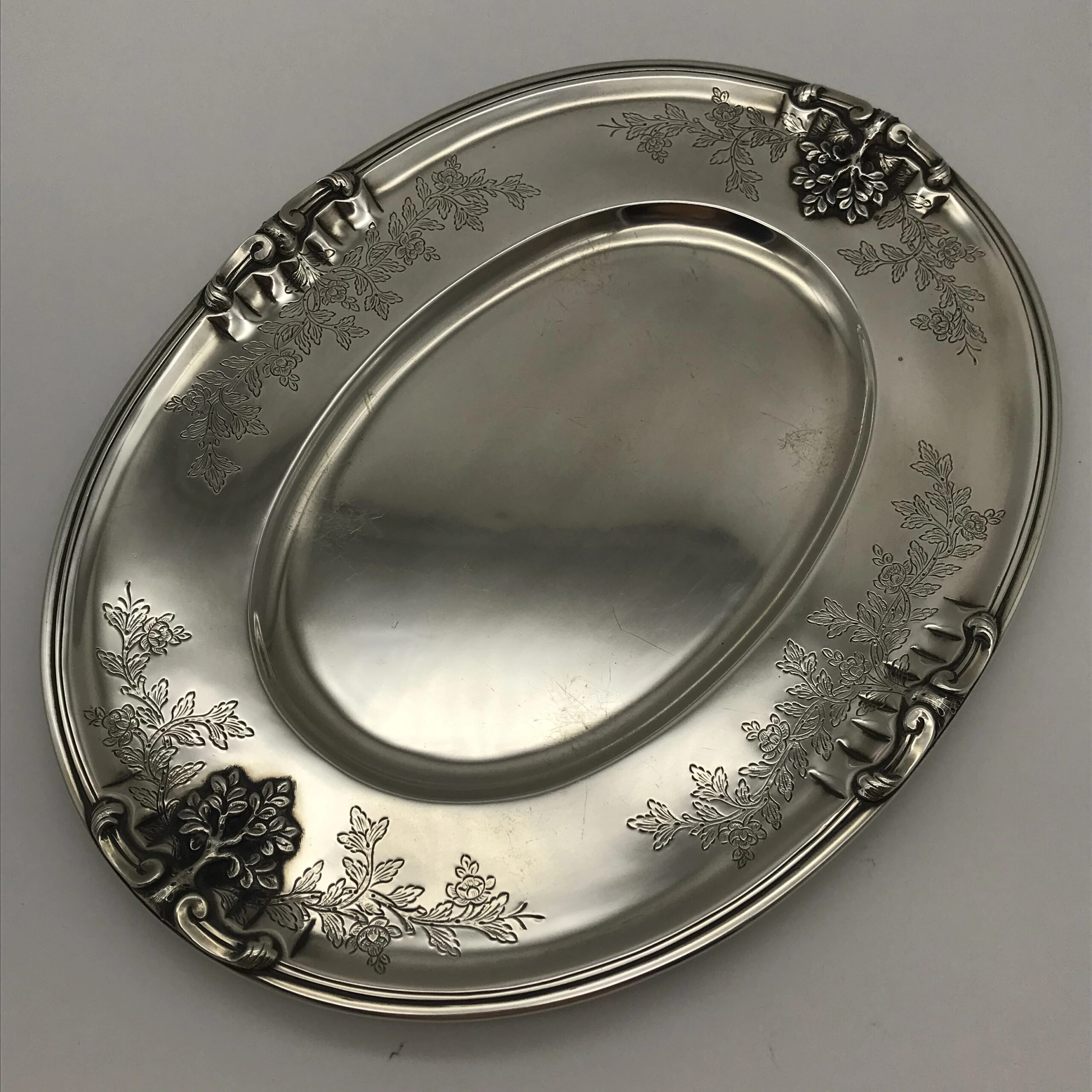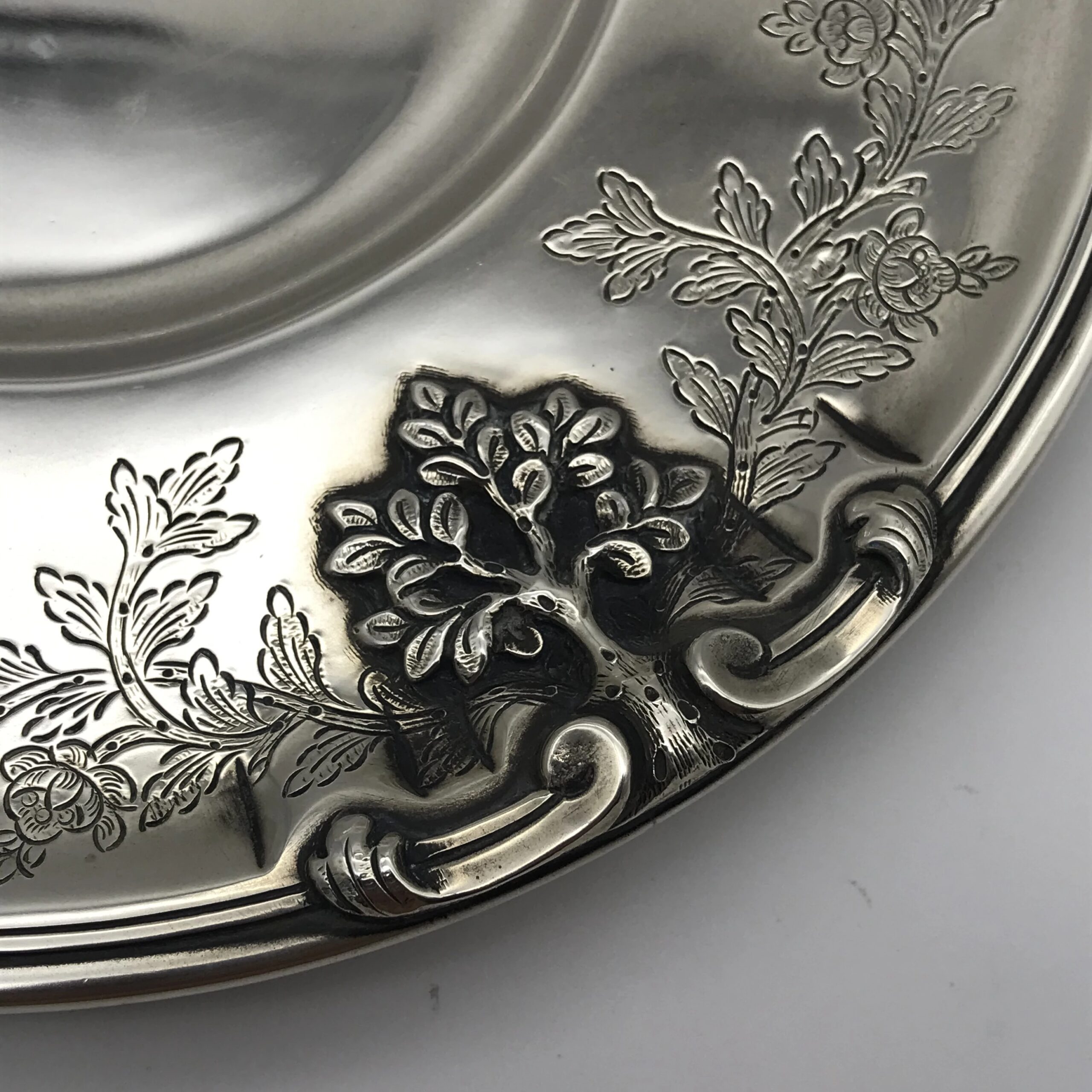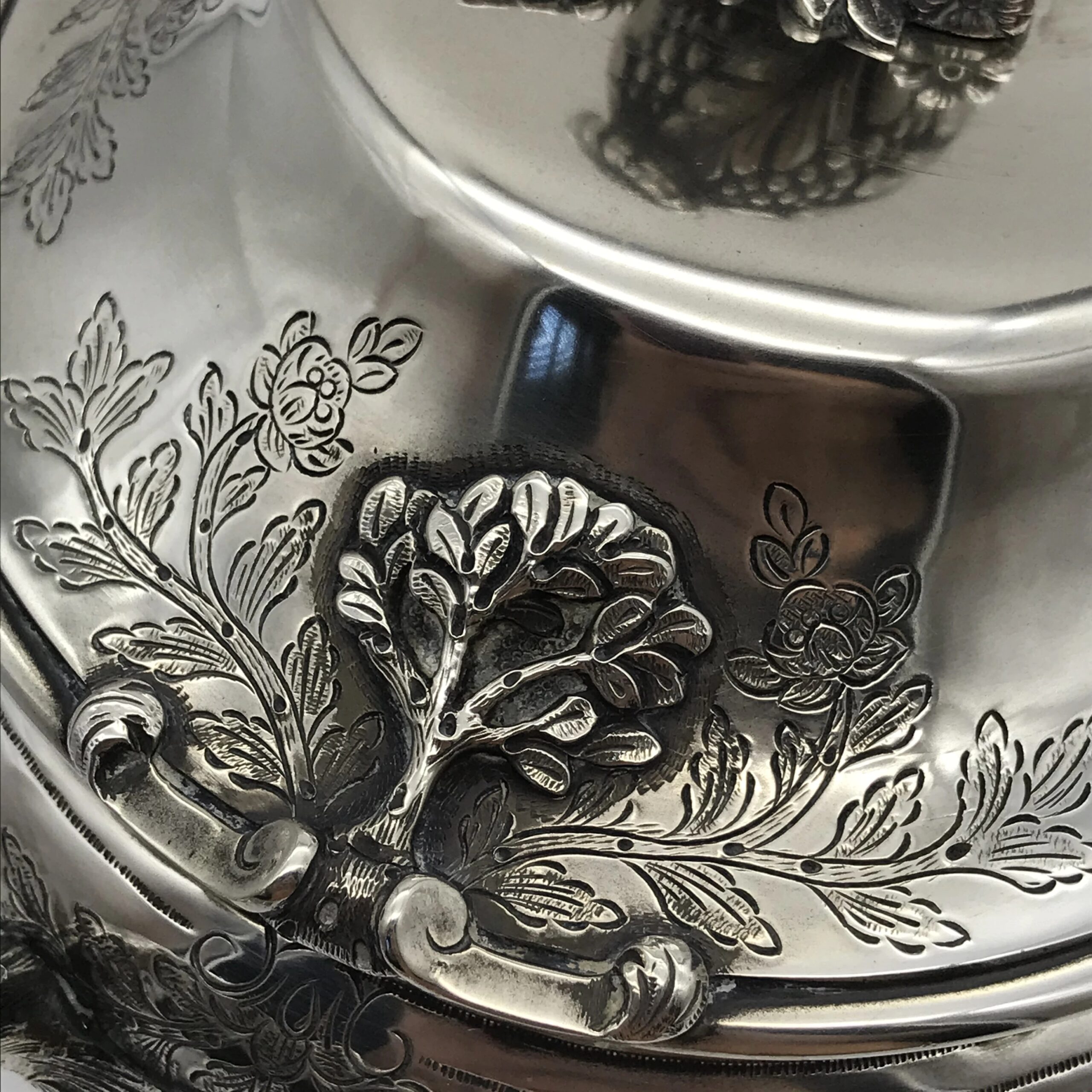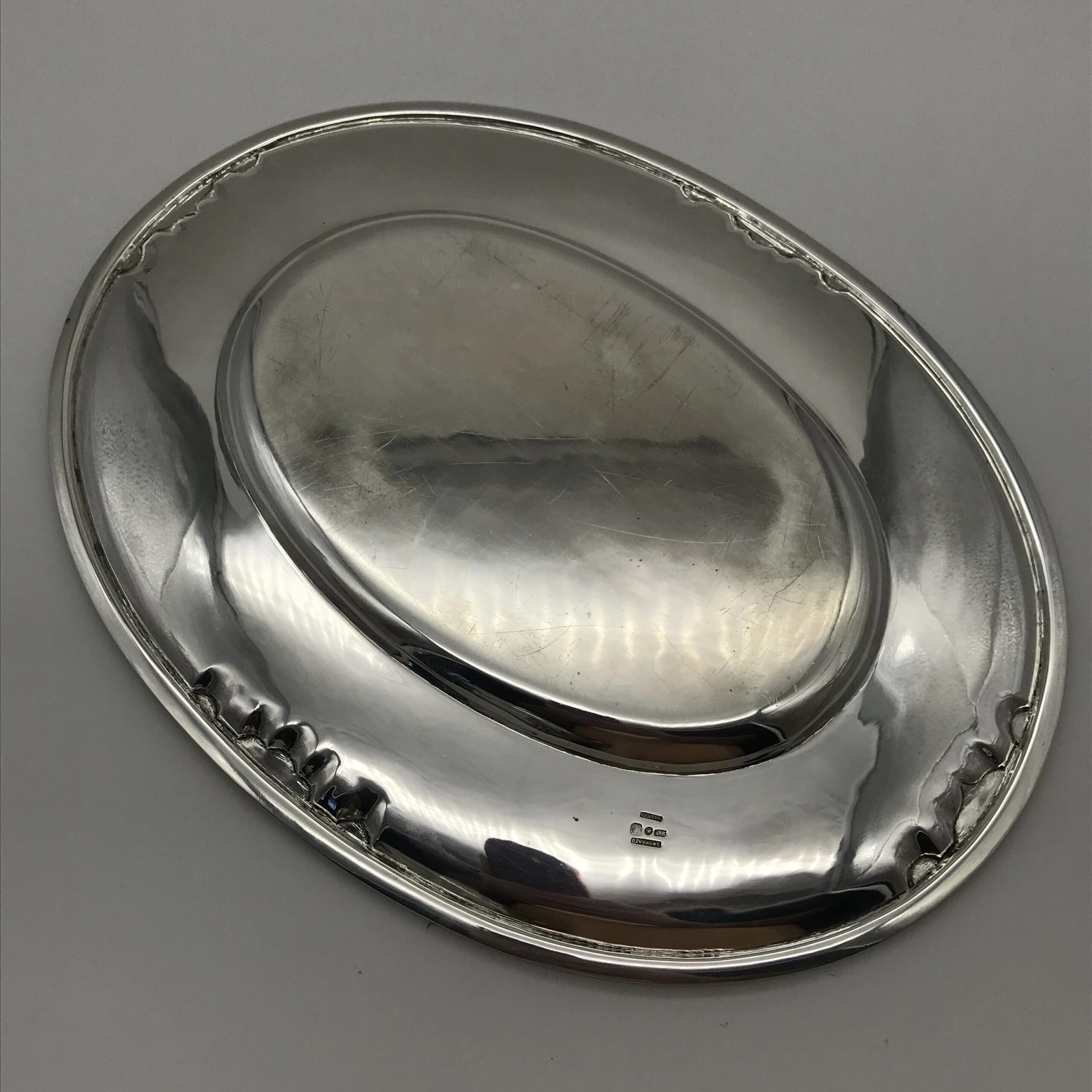This very impressive, large, oval shaped silver soup tureen by ‘Sarmento’ – the renowned Portuguese jewellers and silversmiths -  sits on four ball and claw feet in the form of small trees and the handles on either side are in the form of natural branches with lovely detail. The oval stand has similar detailing of small trees on either side and the cover is decorated with a wonderful pomegranate finial. The cover, tureen and border of the stand are all beautifully chased or engraved with a scrolling leaf design. They all have the Portuguese hallmarks ‘SARAMENTO LISBOA 916’ and are all in excellent condition. The tureen measures 28cm in length (handle to handle), 17cm in width and 19cm in height and the oval stand measures 33cm x 25cm. It weighs 2656grams in total.