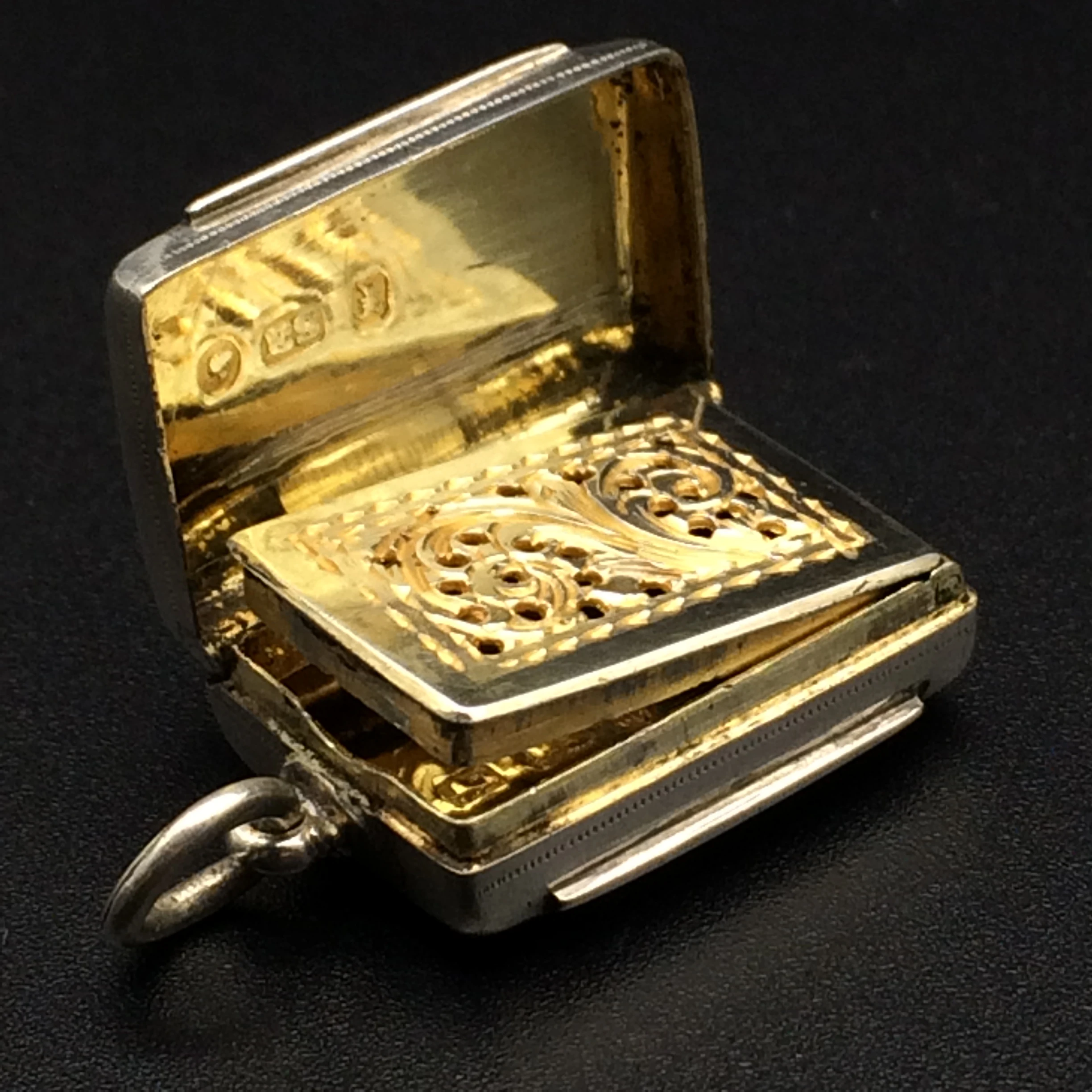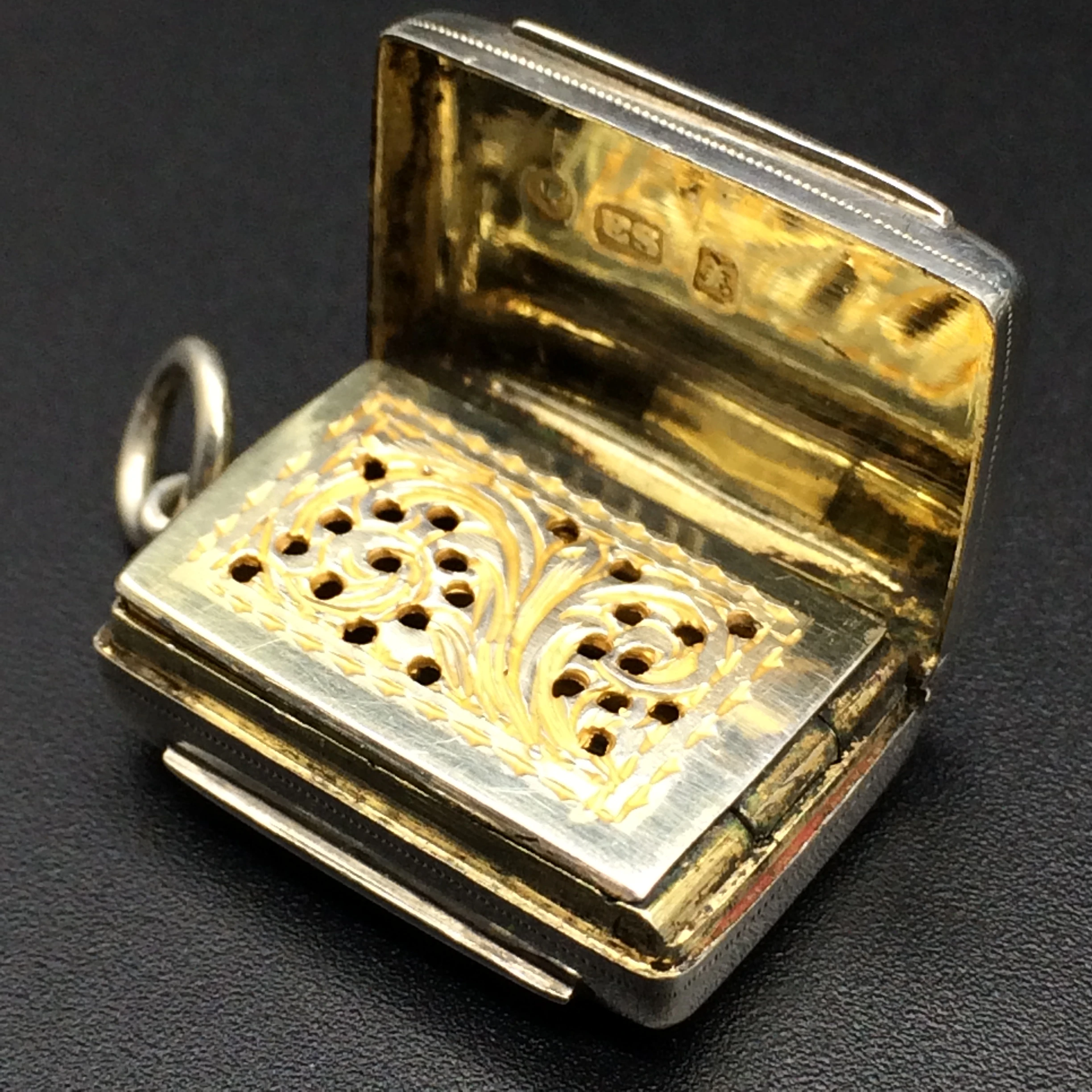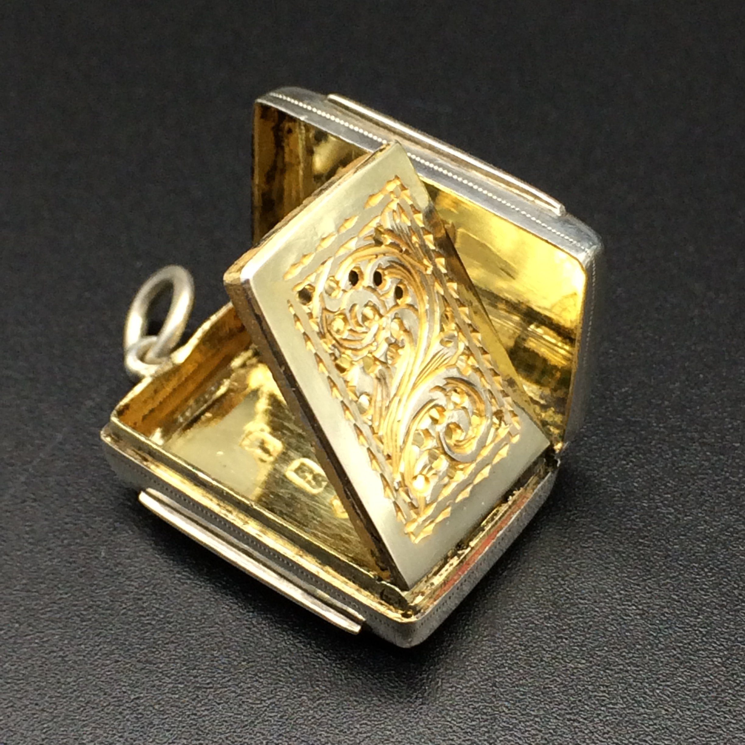 This small, early Victorian vinaigrette, with its original gilt interior, is in superb condition. The pierced grill opens and closes well with a good hinge. It is English hallmarked for Birmingham 1846 and stamped ‘E.S.’ for ‘EDWARD SMITH.’ It measures 2cm x 1.5cm x 0.7cm.