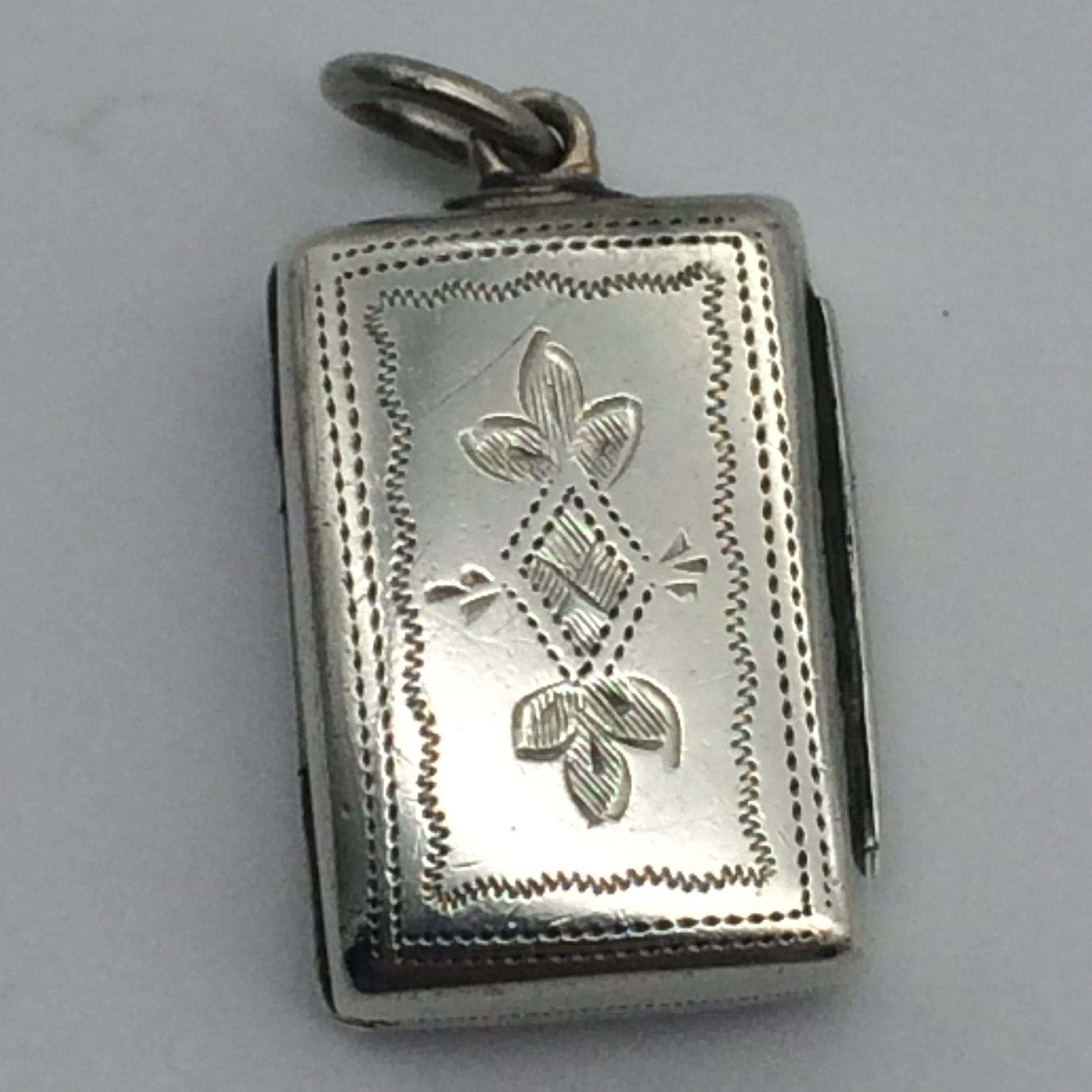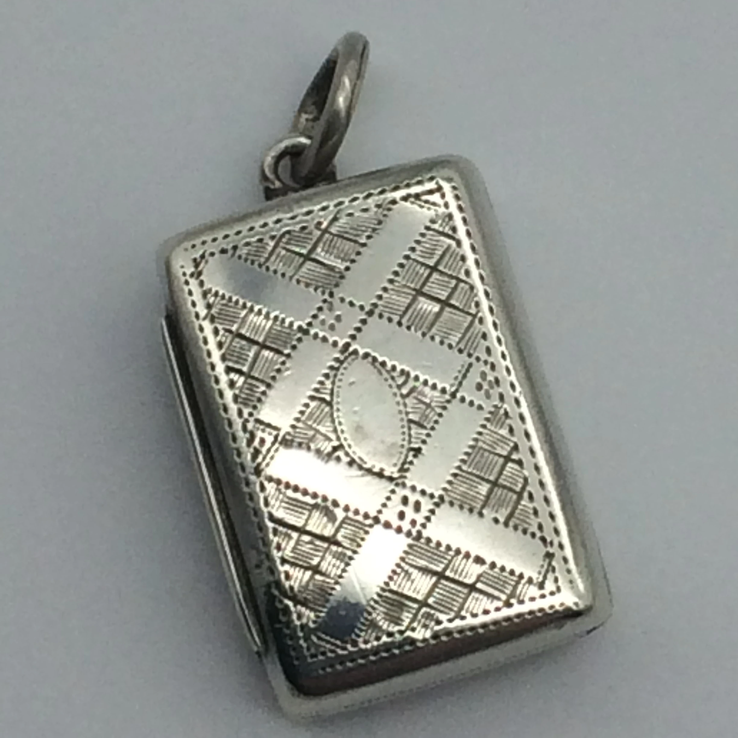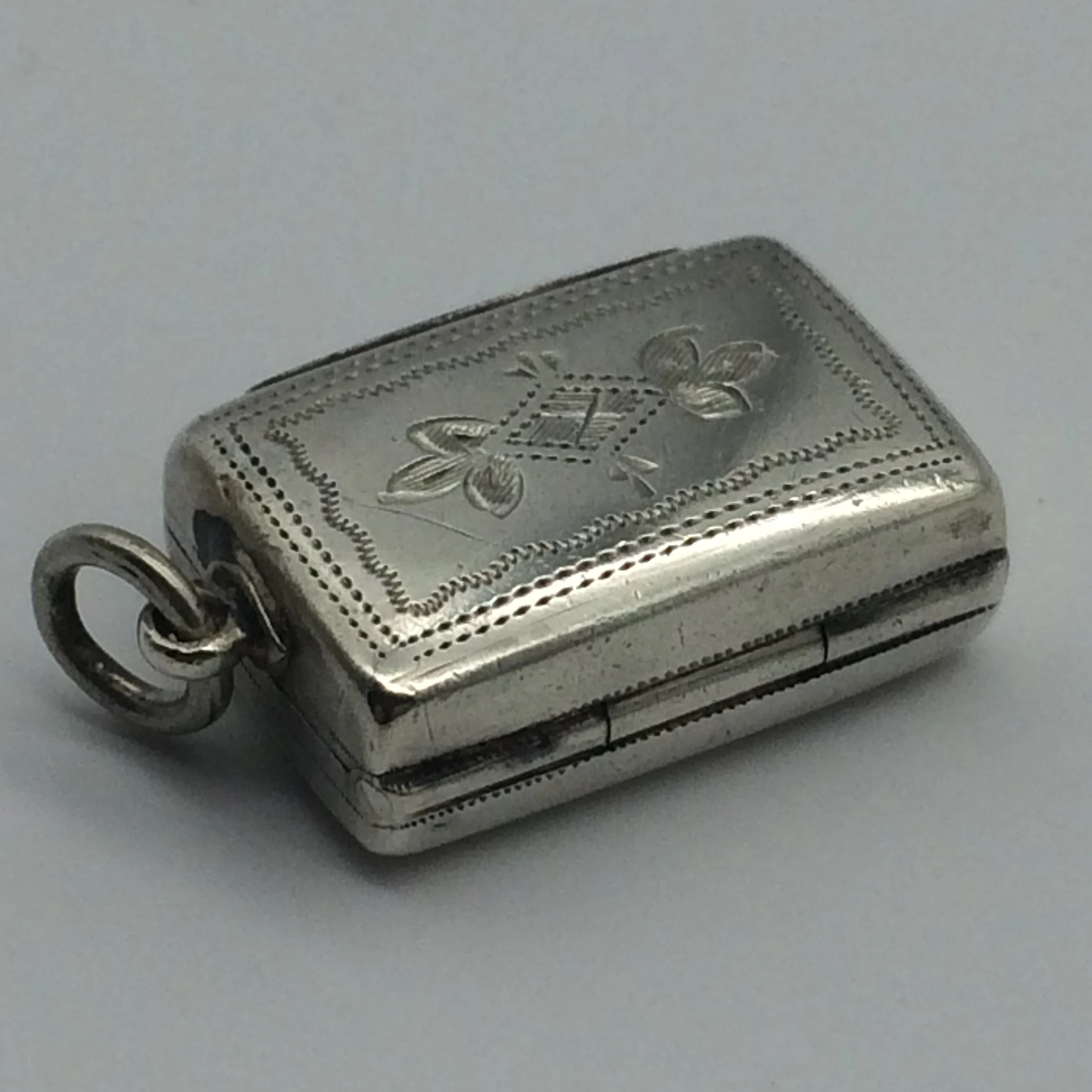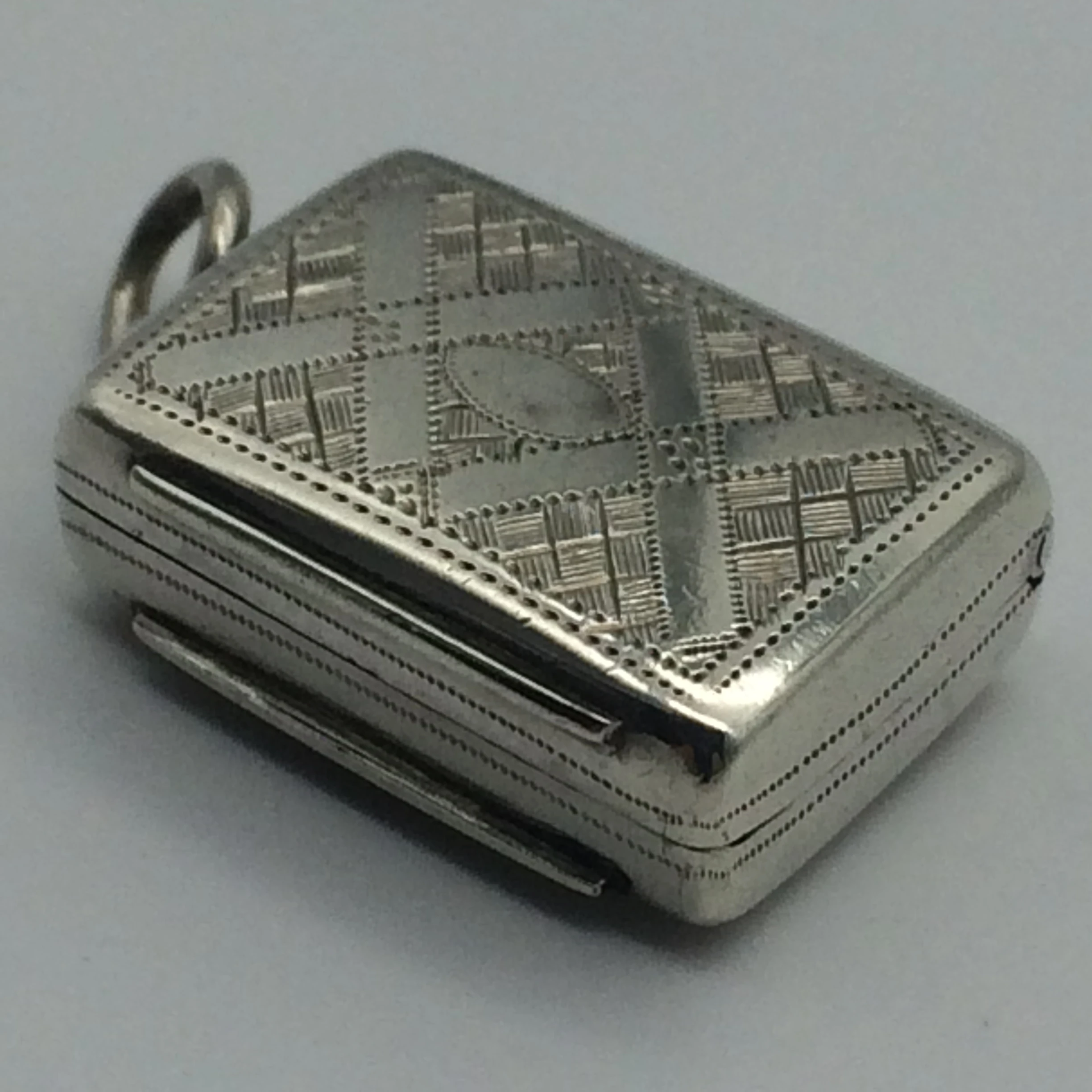 This small, early Victorian vinaigrette, with its original gilt interior, is in superb condition. The pierced grill opens and closes well with a good hinge. It is English hallmarked for Birmingham 1846 and stamped ‘E.S.’ for ‘EDWARD SMITH.’ It measures 2cm x 1.5cm x 0.7cm.