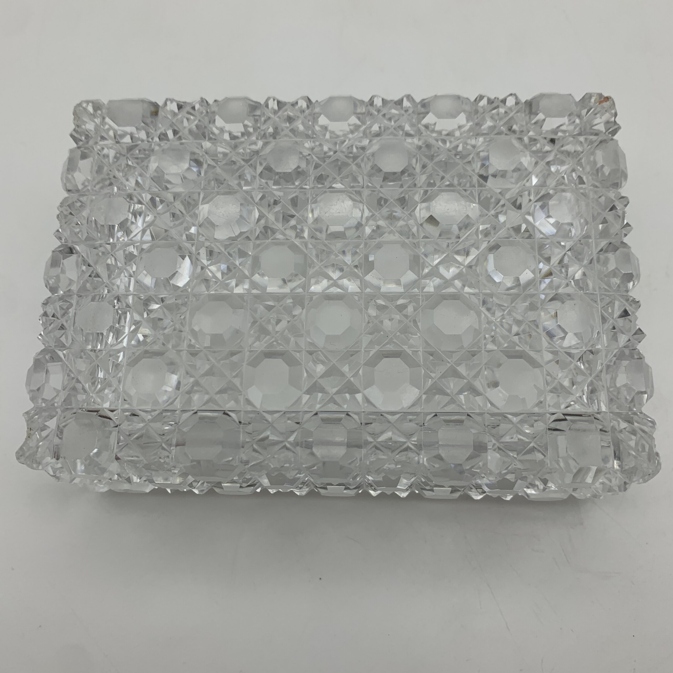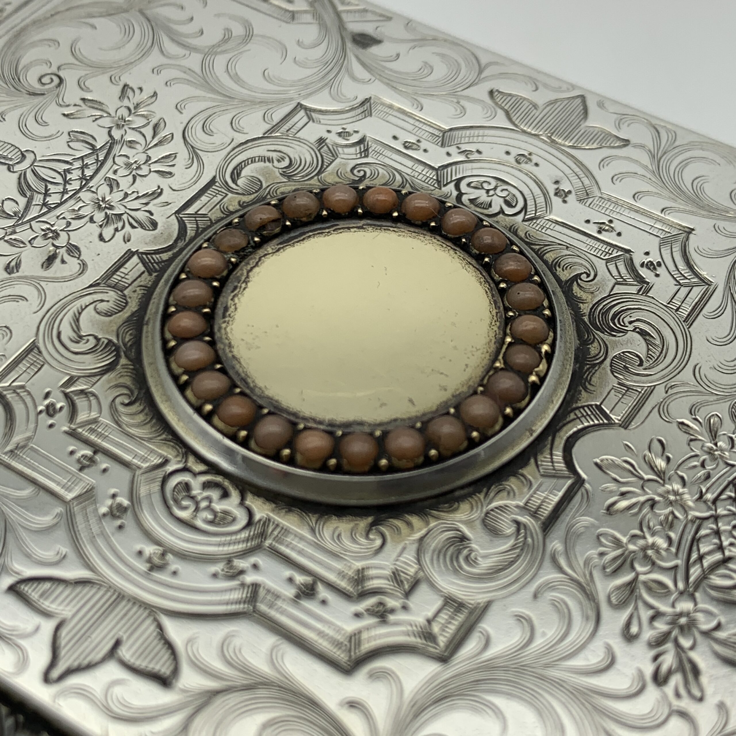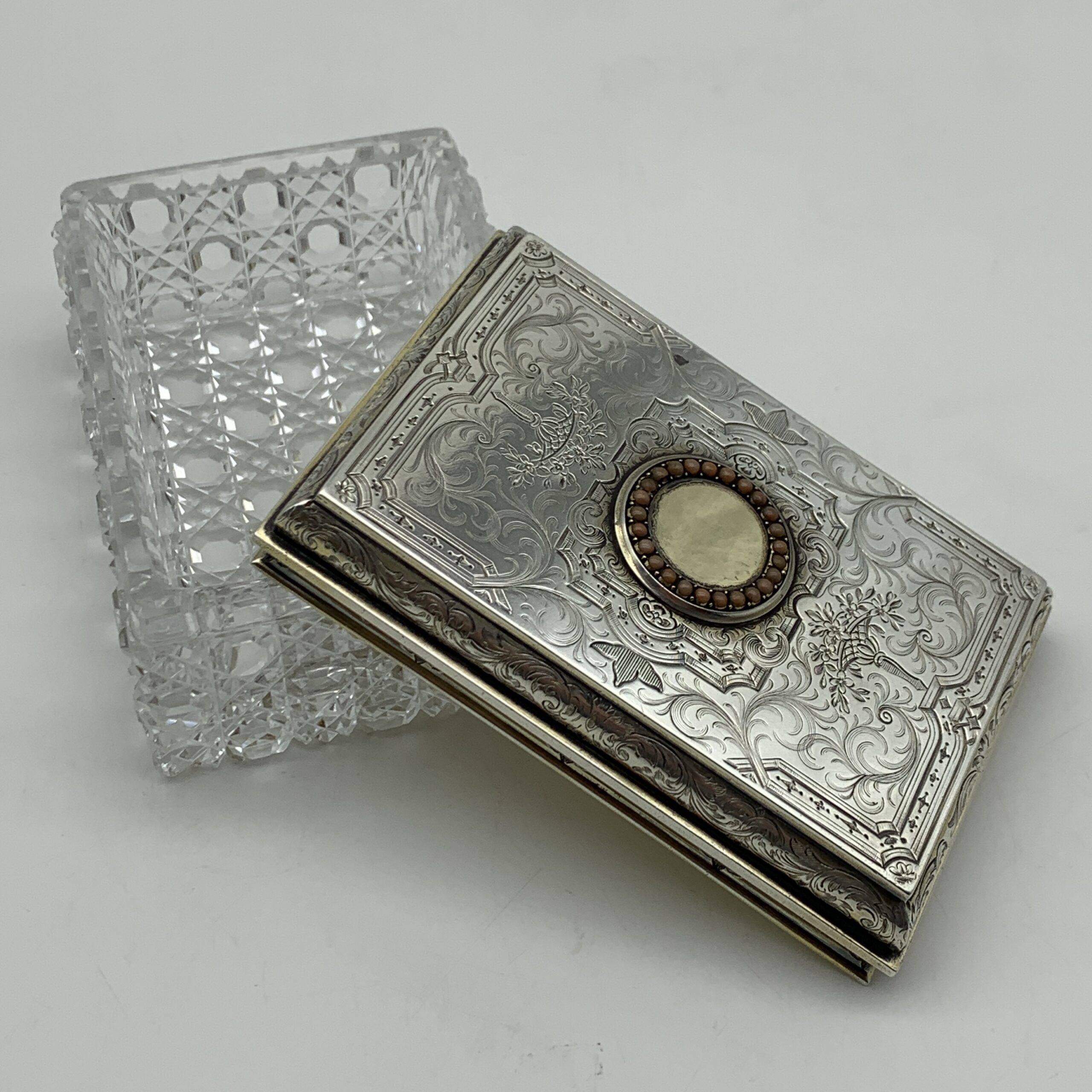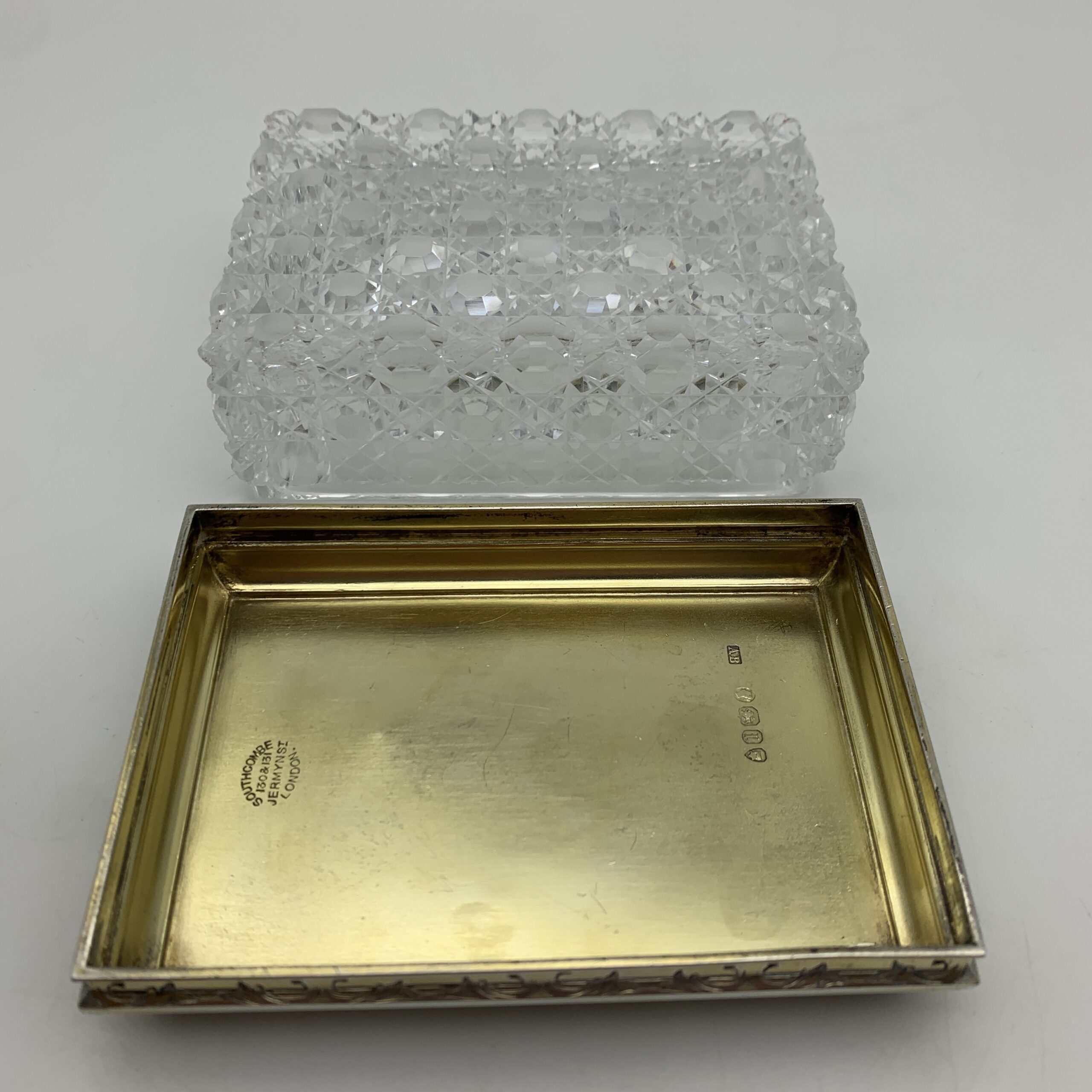 This fabulous, wonderful quality, Victorian, solid silver lidded cut-crystal vanity box has been exceptionally well-made and beautifully decorated. It features an amazing lid made in a thick, heavy gauge of silver with a vacant, round gilded cartouche in the centre bordered with a row of coral beads. The top and sides of the cover are engraved in lovely detail with posies of flowers, geometric patterns, and acanthus leaf detail, and is clearly hallmarked underneath. It was made in 1866 by ‘Abraham Brownett’ (AB), a London based silversmith known for his fine quality work and is also stamped with the original retailer’s mark ‘SOUTHCOMBE’ ‘130 & 131 Jermyn ST. London’. The lovely, rectangular crystal box is deeply hand-cut on the base and around the sides in the popular ‘hobnail’ pattern. This fabulous piece is in excellent condition with its original gilding and snug fitting lid. It measures 10,8cm x 7,5cm, stands 5cm high and weighs 474g, (The silver lid weighs a heavy 131g).