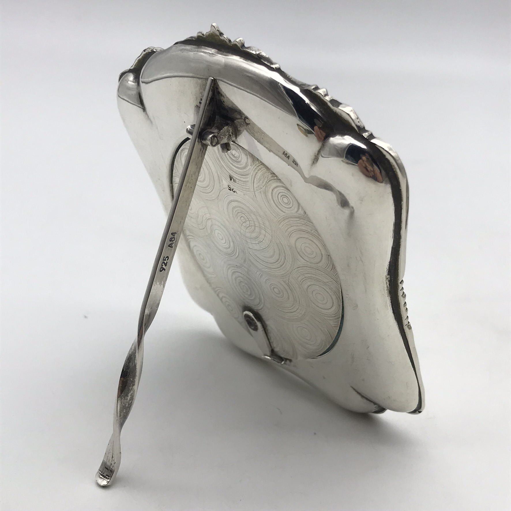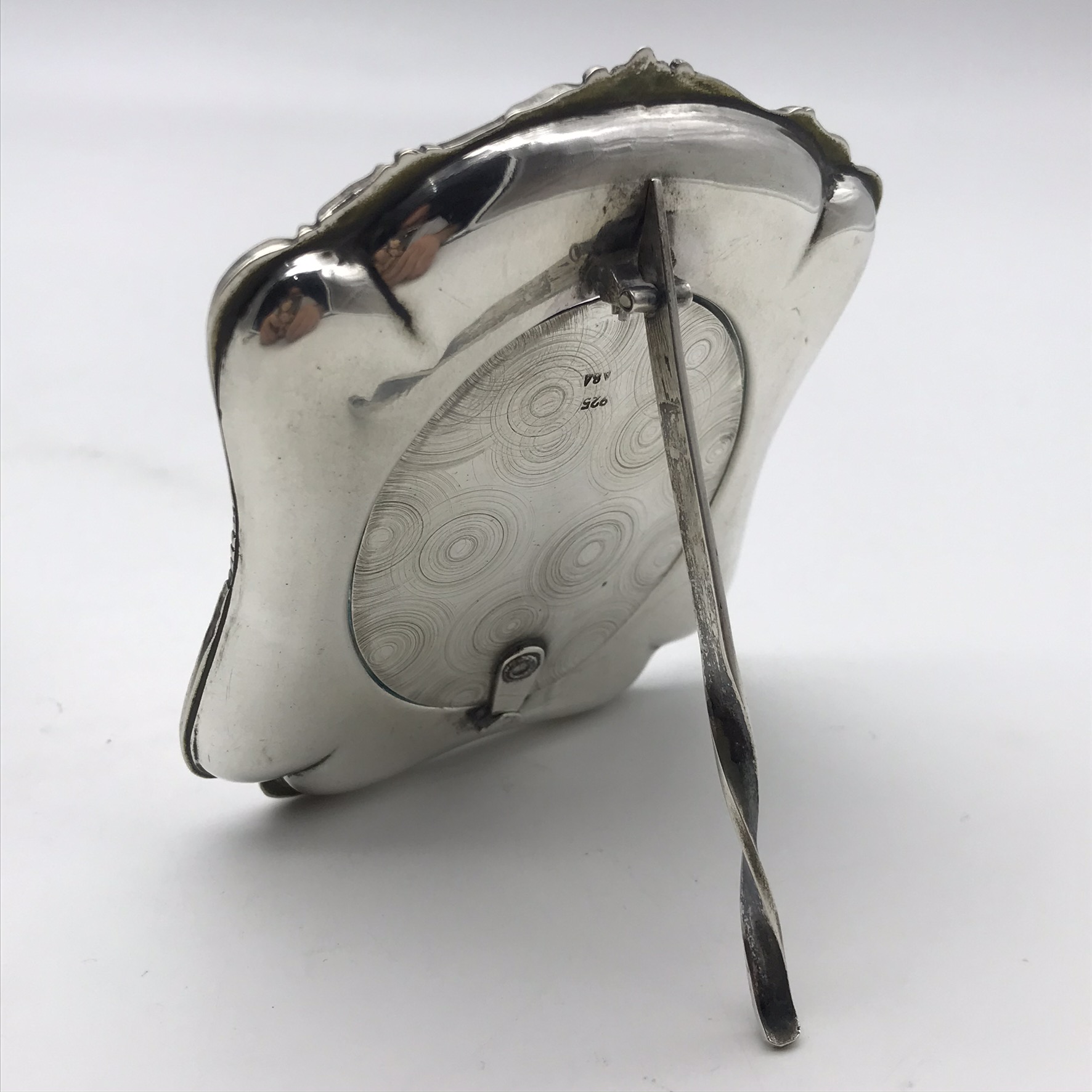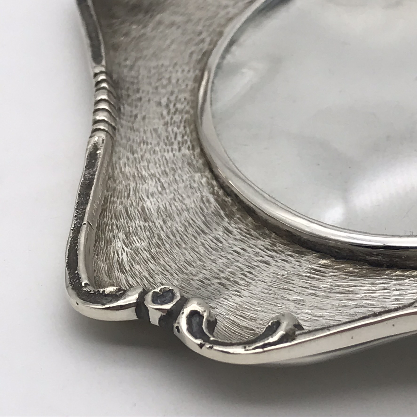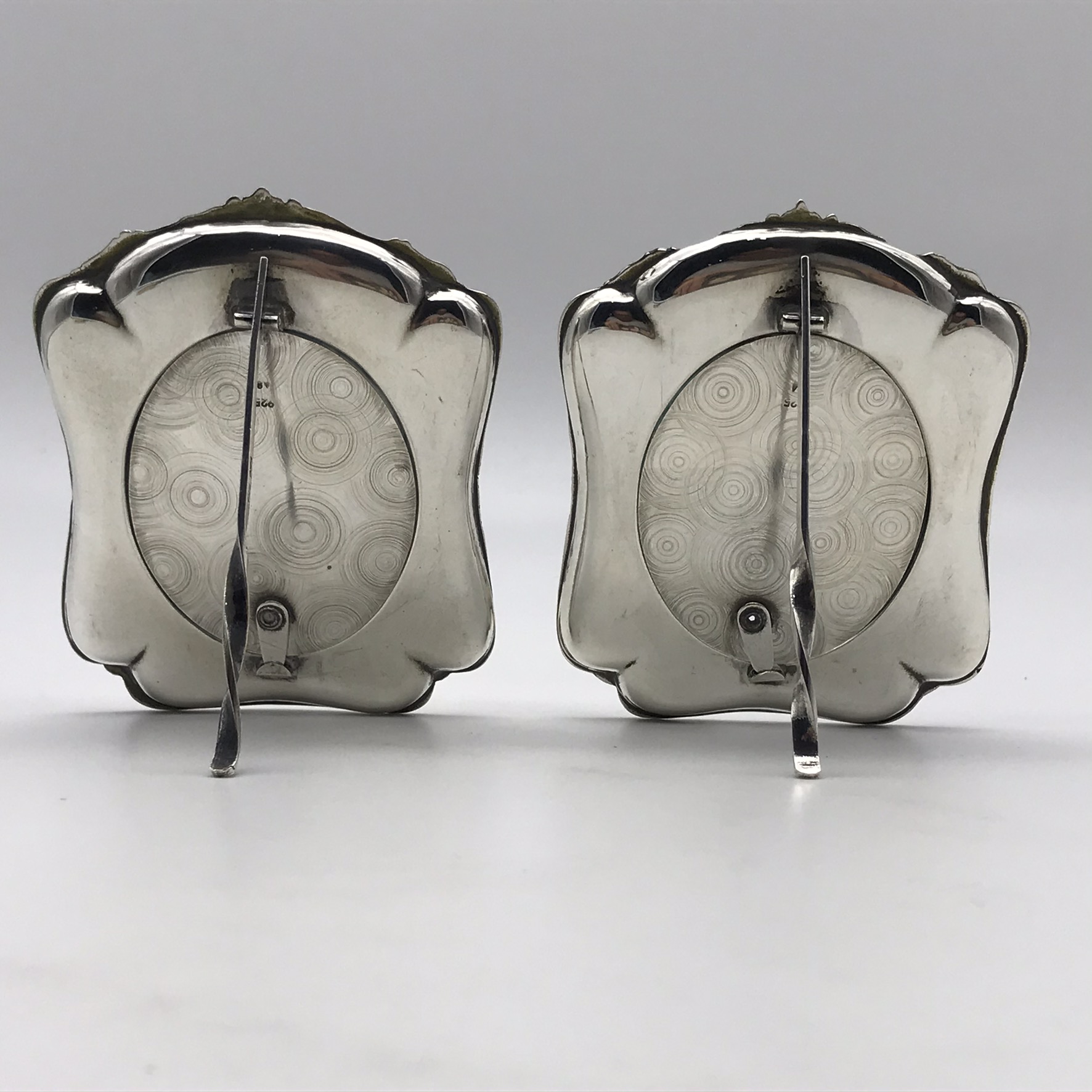 This fabulous, fine quality pair of antique, matching sterling silver photo frames from the early 1900’s are in excellent condition and have a wonderful unique concave and convex shape. The silver frames are concave shaped with a grainy matt looking pattern, with ornate scroll work borders, and the oval glass inserts are convex in shape. The small solid silver photo frames are easel backed and are stamped ‘925’ and ‘A84’ on the backing plate as well as the easel legs. They each stand 9,7cm high, with a width of 8cm and a combined weight of 110g.