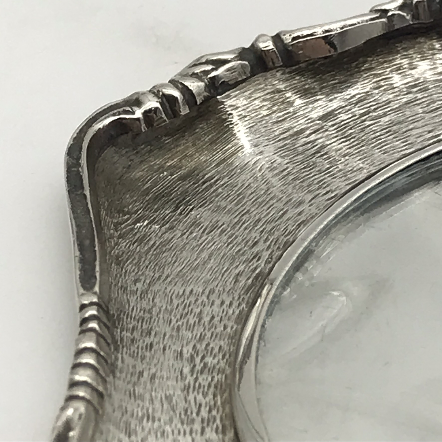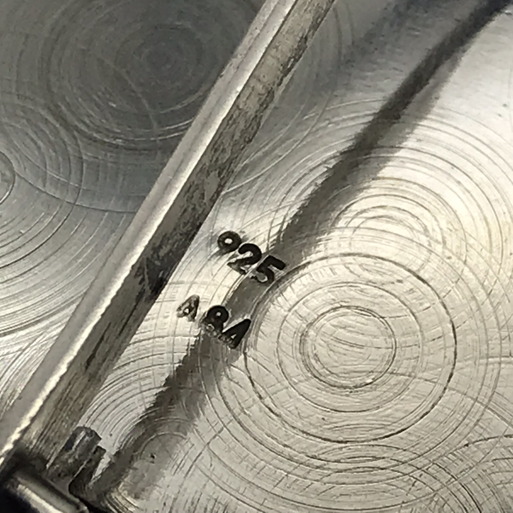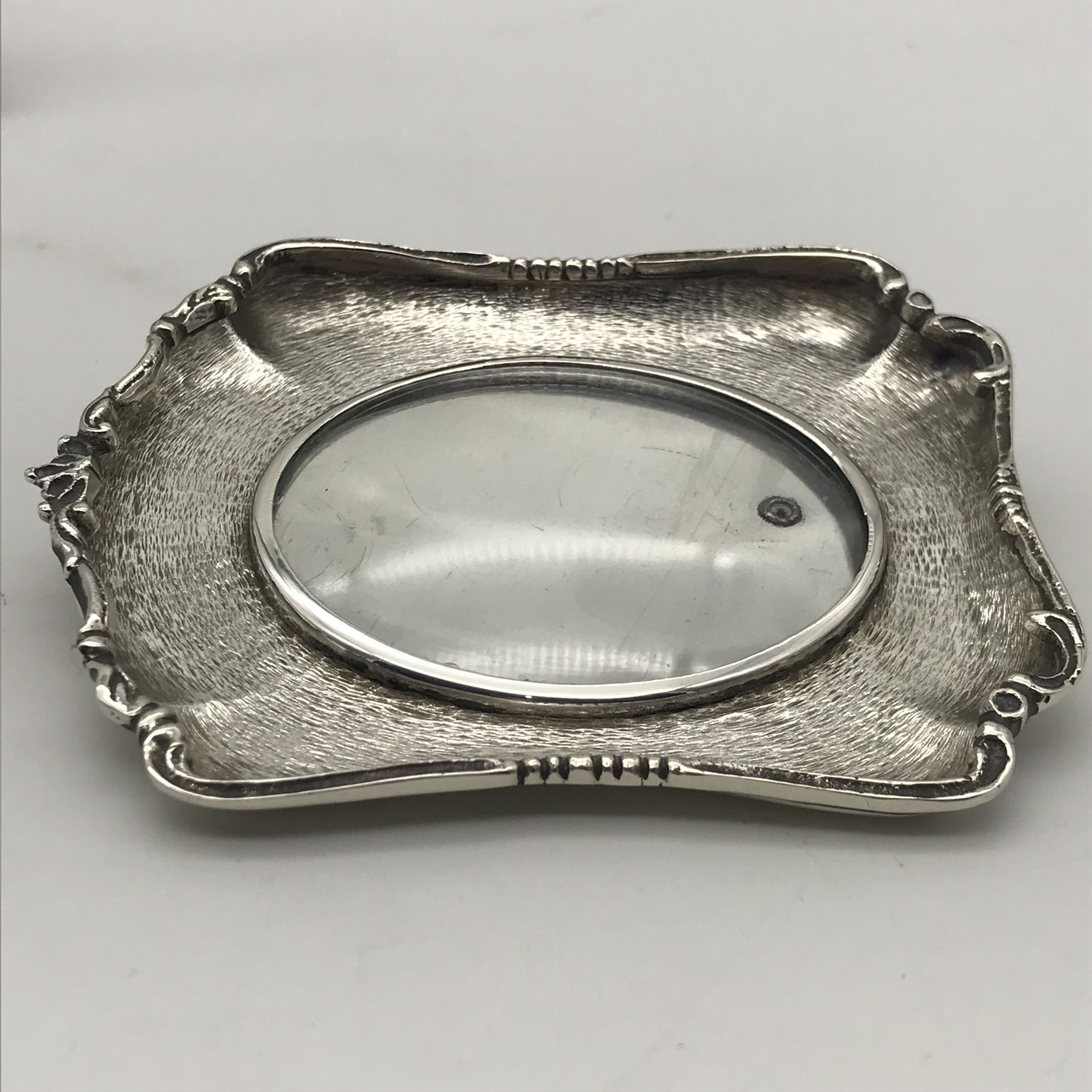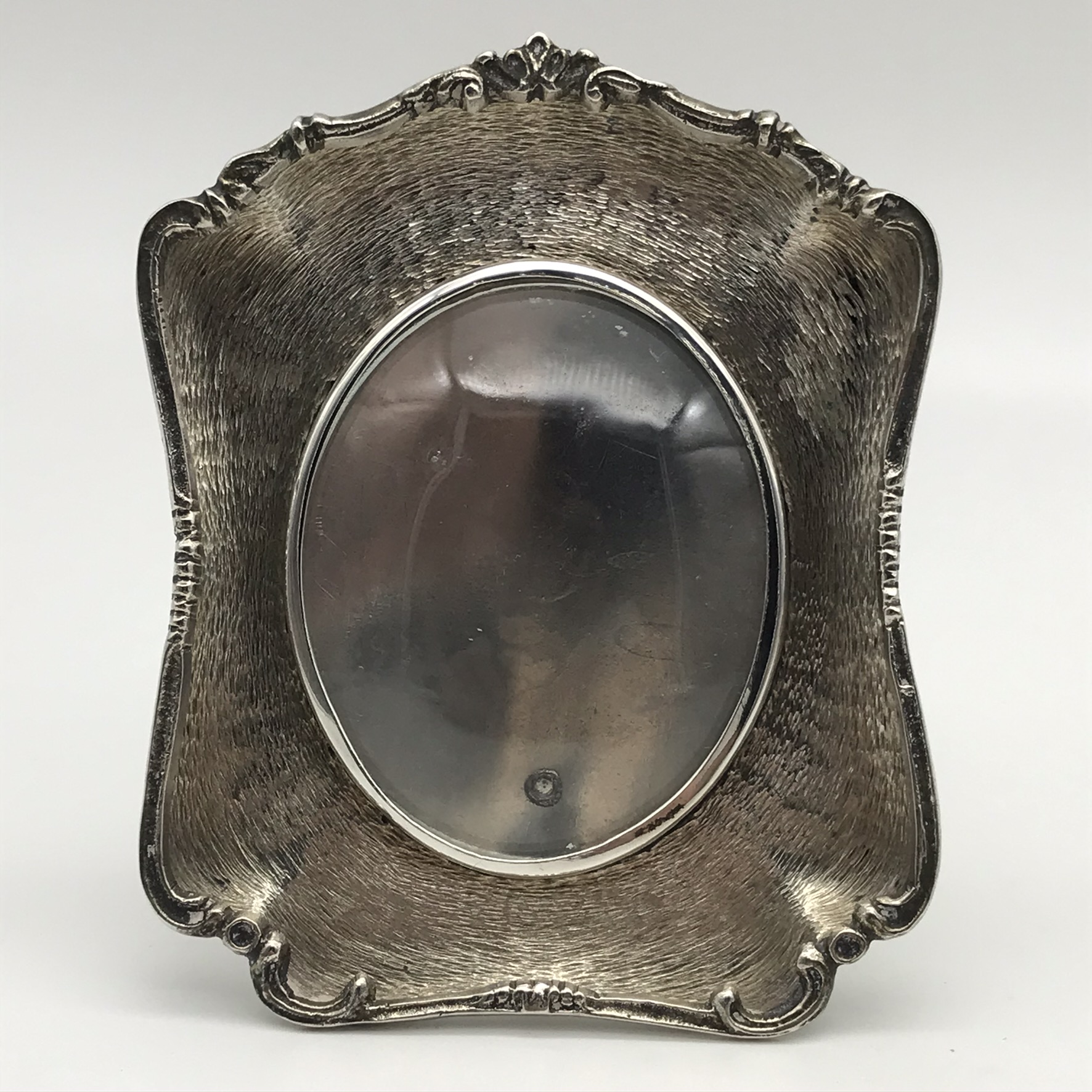 This fabulous, fine quality pair of antique, matching sterling silver photo frames from the early 1900’s are in excellent condition and have a wonderful unique concave and convex shape. The silver frames are concave shaped with a grainy matt looking pattern, with ornate scroll work borders, and the oval glass inserts are convex in shape. The small solid silver photo frames are easel backed and are stamped ‘925’ and ‘A84’ on the backing plate as well as the easel legs. They each stand 9,7cm high, with a width of 8cm and a combined weight of 110g.