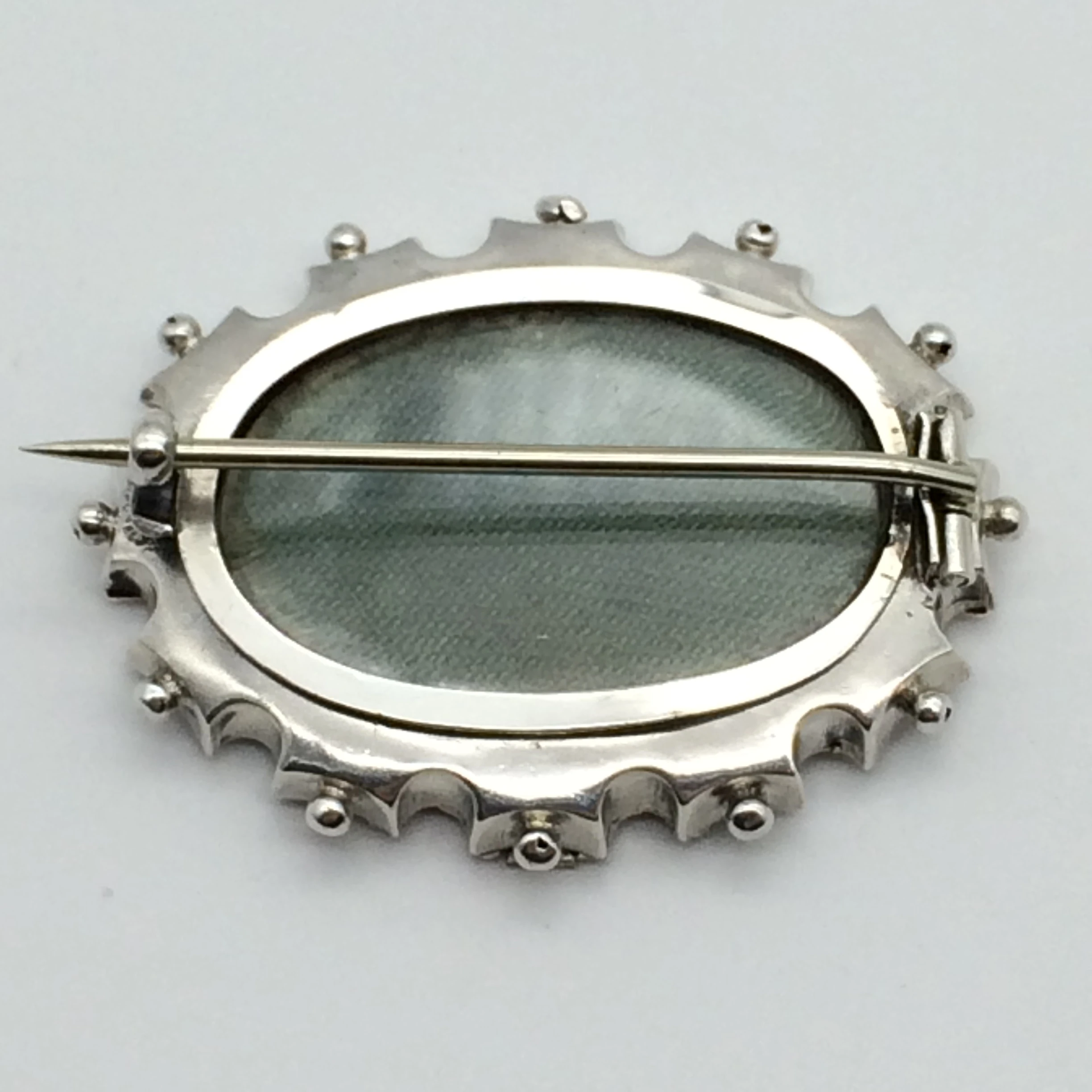 This very attractive antique silver and gold locket brooch from the 1880/90’s is oval in shape with a wonderful design. It has a beaded edge with rose gold, engraved decorations in the middle and on the ends. The back has a framed glass insert which fits firmly and the pin works well. There are no hallmarks, but it has been tested as sterling silver and 9ct gold. It measures 4.2cm x 3.2cm and weighs 13g.