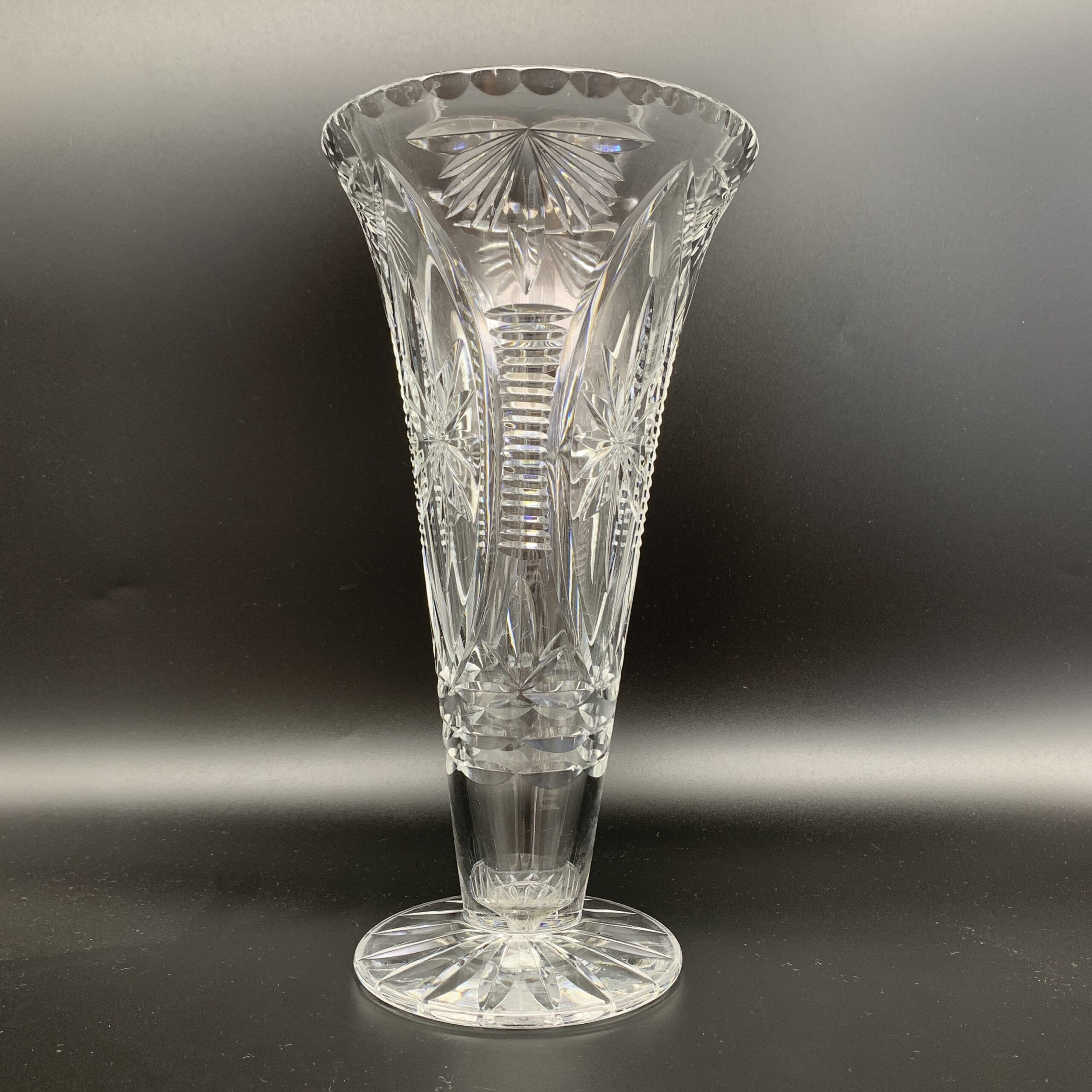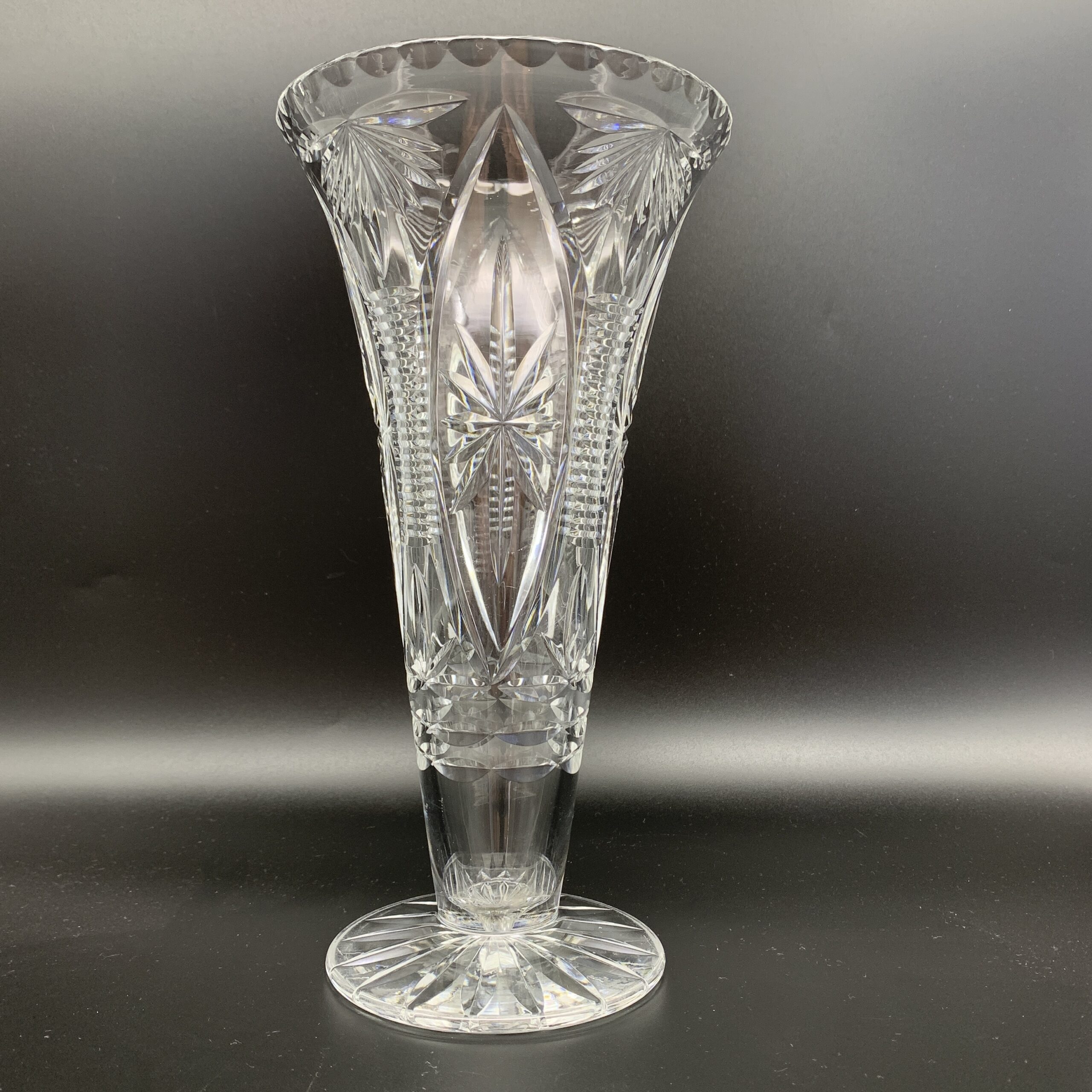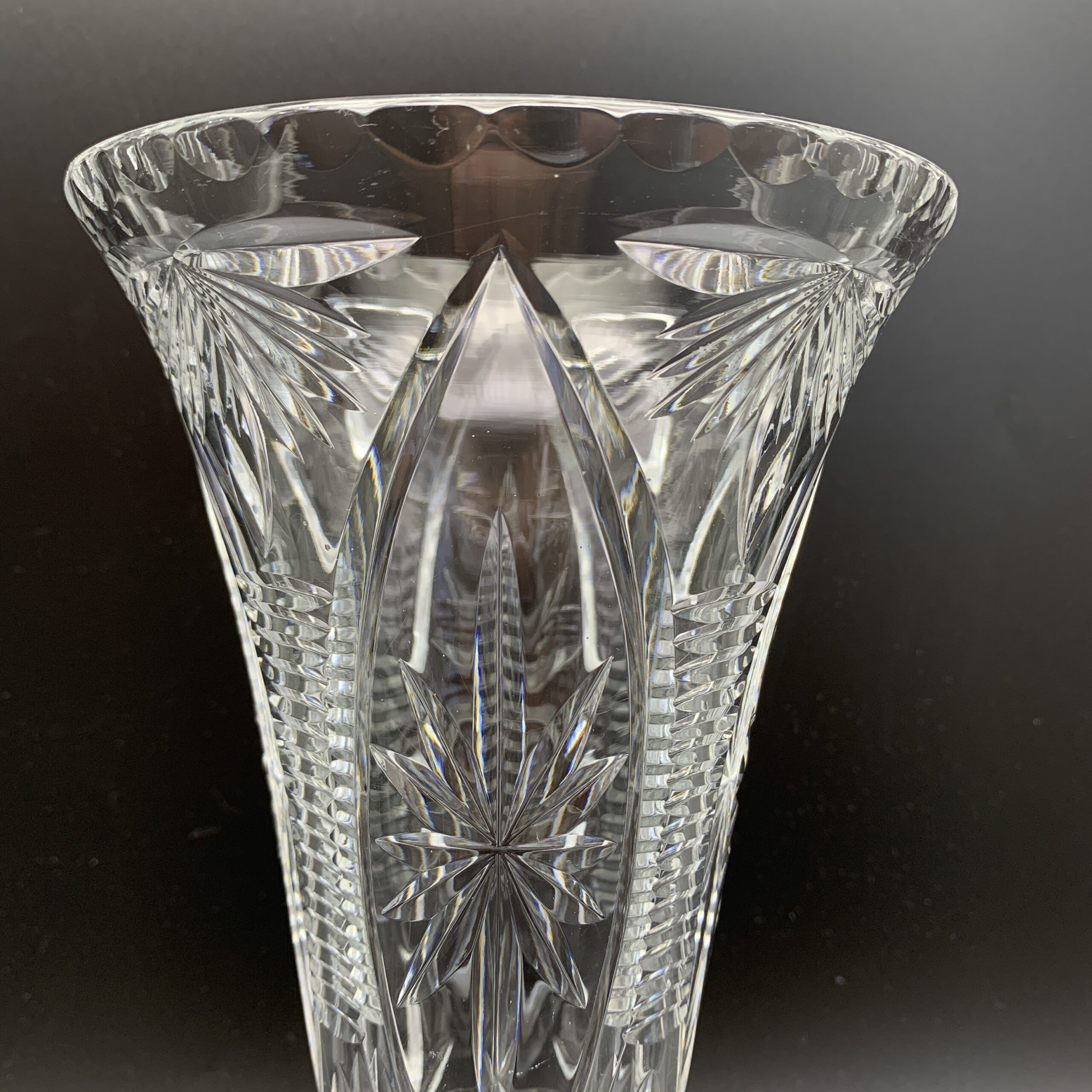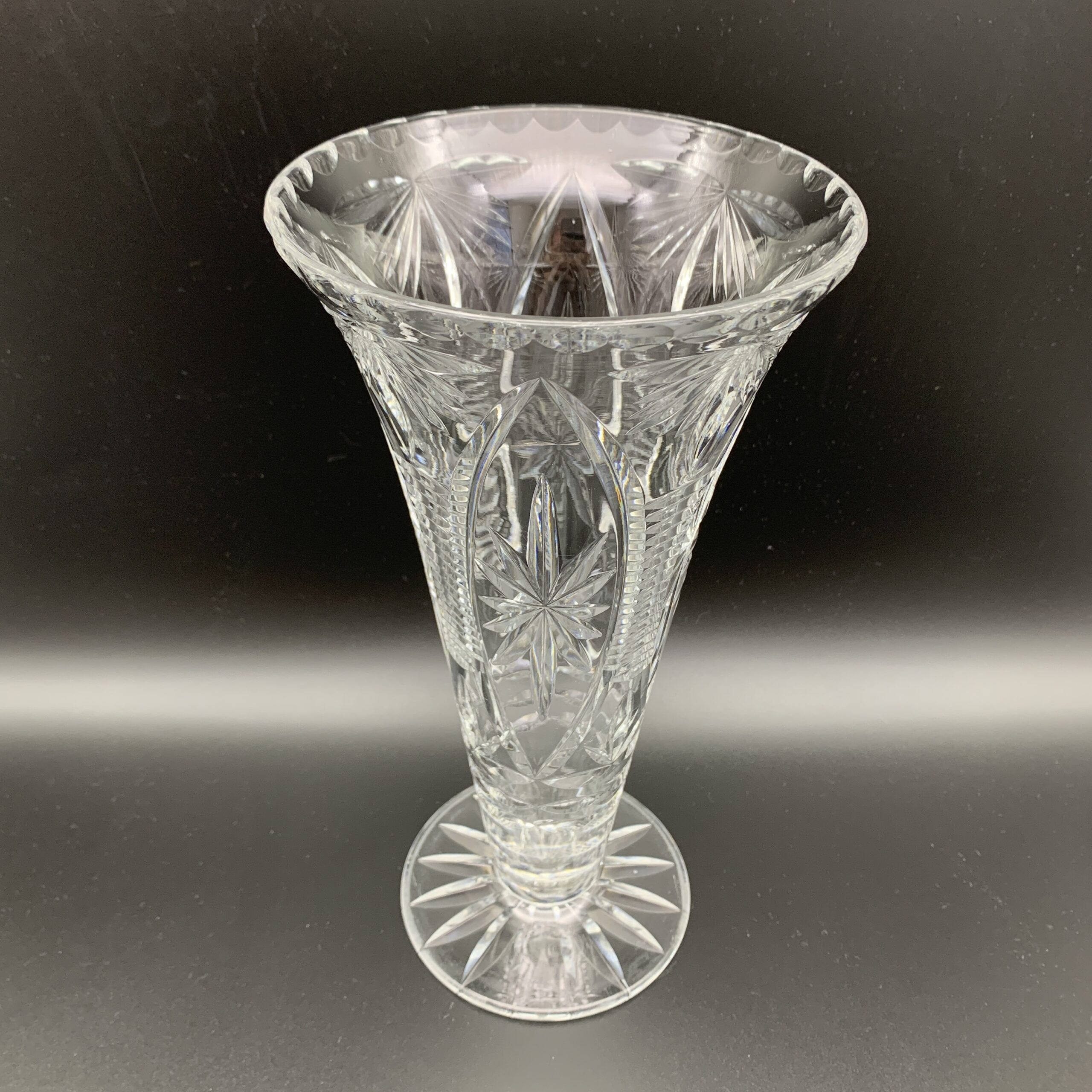 This very good quality, tall trumpet shaped crystal vase from the 1940/50’s, was manufactured by the well-known ‘Webb Corbett’ crystal factory in England. It is intricately hand-cut in various pretty patterns that reflect the light beautifully and it stands on a round star-cut base. This attractive tall vase is in superb condition, is crystal clear with a nice weight and has the acid etched ‘Webb Corbett’ mark on the base. It stands 25,5cm high, has a top diameter of 13,7cm, with a base diameter of 10cm and weighs 1,04kg.