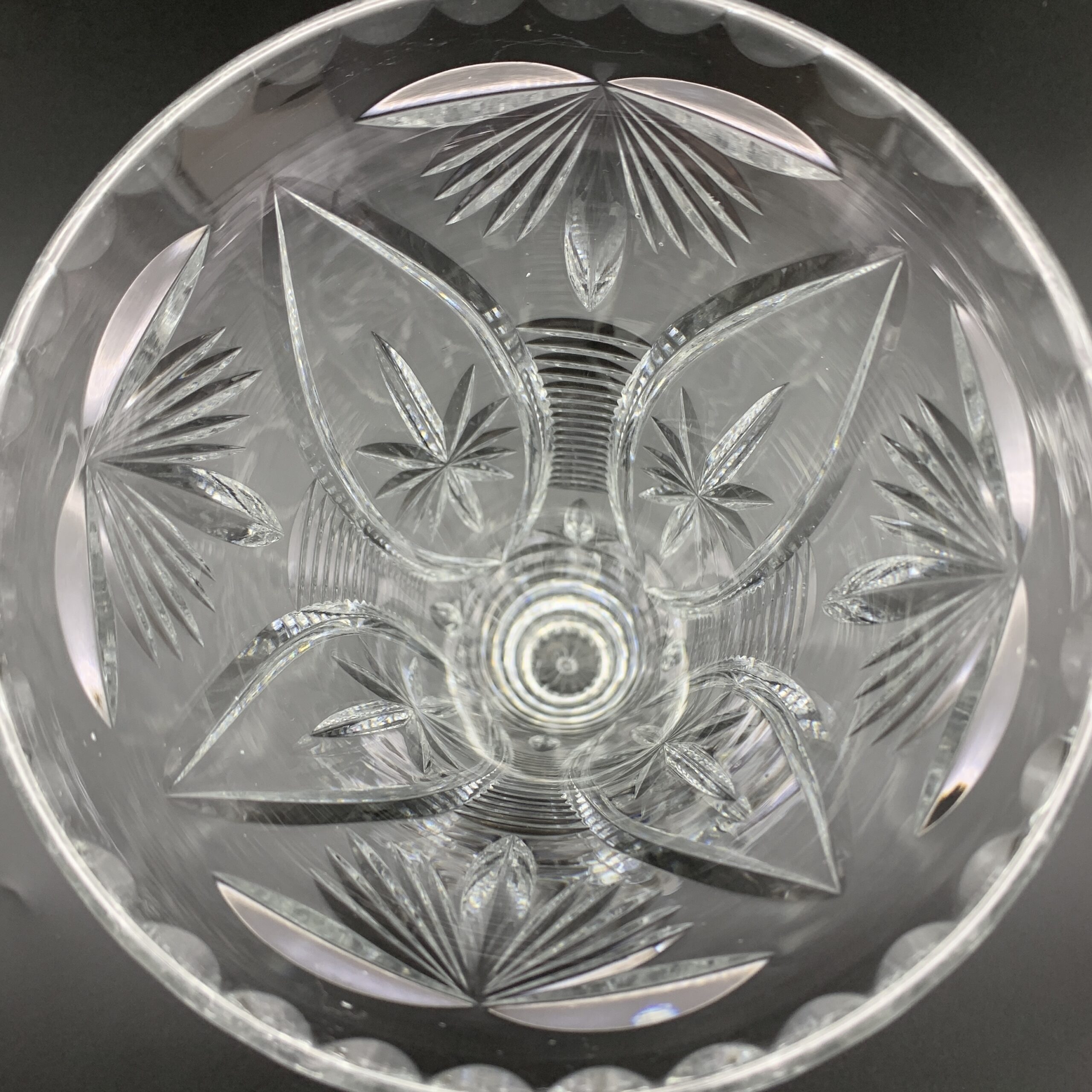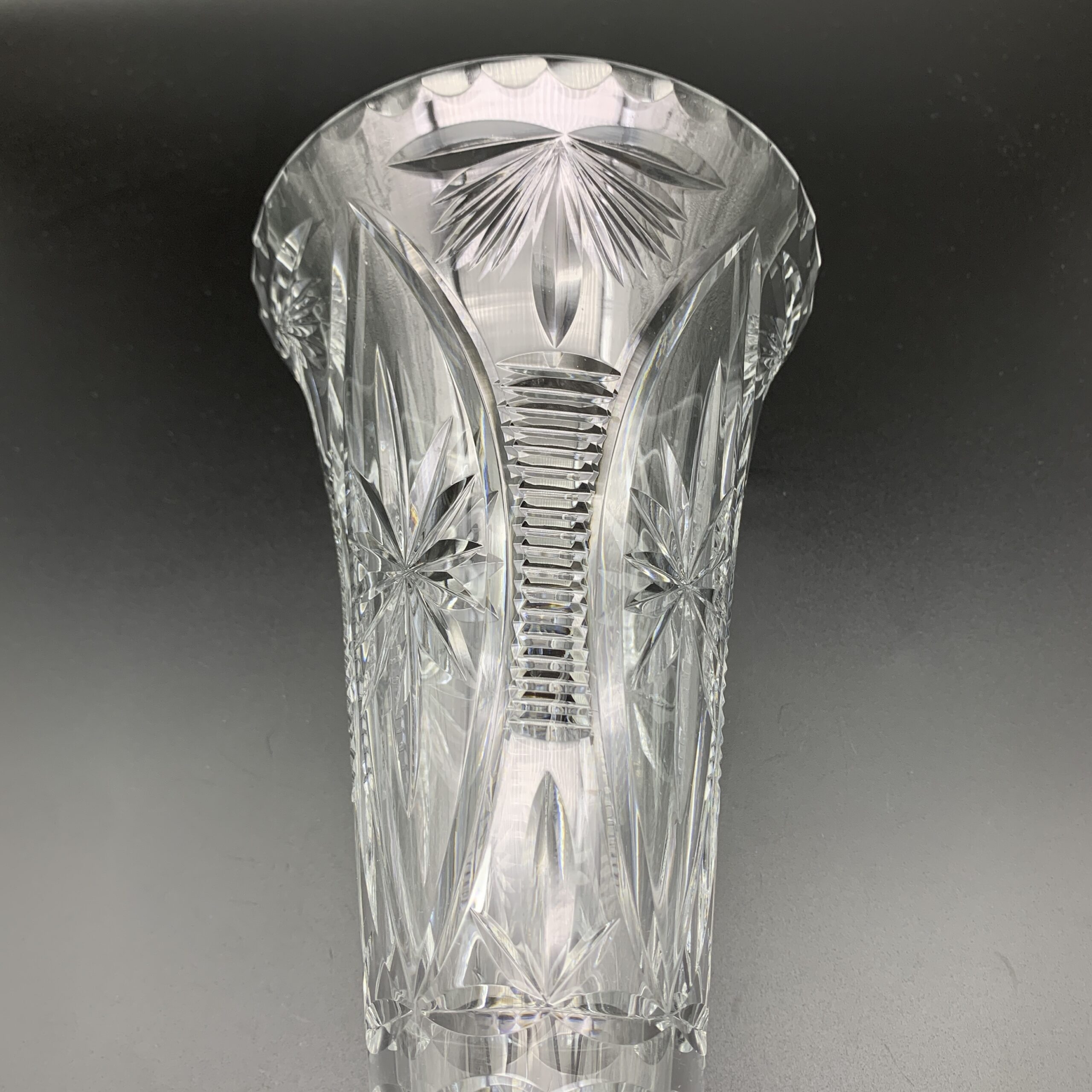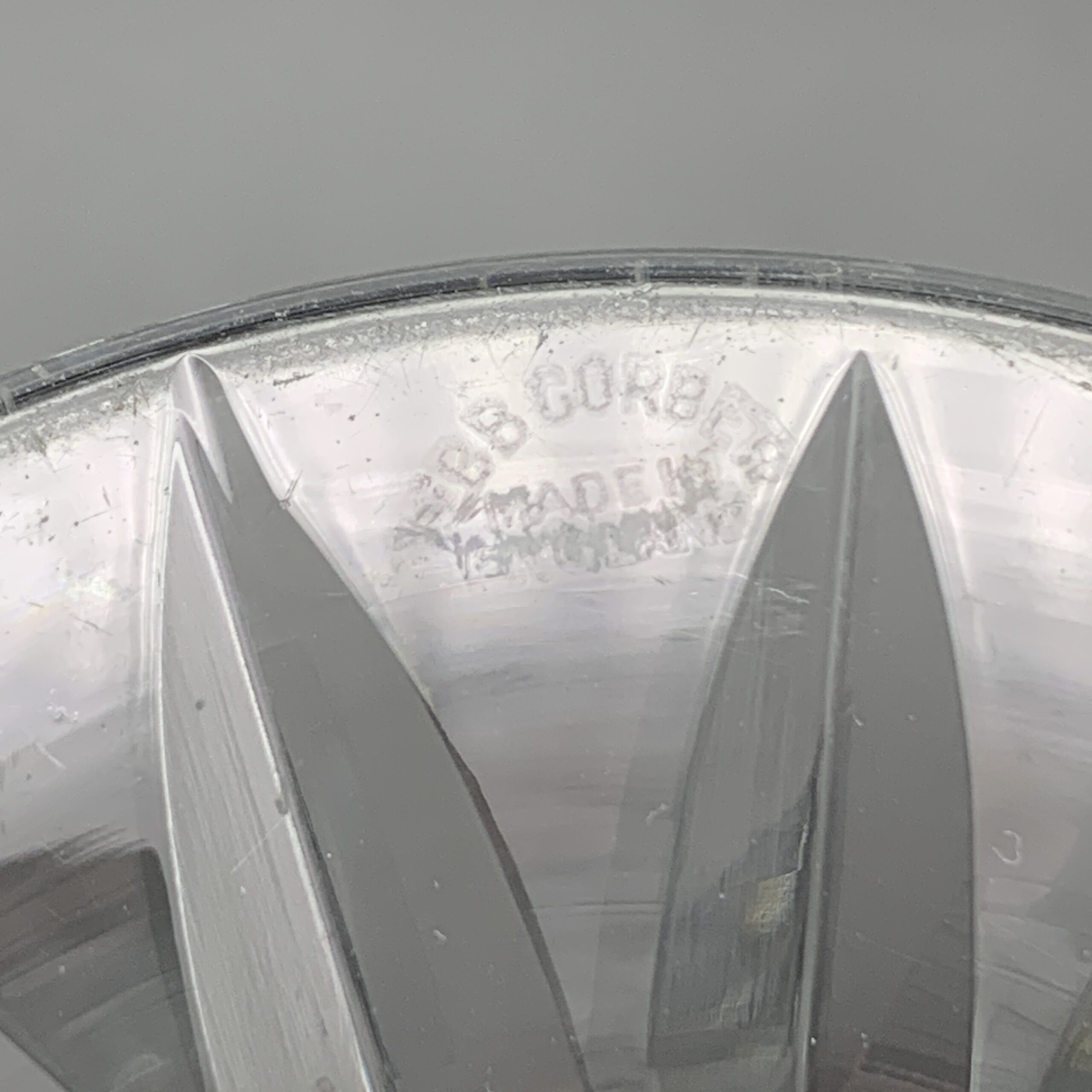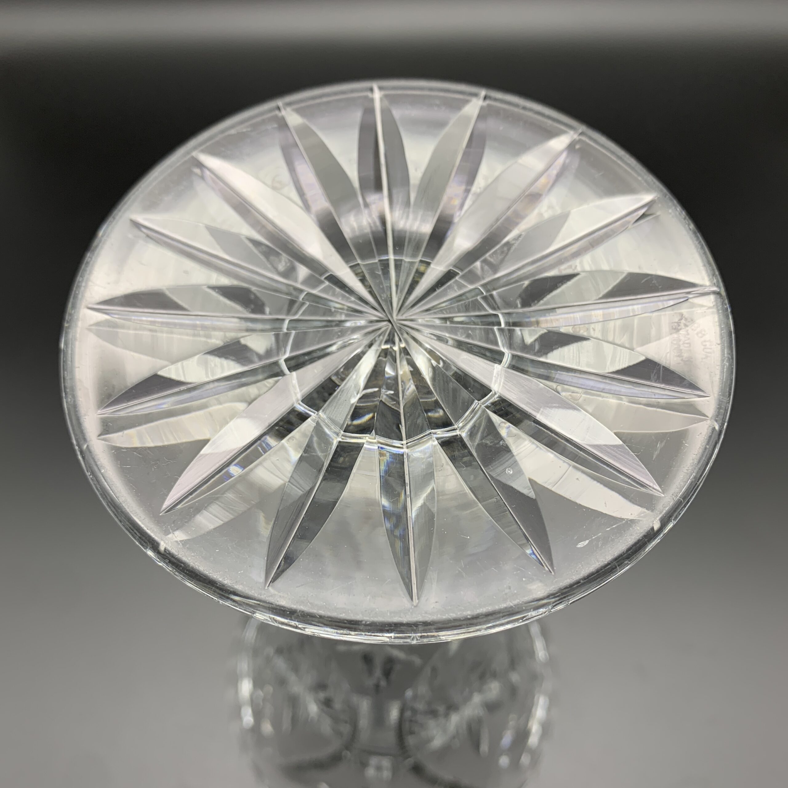 This very good quality, tall trumpet shaped crystal vase from the 1940/50’s, was manufactured by the well-known ‘Webb Corbett’ crystal factory in England. It is intricately hand-cut in various pretty patterns that reflect the light beautifully and it stands on a round star-cut base. This attractive tall vase is in superb condition, is crystal clear with a nice weight and has the acid etched ‘Webb Corbett’ mark on the base. It stands 25,5cm high, has a top diameter of 13,7cm, with a base diameter of 10cm and weighs 1,04kg.