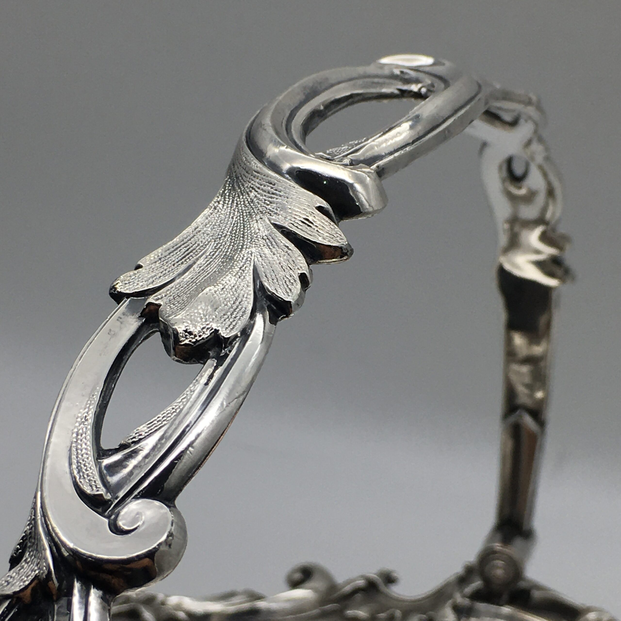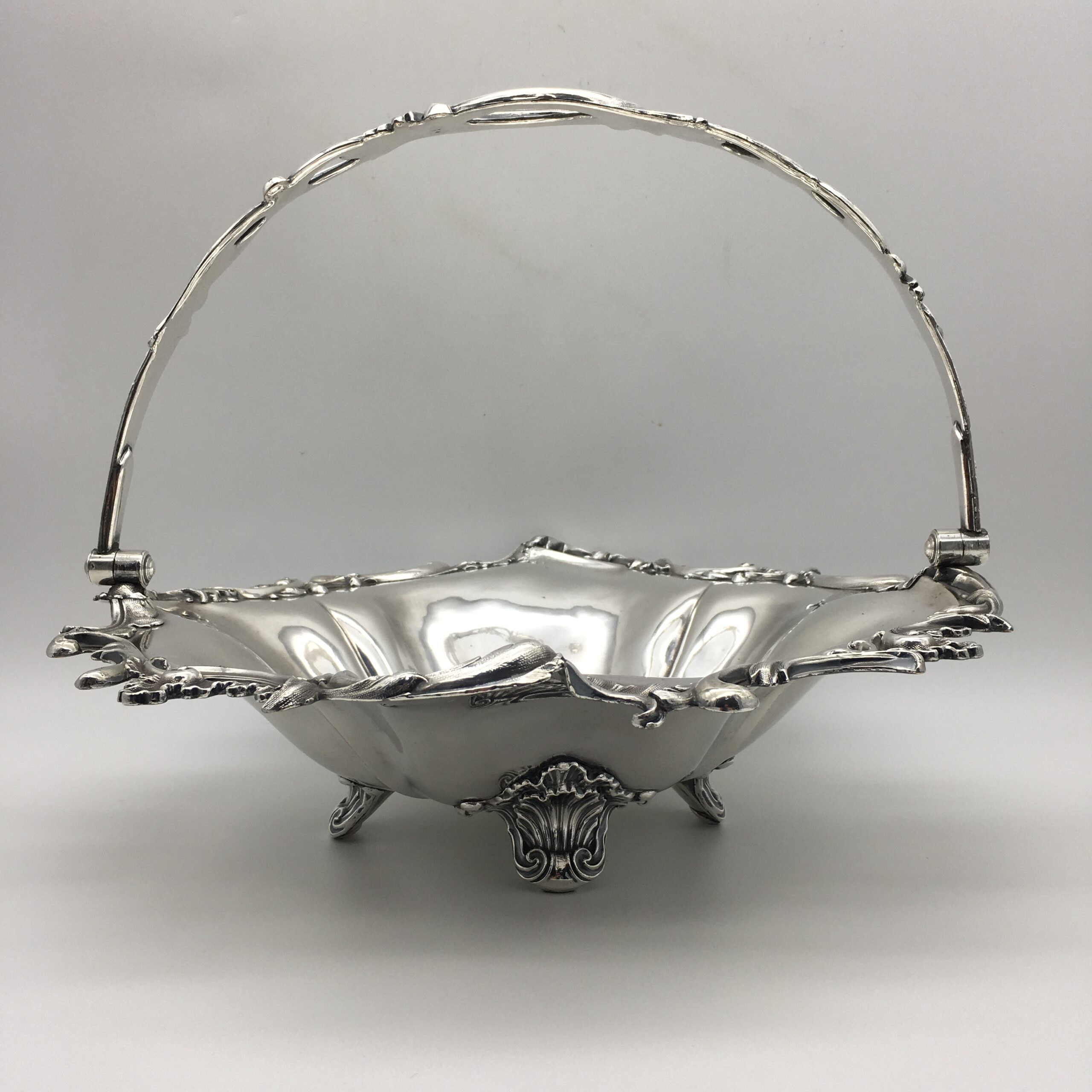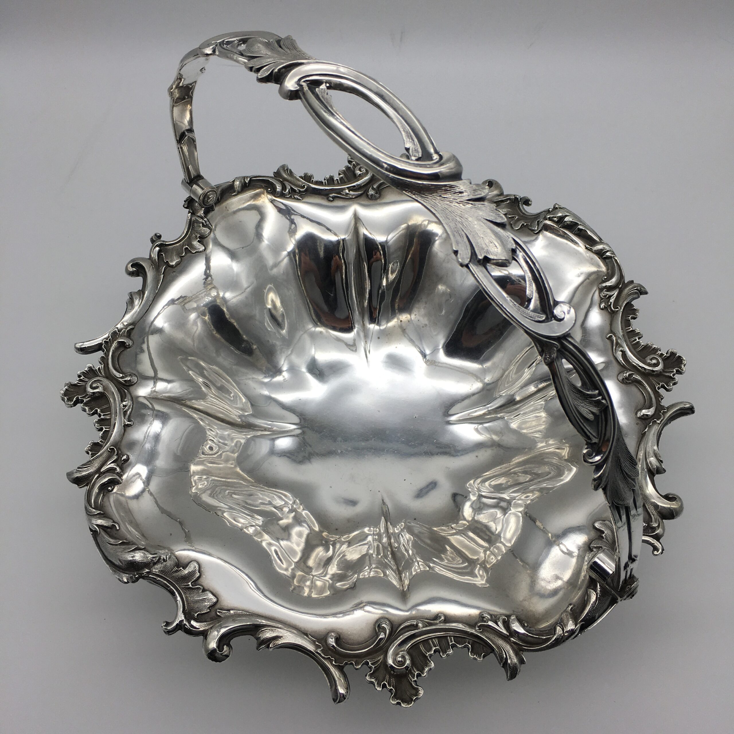 This superb quality, large Victorian silver-plated basket with swing handle, is lovely and solid, with a good weight, beautifully made and in excellent condition. It is round in shape, with a scalloped, applied cast scroll and leaf border with super detail, and is fitted with a matching, detailed and pierced swing handle. The basket rests on four lovely, cast scroll feet with a leaf detail. There are no factory marks to be found, and in my opinion, this is a very early ‘Sheffield Plate’ on brass basket, which is in superb condition considering its age. The basket has a diameter of 32cm, stands 9cm high (26cm with handle up), and weighs 1570g.