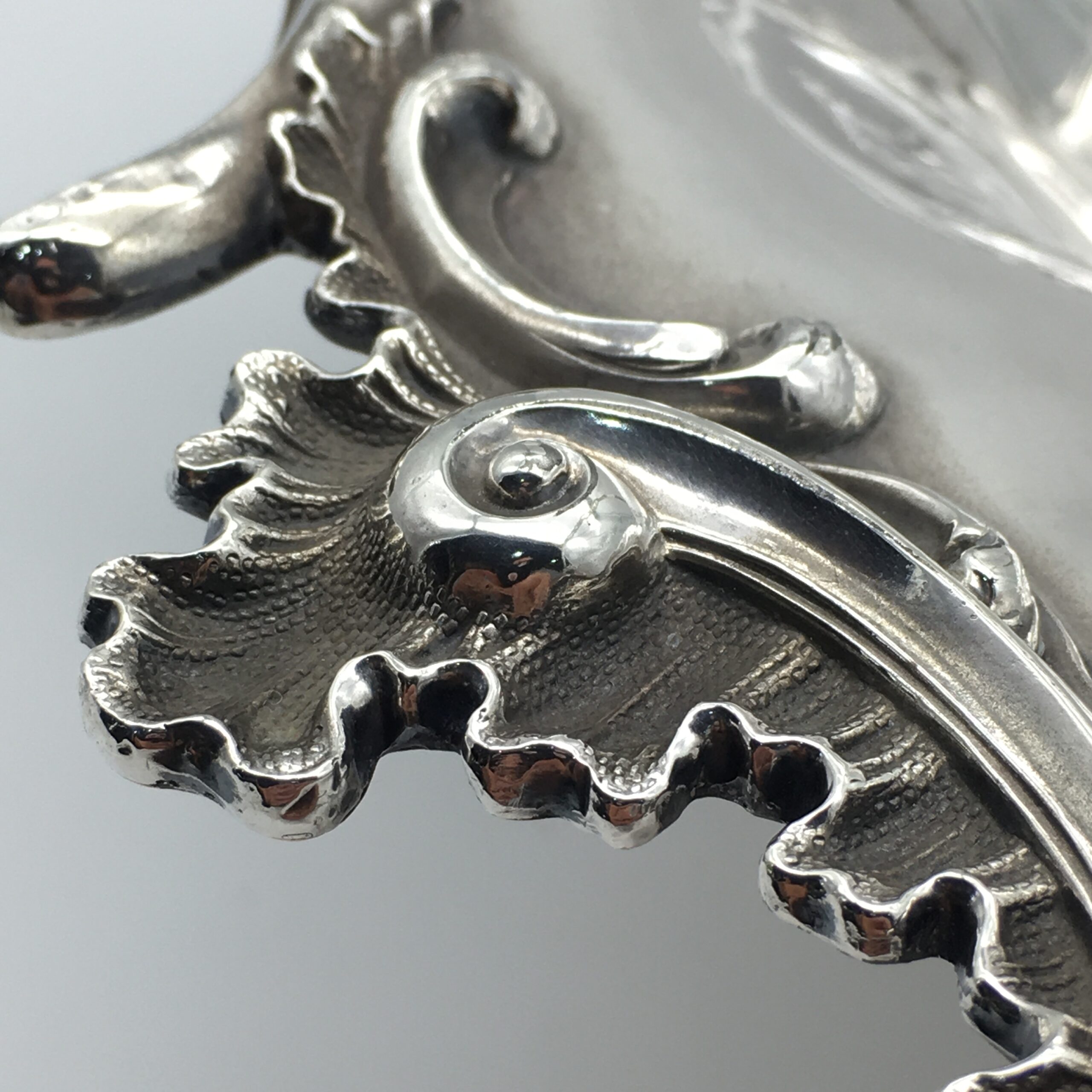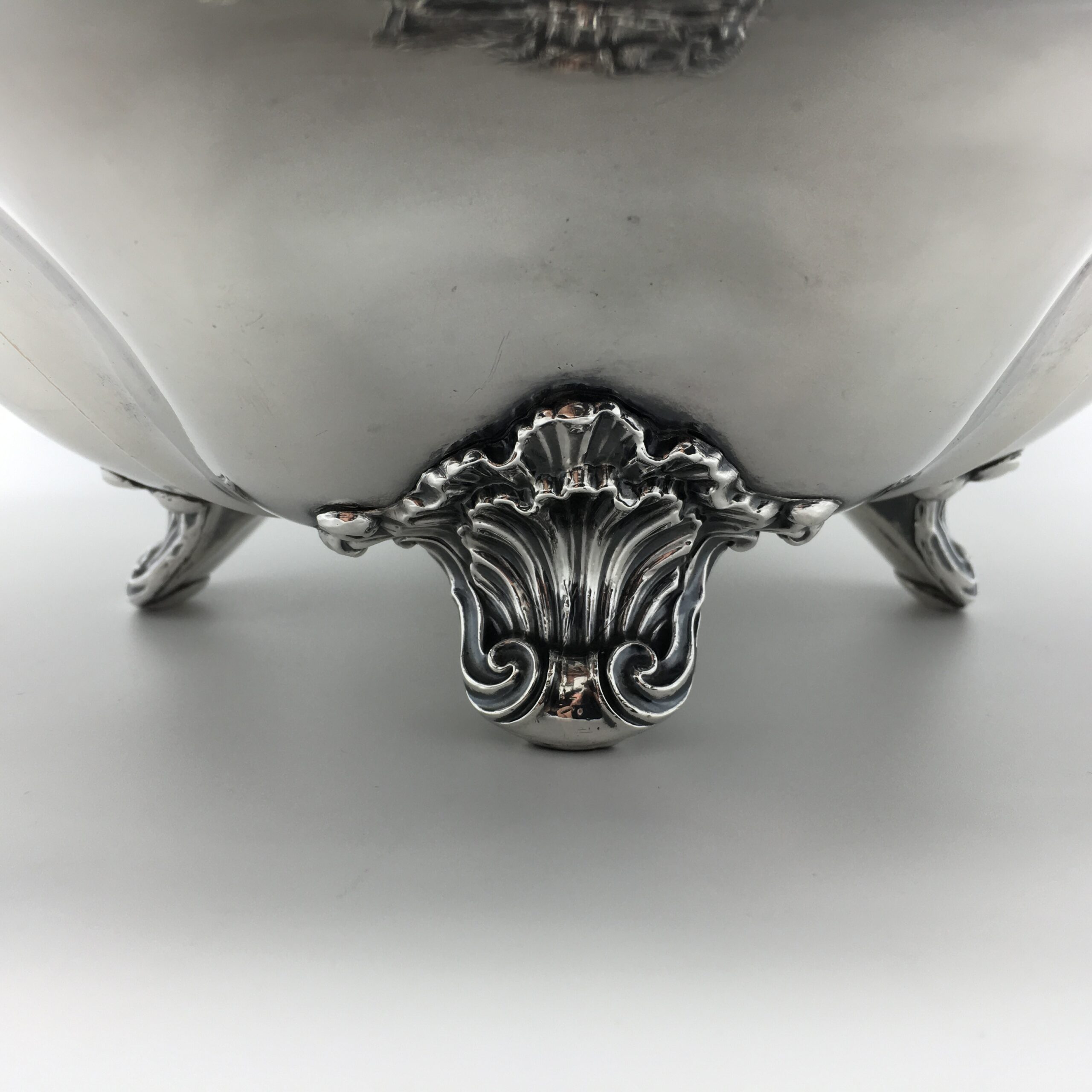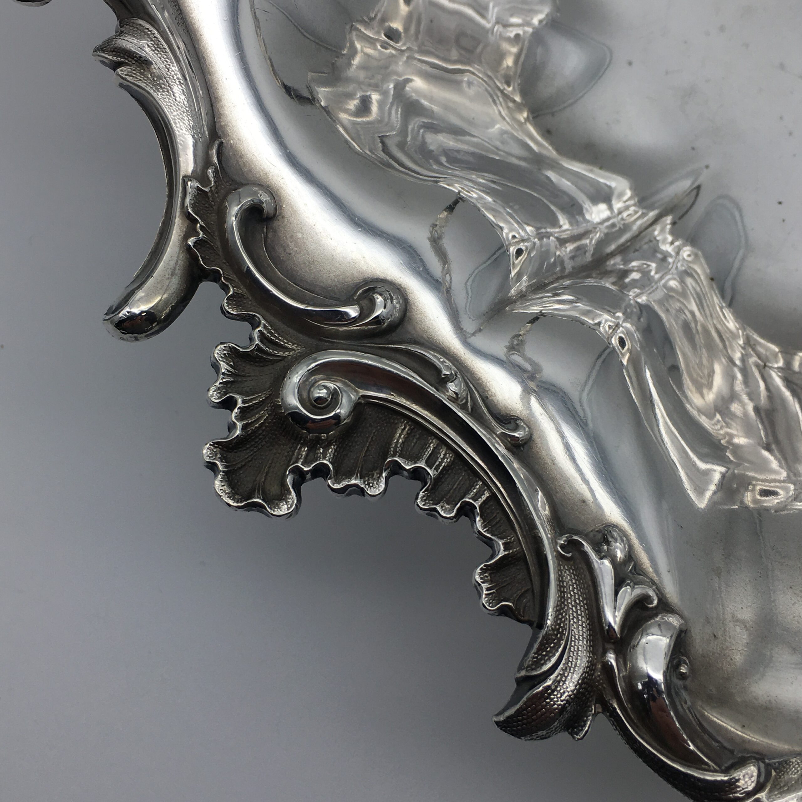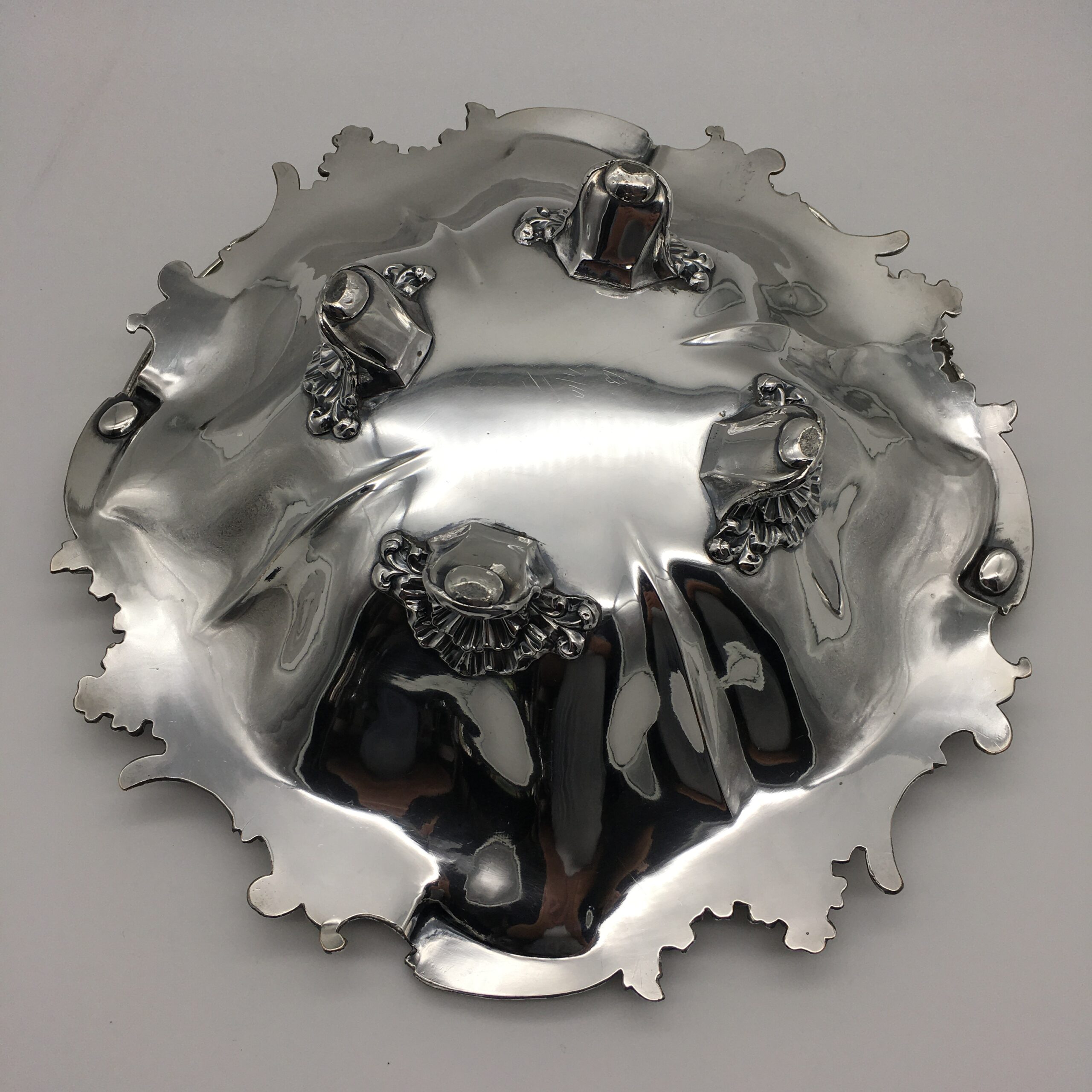 This superb quality, large Victorian silver-plated basket with swing handle, is lovely and solid, with a good weight, beautifully made and in excellent condition. It is round in shape, with a scalloped, applied cast scroll and leaf border with super detail, and is fitted with a matching, detailed and pierced swing handle. The basket rests on four lovely, cast scroll feet with a leaf detail. There are no factory marks to be found, and in my opinion, this is a very early ‘Sheffield Plate’ on brass basket, which is in superb condition considering its age. The basket has a diameter of 32cm, stands 9cm high (26cm with handle up), and weighs 1570g.