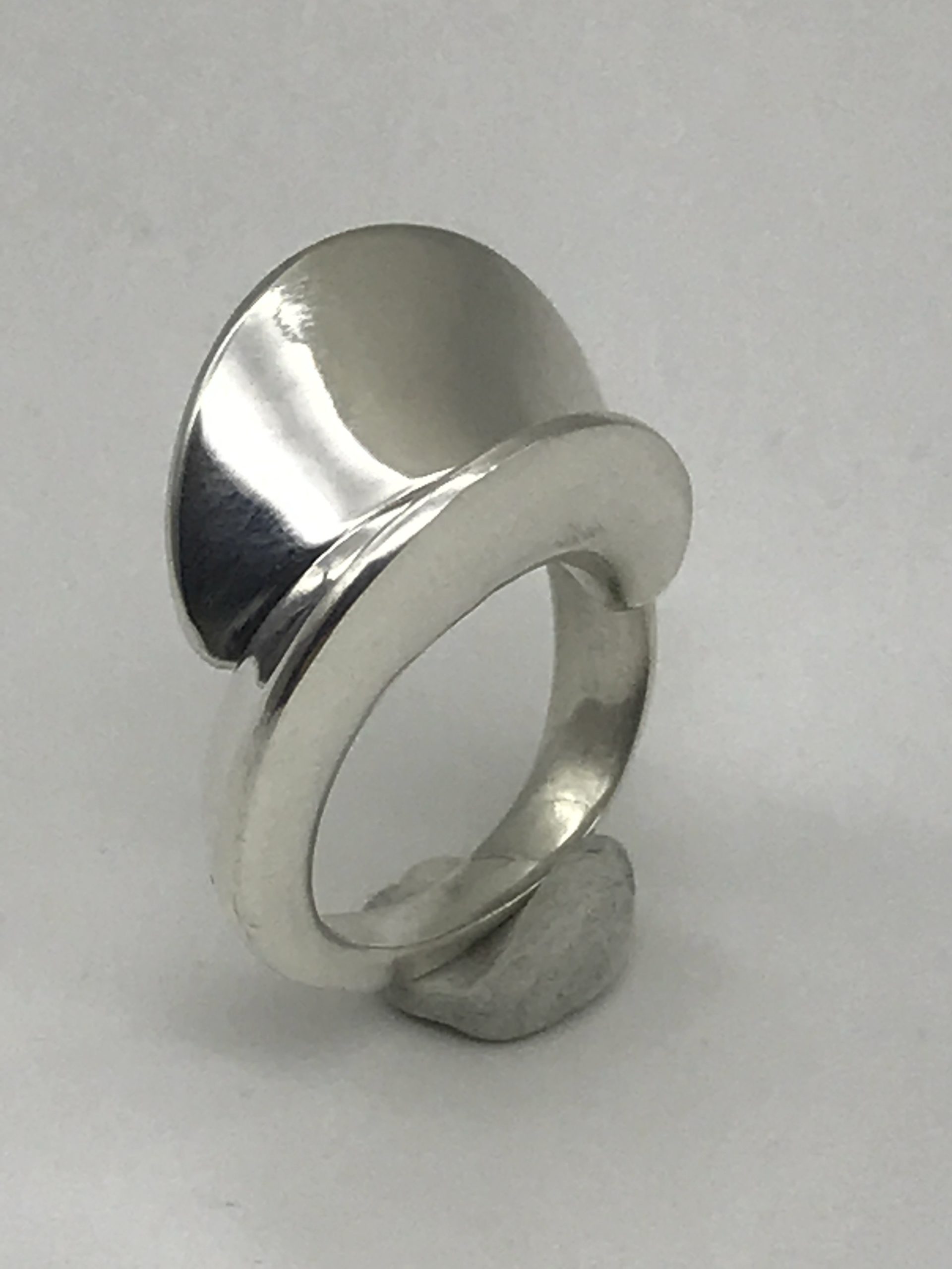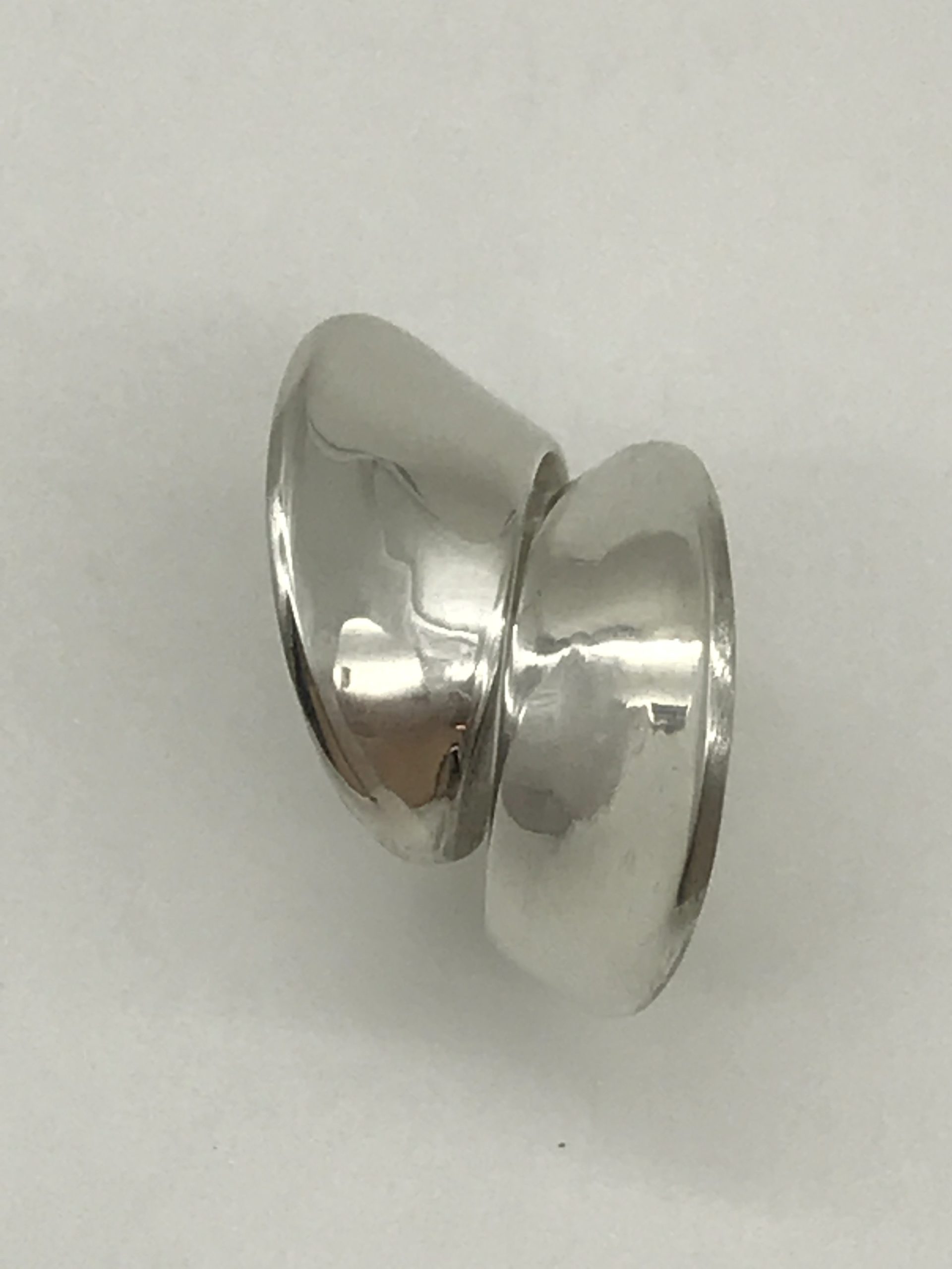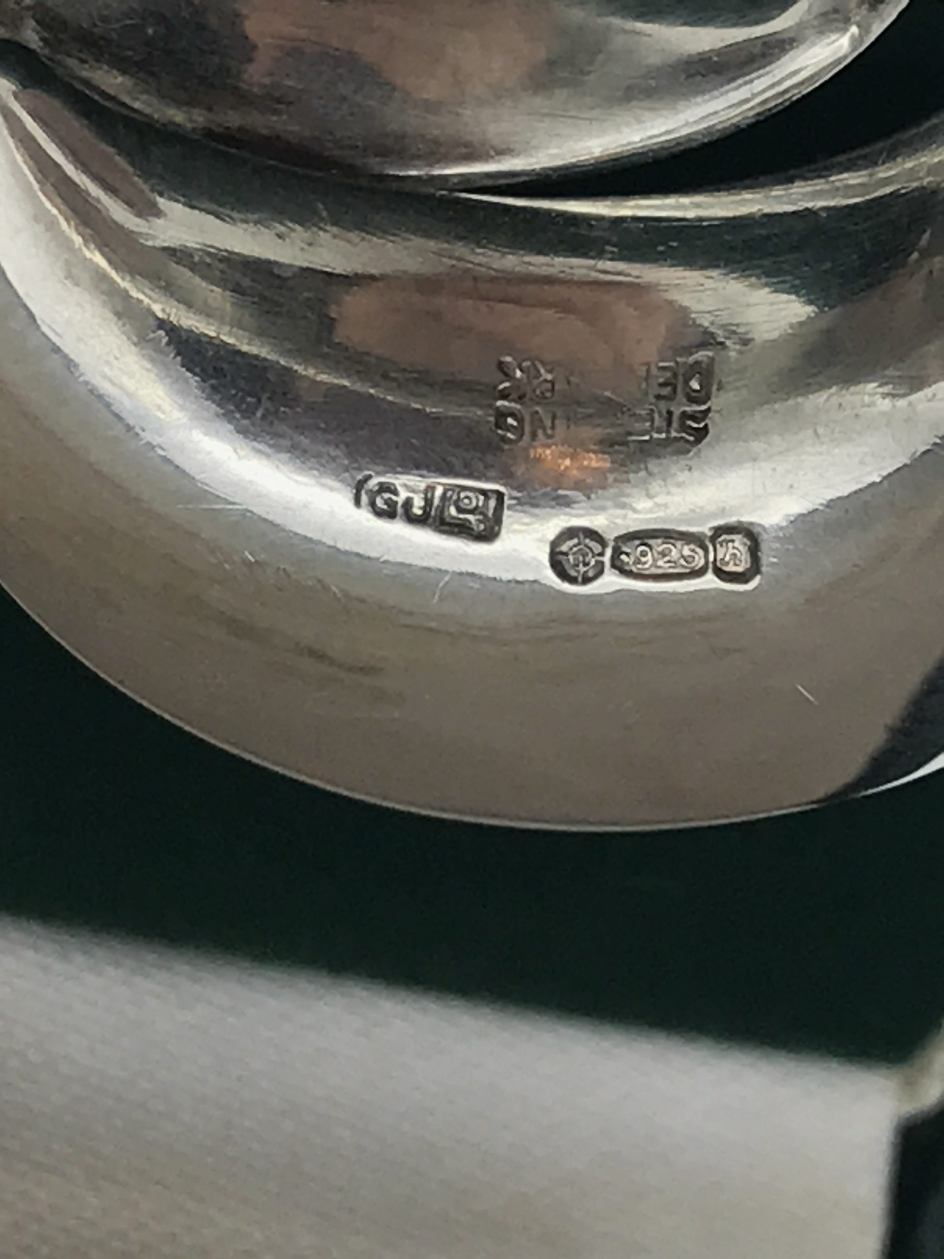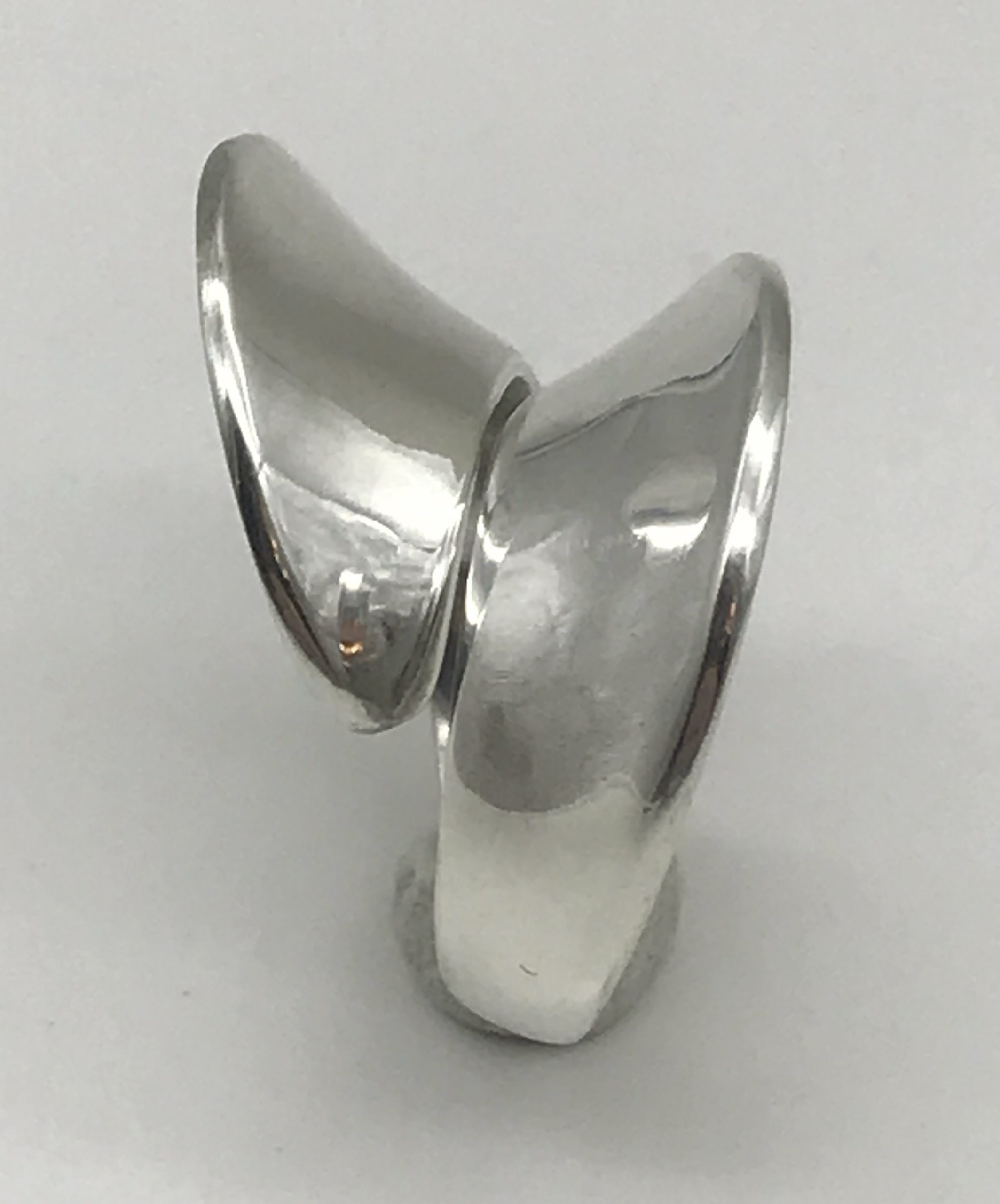 This solid silver overlapping double curve modernist ring (also known as the ‘Flying Saucer’ ring) is stamped ‘Georg Jensen Sterling Denmark.’ It also has the English import mark for London 1963. It was designed by Nanna Ditzel (design no. 93). The ring is in lovely condition.