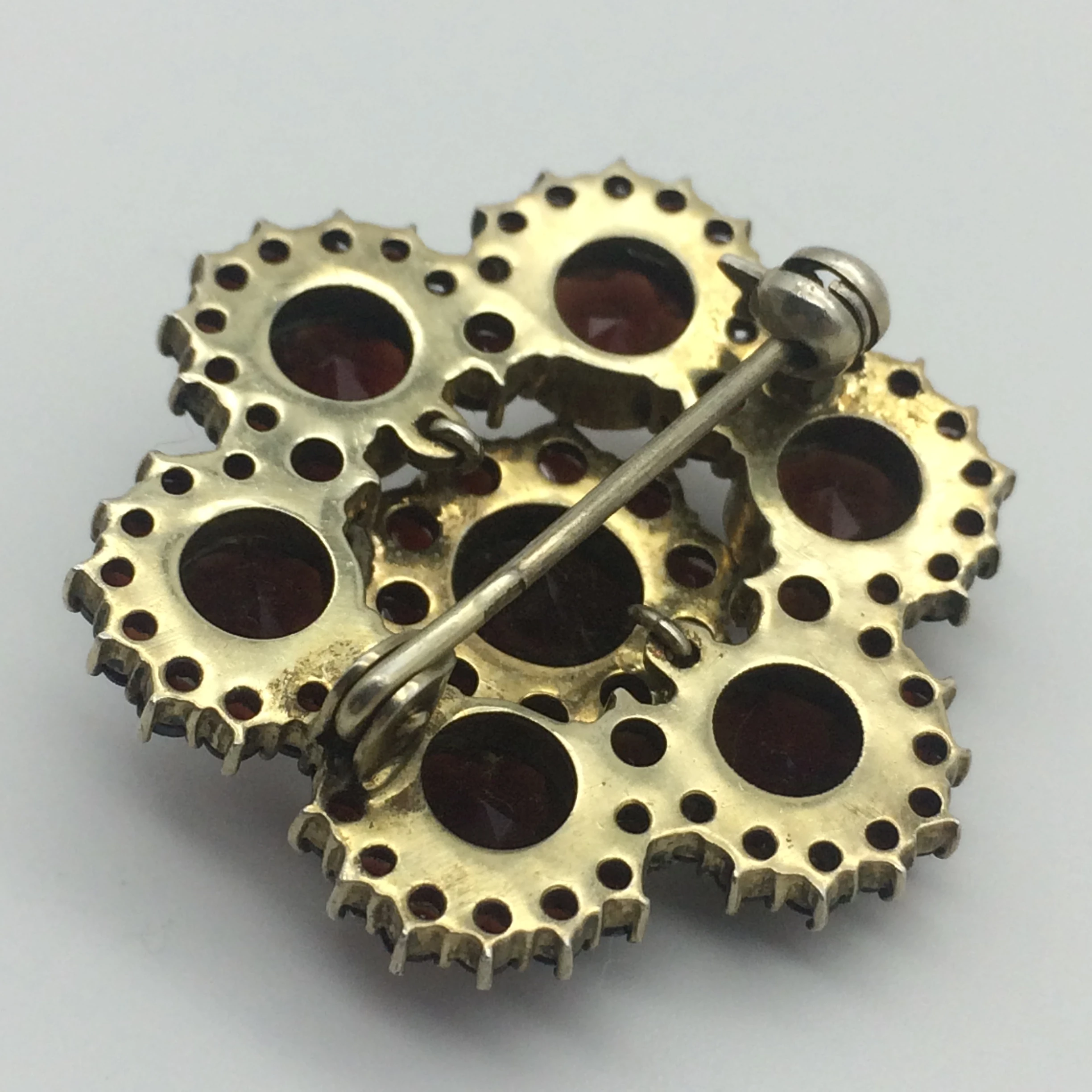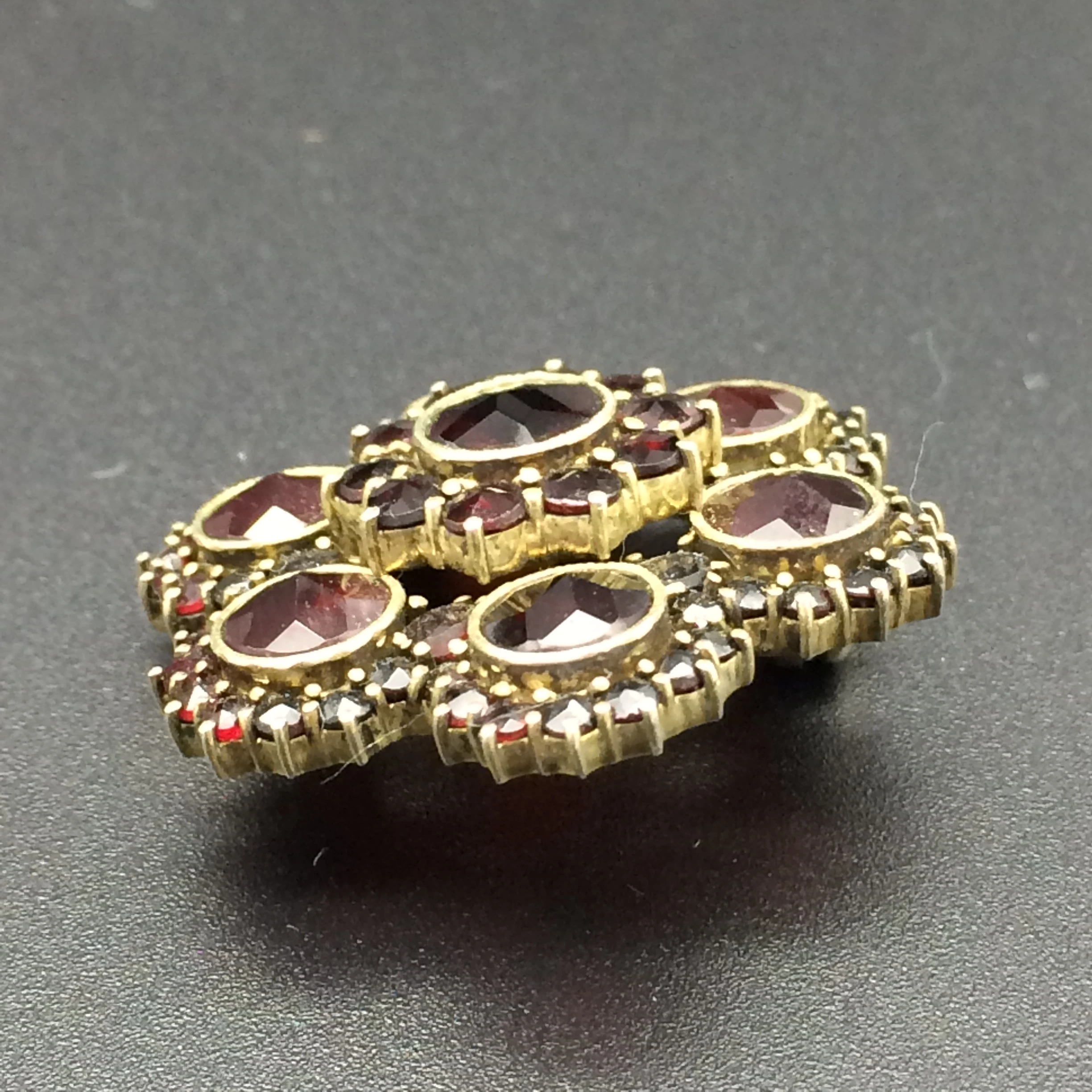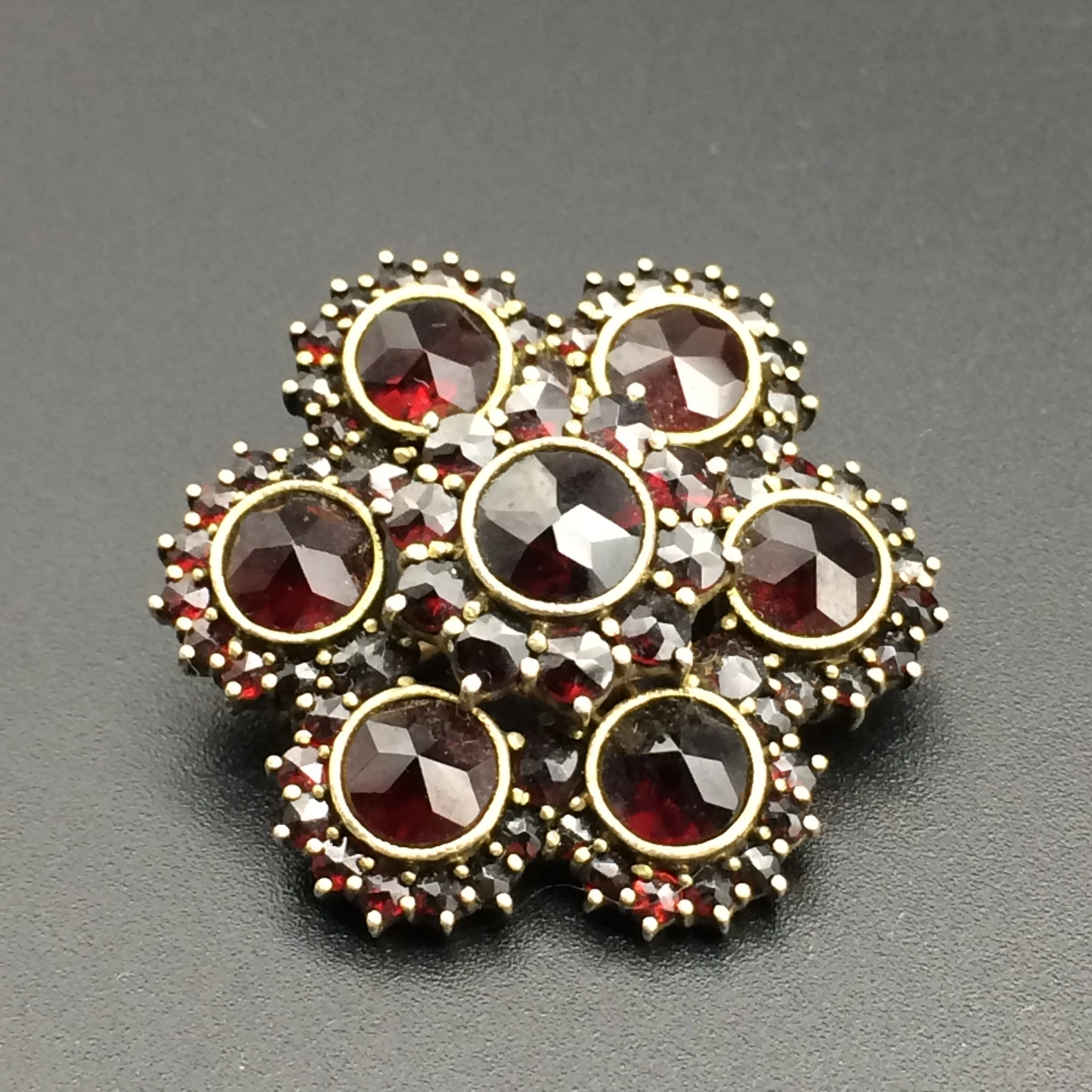 This stunning cluster brooch features two layers of beautifully set deep red round bohemian garnets (Pyrope) – 7 x 6.00mm, 16 x 3.00mm and 48 x 2.00mm. They are set in a silver gilt metal, which is sometimes referred to as ‘bohemian gold’. The metal is mostly silver with a small percentage of gold, which gives it that gilded colour.