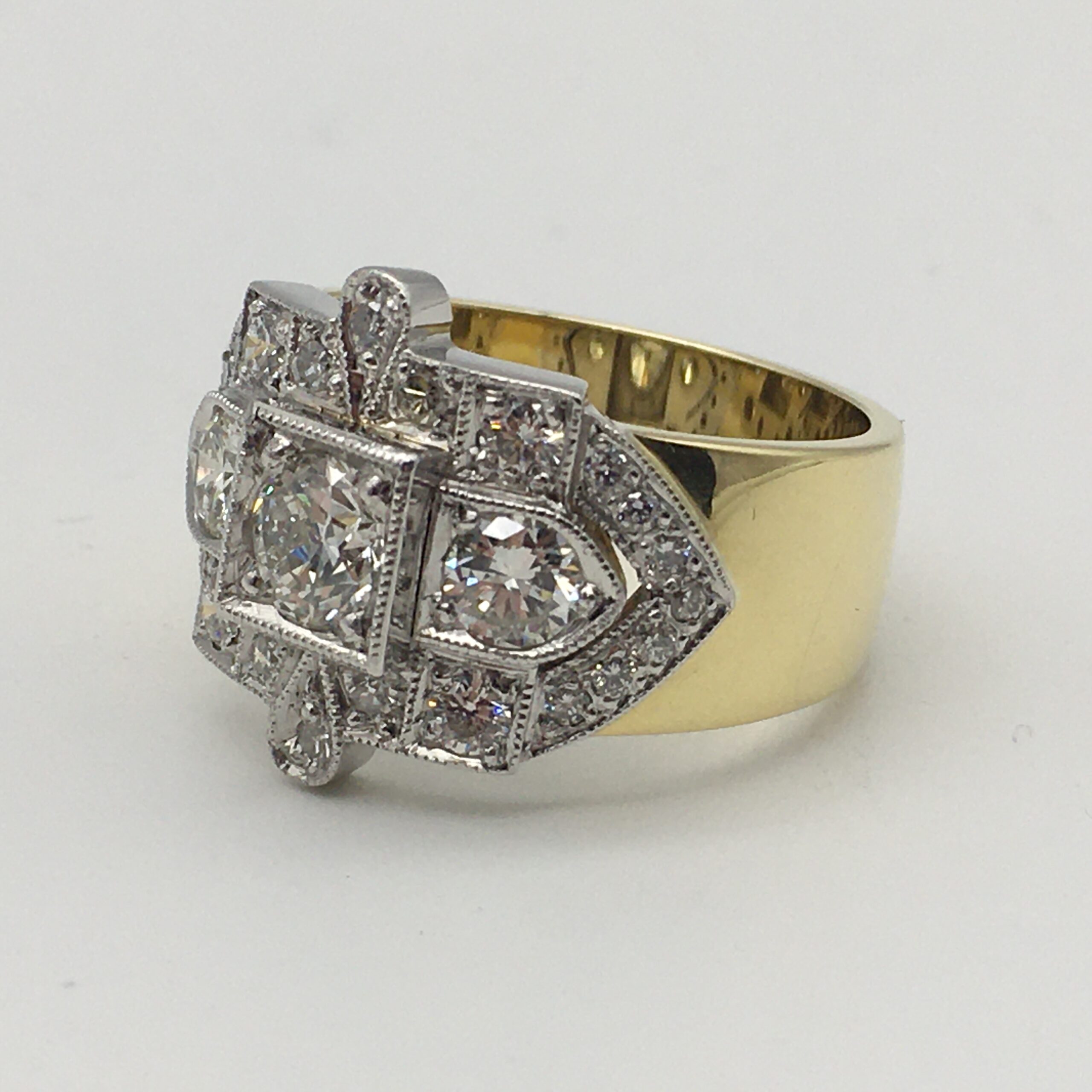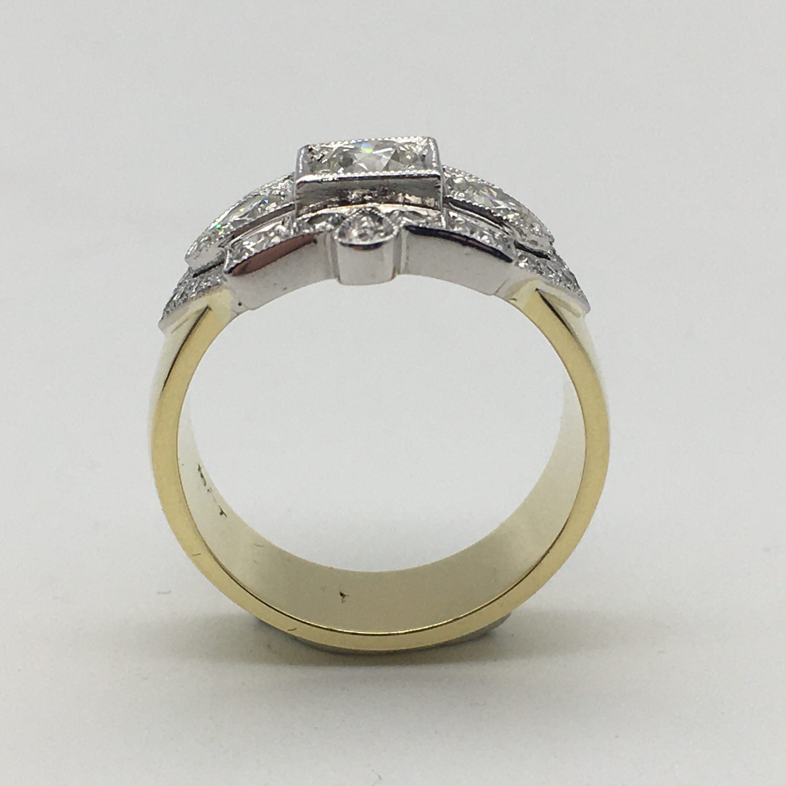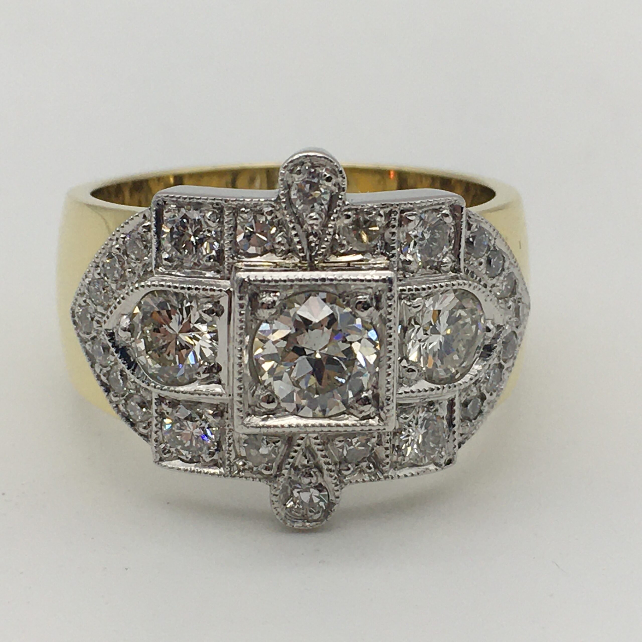 This exquisite, 18ct yellow and white gold vintage dress ring has been beautifully made and set with numerous diamonds of various sizes and cuts, equalling 1,49cts in total. It has a 0,52ct ‘old-cut’ diamond in the centre, with two ‘brilliant’ cut diamonds equaling 0,50cts, one on either side of the centre stone, then four ‘brilliant’ cut 0,06ct diamonds, one in each corner. They are then surrounded by fourteen small ‘brilliant’ cut diamonds and finished off with six, ‘8-cut’ diamonds. The ring is in excellent condition, with a weight of 12,6g, and a ring size of ‘0 ½’.