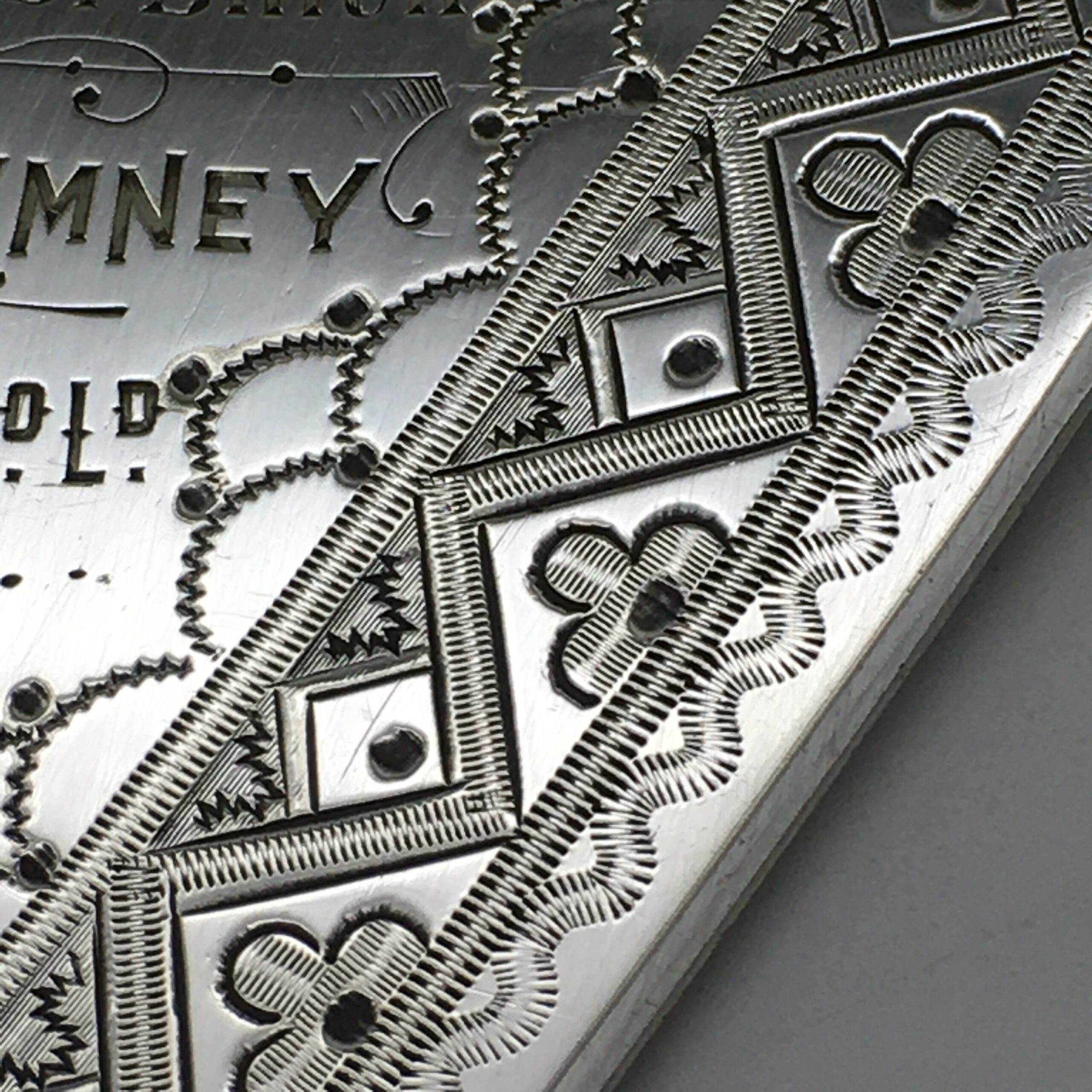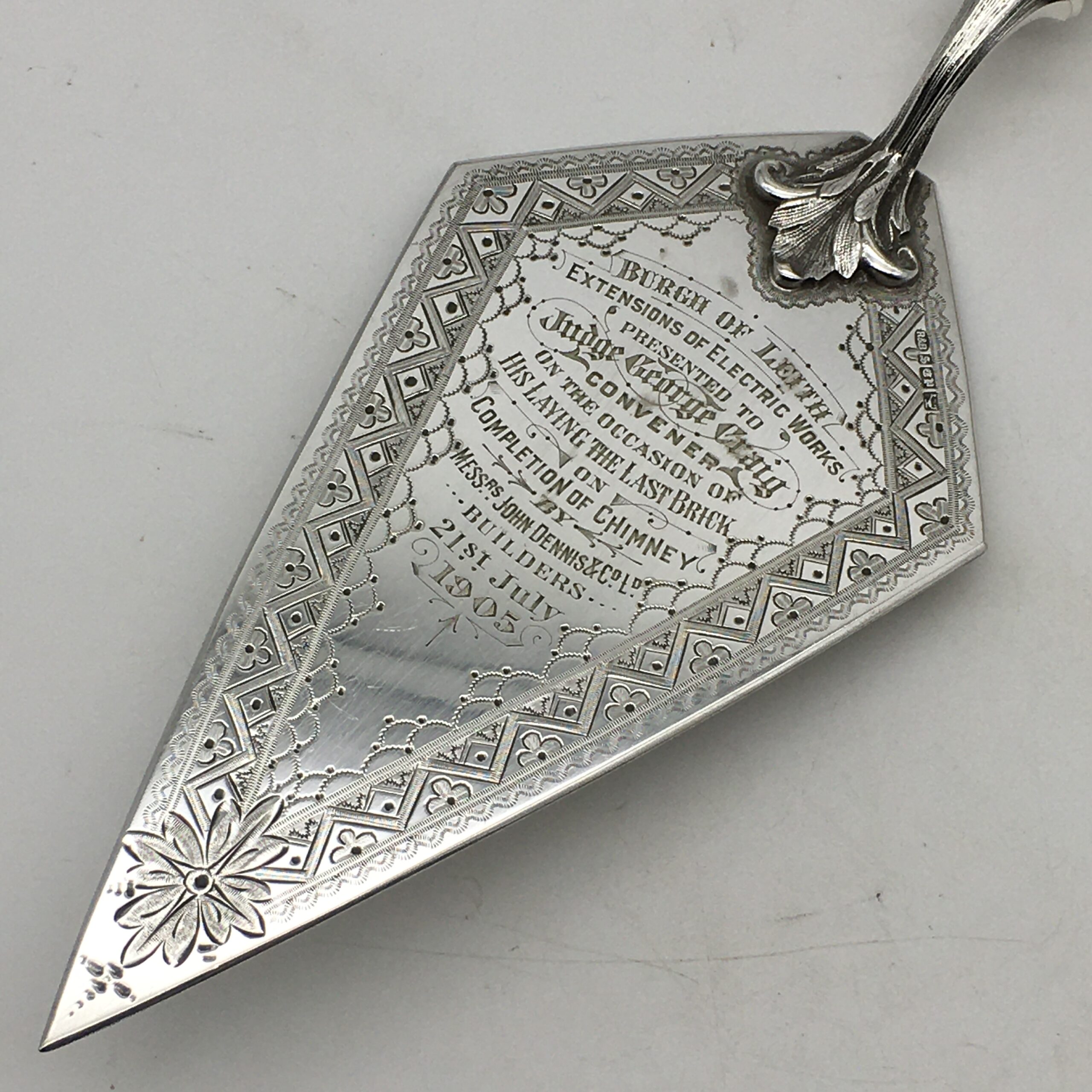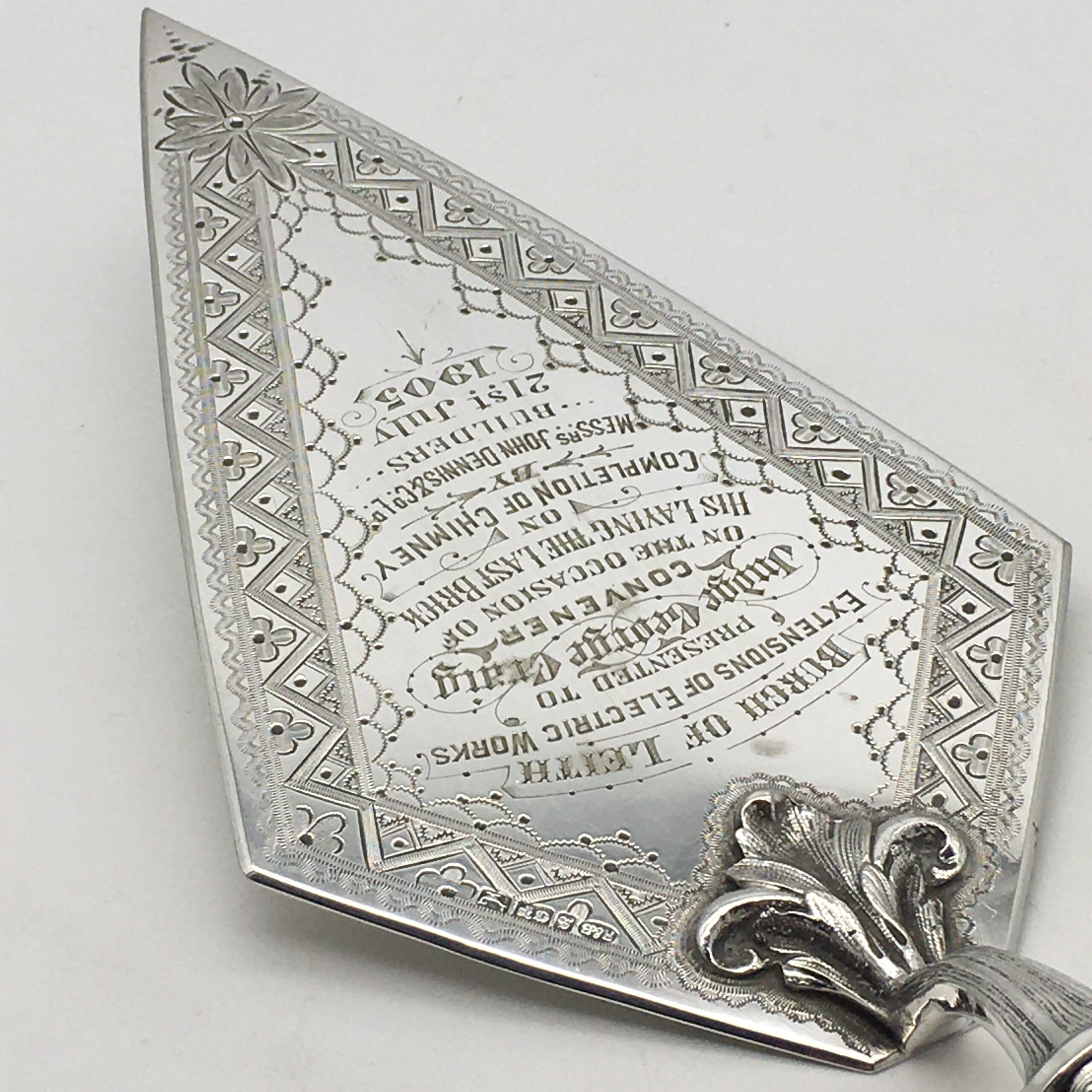 This very early, impressive, silver-plated presentation or ceremonial trowel has been superbly engraved with a dedication and decorated with a zig zag and floral border. It was awarded in 1905 for the ‘Laying of the last brick on the completion of a Chimney’.